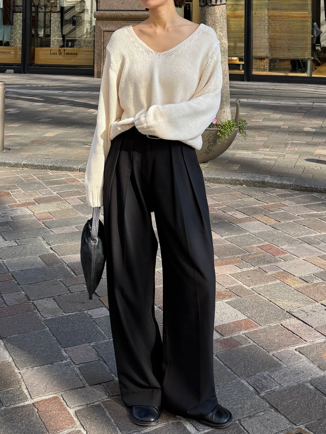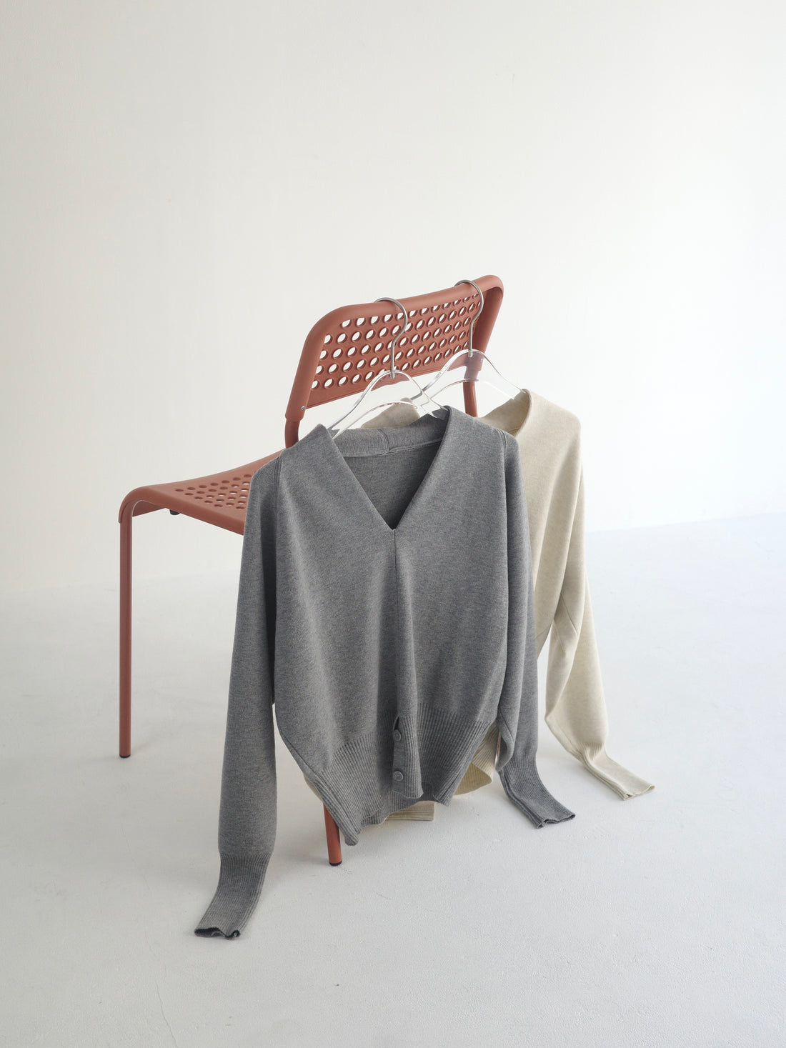 【アイテム】深めのVネックが顔まわりをすっきりと見せてくれるニットトップス。 フロント裾にあしらったボタンディテールがさりげないアクセントとなり、シンプルながらも表情のあるデザインに仕上げました。 ウエスト部分の太めリブ切り替えが自然なメリハリを生み、スタイルアップをさりげなくサポート。 袖口は長めのリブ仕様で、手元にほどよいニュアンスをプラスしてくれます。 程よい厚みと柔らかな風合いで、肌寒い時期から春先まで長く活躍する1枚です。