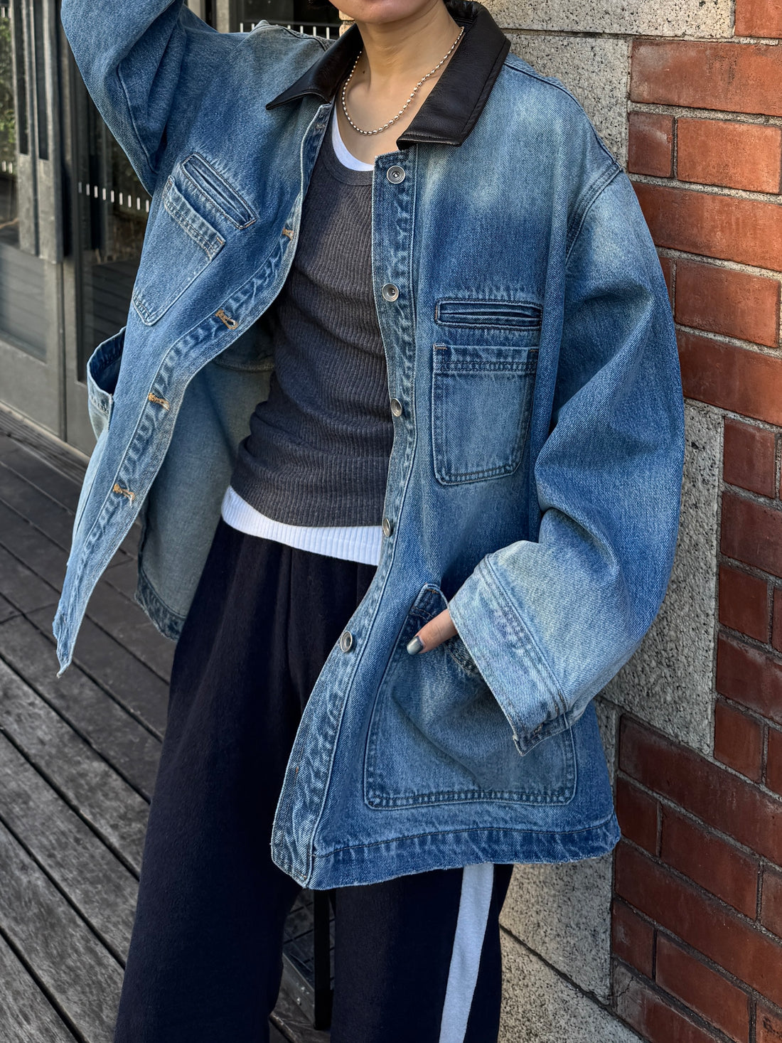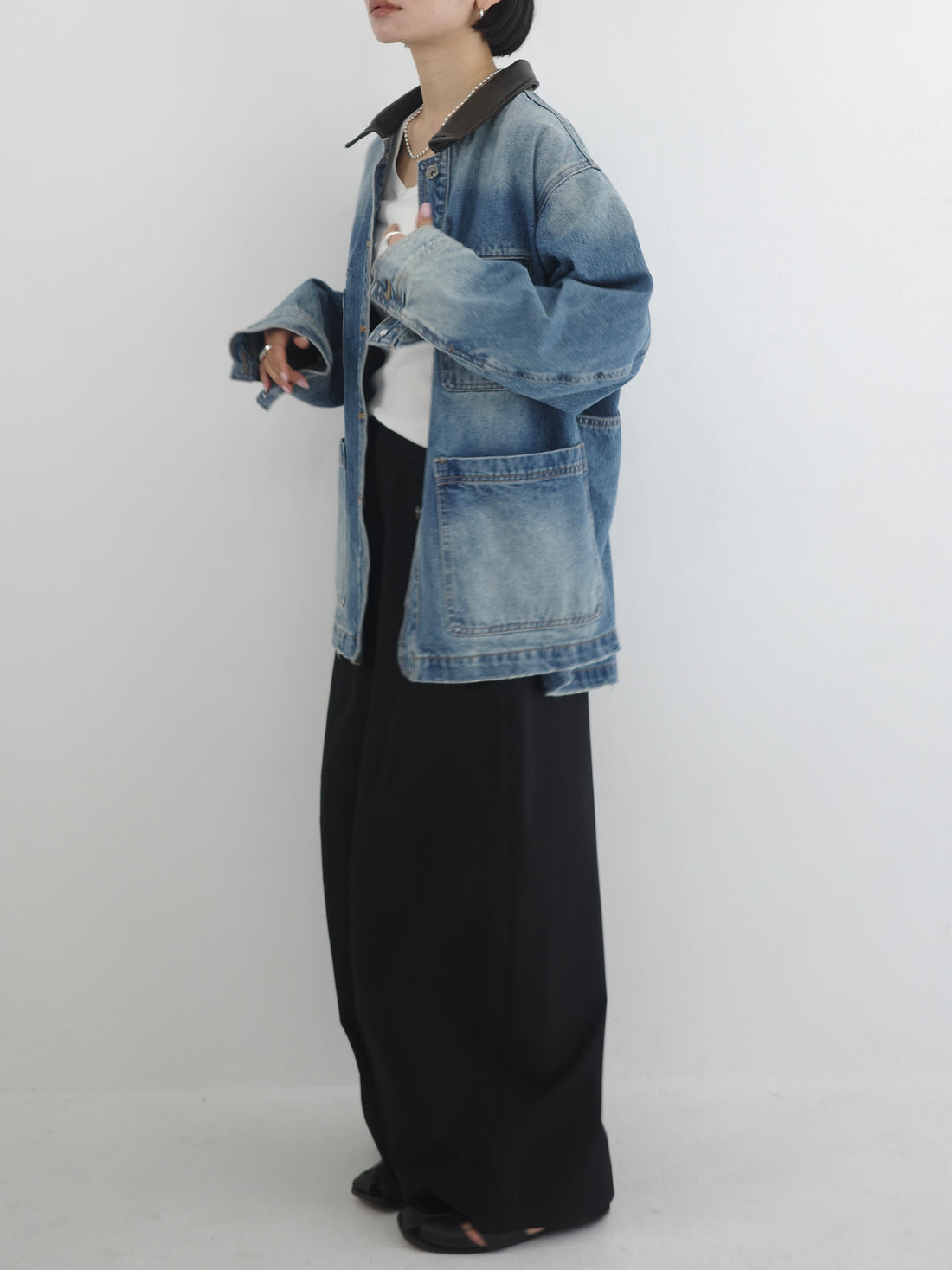 【アイテム】ほどよくフェード感のあるデニムに、異素材の襟を効かせた雰囲気のある1着、 着込んだような表情がありながら、どこかクリーンで大人っぽい印象に仕上げました。 肩まわりはゆとりを持たせつつ、体を包み込むようなリラックスシルエットとヒップにかかる着丈で、ラフに羽織るだけでもバランスよく決まります。 ワークテイストの大きめポケットやステッチワークなど、デニムならではのディテールを活かしながら女性らしい抜け感も感じられるデザインに仕上げました。 たっぷりの身幅設定にすることでカットソーやニットの上に軽く羽織って、季節の変わり目にもさっと手に取れる存在に。 肩の力を抜いた大人のデイリースタイルに寄り添うヴィンテージライクなデニムジャケットです。