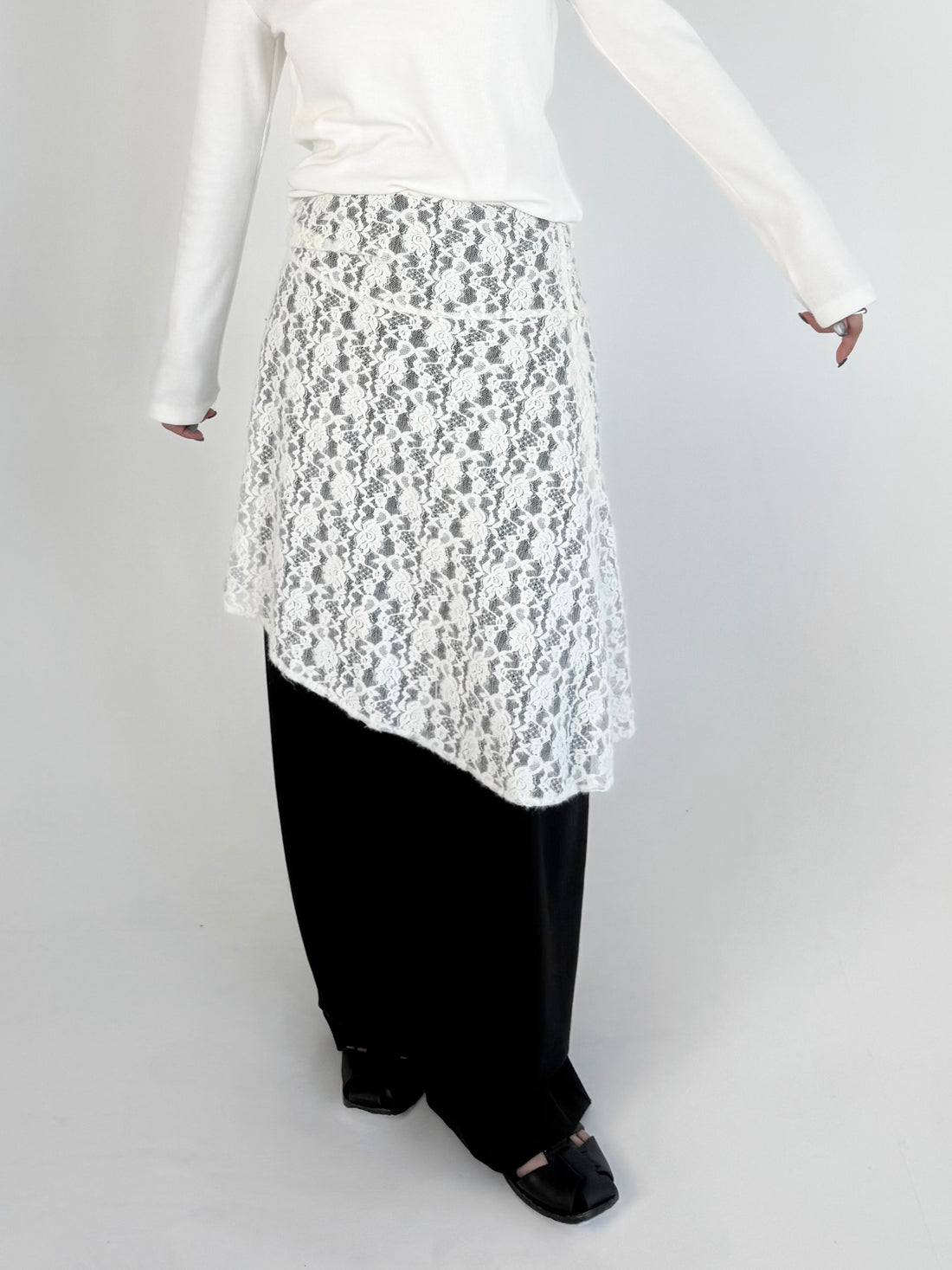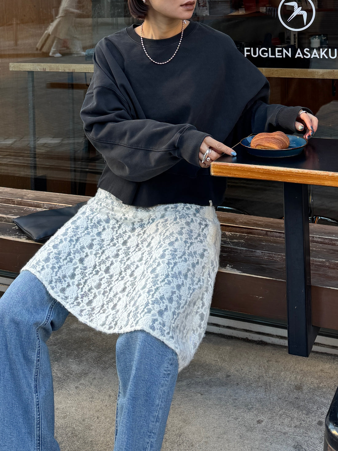 【アイテム】繊細なレース素材を使用しながらも、カジュアルなスタイリングに取り入れやすいレーススカート。 裾はアシンメトリーなデザインになっており、動くたびに表情が変わるのがポイント。 シンプルなコーディネートに合わせるだけで、さりげないアクセントをプラスしてくれます。 甘くなりすぎないレース感なので、スウェットやカットソー、デニムとのレイヤードスタイルとも相性◎ カジュアルなアイテムに合わせても程よく女性らしさを添えてくれる1枚。 春のデイリースタイルに取り入れやすく、スタイリングのの幅を広げてくれるアイテムです。