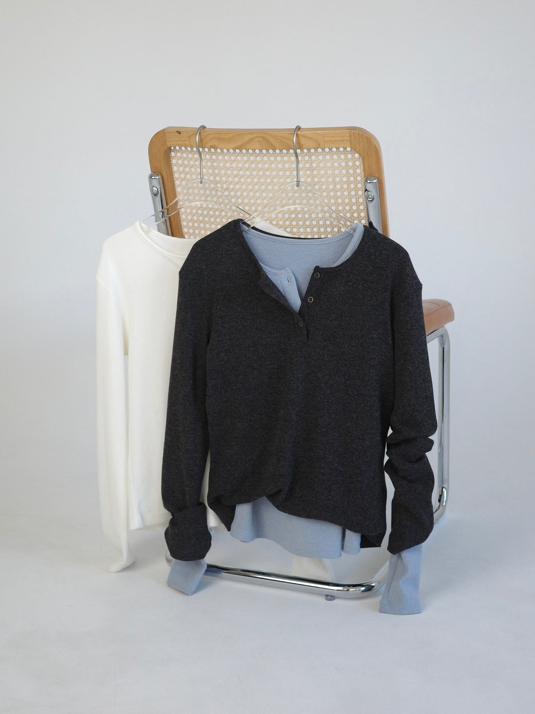 色違いを重ねたレイヤードスタイルもおすすめで、スタイリングに奥行きをプラスしてくれるアイテムです。
