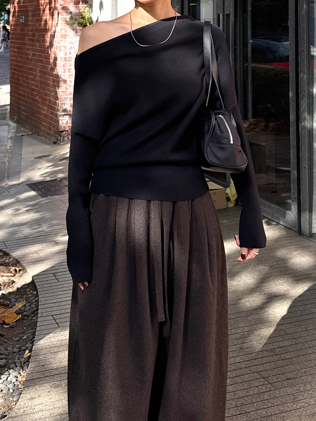 【アイテム】身体に沿って落ちるラインがきれいな、ワンショルダー仕様のニットトップス。 力を抜いたシルエットながら、着たときに自然と雰囲気の出る1枚です。 ネックラインは片側の肩がほどよく覗くカッティングにし抜け感がありつつ、肌見せが主張しすぎないバランスに仕上げています。 袖口と裾にはしっかり目のリブを効かせ、全体をすっきりと引き締めるディテールに。 薄すぎず厚すぎない素材感で、アウターの中にも収まりが良く冬場のレイヤードでも着膨れしにくいのも嬉しいポイントです。 カラーはアイボリーとネイビーの2色でワードローブに自然と馴染む落ち着いたラインナップです。