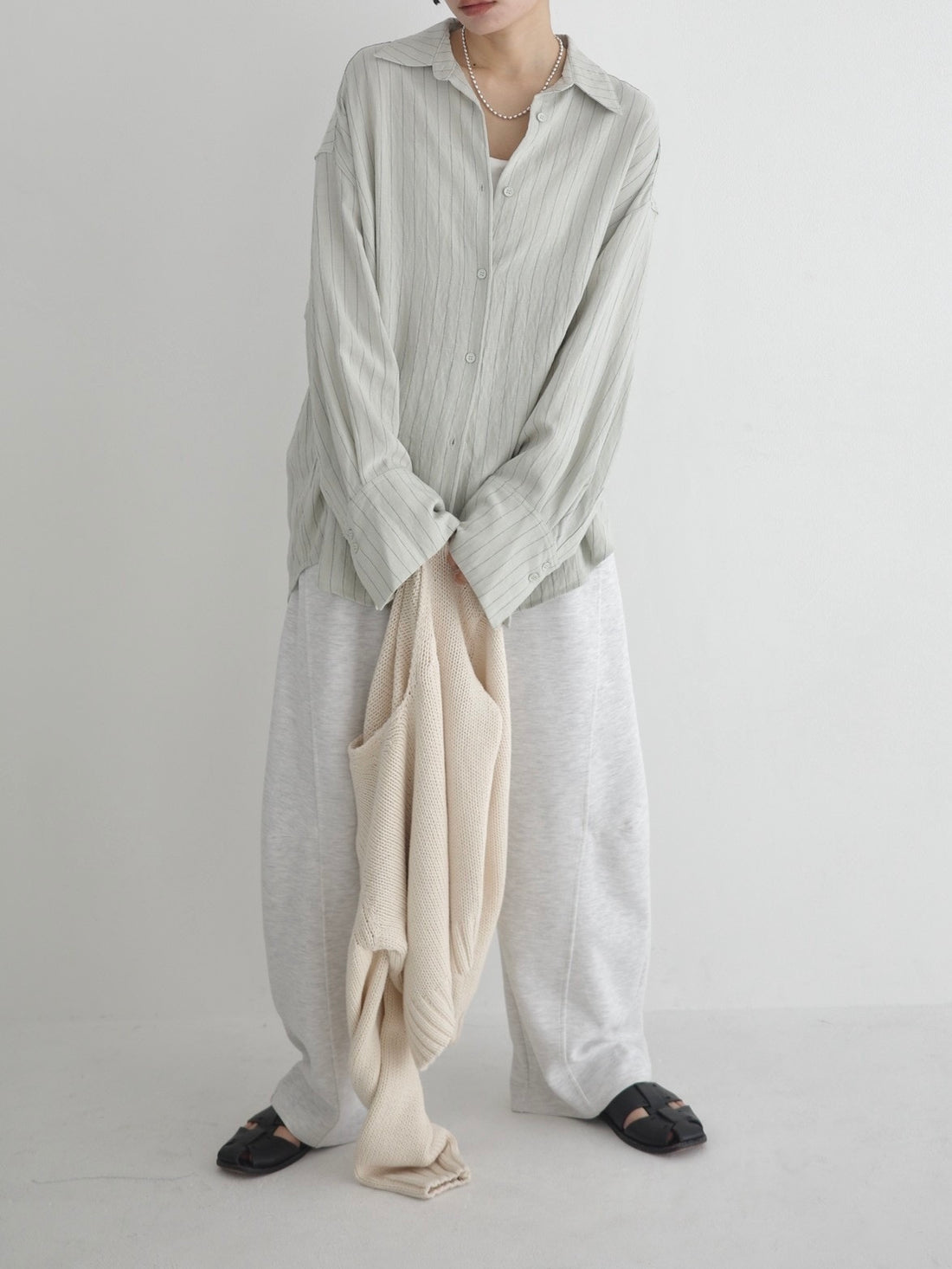 【アイテム】さらっとした落ち感のある素材感が魅力のストライプシャツ。 レーヨンのなめらかさにリネンのナチュラルな風合いを加え、軽やかで涼しげな着心地に仕上げました。 ゆとりを持たせたオーバーシルエットが、自然な抜け感とリラックスした雰囲気を演出。 肩を落としたドロップショルダーとヒップにかかるラウンドヘムが、バランスよくこなれたシルエットをつくります。 長めに設定したワイドカフスは、袖をラフにたくし上げたり折り返したりとアレンジが楽しめるデザインに。 細めのストライプ柄がさりげないアクセントになり、スタイリングに奥行きをプラスします。 1枚でさらっと着るのはもちろん、羽織りとしても活躍するアイテムです。