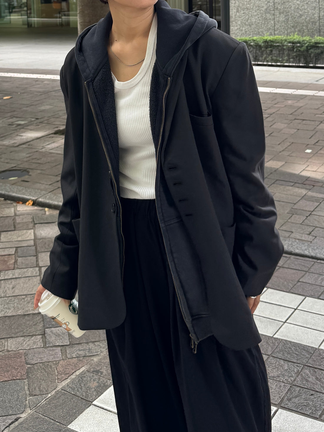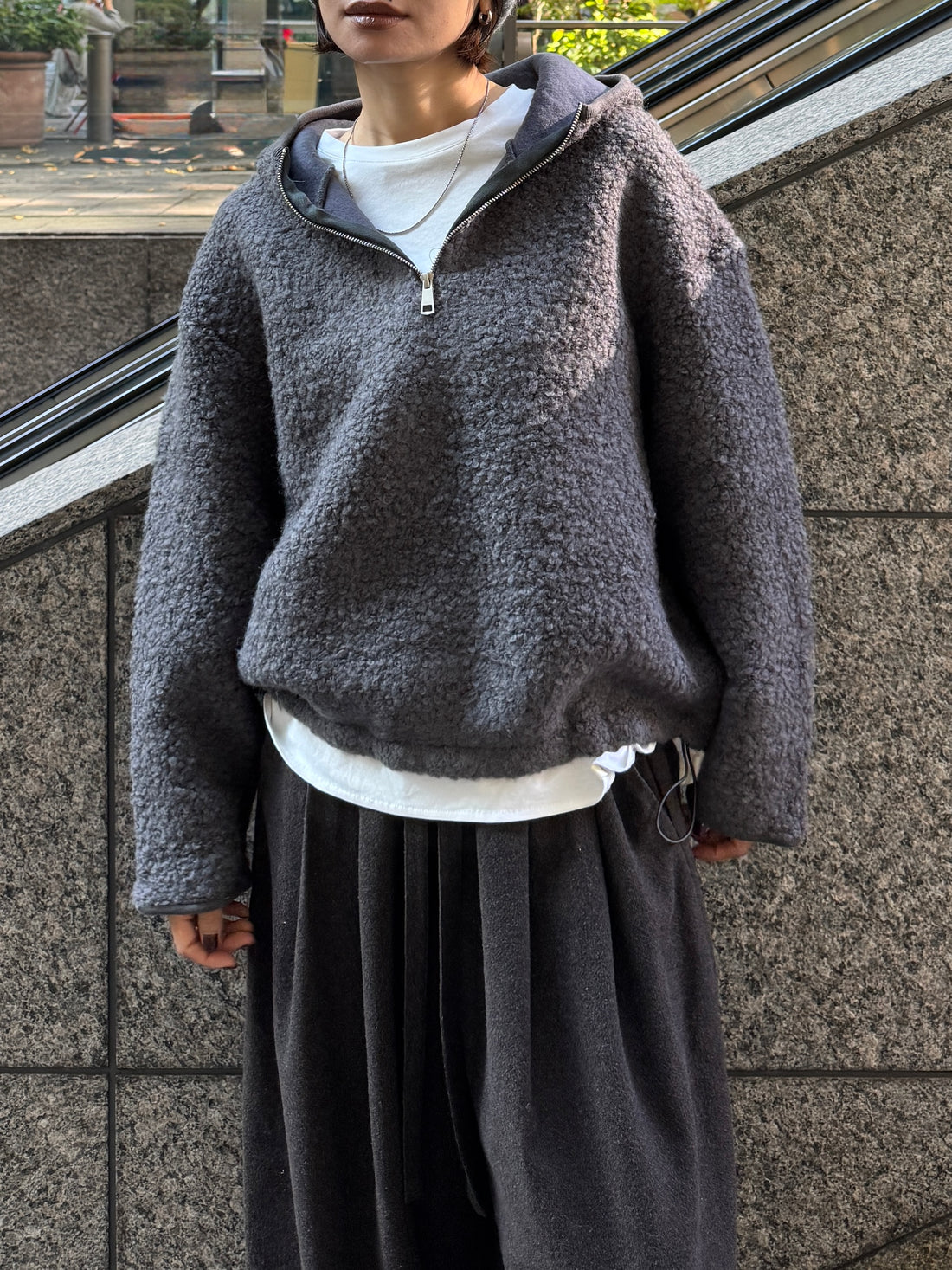 【アイテム】ふんわりと包み込まれるような着心地が魅力の、ボアプルオーバーフーディ。 表面は細やかなカール感のあるボア生地で見た目にも暖かく、程よい厚みがありながら重さを感じにくい1枚に。 内側は肌当たりの良いスムースな裏地でニットのチクチクが苦手な方でも快適にご着用いただけます。 顔まわりをすっきり見せてくれるフードは二重仕立てで、カジュアルながら立体感と上品さを損なわない立ち上がりに仕上げました。 裾にドローコード付きの為、お好みで絞れば丸みのあるシルエットになりスタイリングに変化をつけられます。 大人のデイリースタイルに自然と馴染みながら、ボアの柔らかな表情でシーズンムードを高めてくれるアイテムです。
