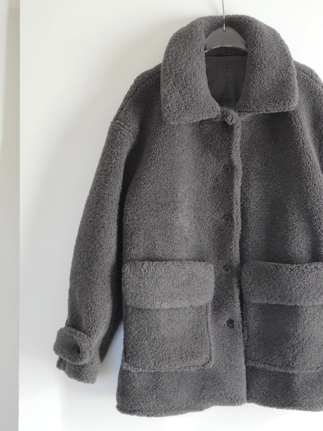 【アイテム】ふわりと包み込まれるような心地よさが魅力の、ボリュームシルエットのボアジャケット。 柔らかなポリエステル100%のボア生地は、程よい毛足で上品な表情が魅力。 軽量ながらしっかり暖かく、デイリーアウターとして気軽に取り入れていただけます。 フロントには大きめのパッチポケットを配置し、デザイン性と実用性を両立しながら 太めの袖口ストラップや、やや広めのショールカラーがクラシックなニュアンスを加え、抜け感のある1枚に仕上げました。 ゆったりとしたドロップショルダーのラインは身体のラインを拾わず、スウェットやニットなどの厚手トップスも重ねやすい万能さが◎ デイリーに寄り添いながら、雰囲気ある冬の装いを叶えてくれるアイテムです。