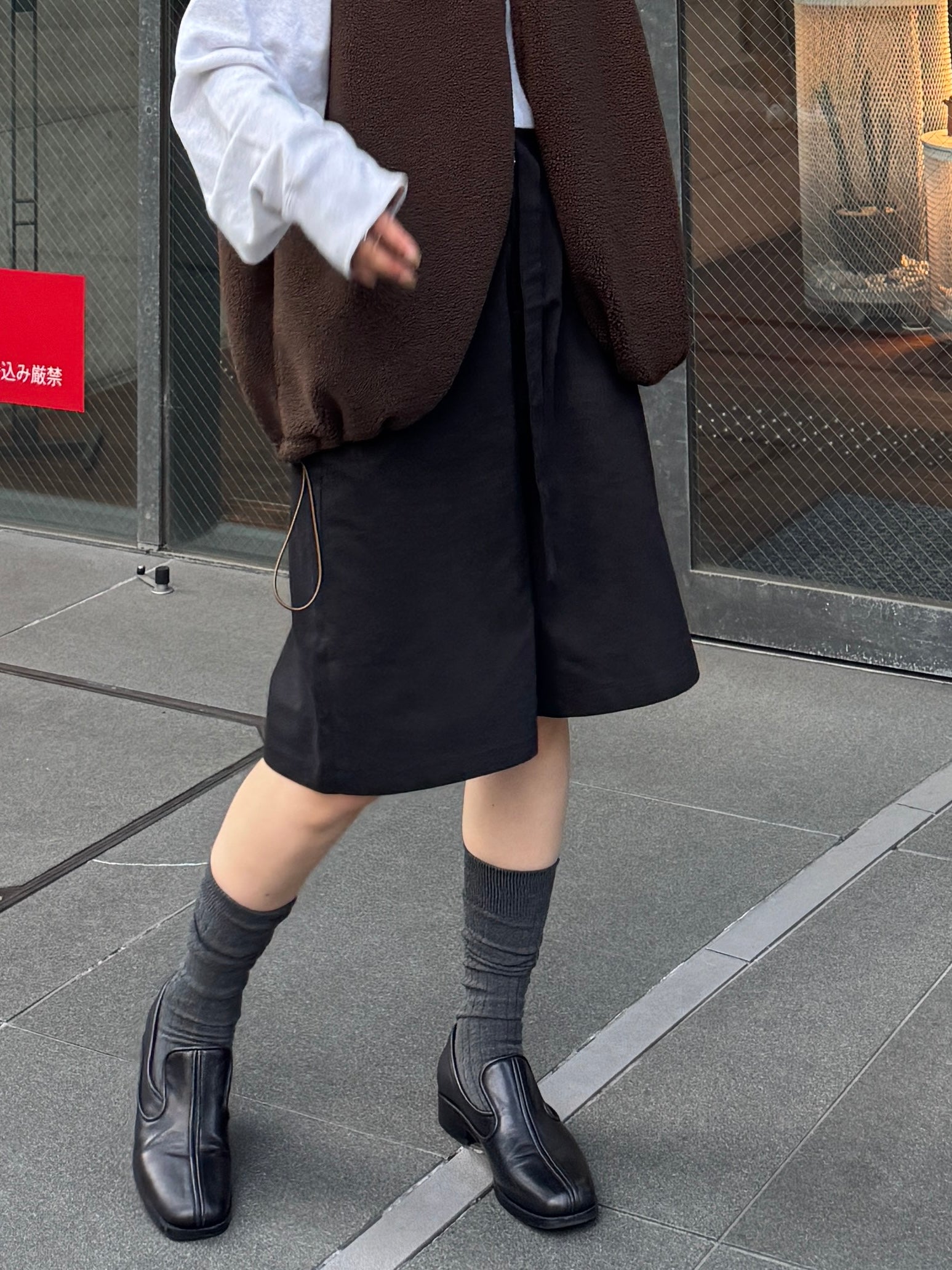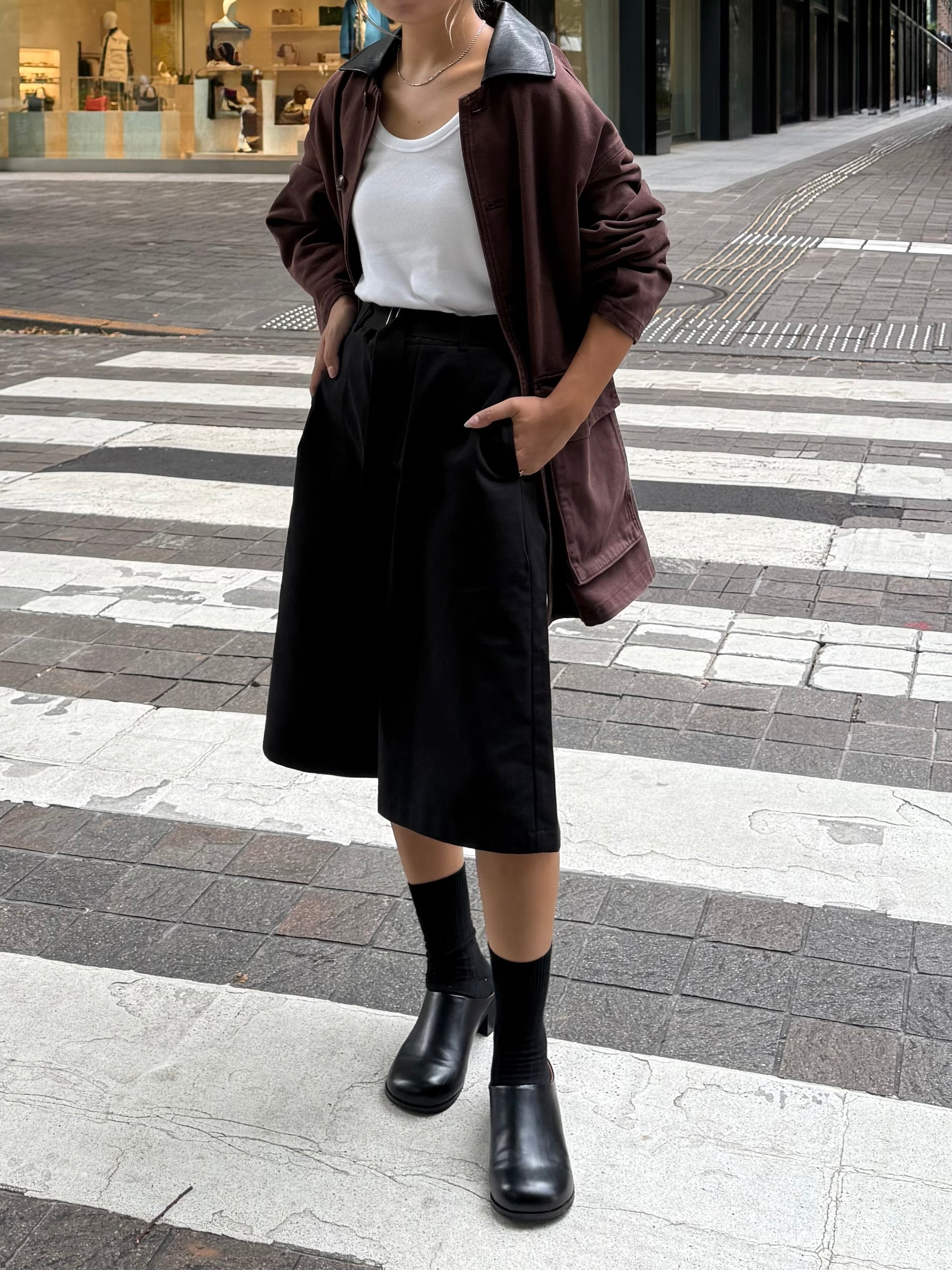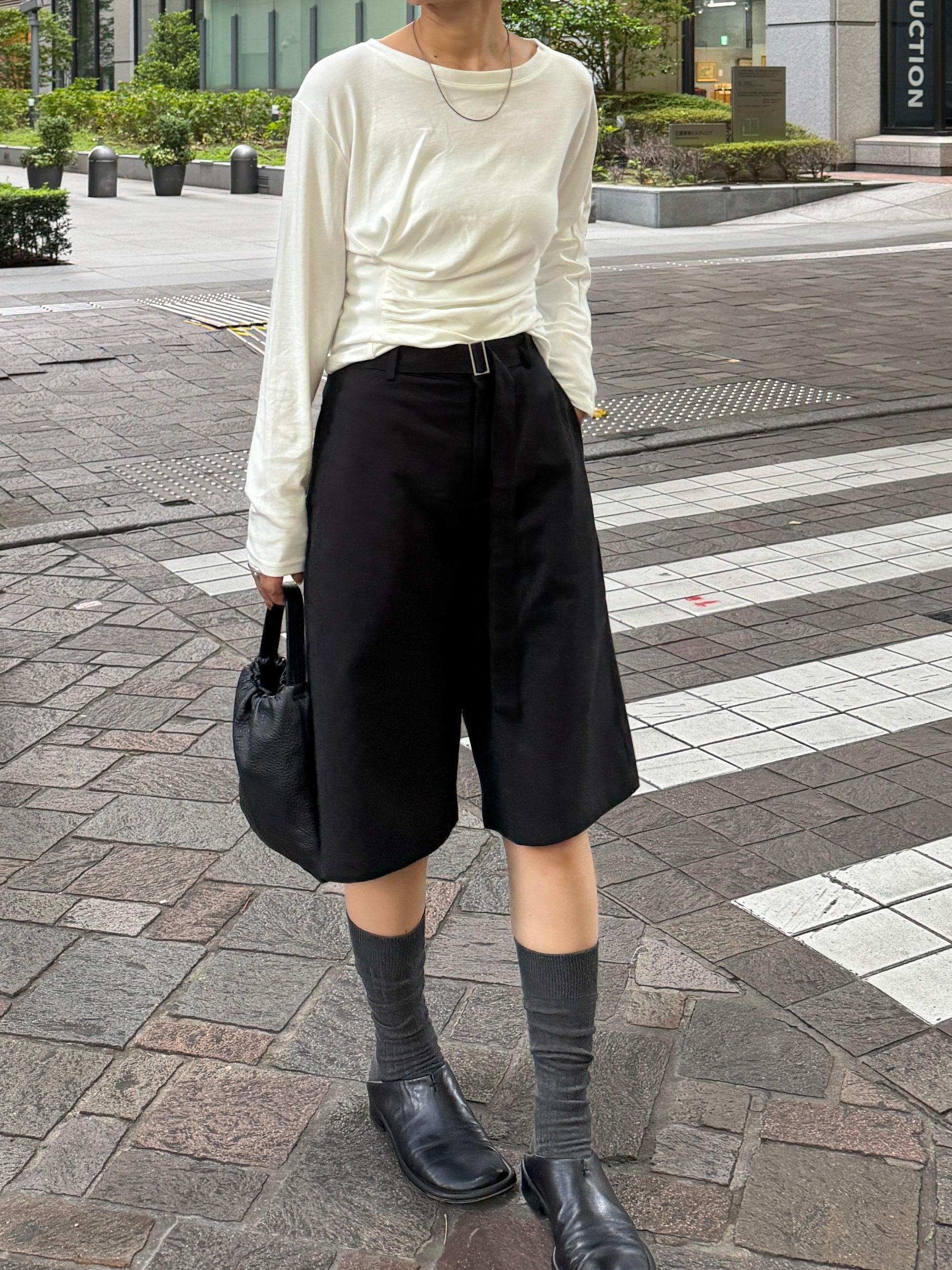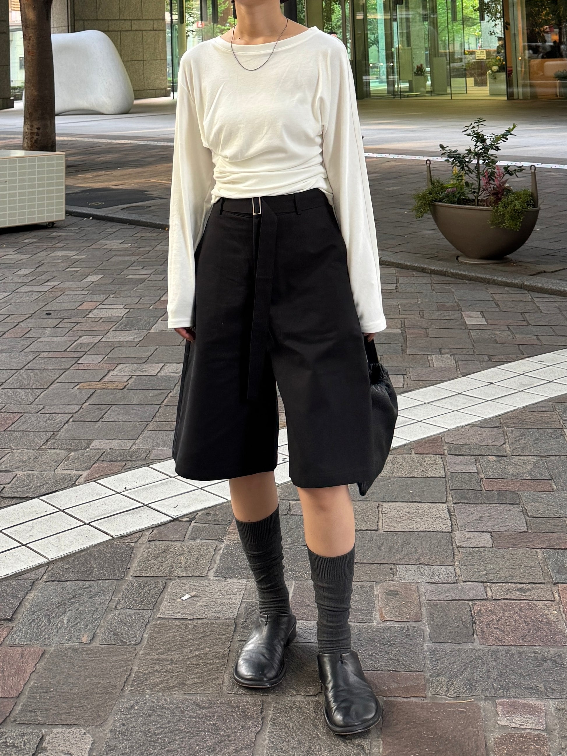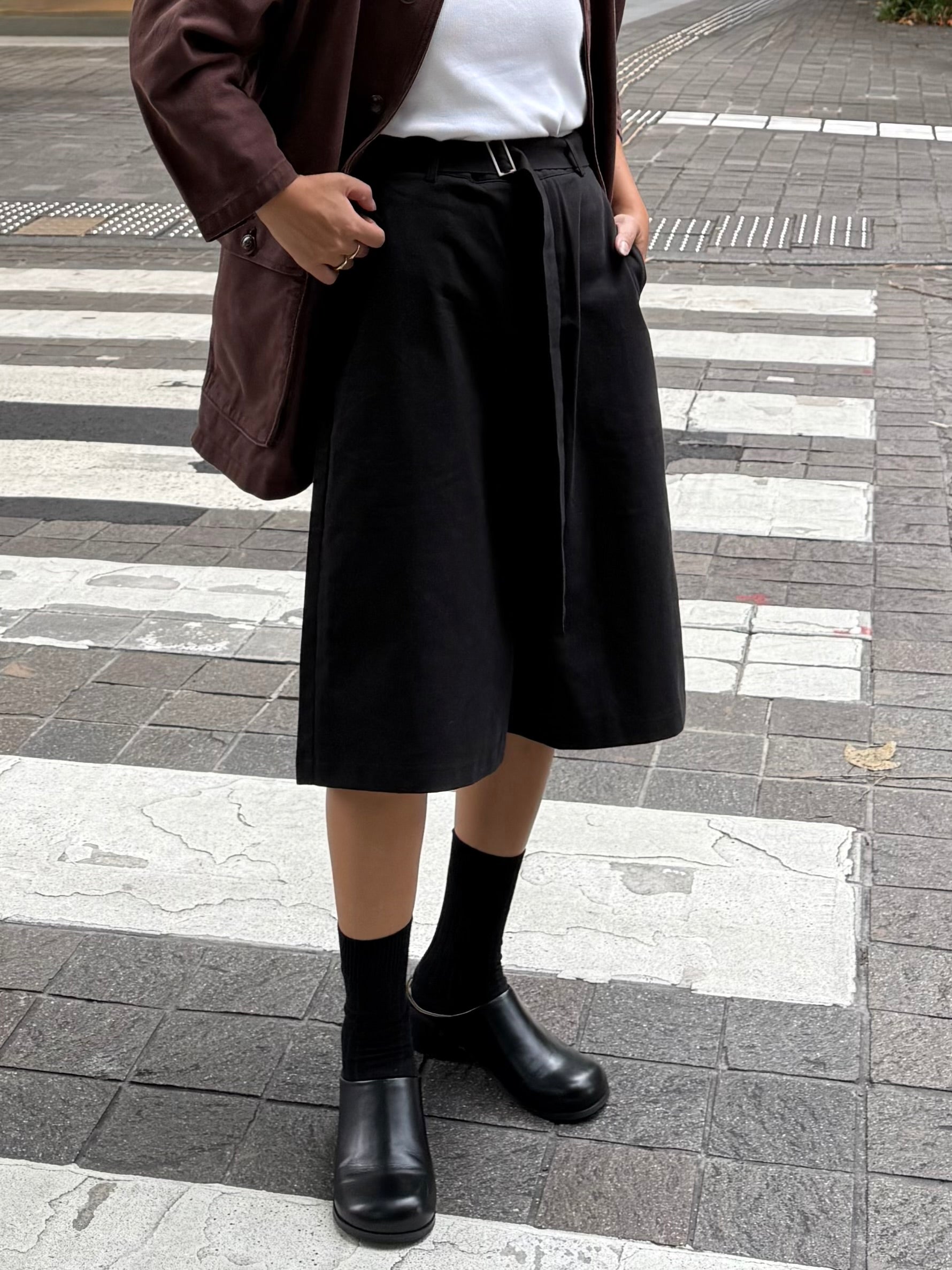 旬のシルエットを上品さとカジュアルどちらも落とし込み仕上げたワイドバミューダパンツ。 ウエストは共布ベルト付きでブラウジングするとメリハリのある印象に。 膝が隠れるくらいのミディ丈で体型カバー効果が高く、日常に取り入れやすいシンプルさとデザイン性を兼ね揃えた1本。 素材は程よいハリのある生地で、広がりすぎず洗練されたAラインシルエットにこだわりました。 カジュアルスタイルはもちろん、合わせるトップスやシューズで綺麗めな雰囲気まで幅広く楽しめるアイテム。