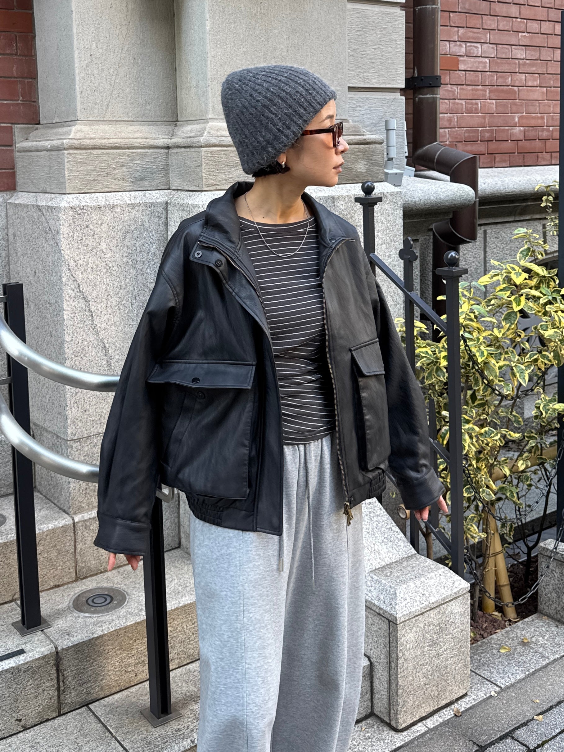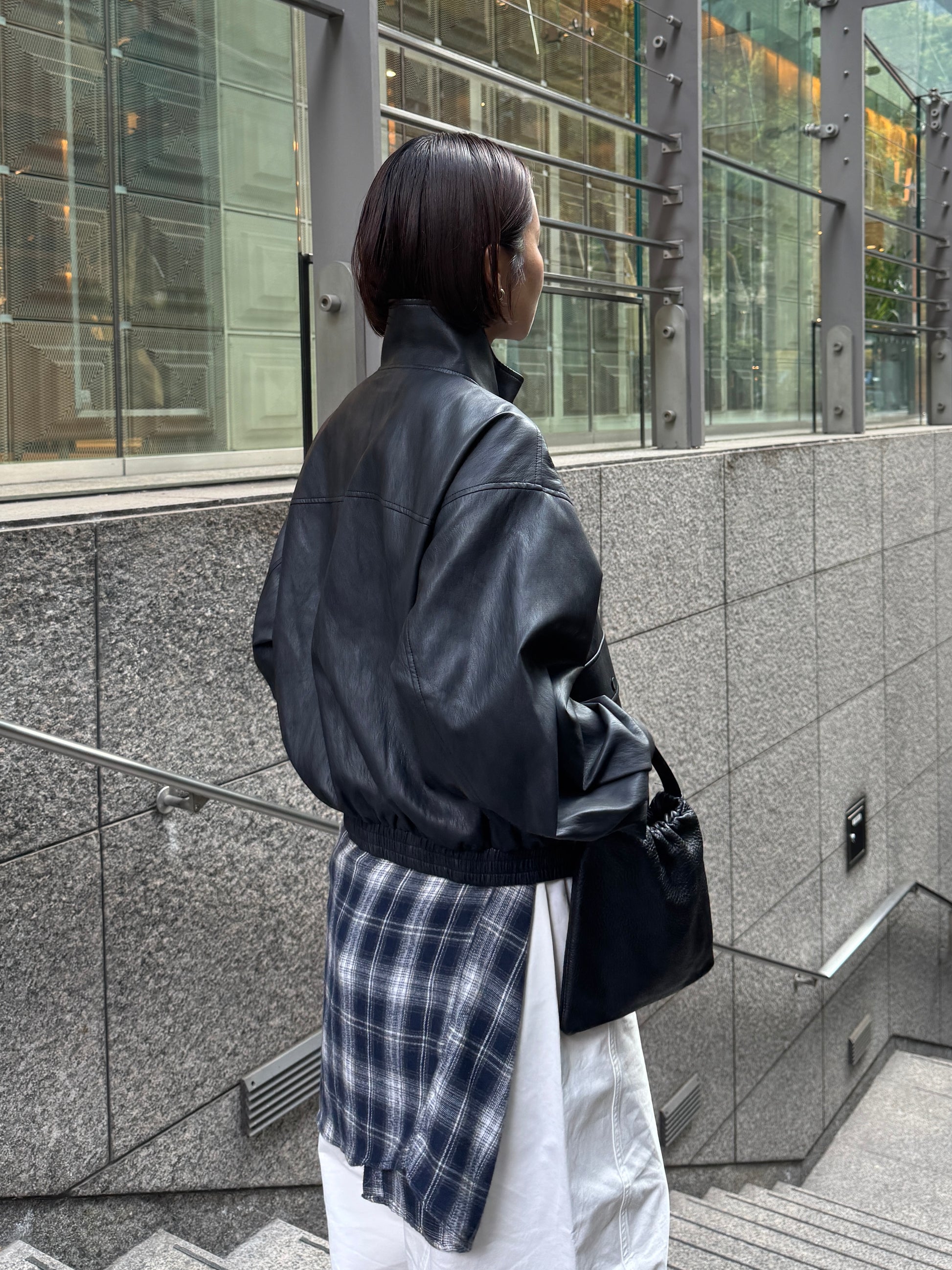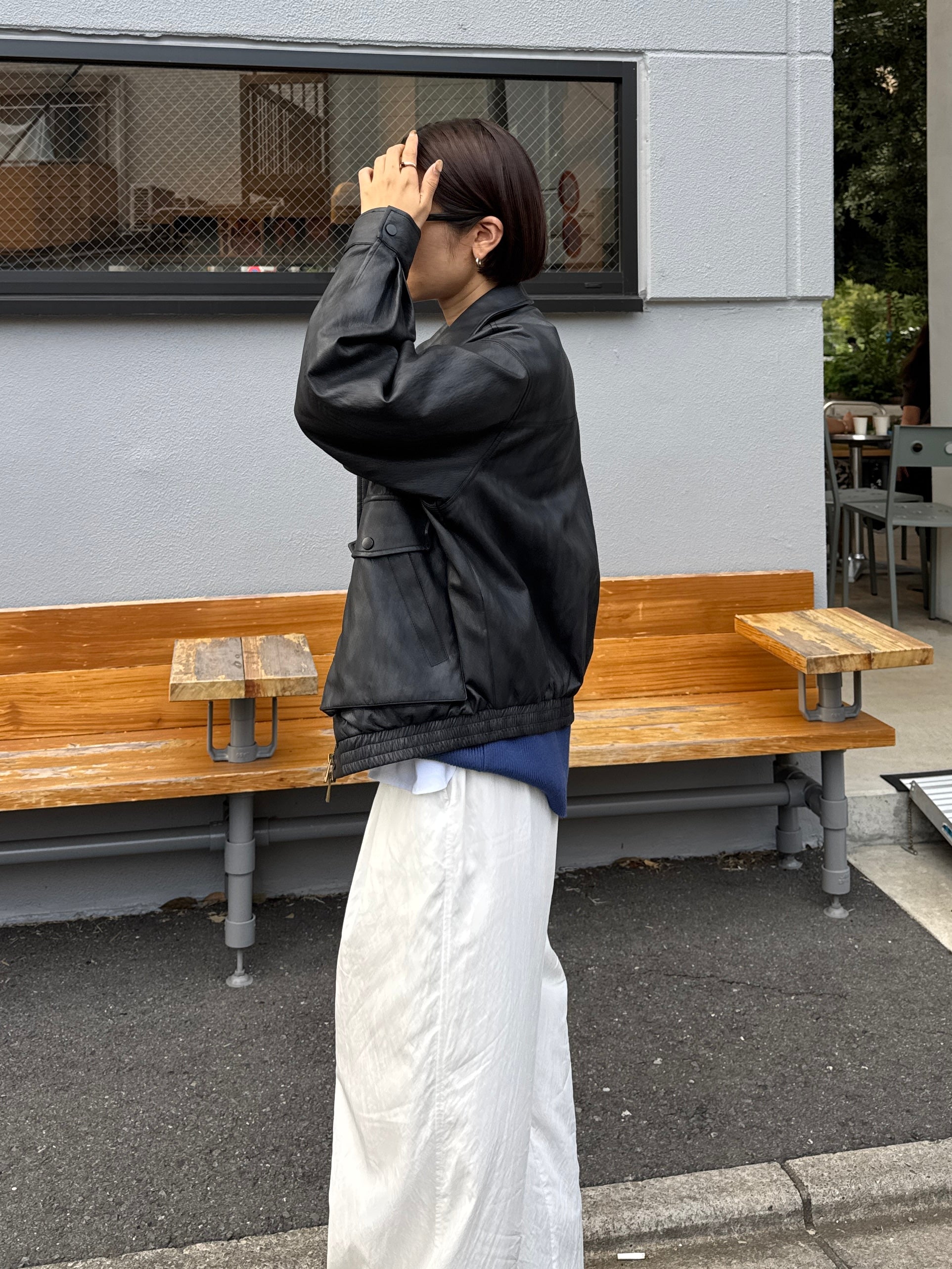 上品な落ち着いた艶感を纏ったフェイクレザーブルゾン。 マットな光沢と柔らかな質感が魅力で、レーヨン混のしなやかさと程よいハリ感を兼ね揃えた1着に仕上げました。 レザー特有の重たさを抑え軽やかな着心地に、フロントは開閉のしやすいジップ仕様に加え、 さりげなく都会的な印象を添えるマグネットスナップボタンを採用。 フラップ付きポケットは2重構造になっており、サイドからも手を入れられる仕様でデザイン性、実用性ともに◎裾にはゴムギャザーをあしらいシルエットに立体感を演出してくれます。