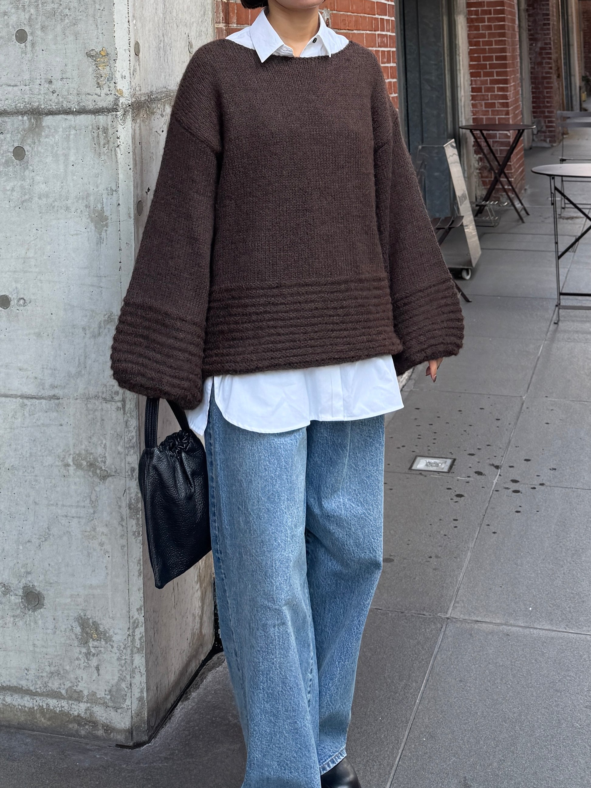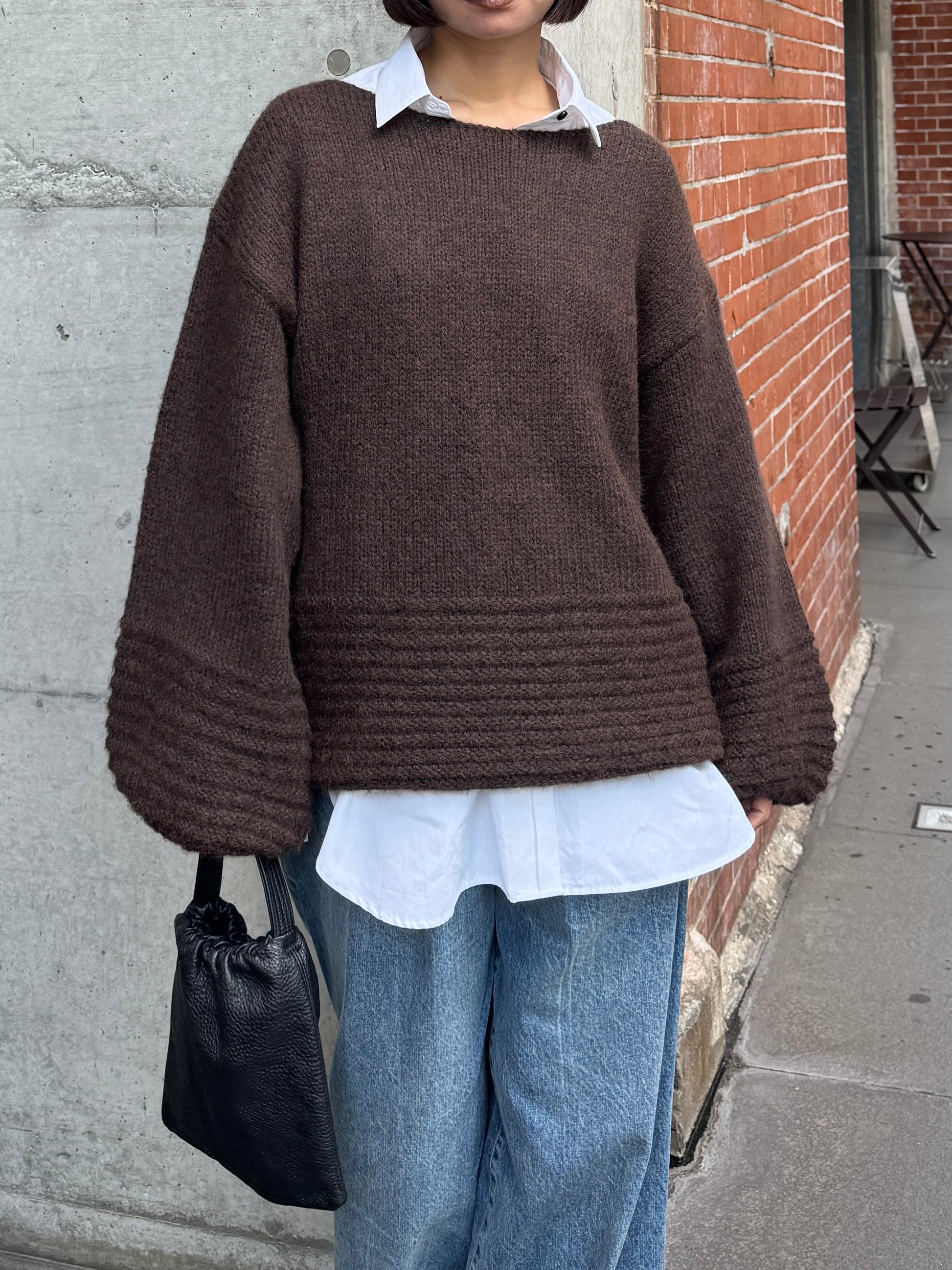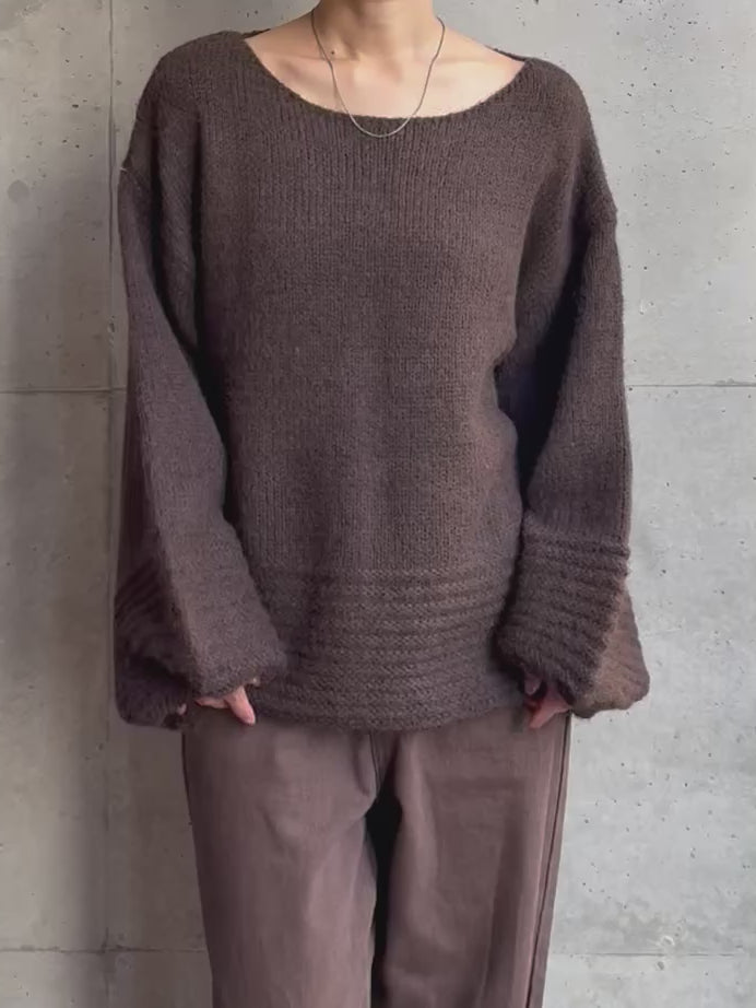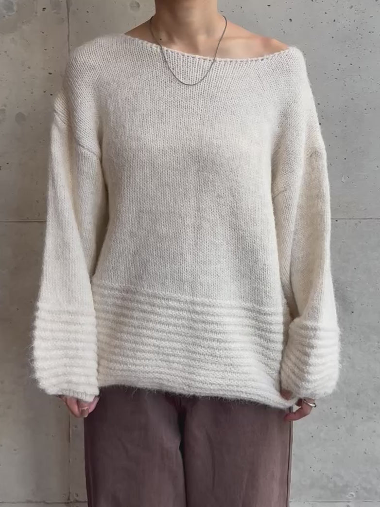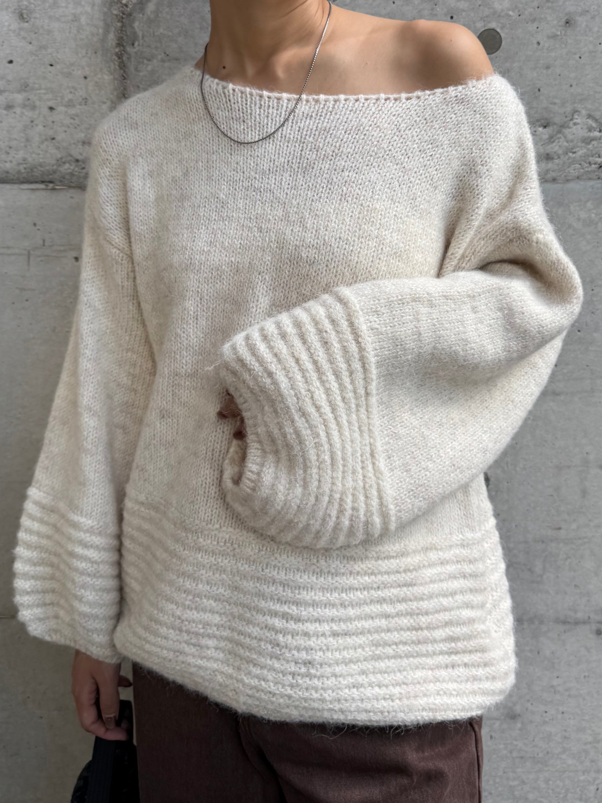 程よいボリューム感と柔らかな風合いが魅力のニットプルオーバー。 やわらかく包み込むような着心地で、カジュアルの中にも上品さを感じさせてくれます。 袖口と裾に施された太めのリブ編みがデザインのアクセントになり、立体的な表情を出してくれる1着。 首元はやや広めのボートネックにすることで、カットソーやシャツをレイヤードして襟をのぞかせたり、 ワンショルダー風の着こなしで女性らしい抜け感を演出したりと、 1枚でもレイヤードでもシンプルながらスタイリングの幅を広げてくれるアイテムです。