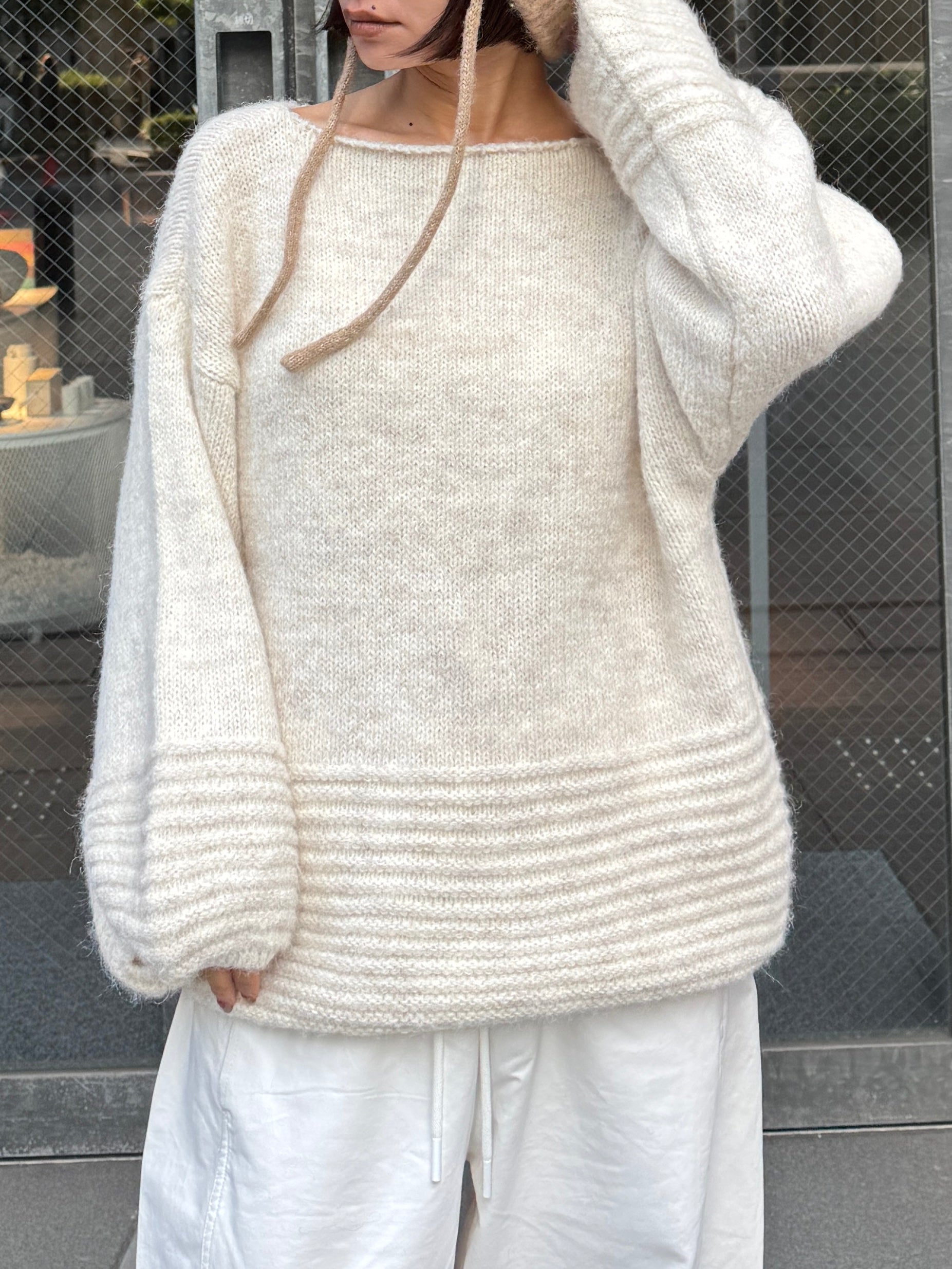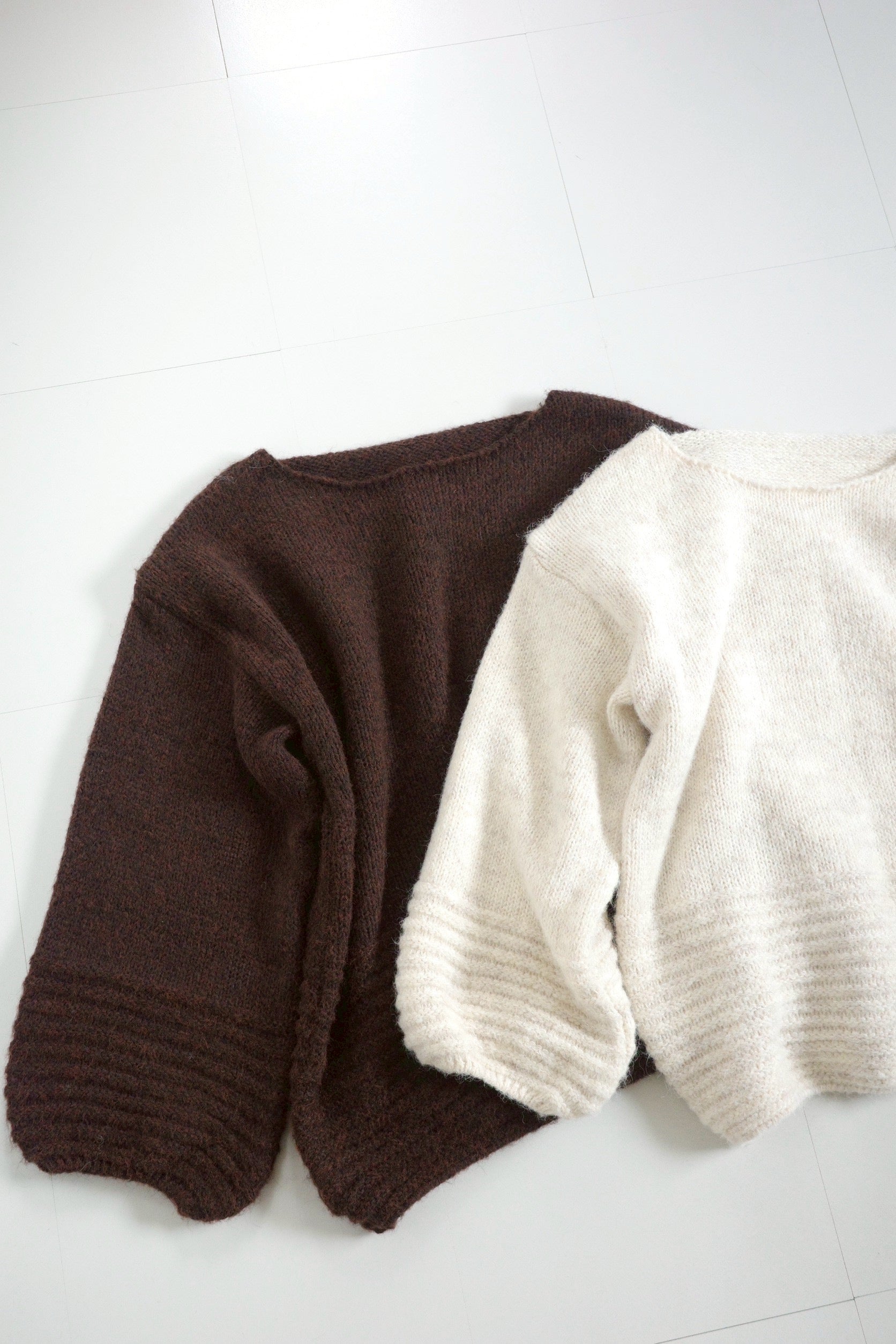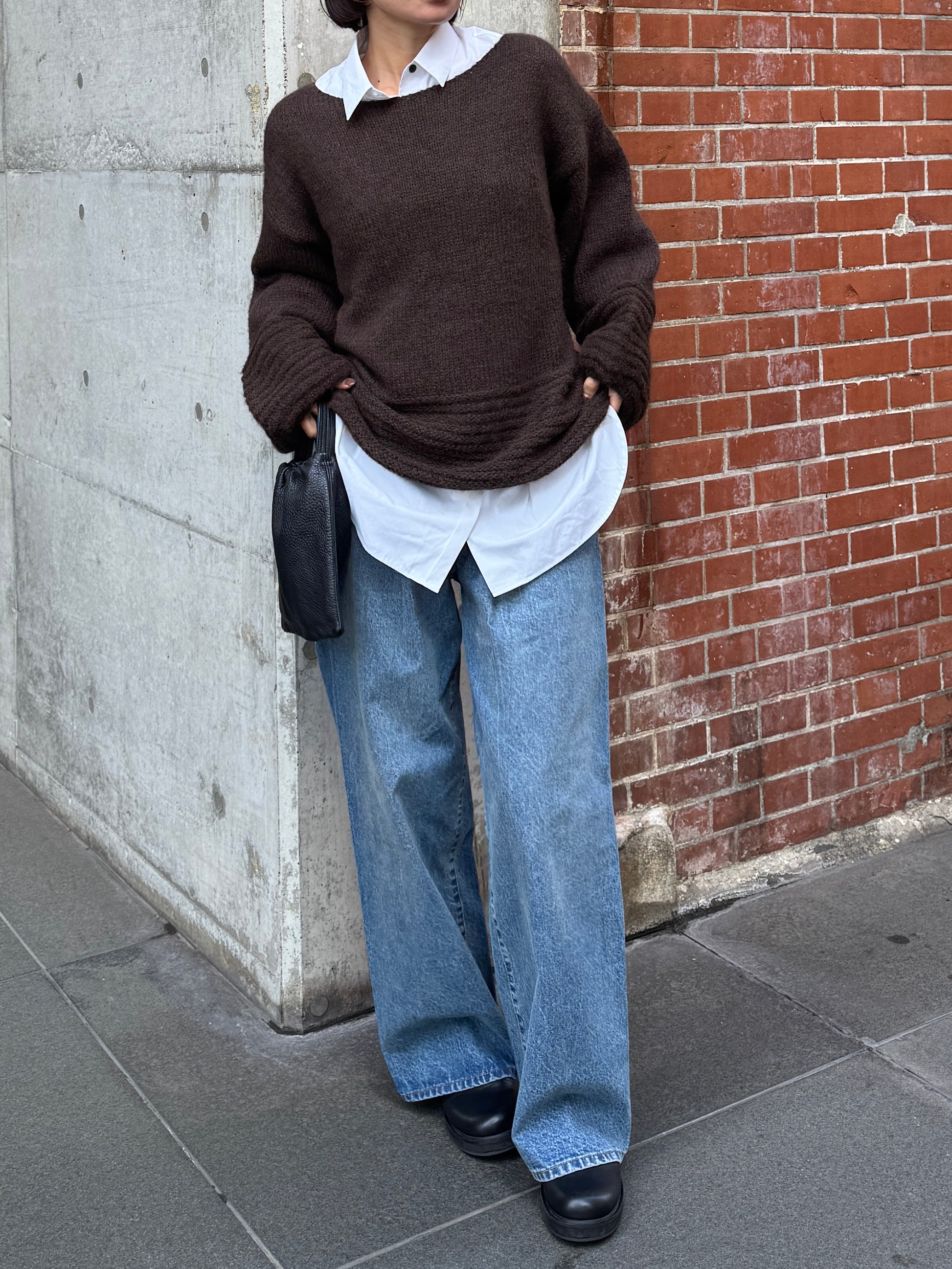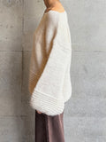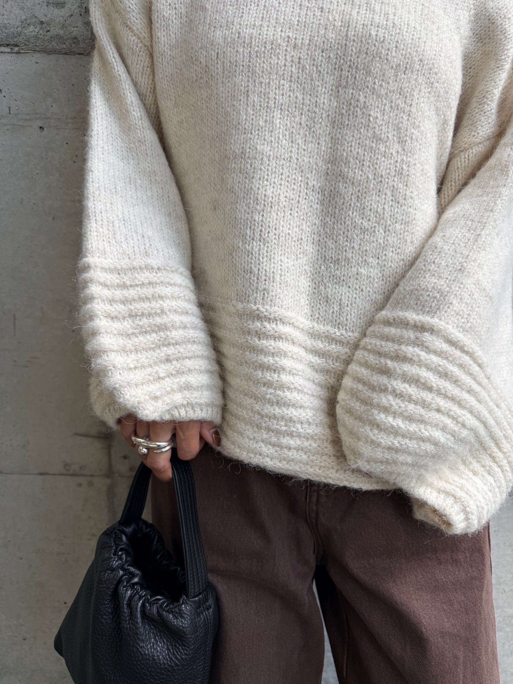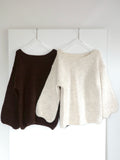 程よいボリューム感と柔らかな風合いが魅力のニットプルオーバー。 やわらかく包み込むような着心地で、カジュアルの中にも上品さを感じさせてくれます。 袖口と裾に施された太めのリブ編みがデザインのアクセントになり、立体的な表情を出してくれる1着。 首元はやや広めのボートネックにすることで、カットソーやシャツをレイヤードして襟をのぞかせたり、 ワンショルダー風の着こなしで女性らしい抜け感を演出したりと、 1枚でもレイヤードでもシンプルながらスタイリングの幅を広げてくれるアイテムです。