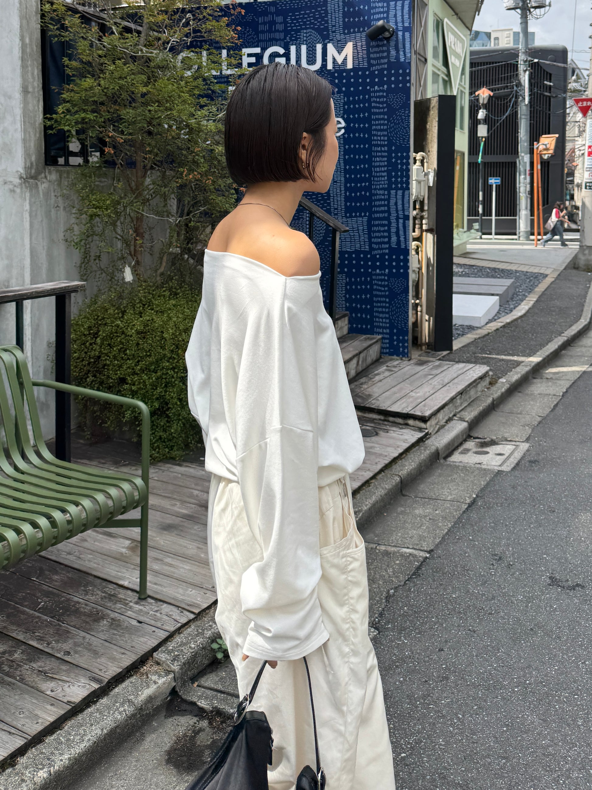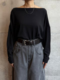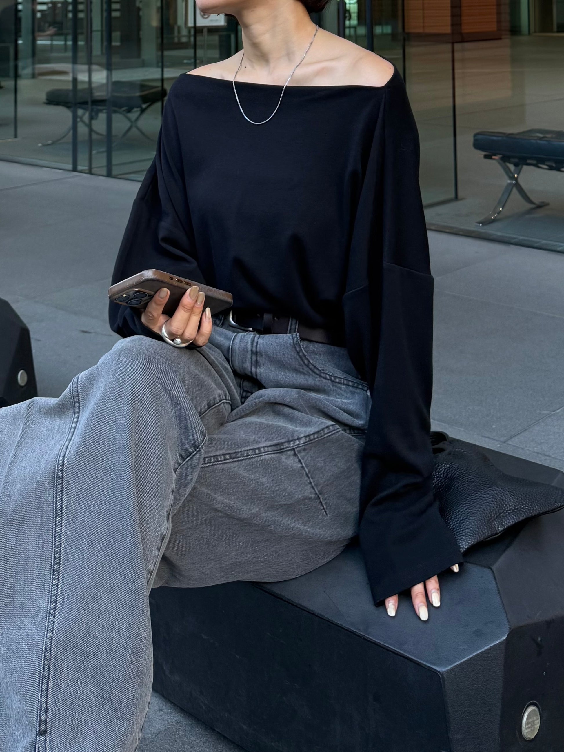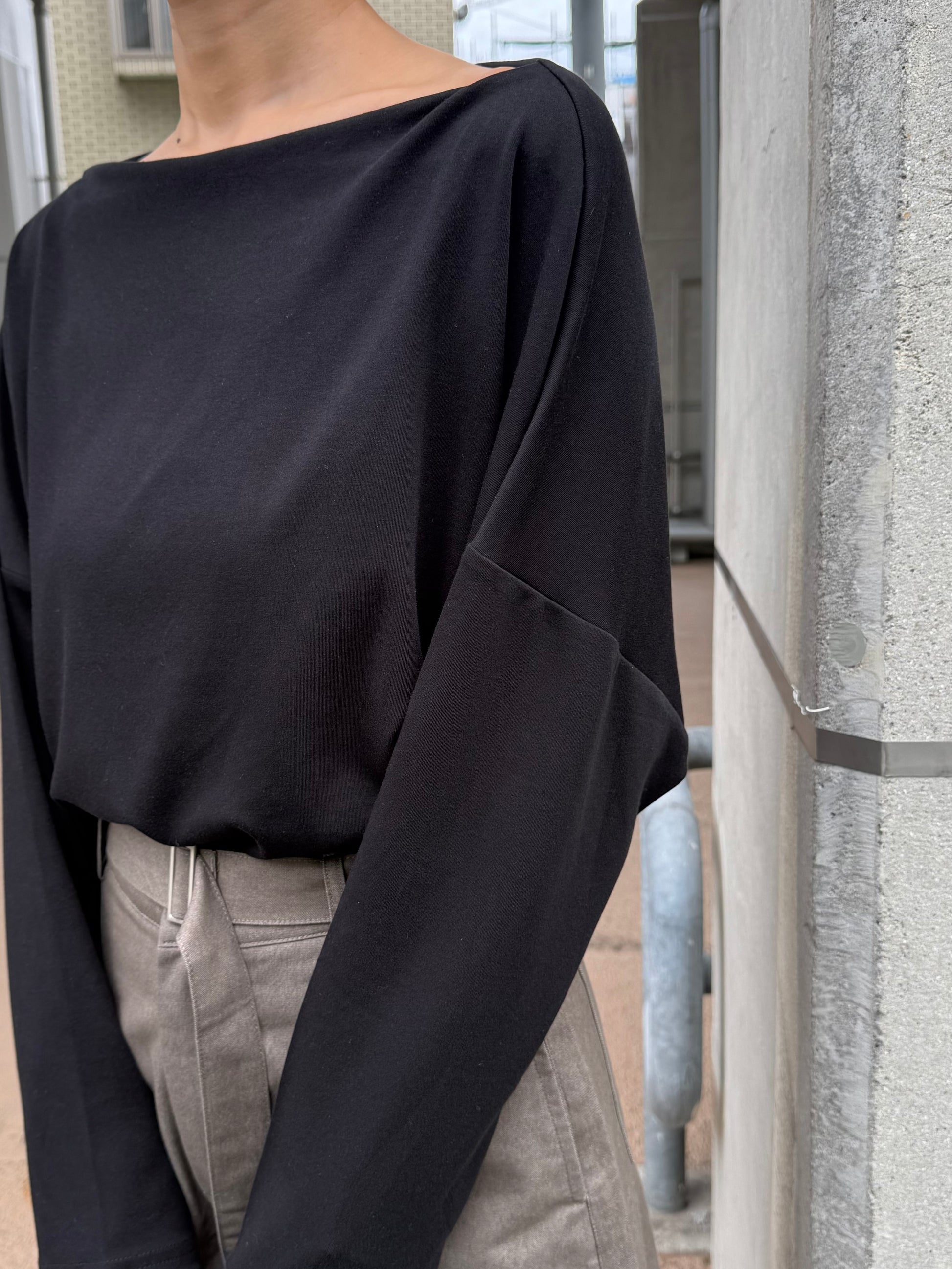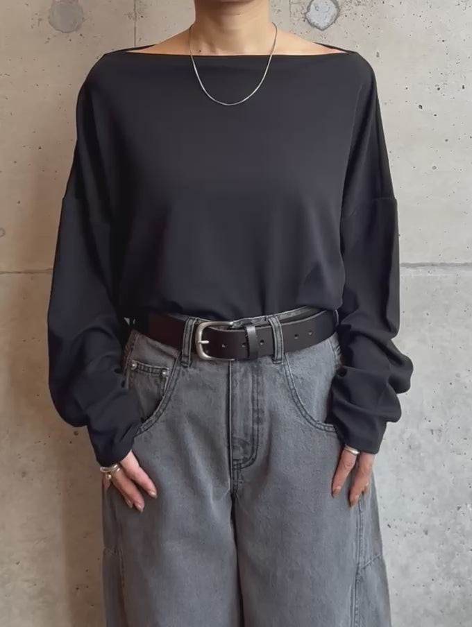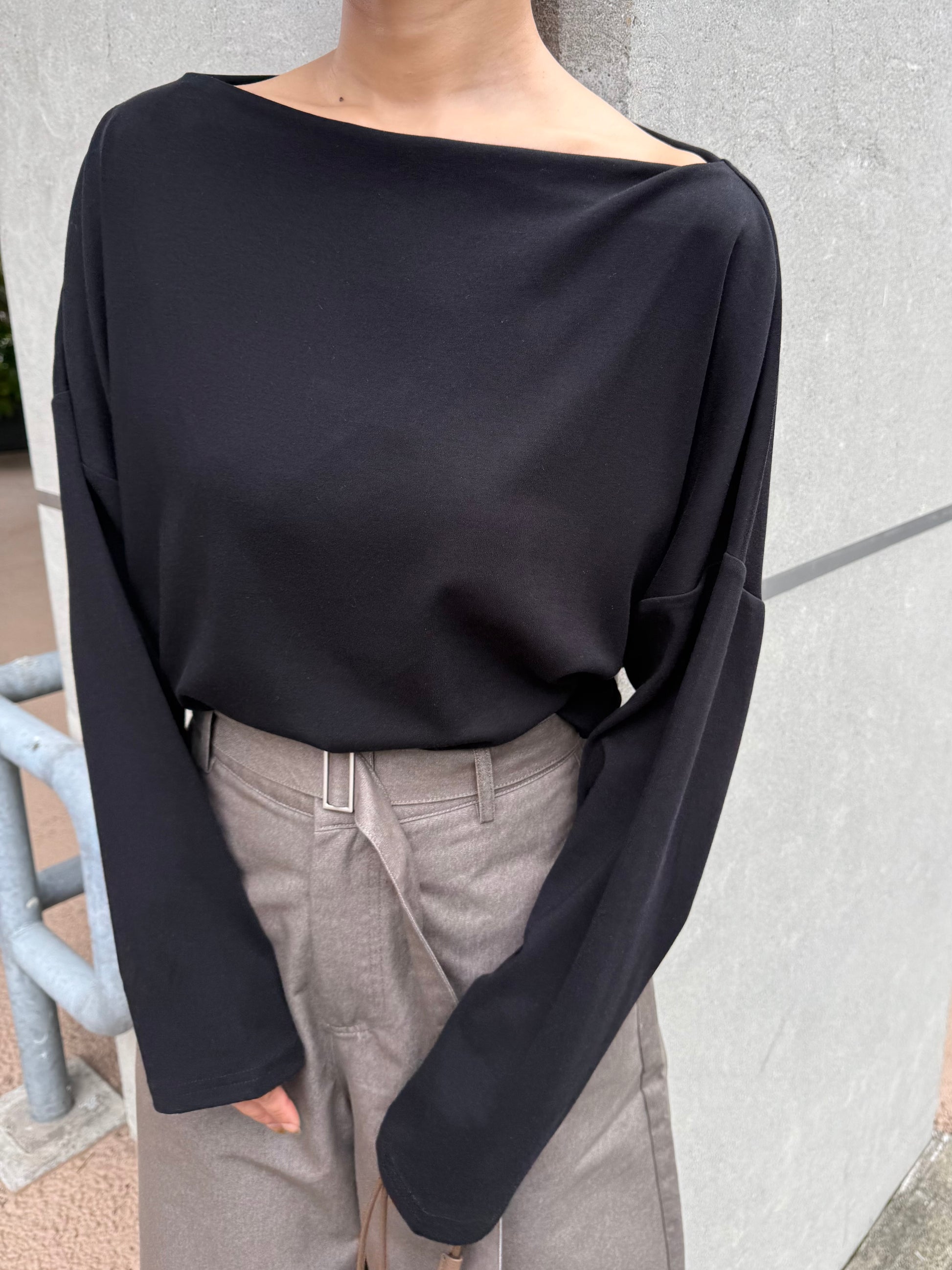 こだわりのシルエットが演出する上品な抜け感が魅力のロングスリーブトップス。 ゆったりとしたボートネックラインで、お好みでオフショルダー風の着こなしもおすすめ。 袖は長めのリラックススリーブで動きに合わせて自然にたまるドレープが生まれ、 体のラインを拾いすぎず大人らしい落ち着いた雰囲気に。 シンプルながらも顔まわりの見え方にこだわったデザインで、 デイリーからラフに着こなし感を出したい日にも幅広く使える1枚です。