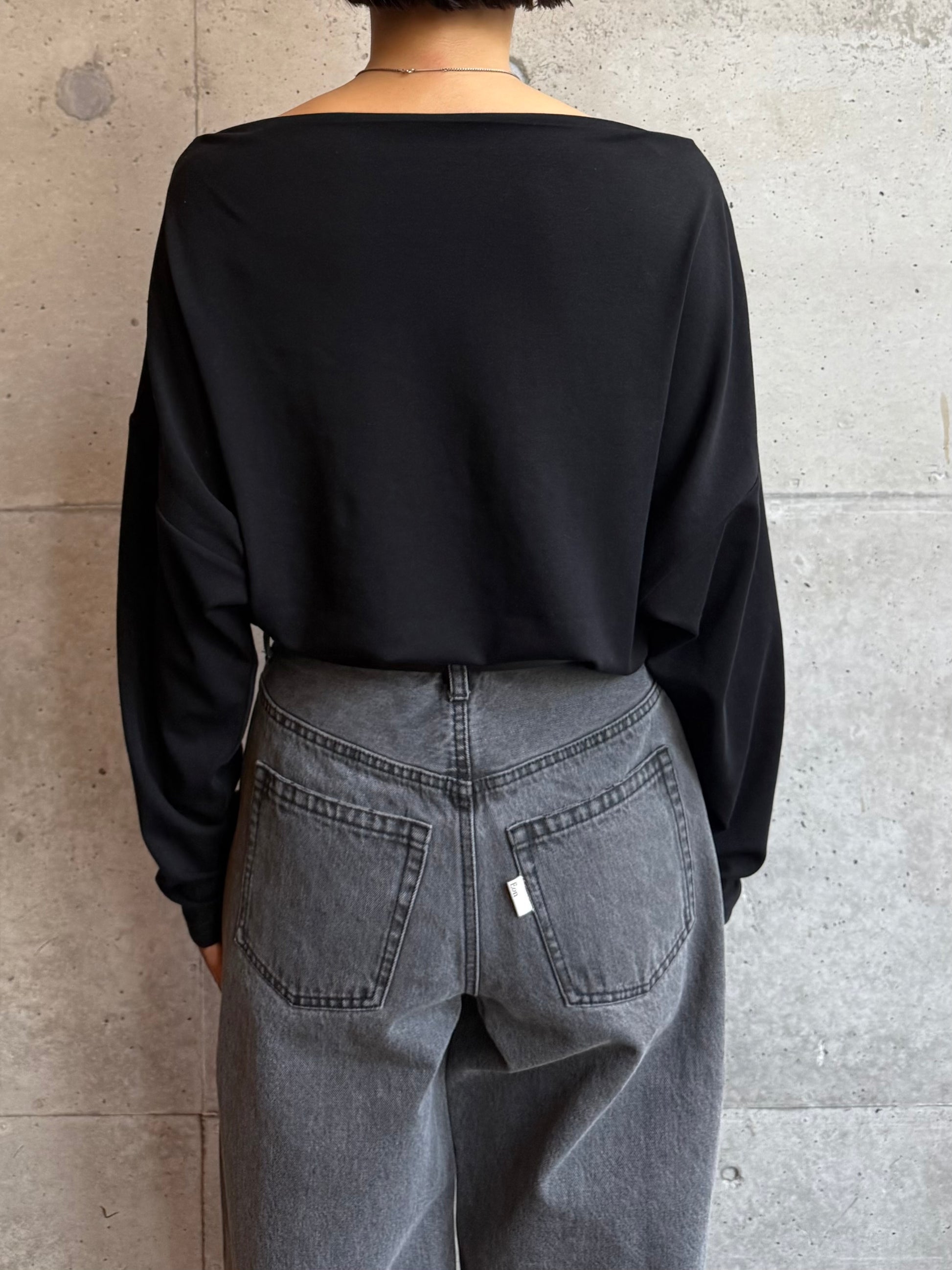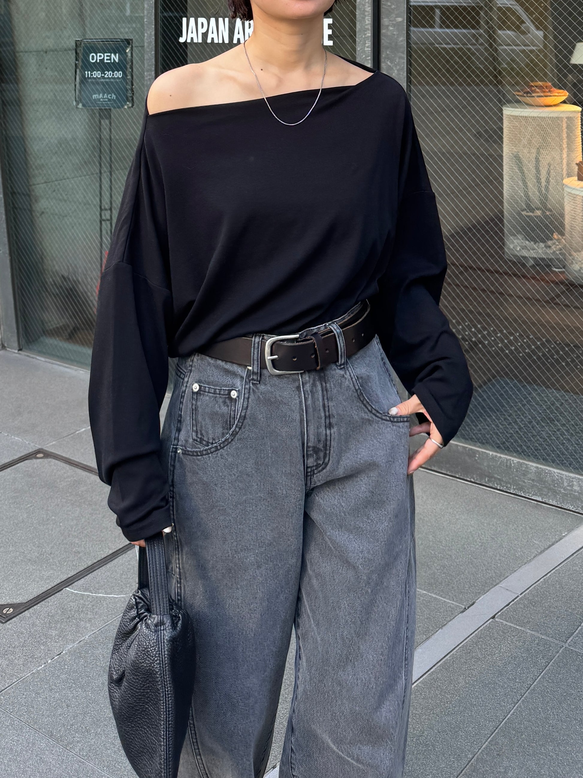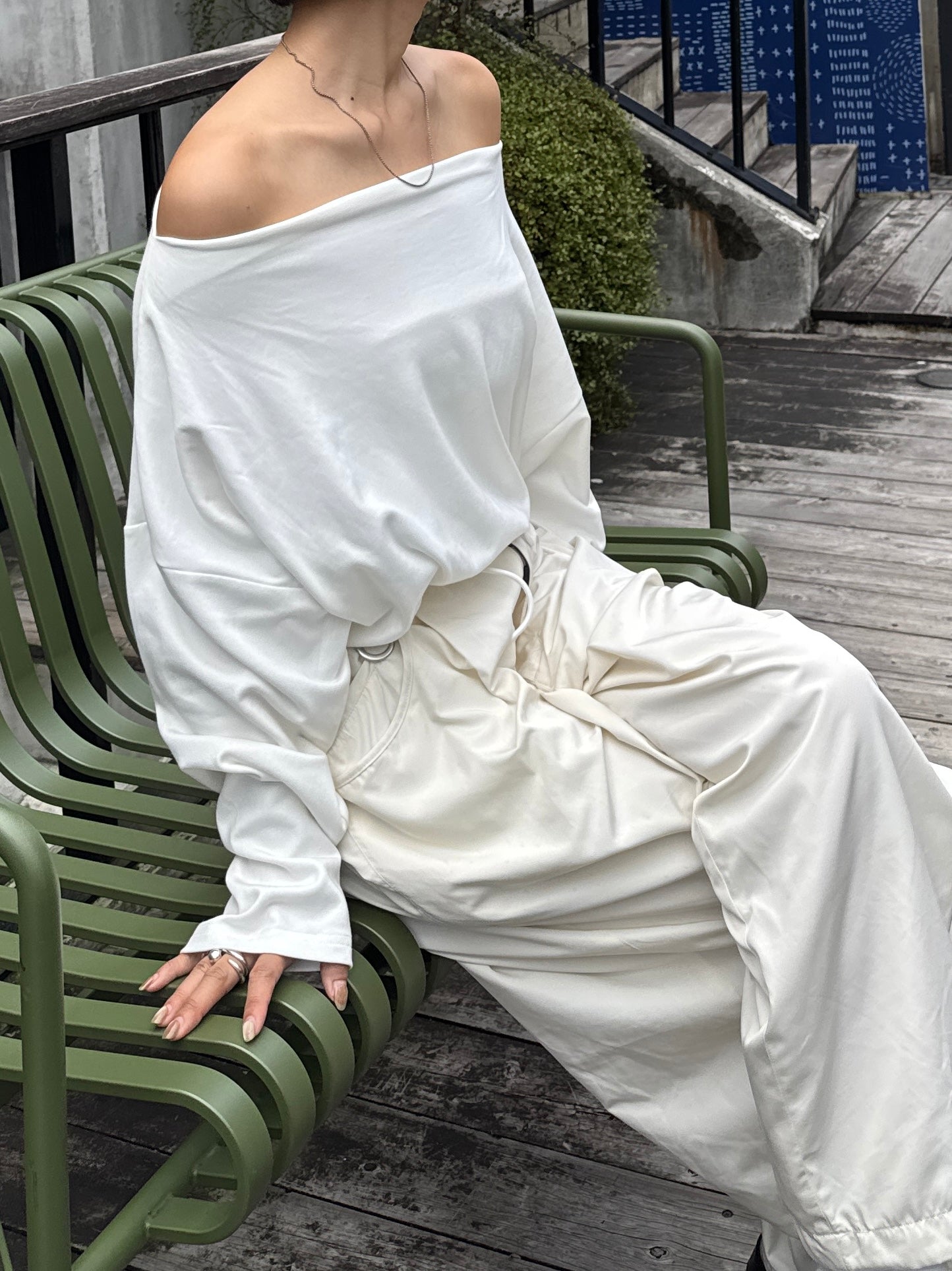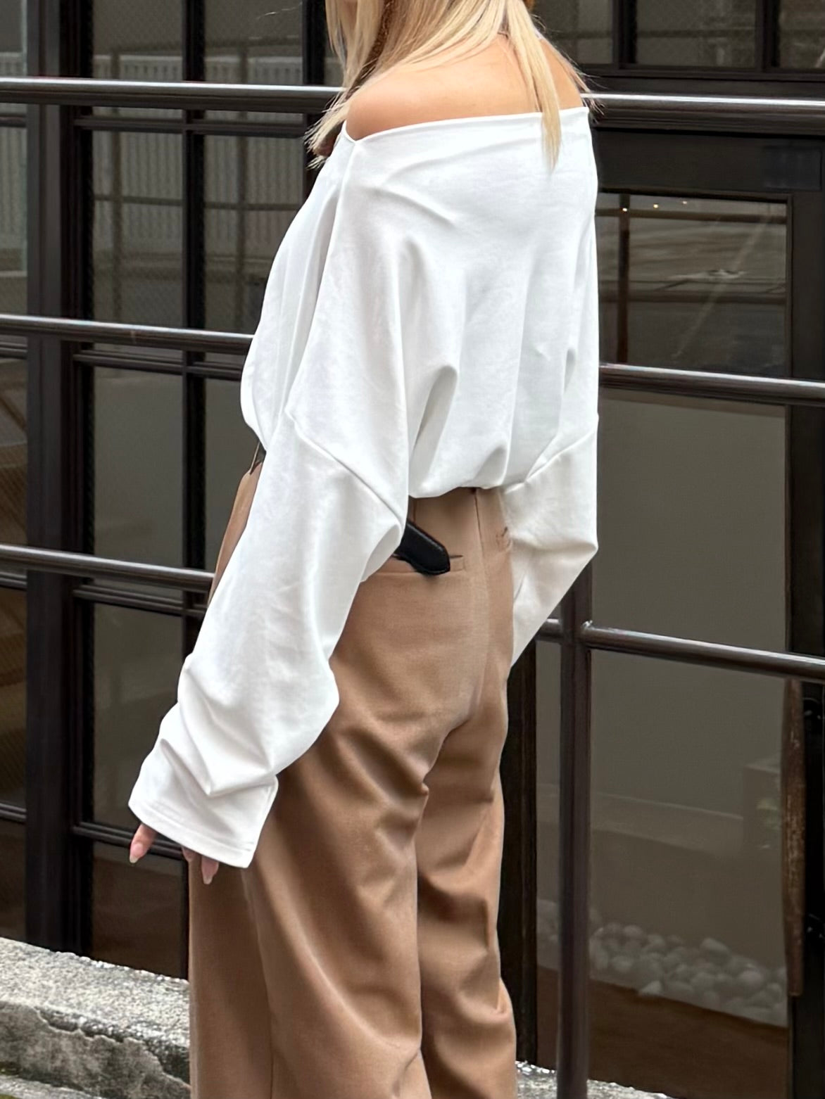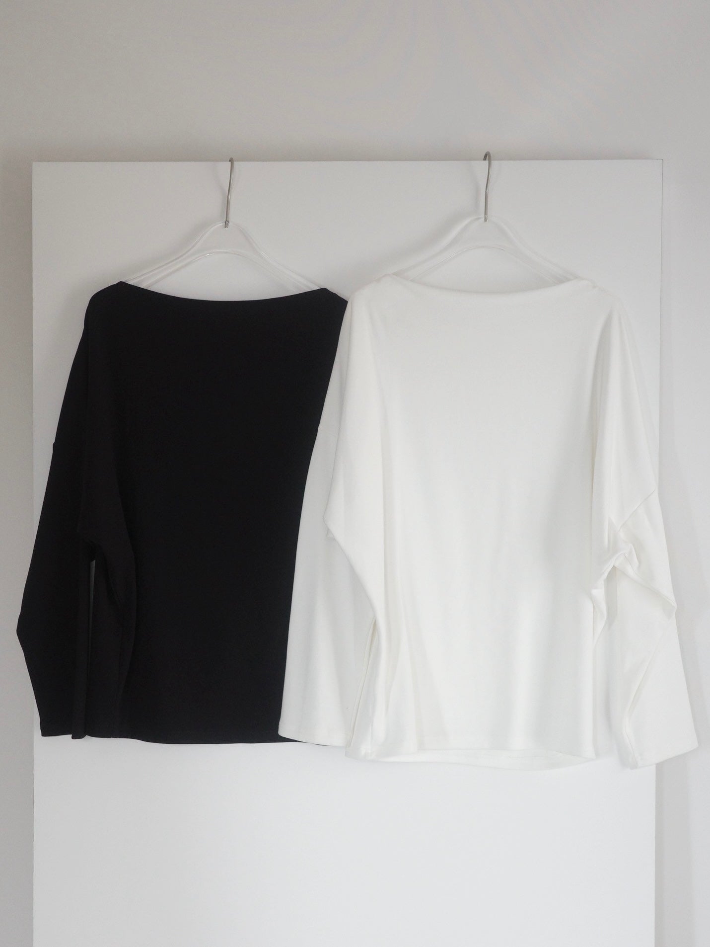 こだわりのシルエットが演出する上品な抜け感が魅力のロングスリーブトップス。 ゆったりとしたボートネックラインで、お好みでオフショルダー風の着こなしもおすすめ。 袖は長めのリラックススリーブで動きに合わせて自然にたまるドレープが生まれ、 体のラインを拾いすぎず大人らしい落ち着いた雰囲気に。 シンプルながらも顔まわりの見え方にこだわったデザインで、 デイリーからラフに着こなし感を出したい日にも幅広く使える1枚です。