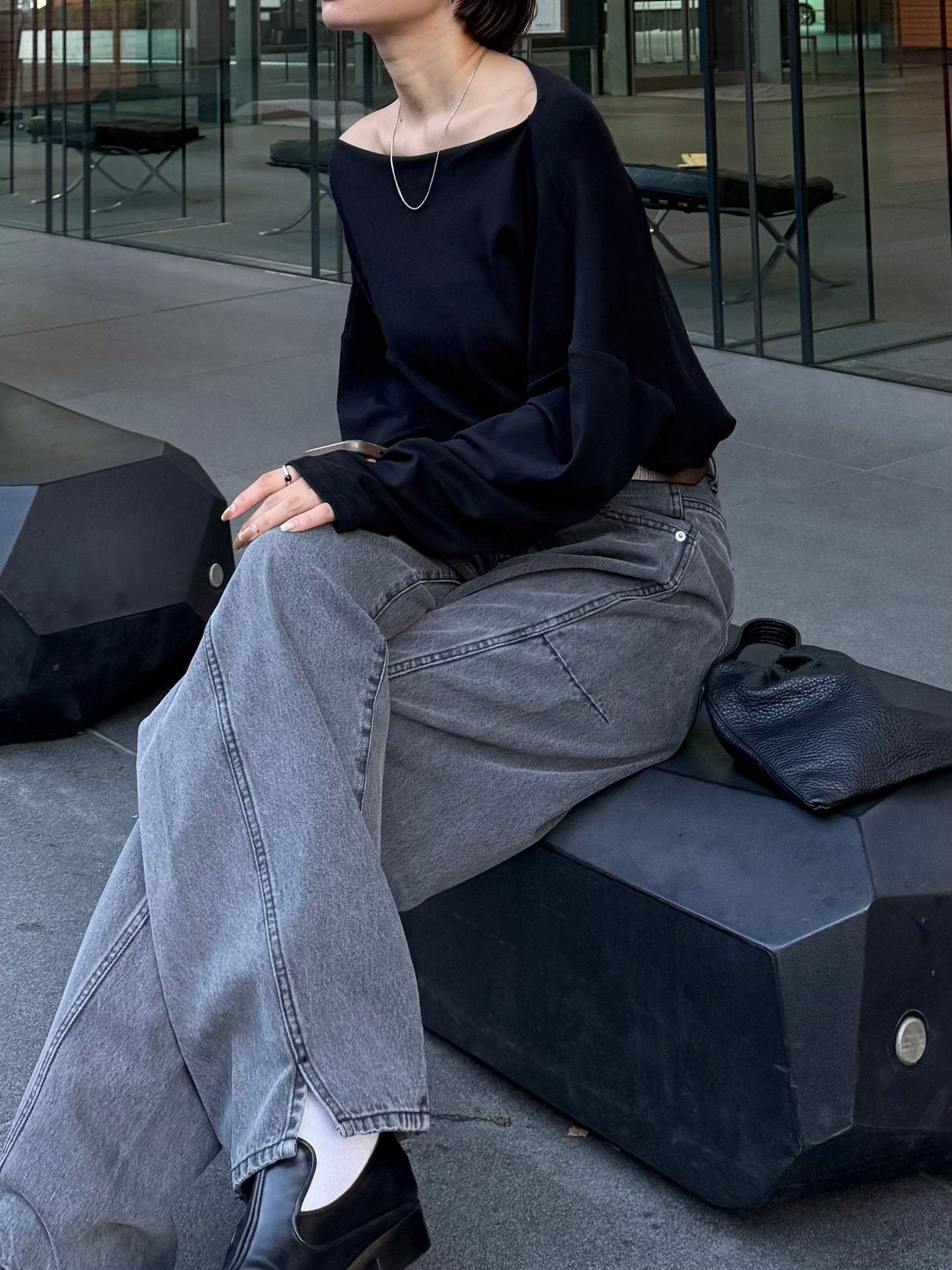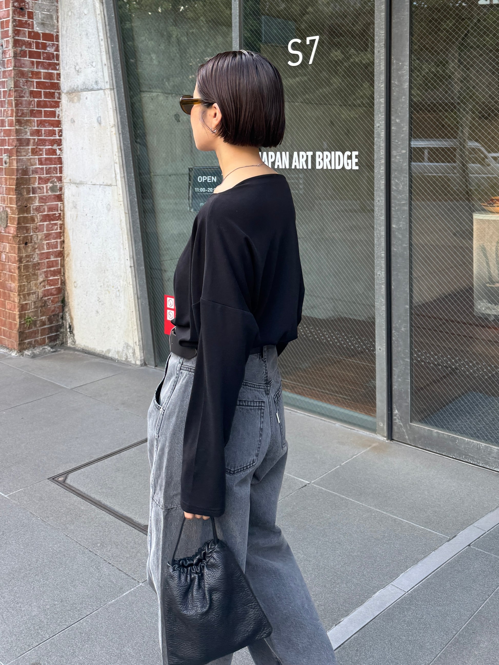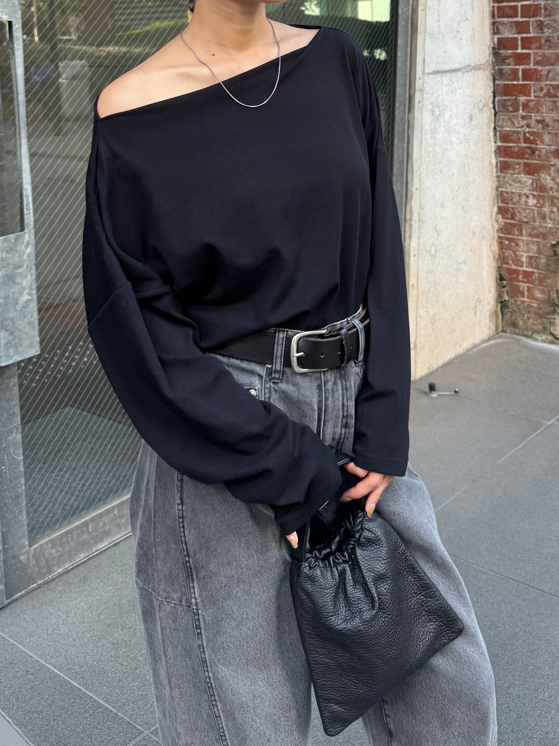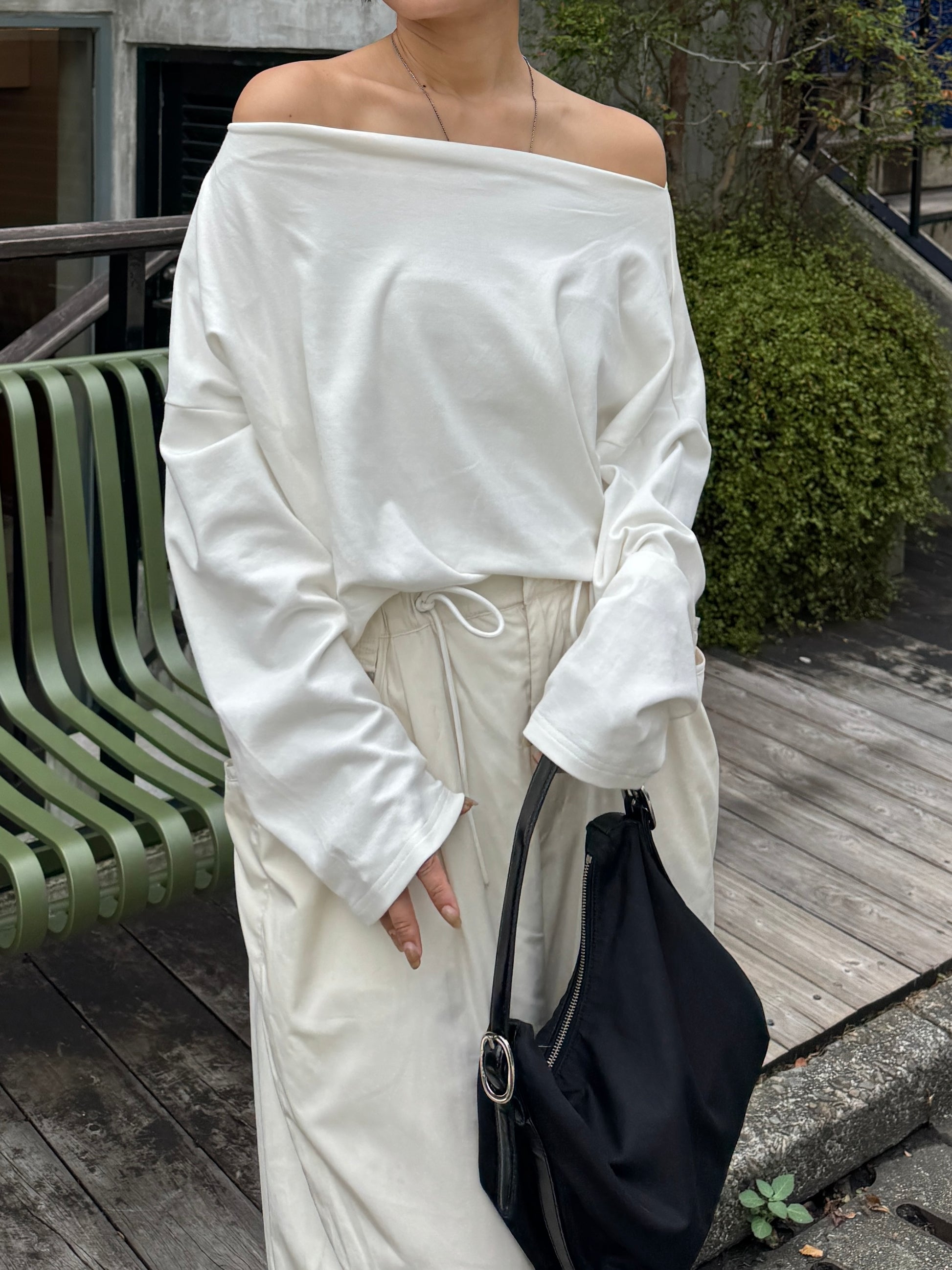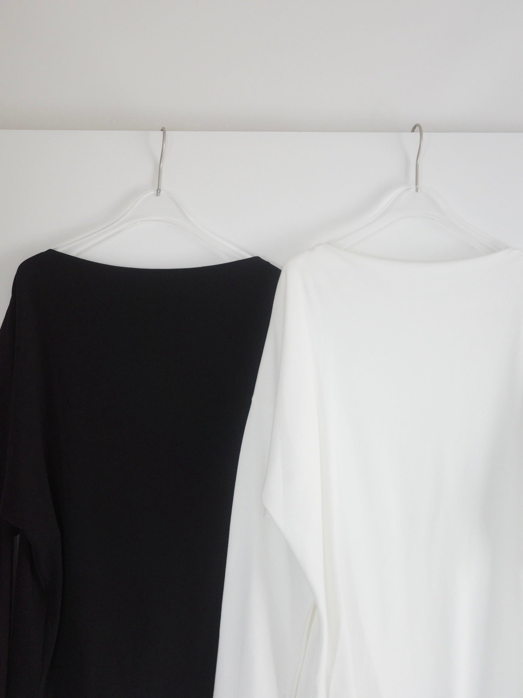 こだわりのシルエットが演出する上品な抜け感が魅力のロングスリーブトップス。 ゆったりとしたボートネックラインで、お好みでオフショルダー風の着こなしもおすすめ。 袖は長めのリラックススリーブで動きに合わせて自然にたまるドレープが生まれ、 体のラインを拾いすぎず大人らしい落ち着いた雰囲気に。 シンプルながらも顔まわりの見え方にこだわったデザインで、 デイリーからラフに着こなし感を出したい日にも幅広く使える1枚です。