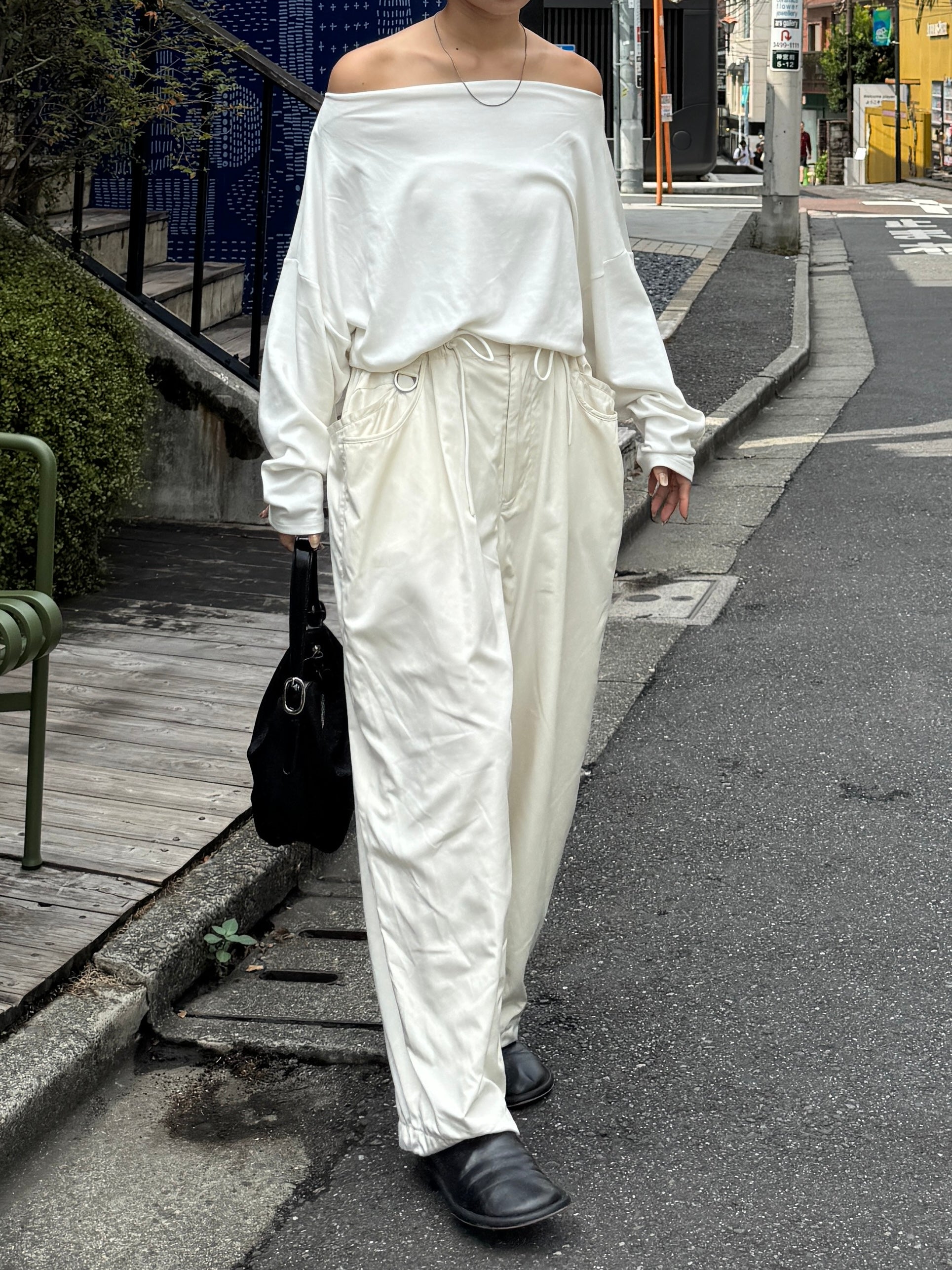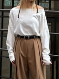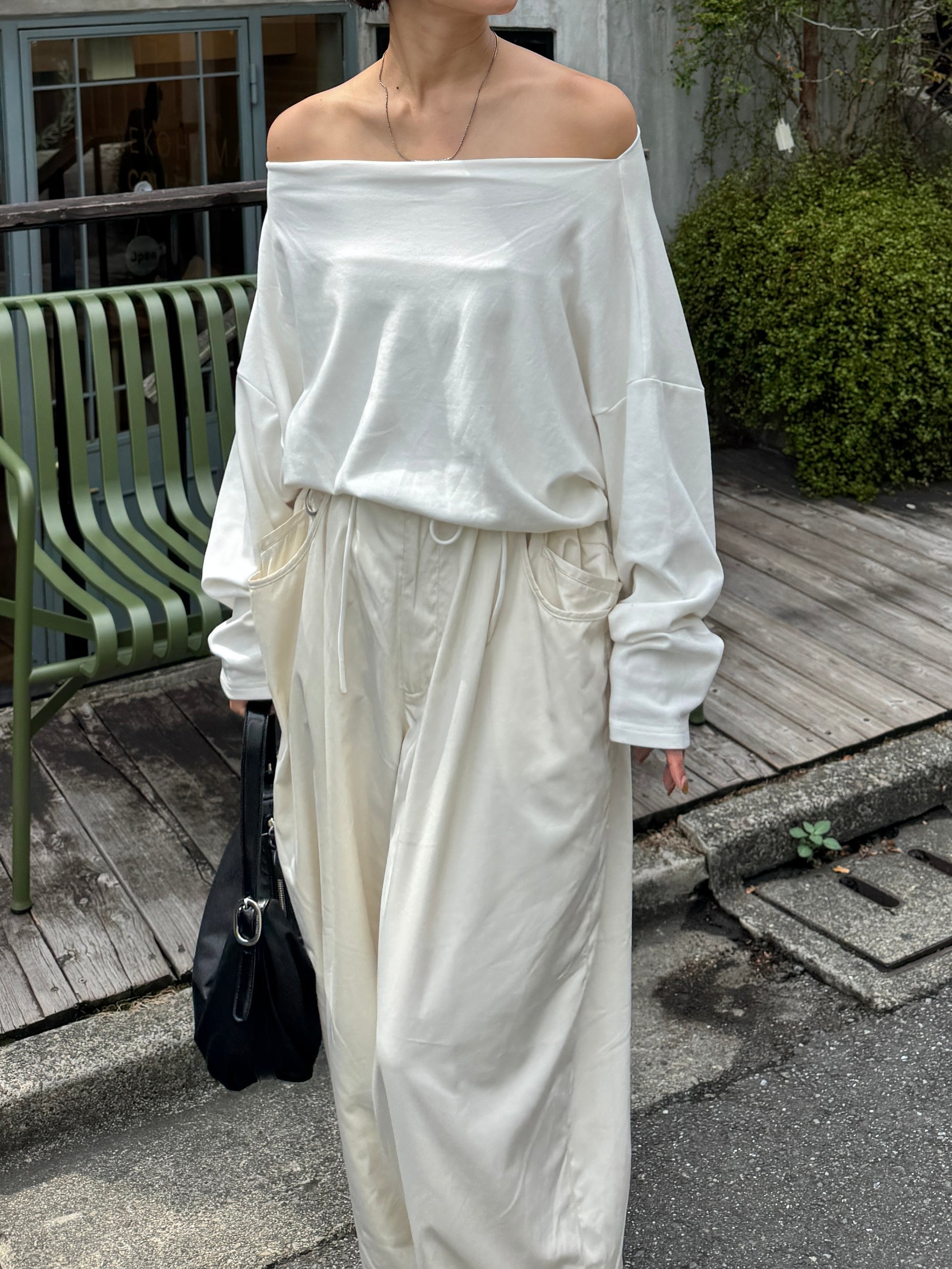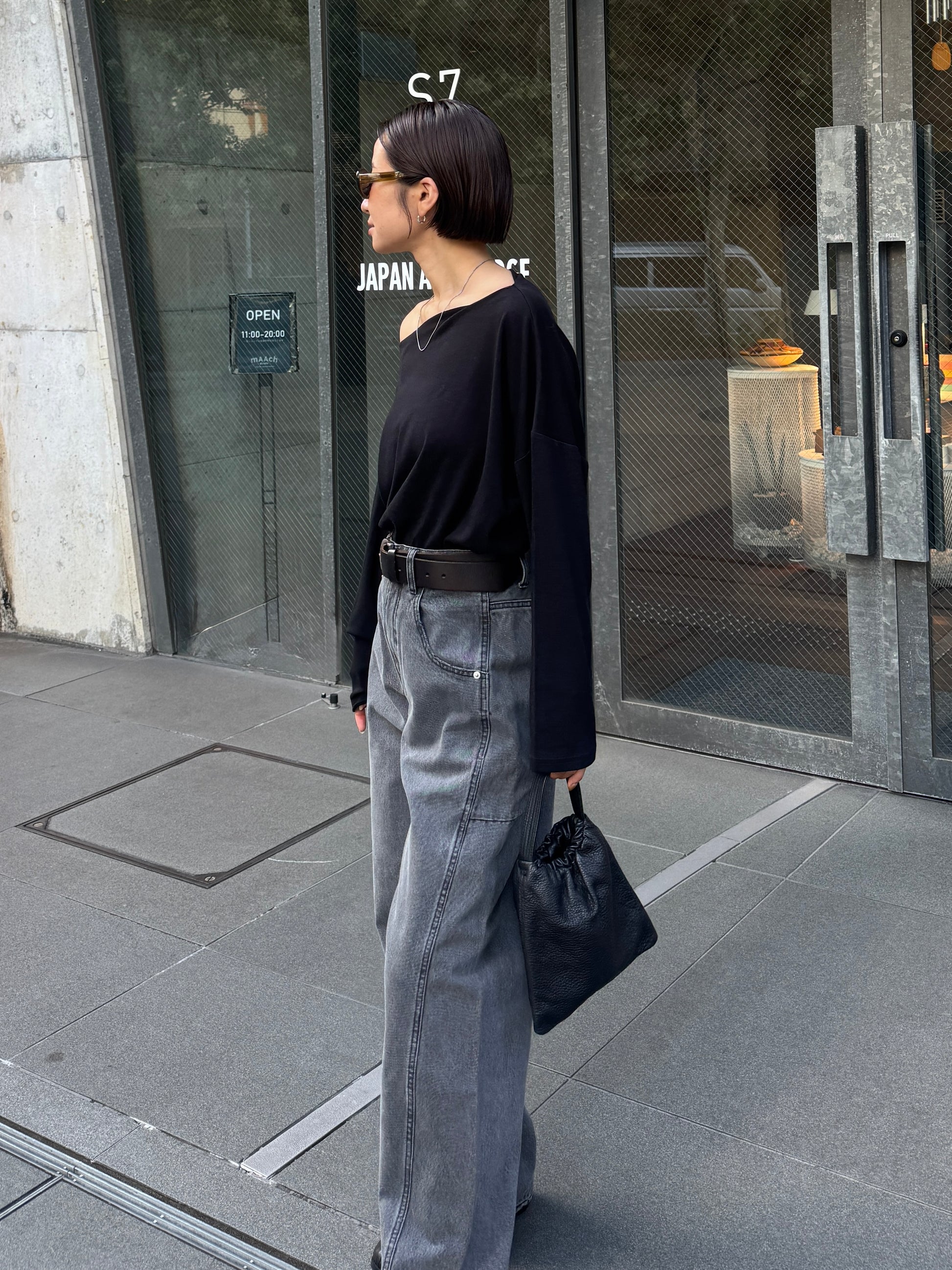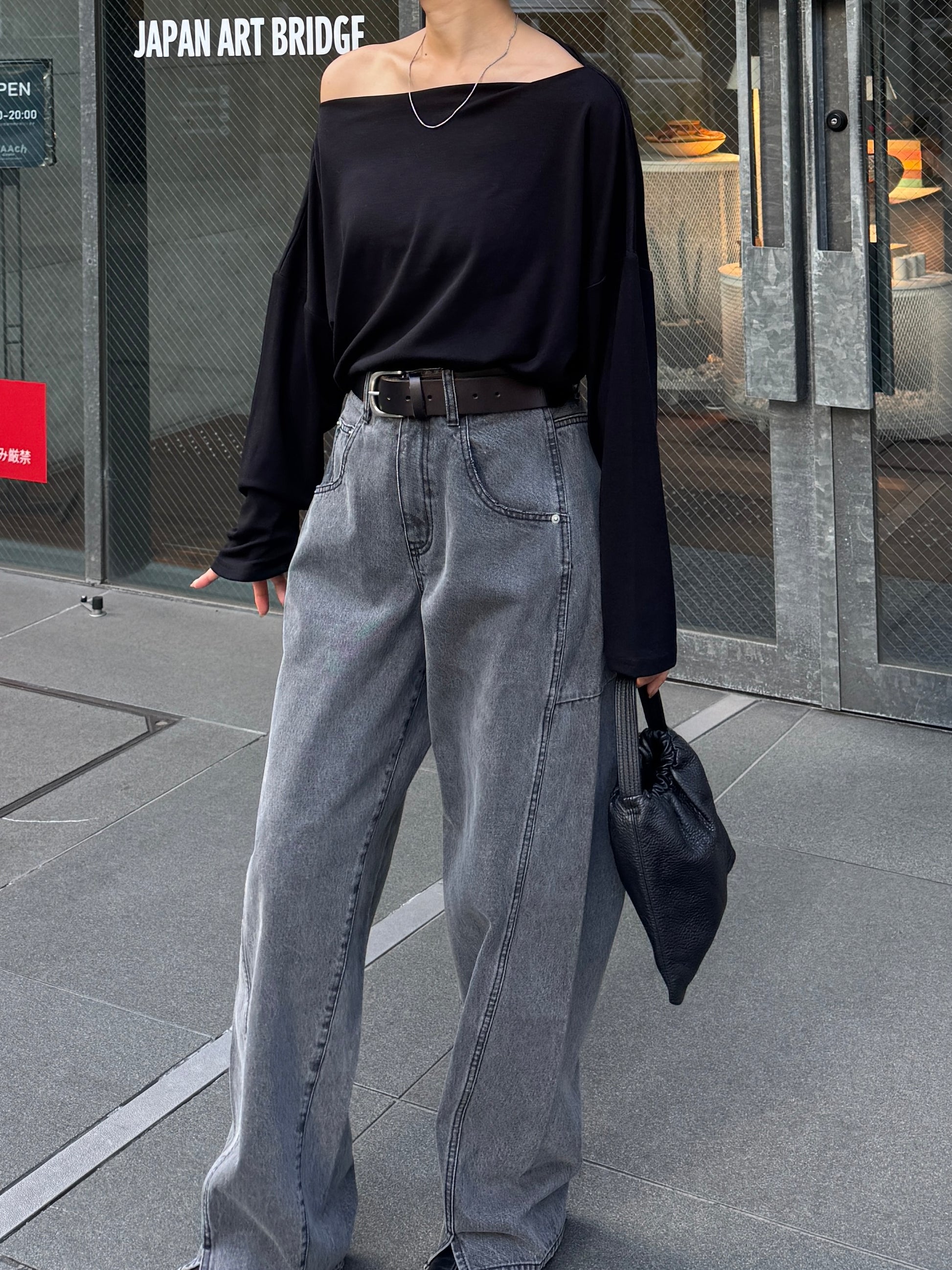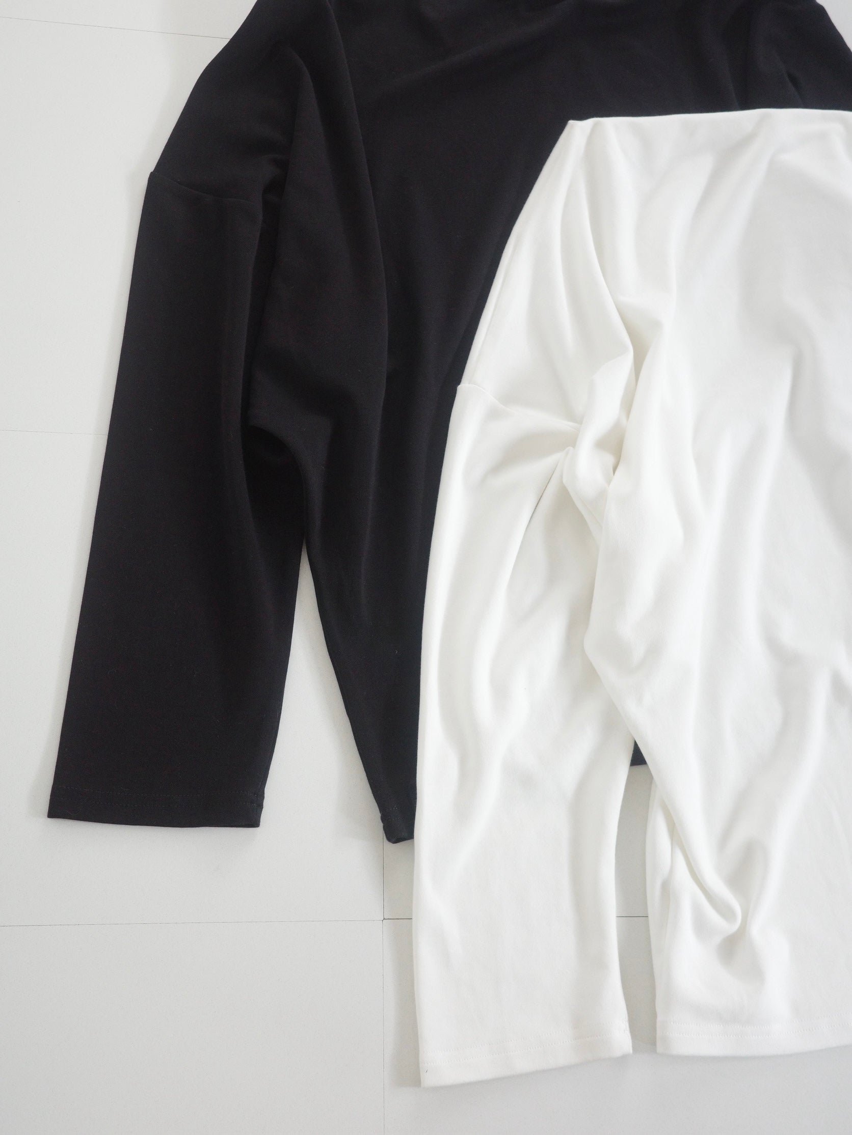 こだわりのシルエットが演出する上品な抜け感が魅力のロングスリーブトップス。 ゆったりとしたボートネックラインで、お好みでオフショルダー風の着こなしもおすすめ。 袖は長めのリラックススリーブで動きに合わせて自然にたまるドレープが生まれ、 体のラインを拾いすぎず大人らしい落ち着いた雰囲気に。 シンプルながらも顔まわりの見え方にこだわったデザインで、 デイリーからラフに着こなし感を出したい日にも幅広く使える1枚です。