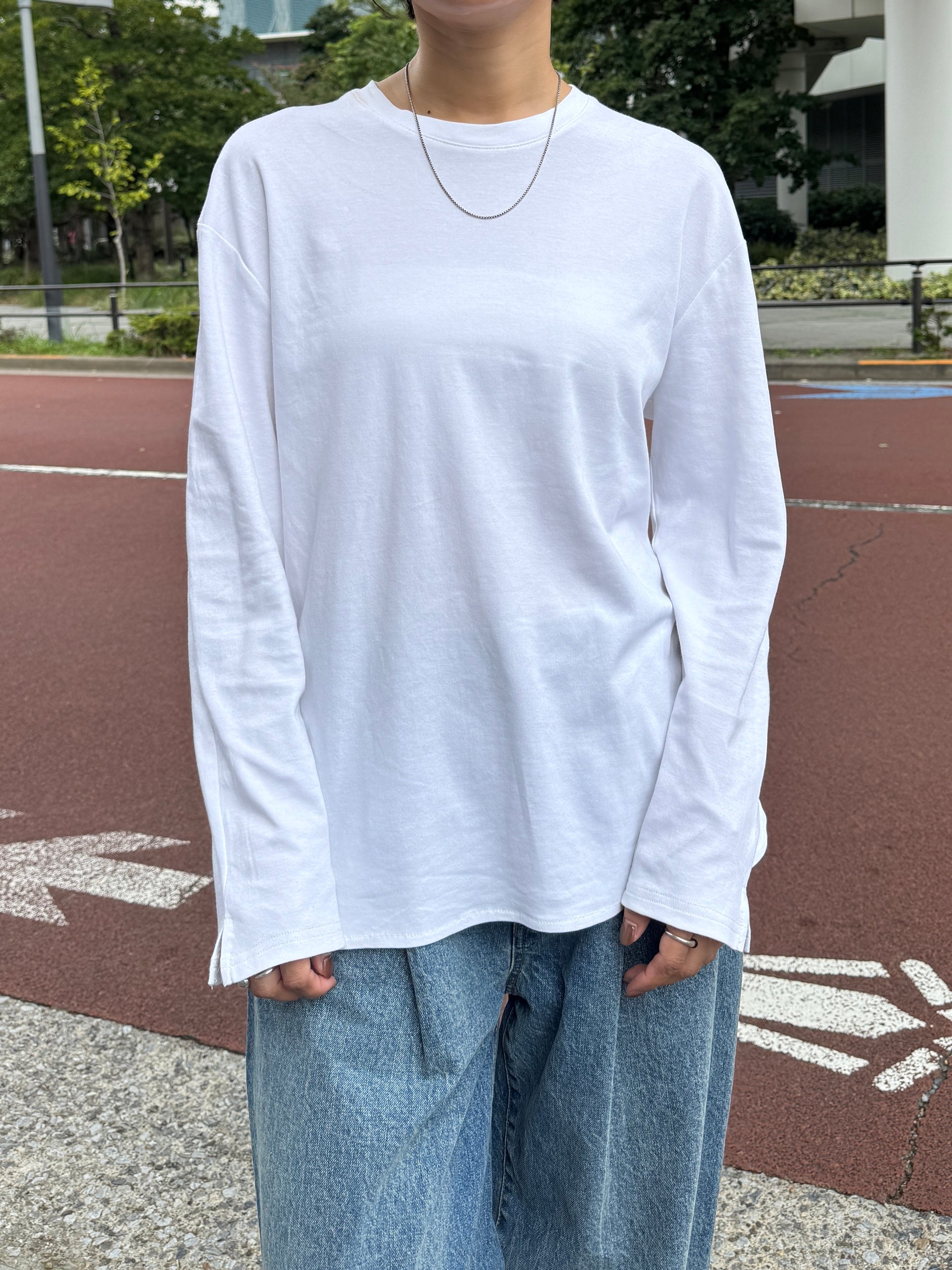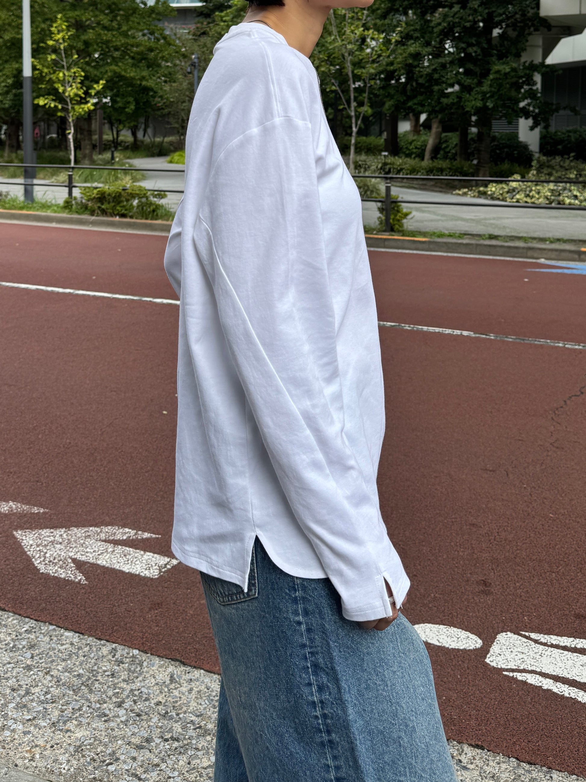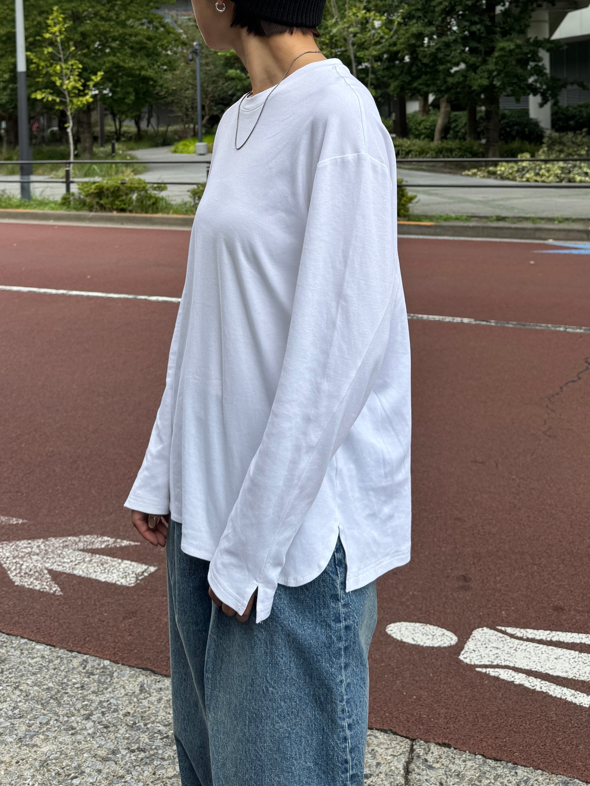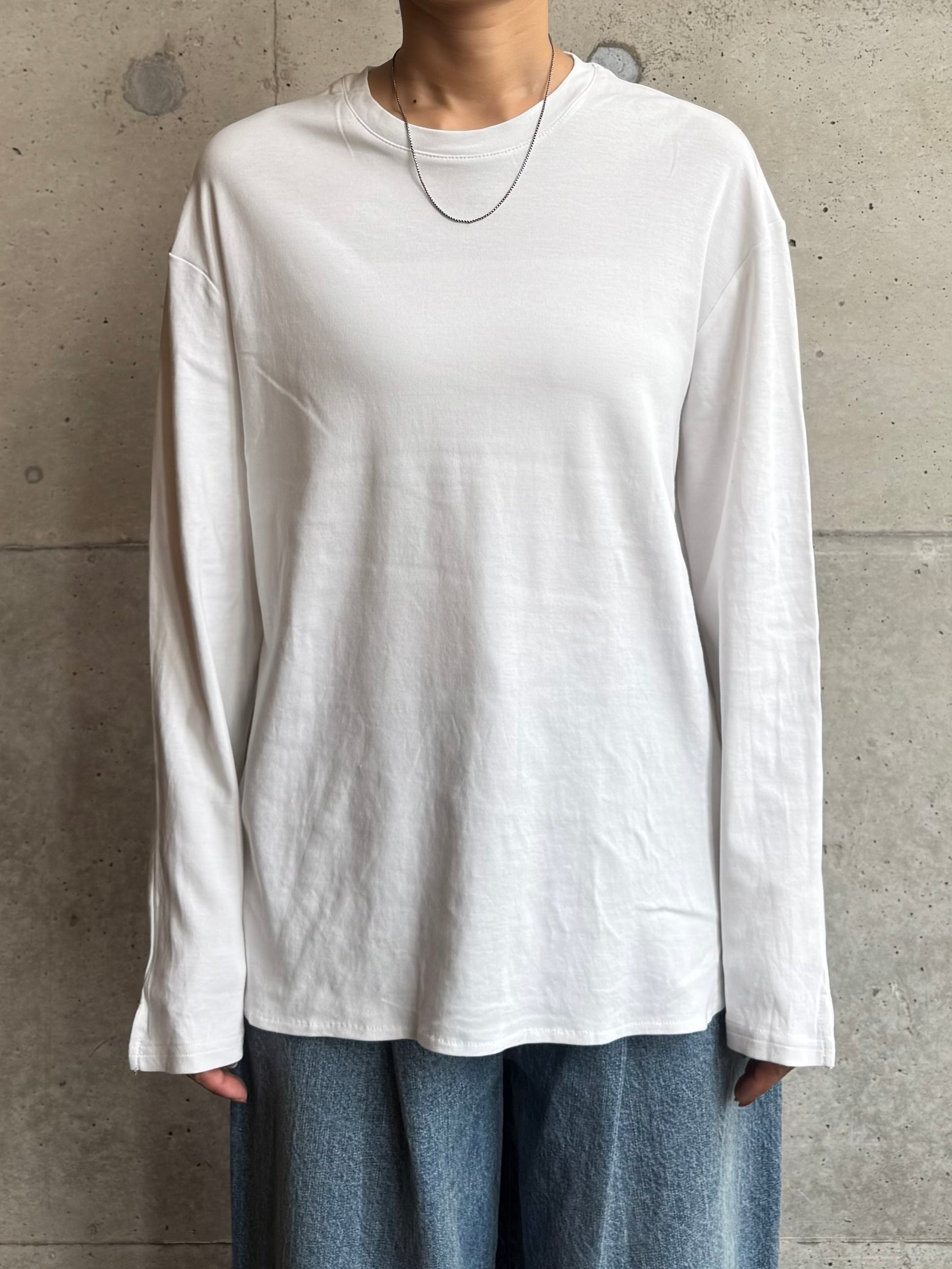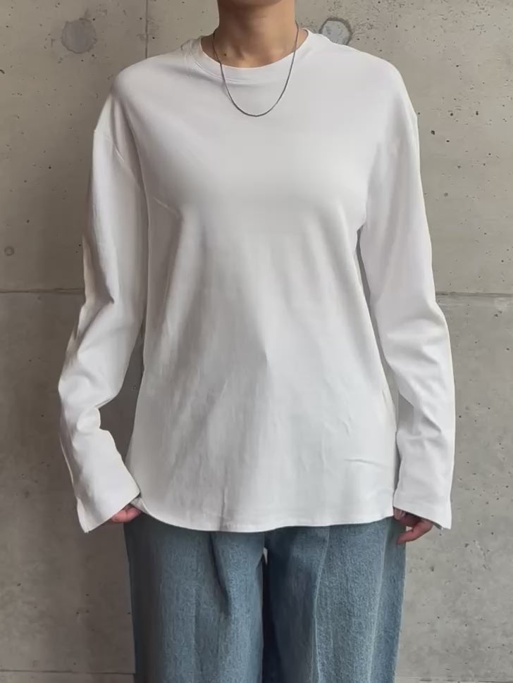 上質なコットン100%で仕立てた、クリーンで心地よい着用感のロングスリーブカットソー。 ややゆとりを持たせたシルエットとドロップショルダーが、抜け感のあるリラックスした雰囲気に。 裾には緩やかなラウンドカットとサイドスリットを施し、動きに合わせて自然な立体感をプラス。 袖口にはさりげないスリットを入れることで、シンプルながらも洗練された印象に仕上げました。 ネックラインは詰まりすぎず程よく開いたクルーネック仕様で、1枚でもレイヤードでもバランスよく着こなせる1着。