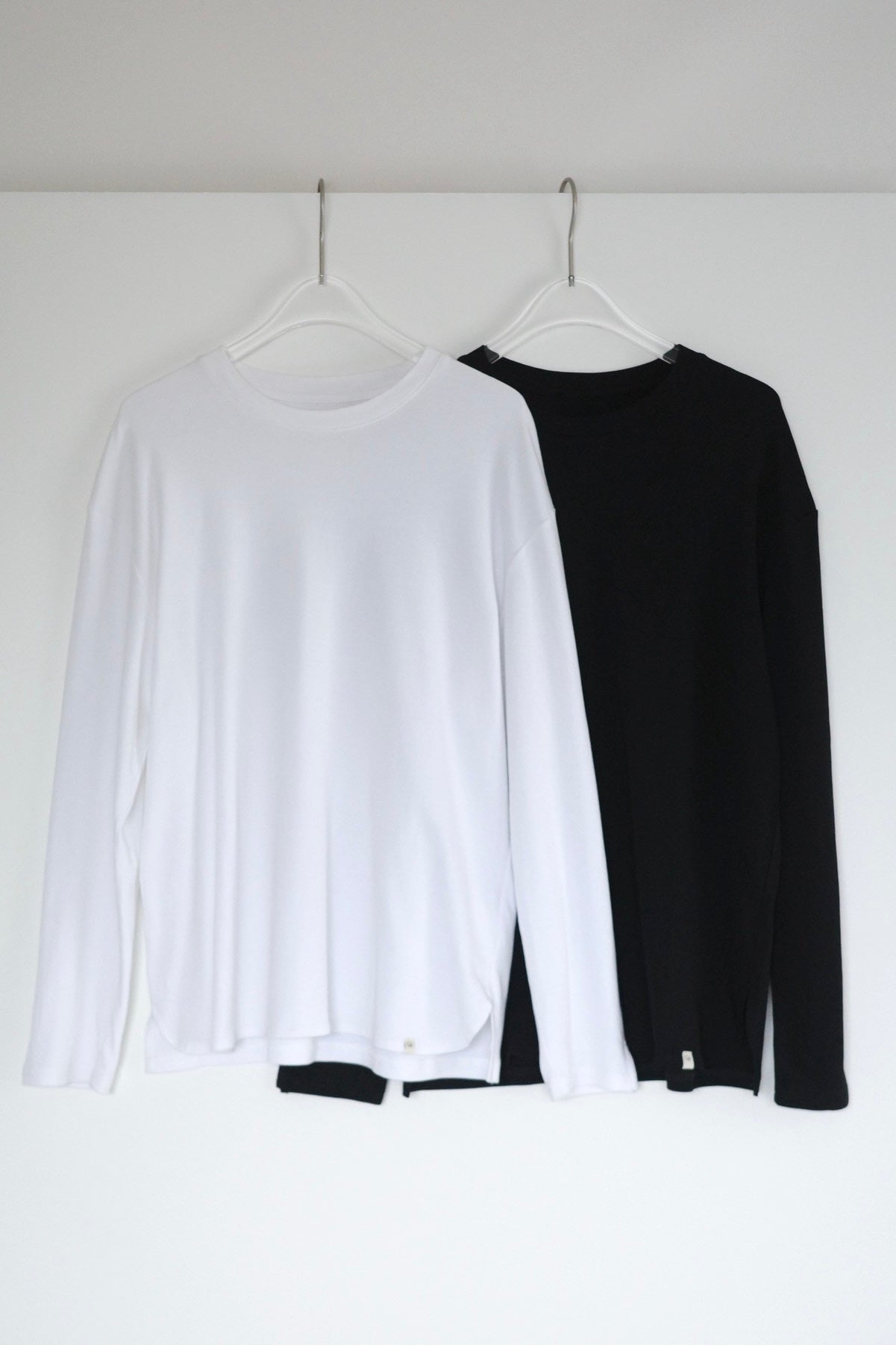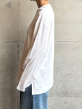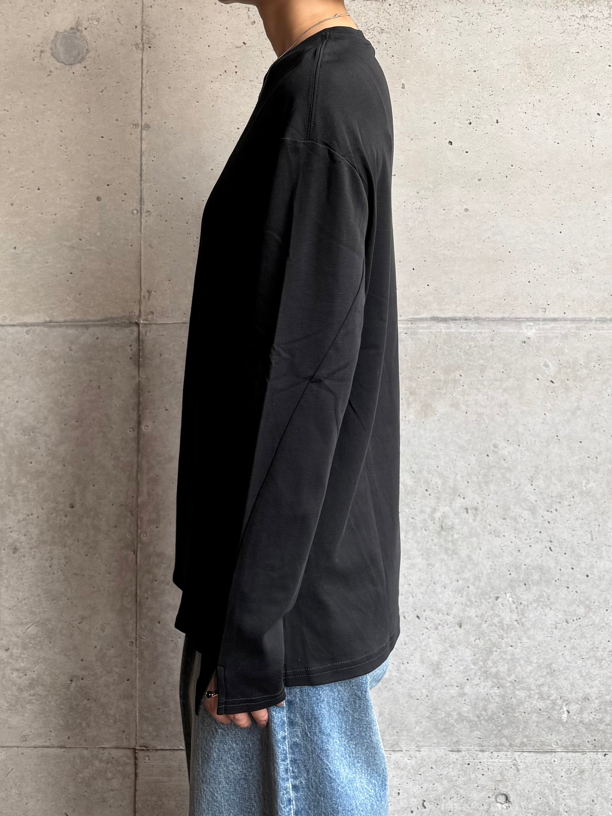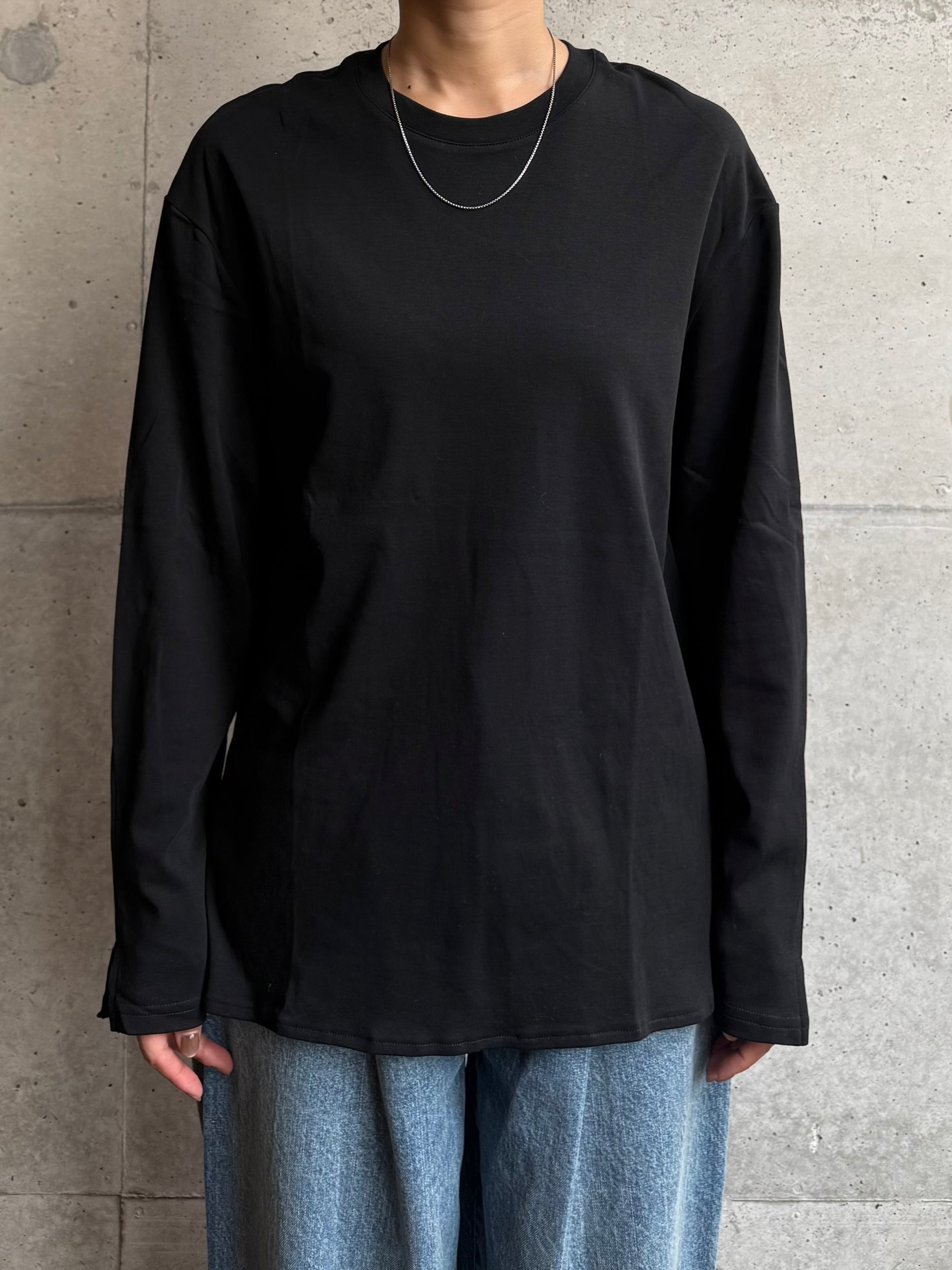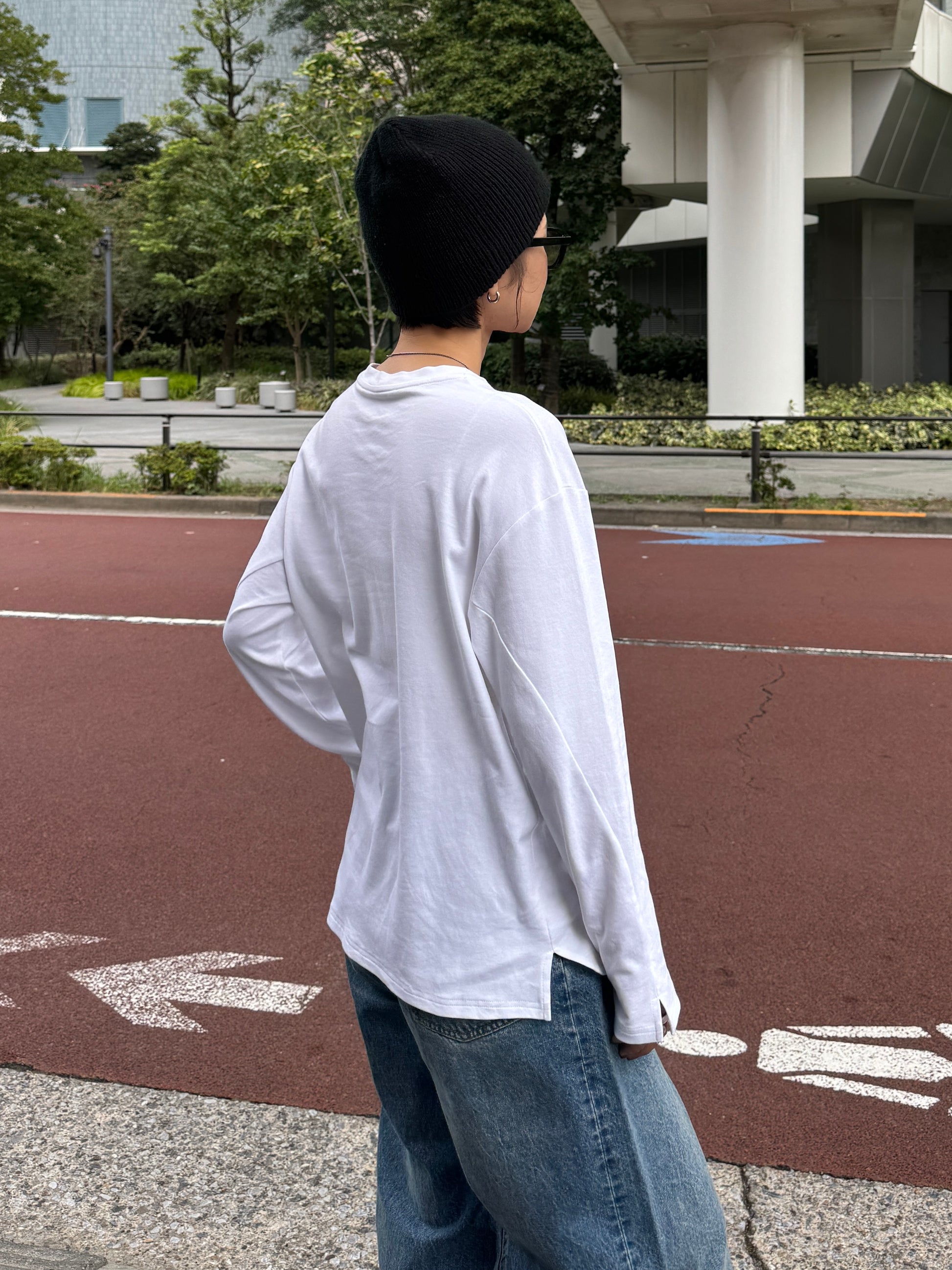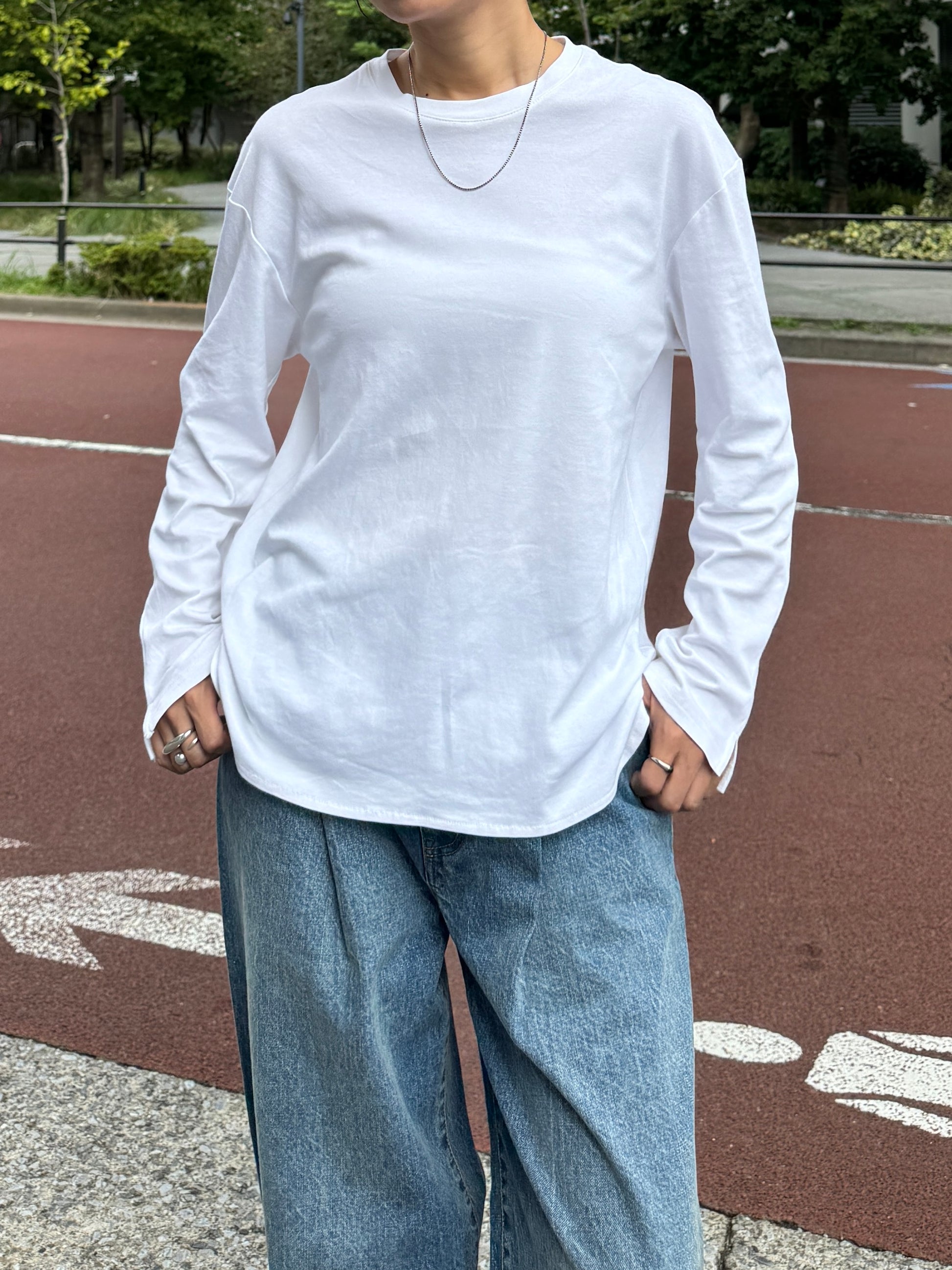 上質なコットン100%で仕立てた、クリーンで心地よい着用感のロングスリーブカットソー。 ややゆとりを持たせたシルエットとドロップショルダーが、抜け感のあるリラックスした雰囲気に。 裾には緩やかなラウンドカットとサイドスリットを施し、動きに合わせて自然な立体感をプラス。 袖口にはさりげないスリットを入れることで、シンプルながらも洗練された印象に仕上げました。 ネックラインは詰まりすぎず程よく開いたクルーネック仕様で、1枚でもレイヤードでもバランスよく着こなせる1着。