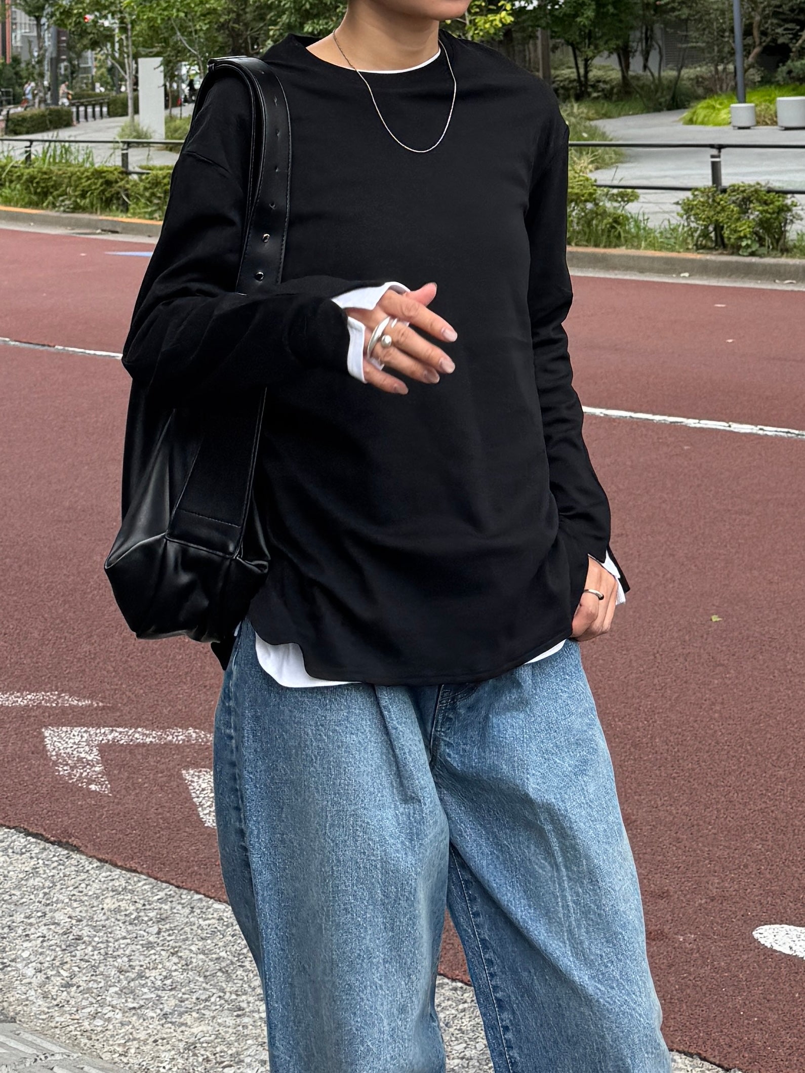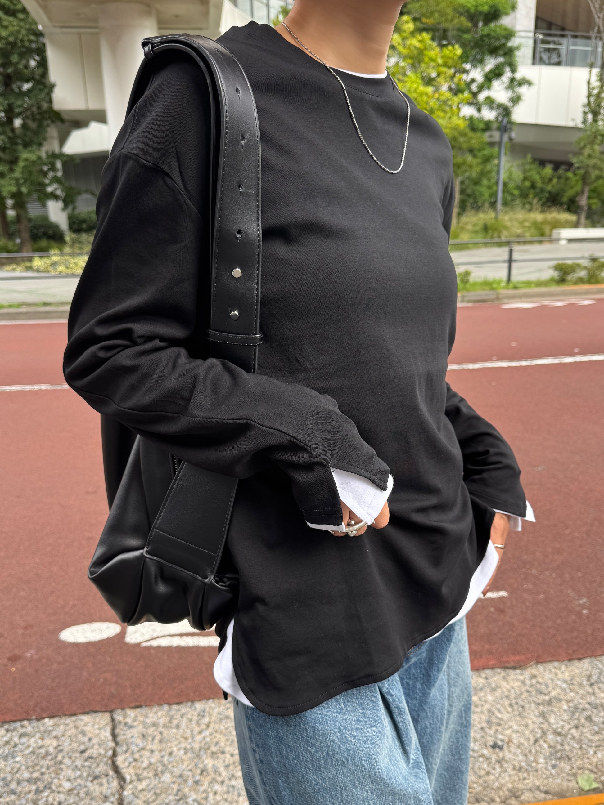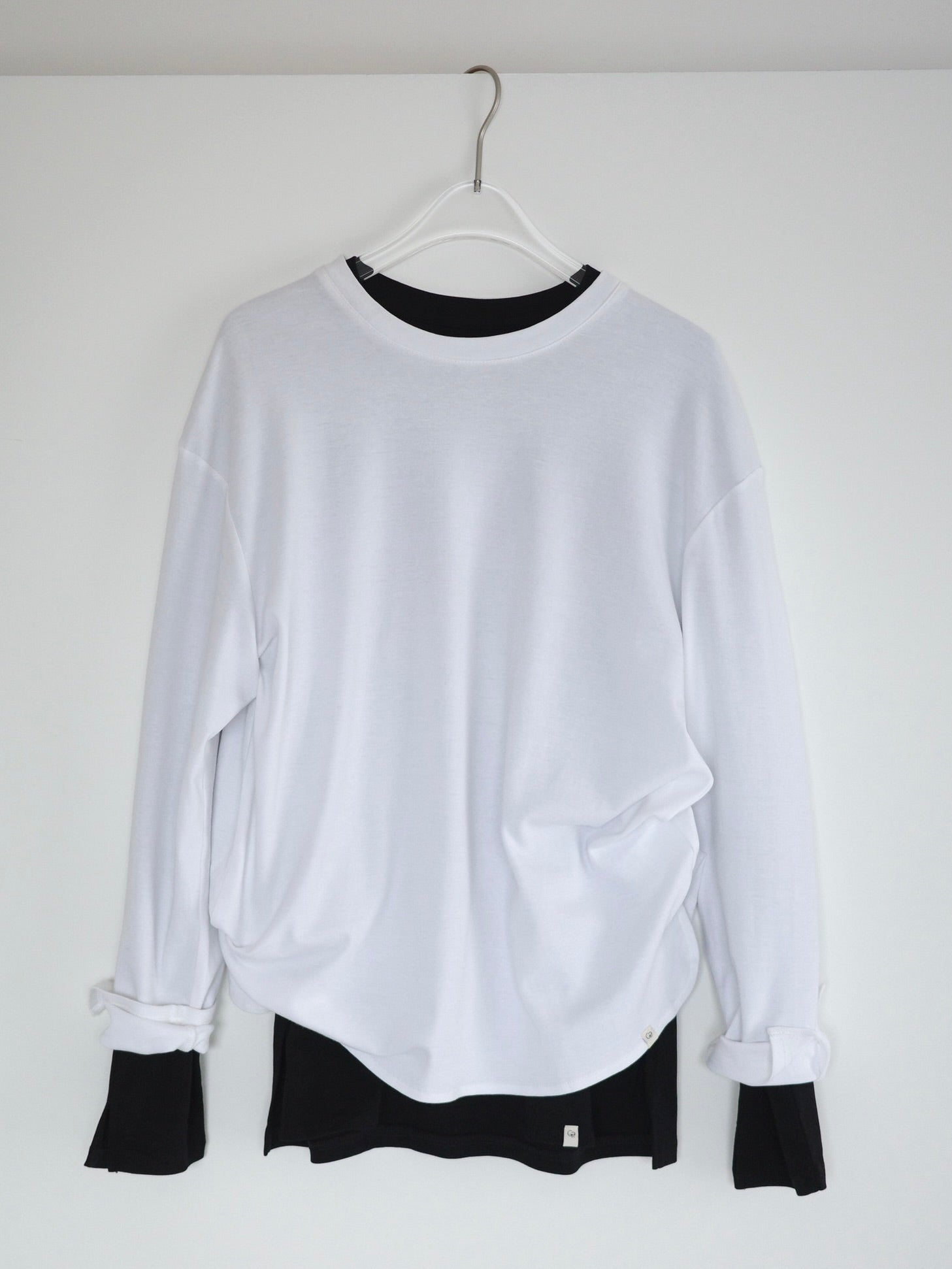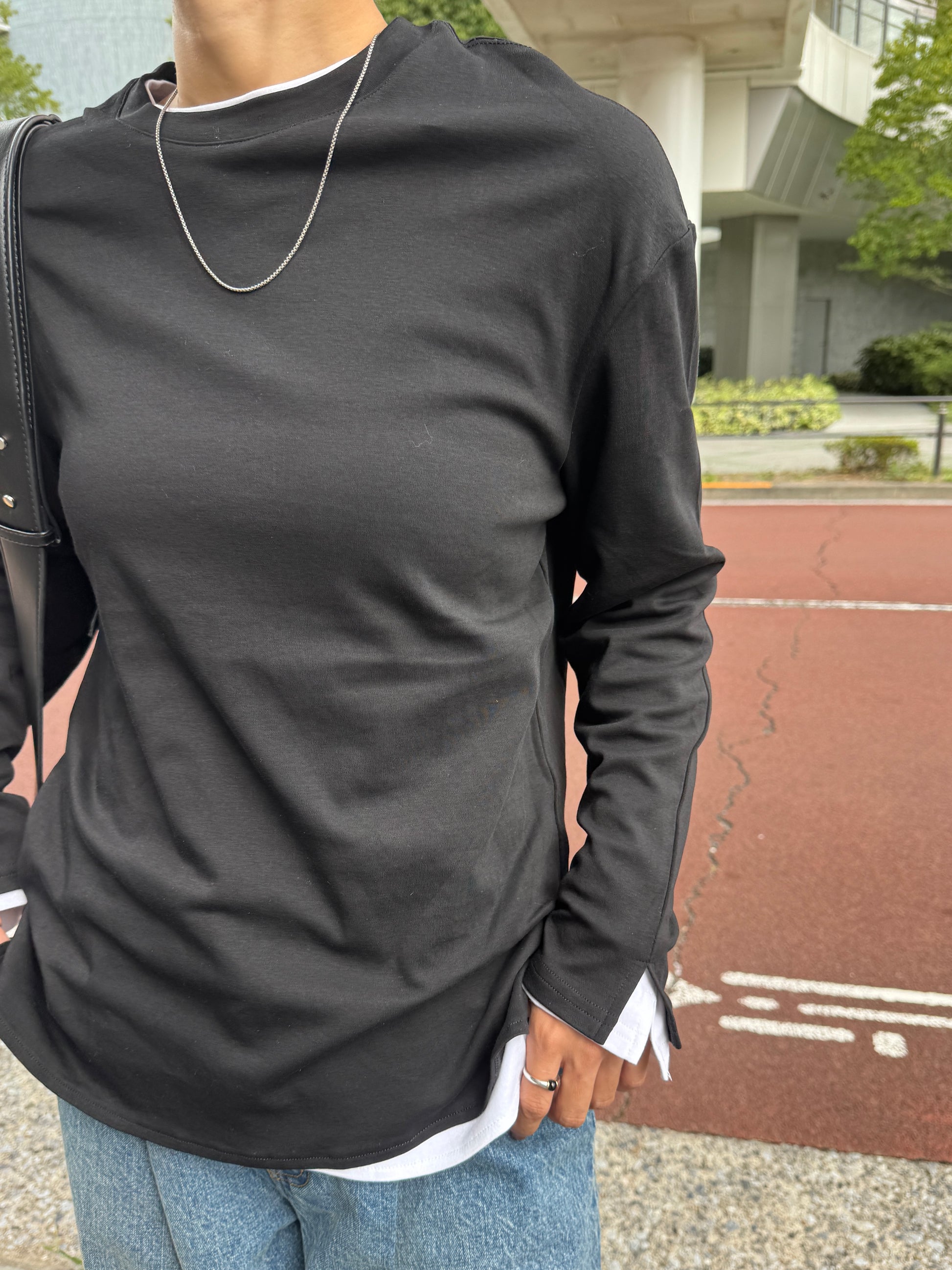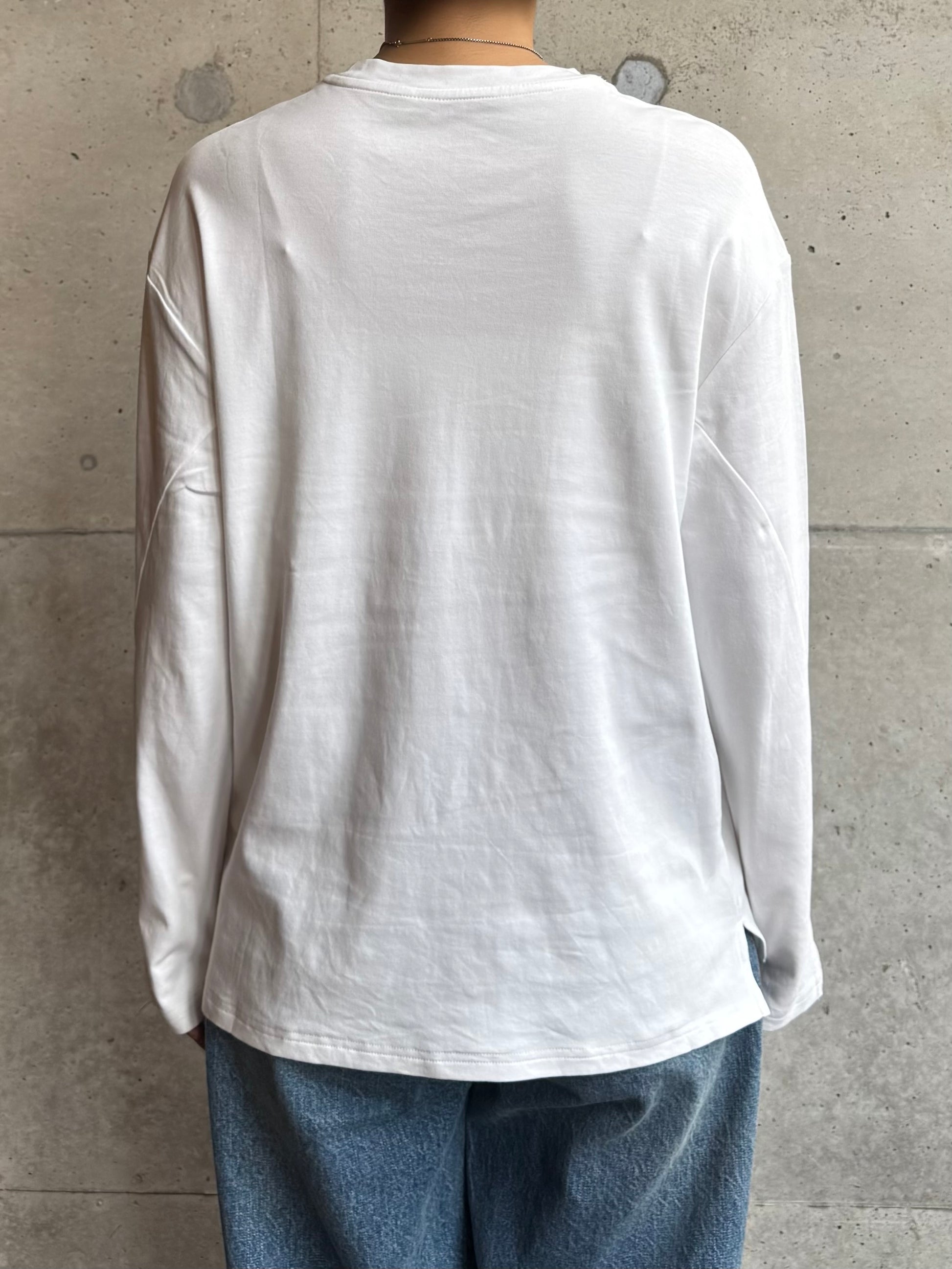 上質なコットン100%で仕立てた、クリーンで心地よい着用感のロングスリーブカットソー。 ややゆとりを持たせたシルエットとドロップショルダーが、抜け感のあるリラックスした雰囲気に。 裾には緩やかなラウンドカットとサイドスリットを施し、動きに合わせて自然な立体感をプラス。 袖口にはさりげないスリットを入れることで、シンプルながらも洗練された印象に仕上げました。 ネックラインは詰まりすぎず程よく開いたクルーネック仕様で、1枚でもレイヤードでもバランスよく着こなせる1着。