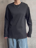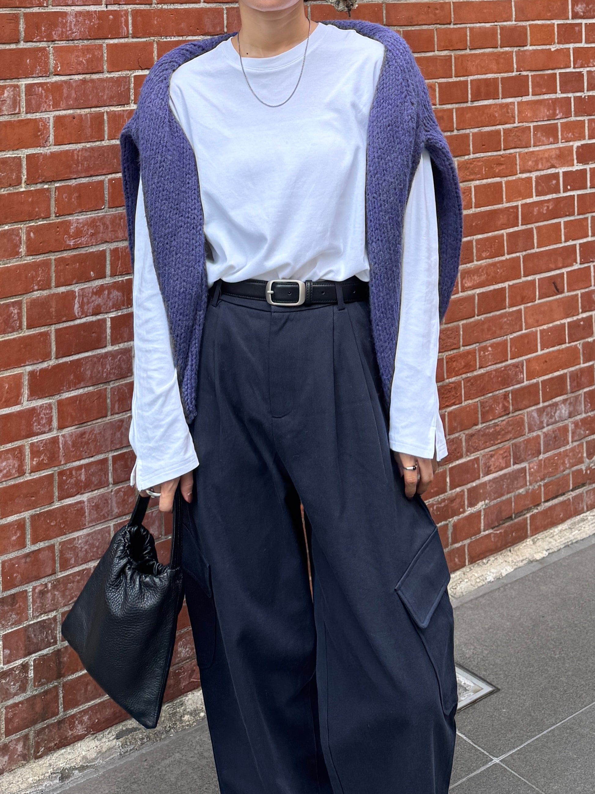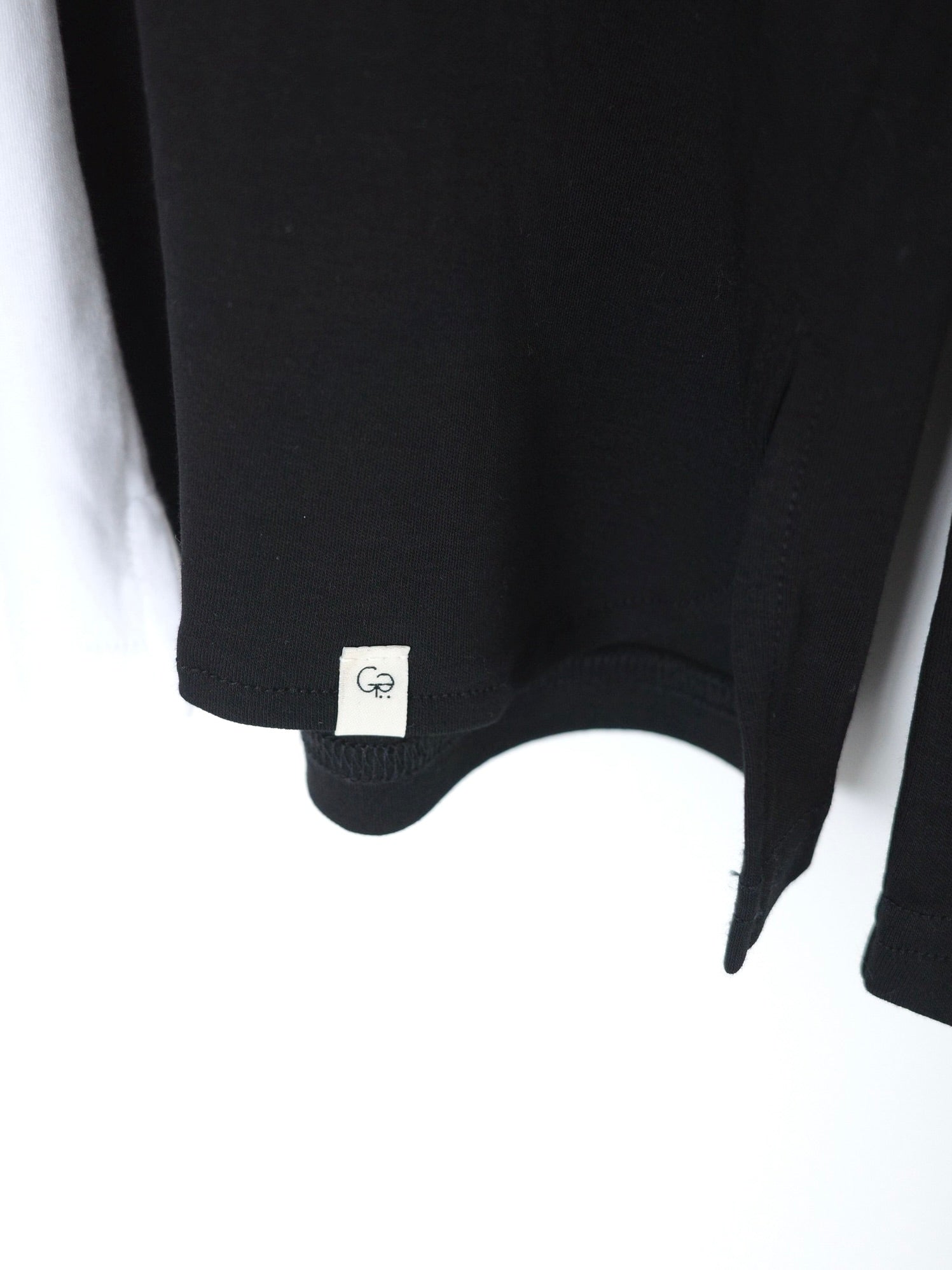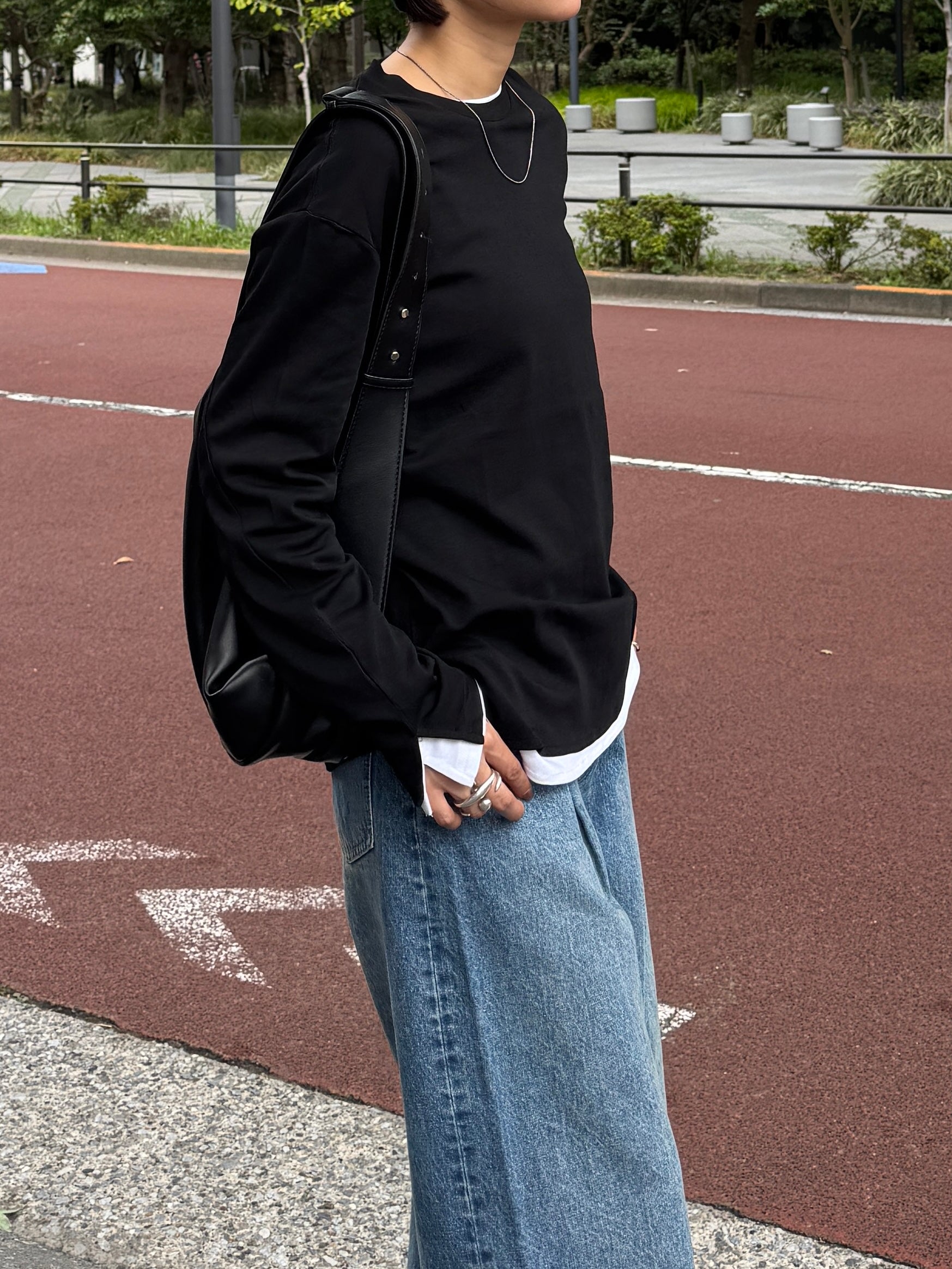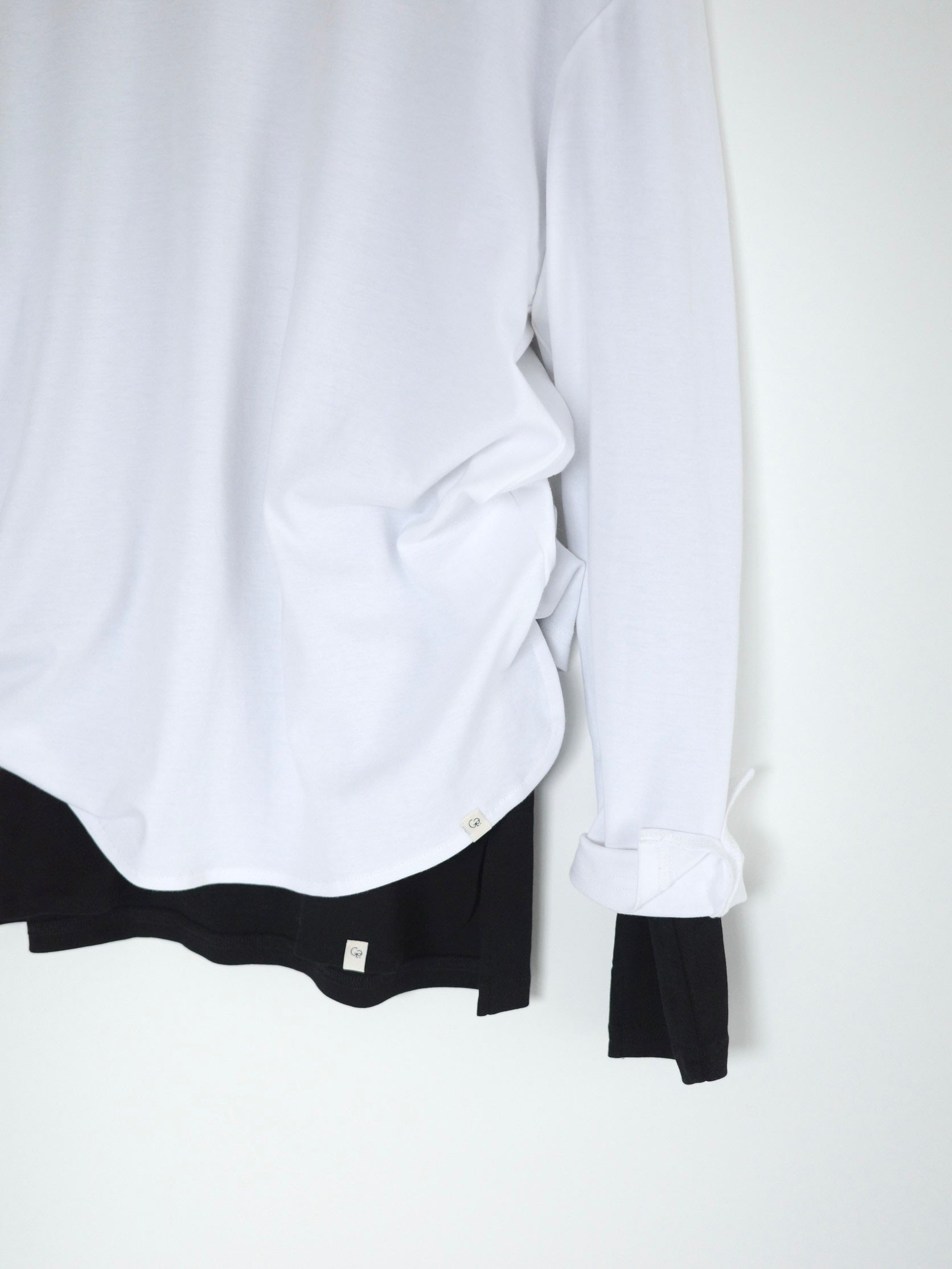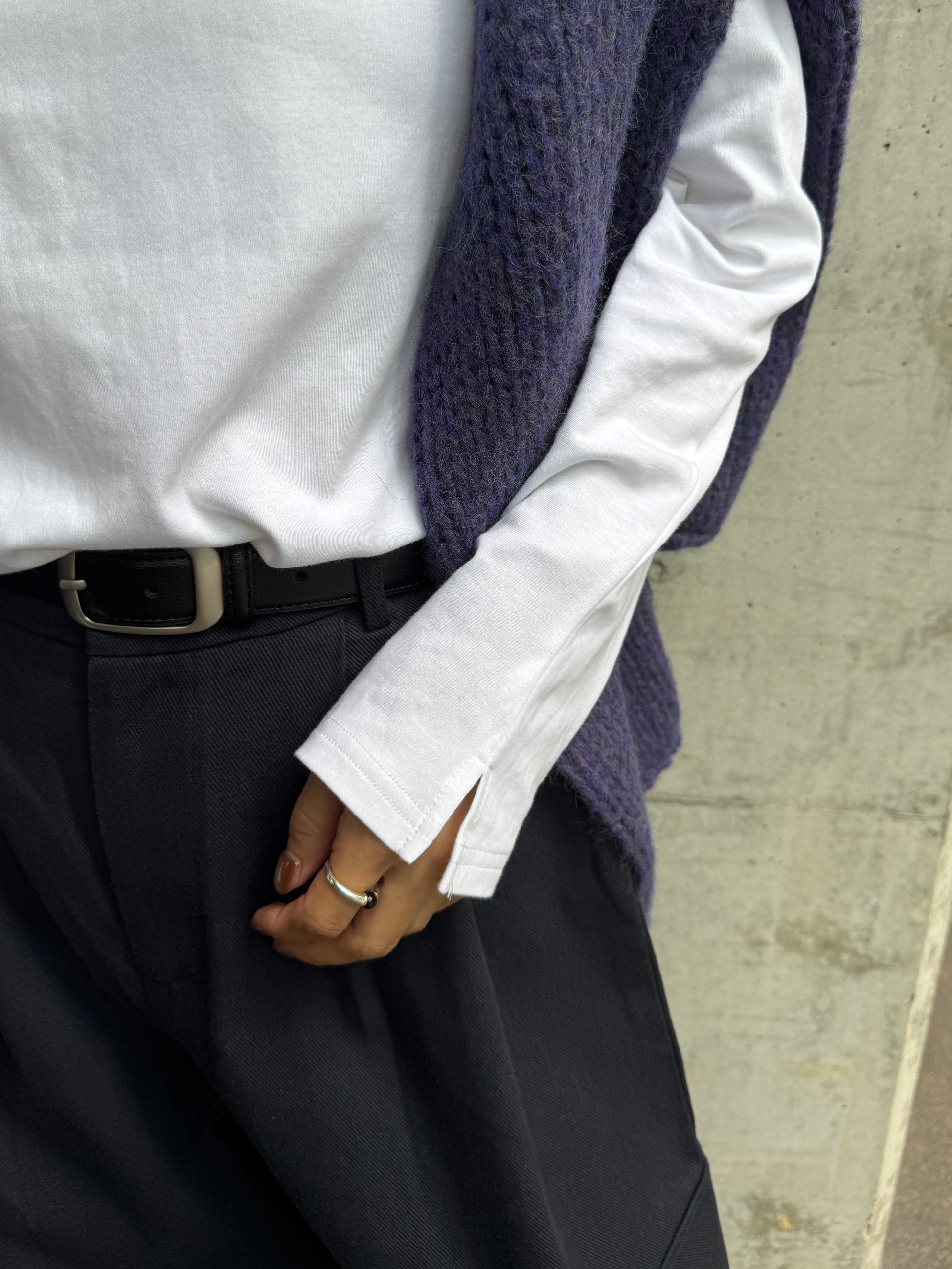 上質なコットン100%で仕立てた、クリーンで心地よい着用感のロングスリーブカットソー。 ややゆとりを持たせたシルエットとドロップショルダーが、抜け感のあるリラックスした雰囲気に。 裾には緩やかなラウンドカットとサイドスリットを施し、動きに合わせて自然な立体感をプラス。 袖口にはさりげないスリットを入れることで、シンプルながらも洗練された印象に仕上げました。 ネックラインは詰まりすぎず程よく開いたクルーネック仕様で、1枚でもレイヤードでもバランスよく着こなせる1着。