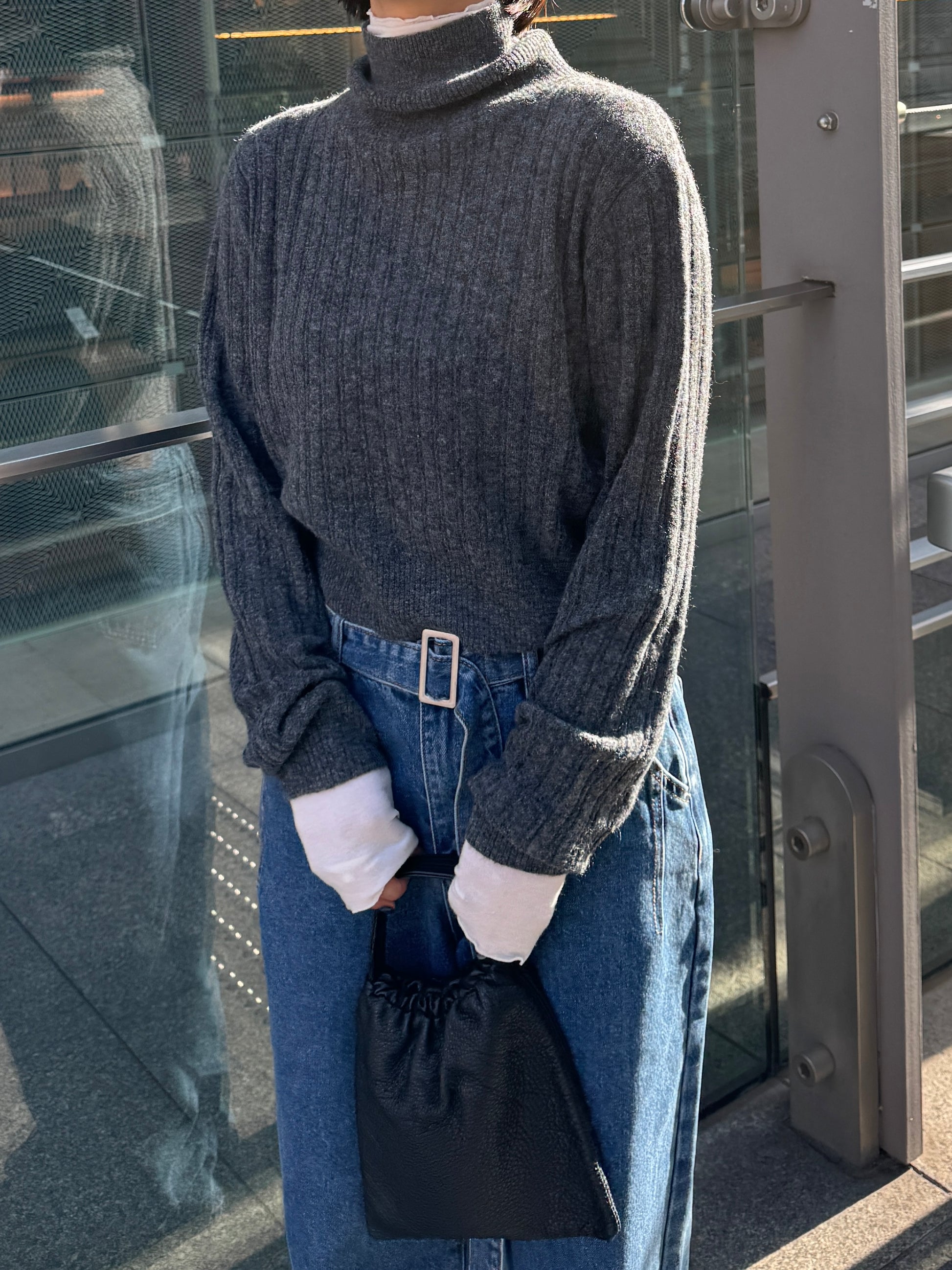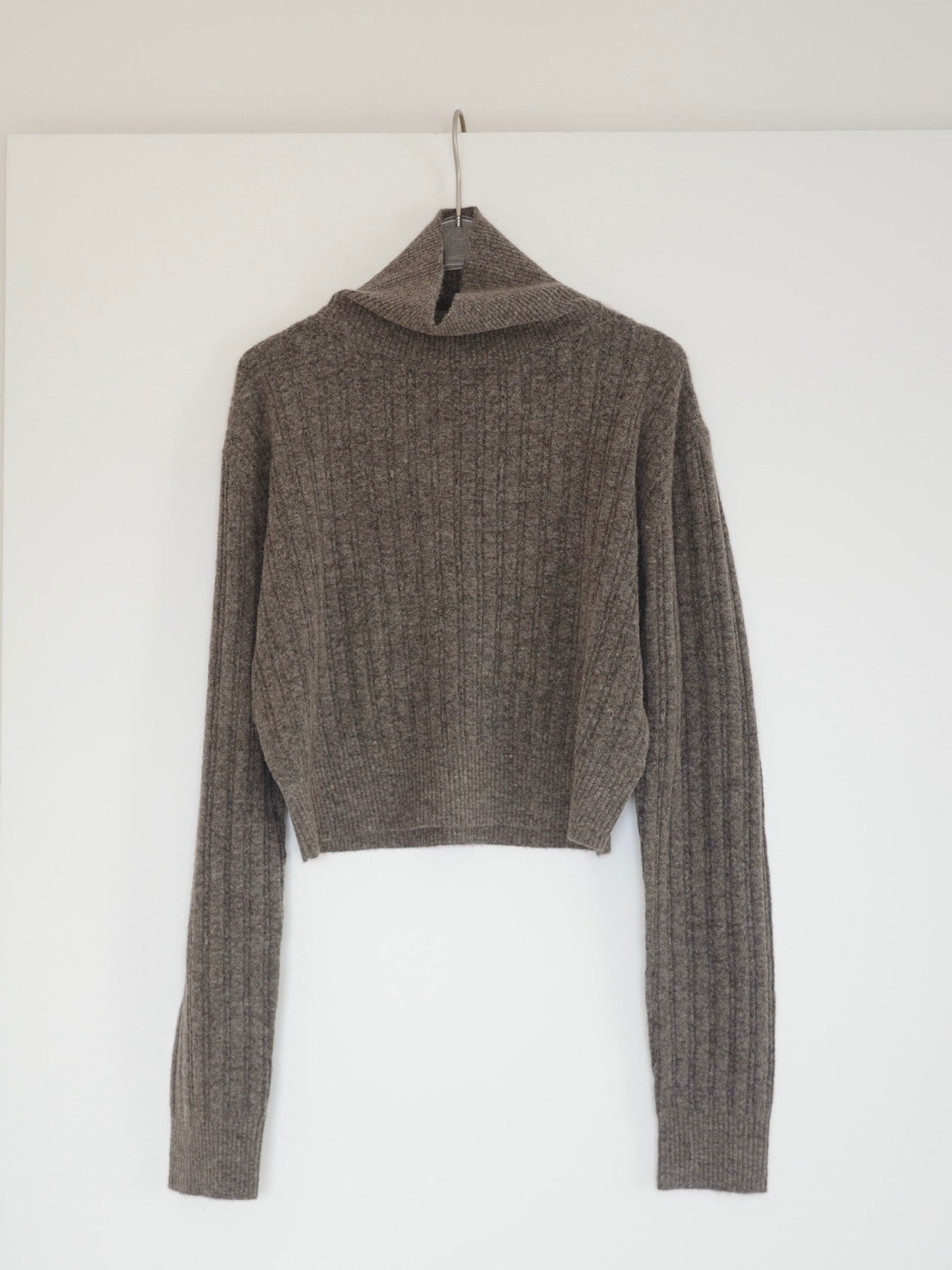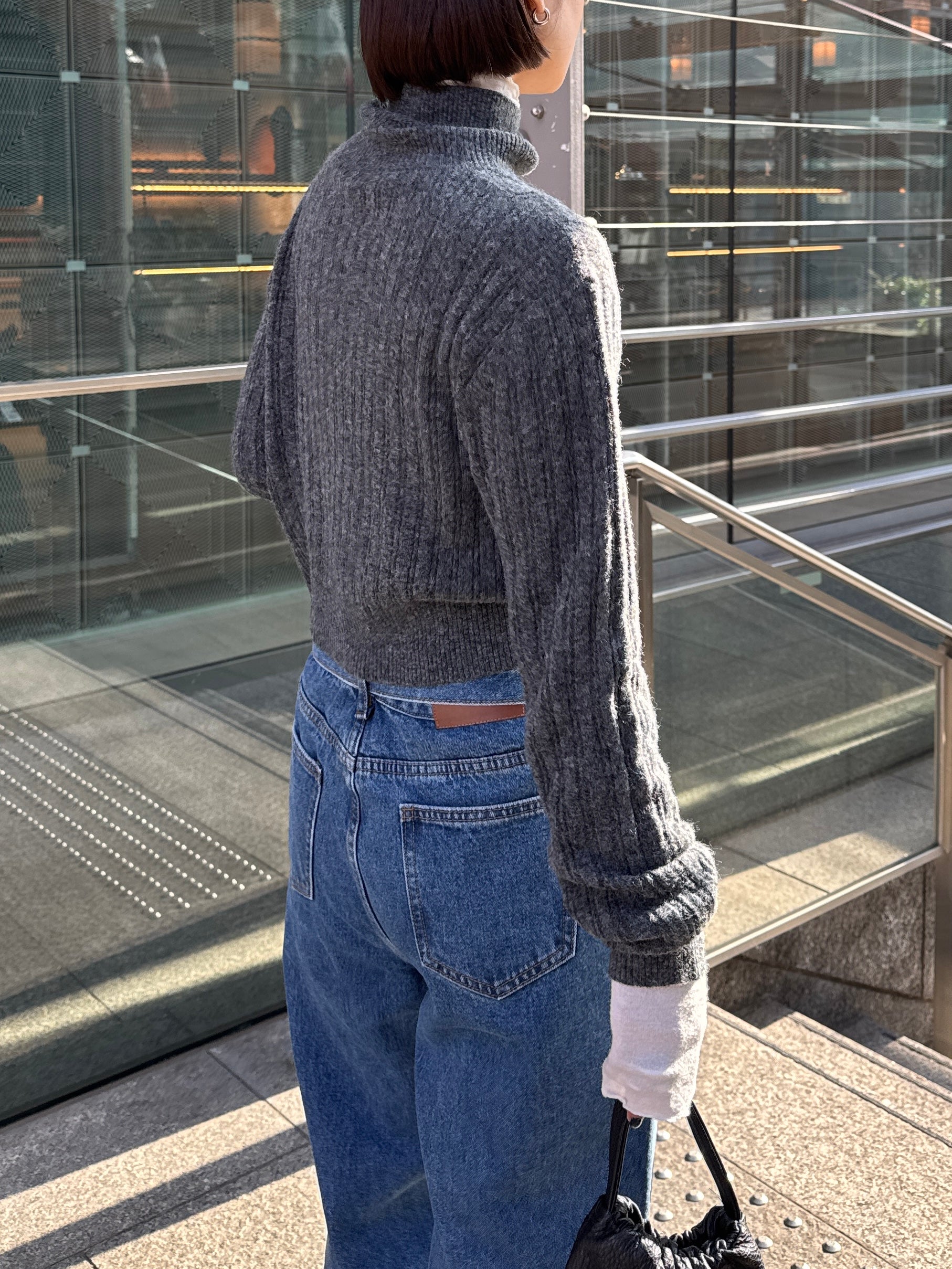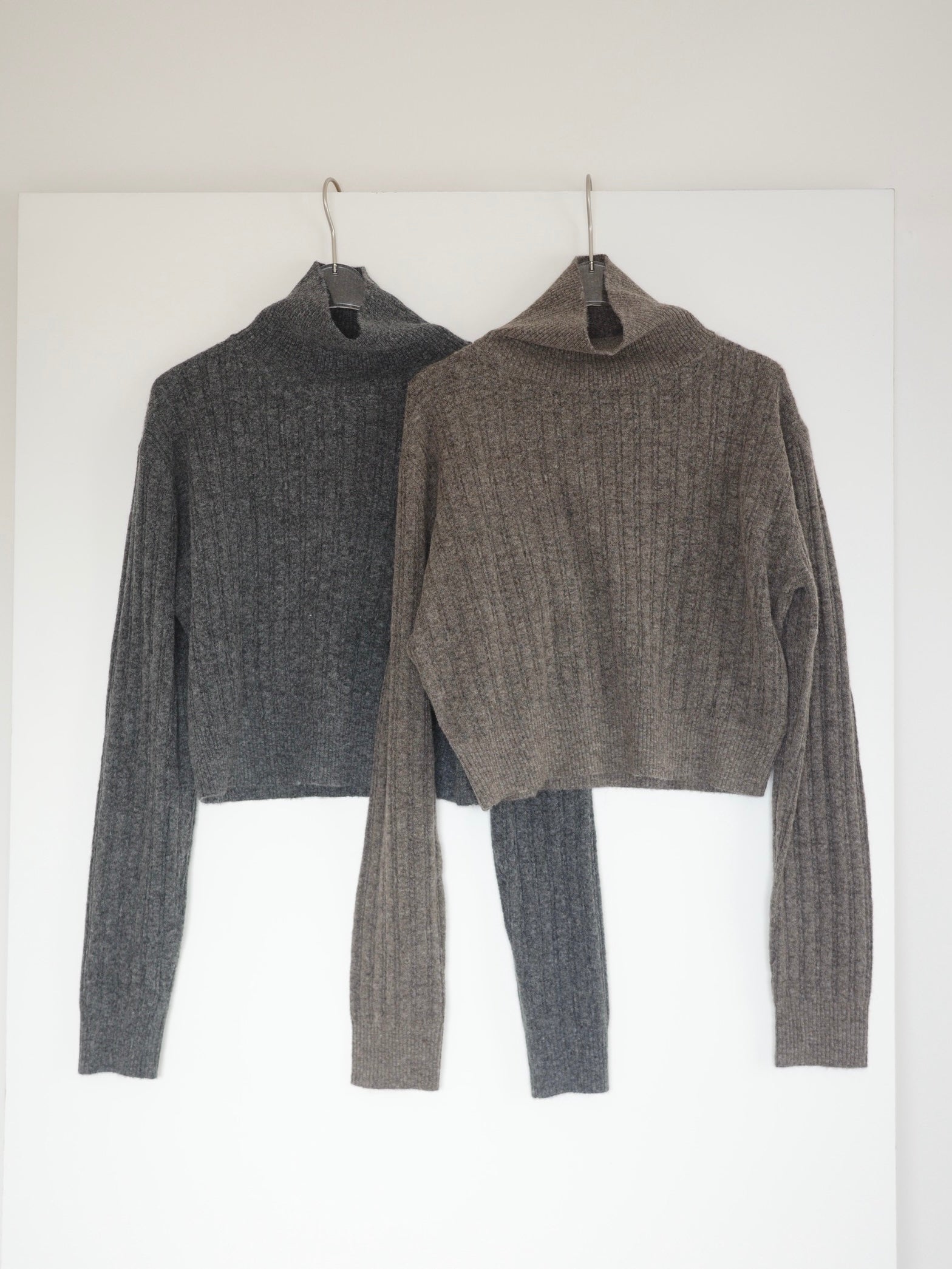 やわらかく、肌あたりの良い素材を使用したショート丈のタートルニット。