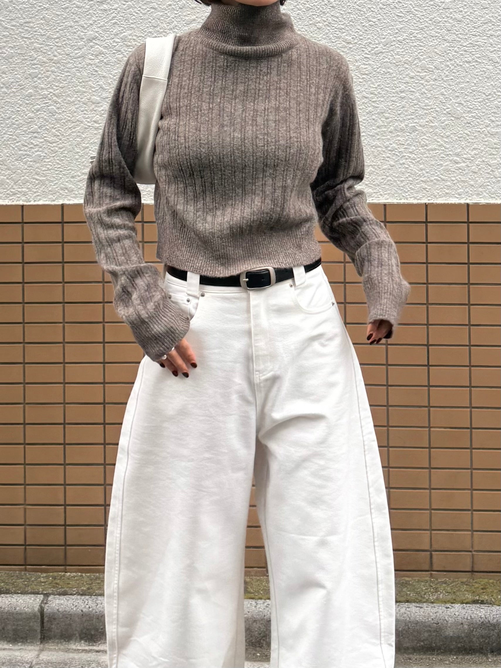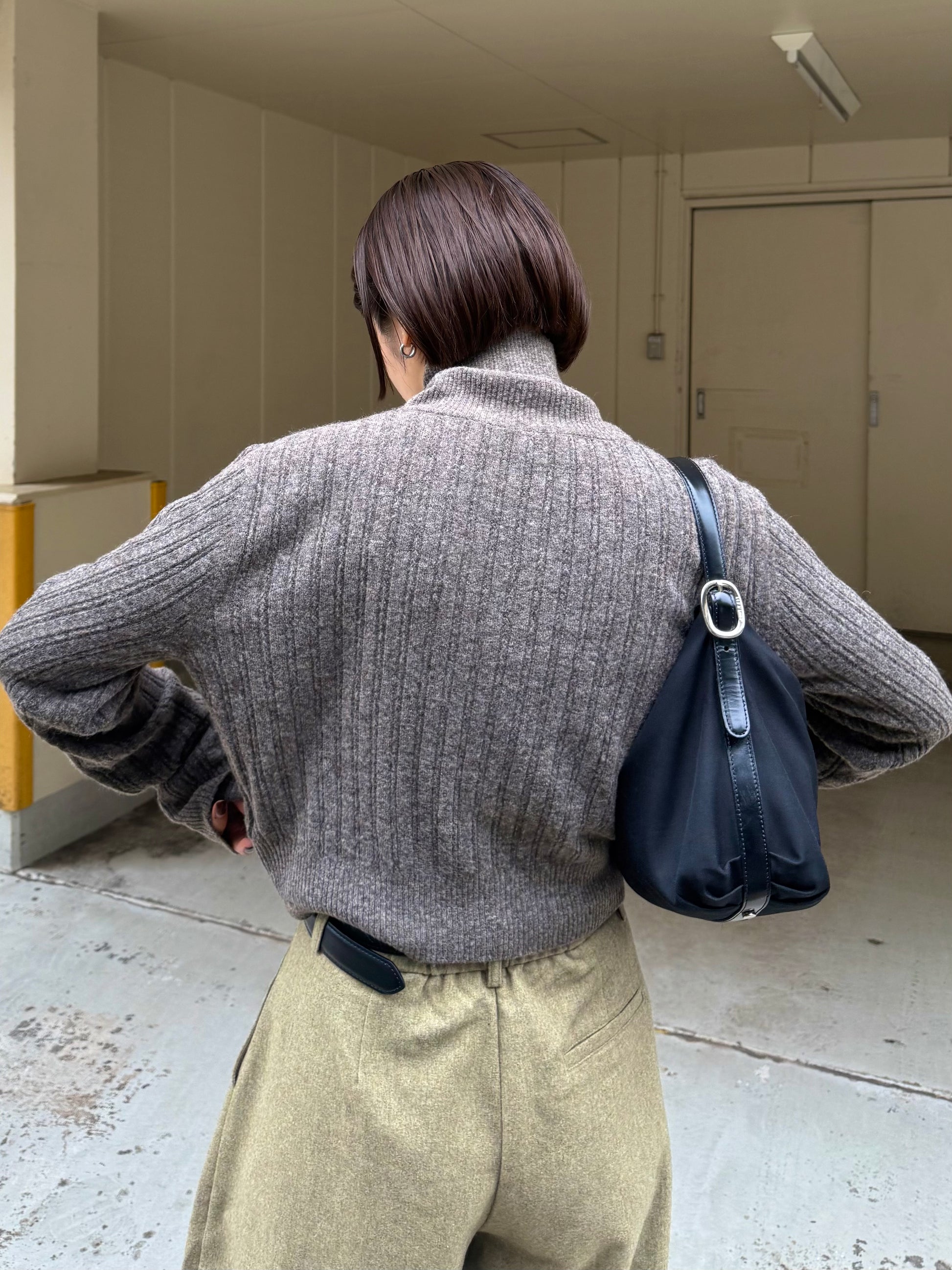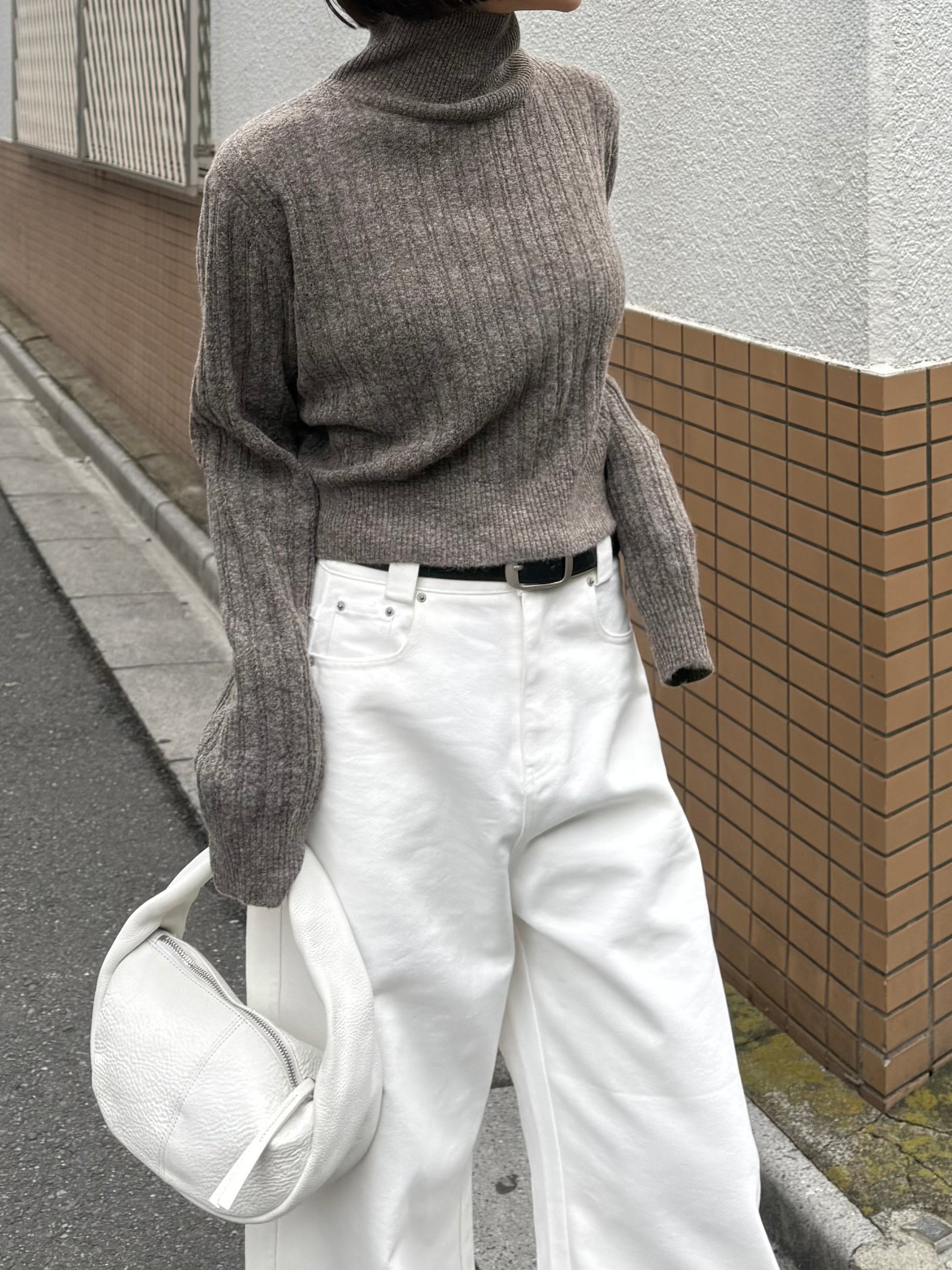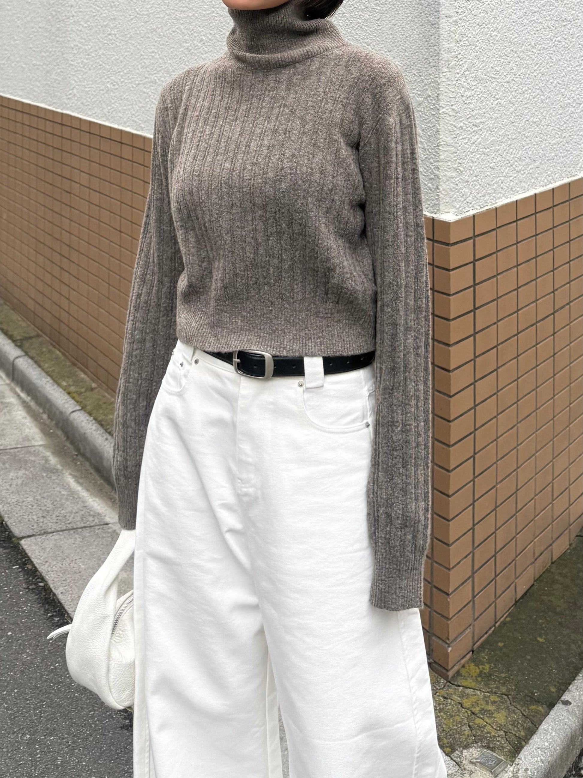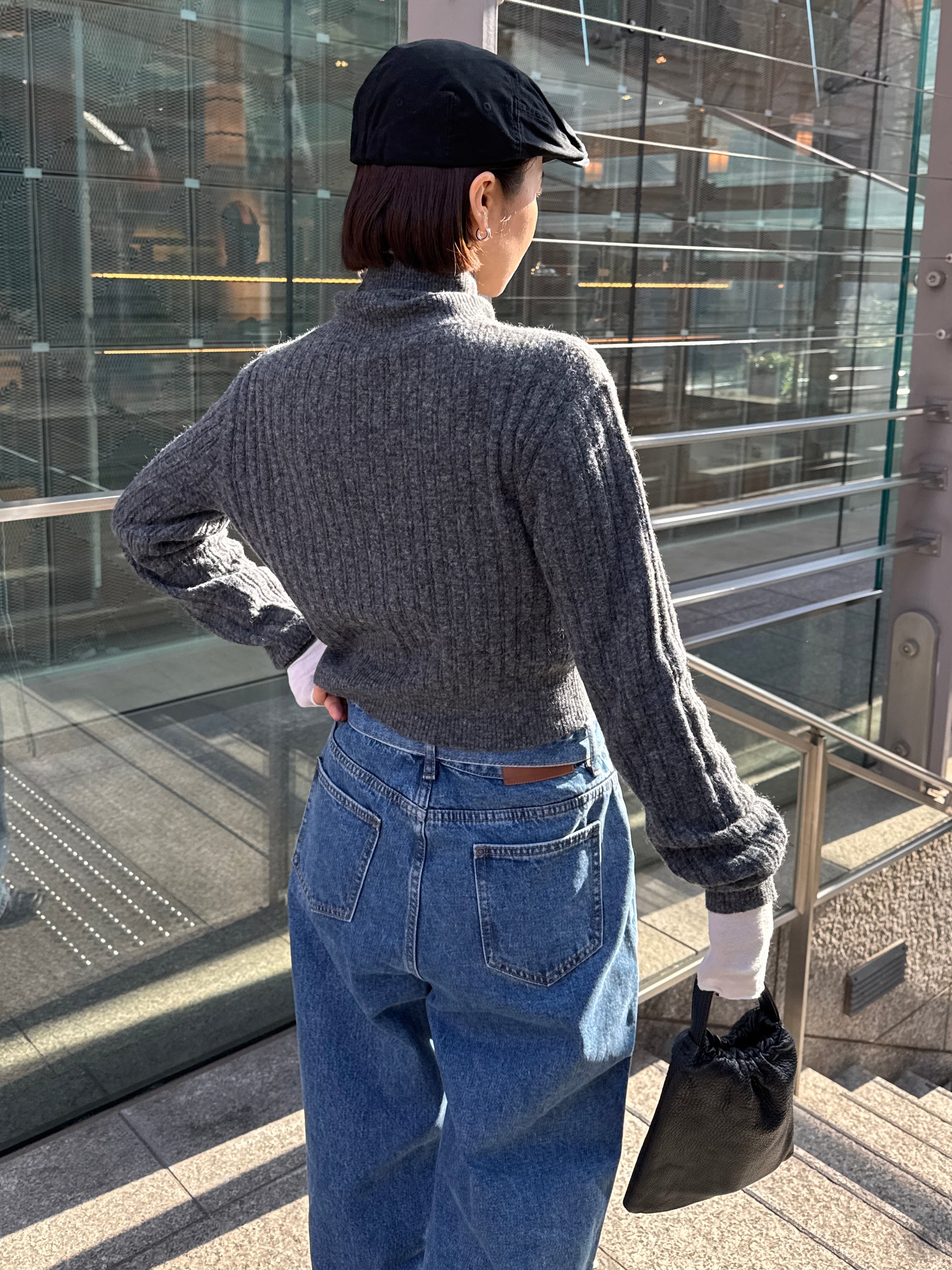 リブ編みの縦ラインが自然と身体に沿い、コンパクトながらも窮屈さのないシルエットに。