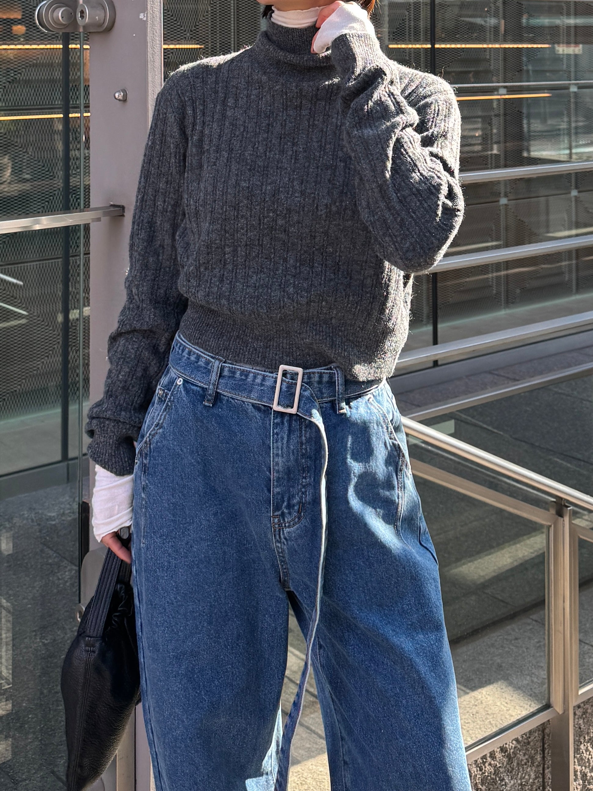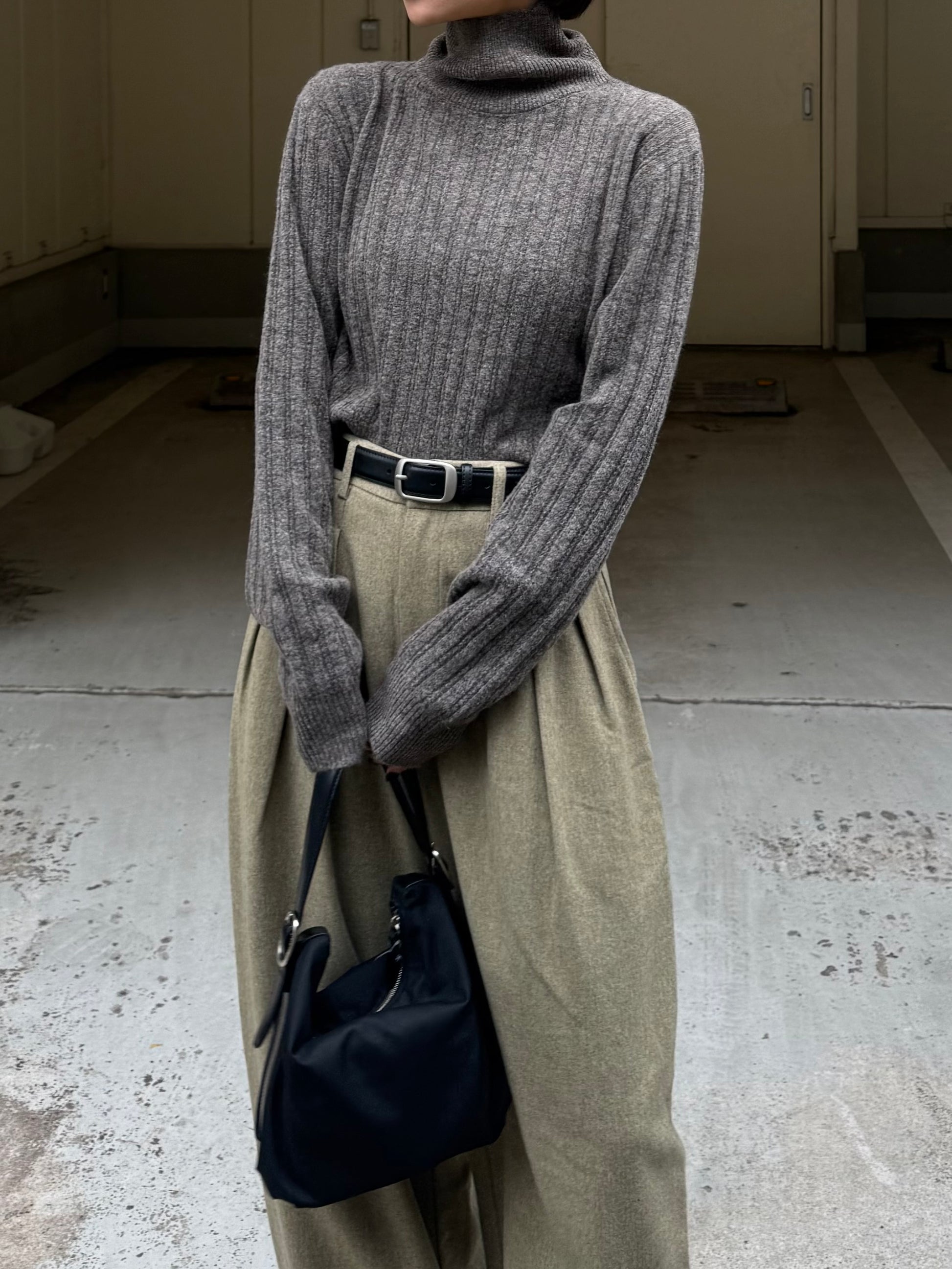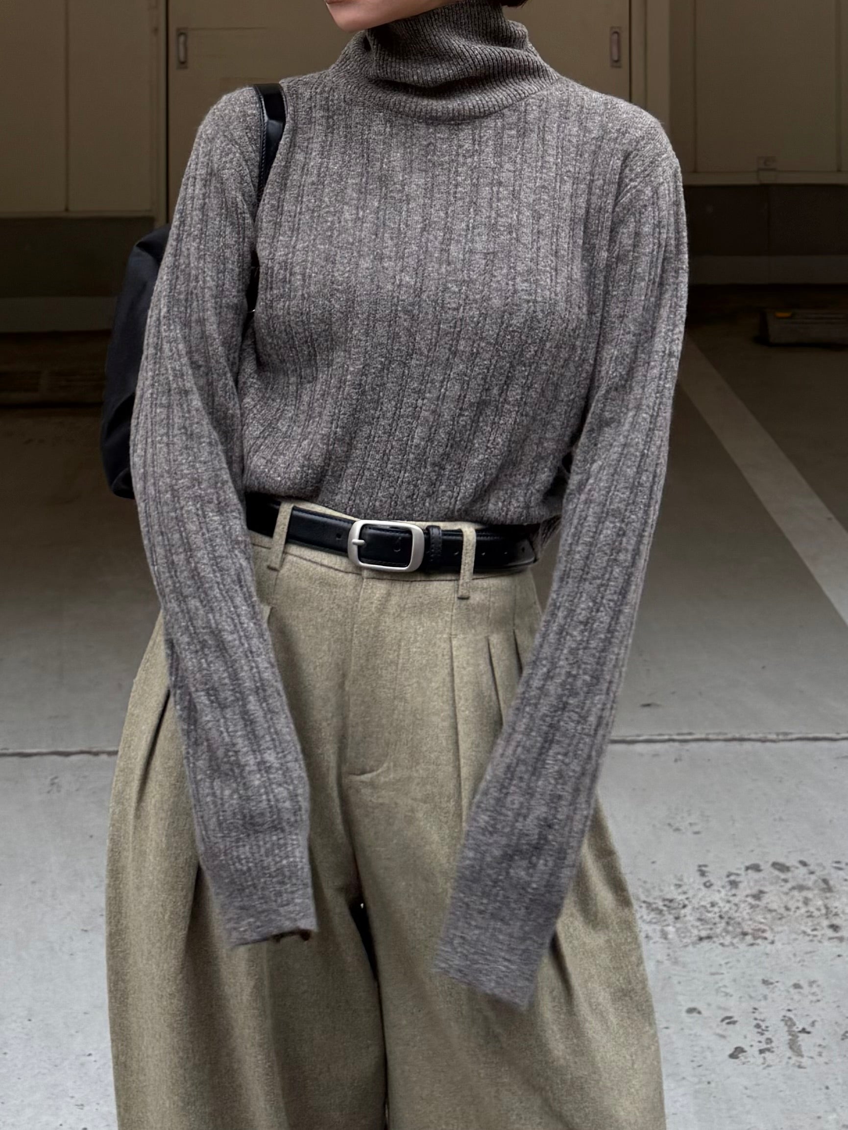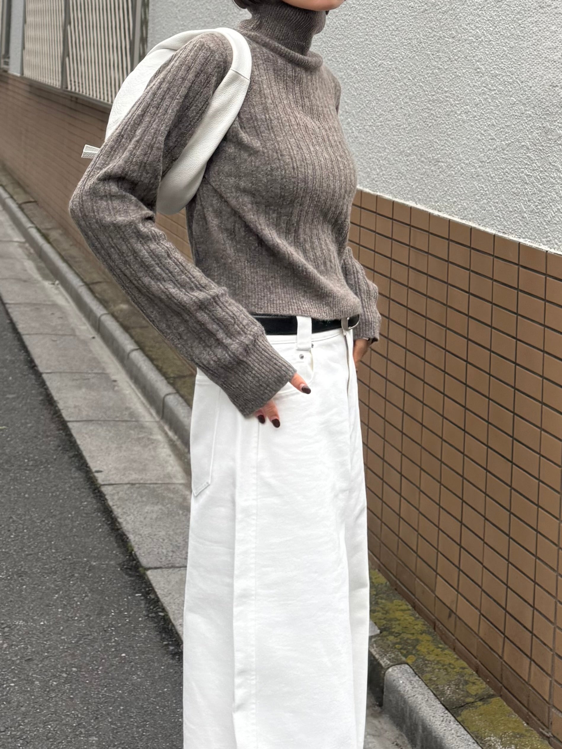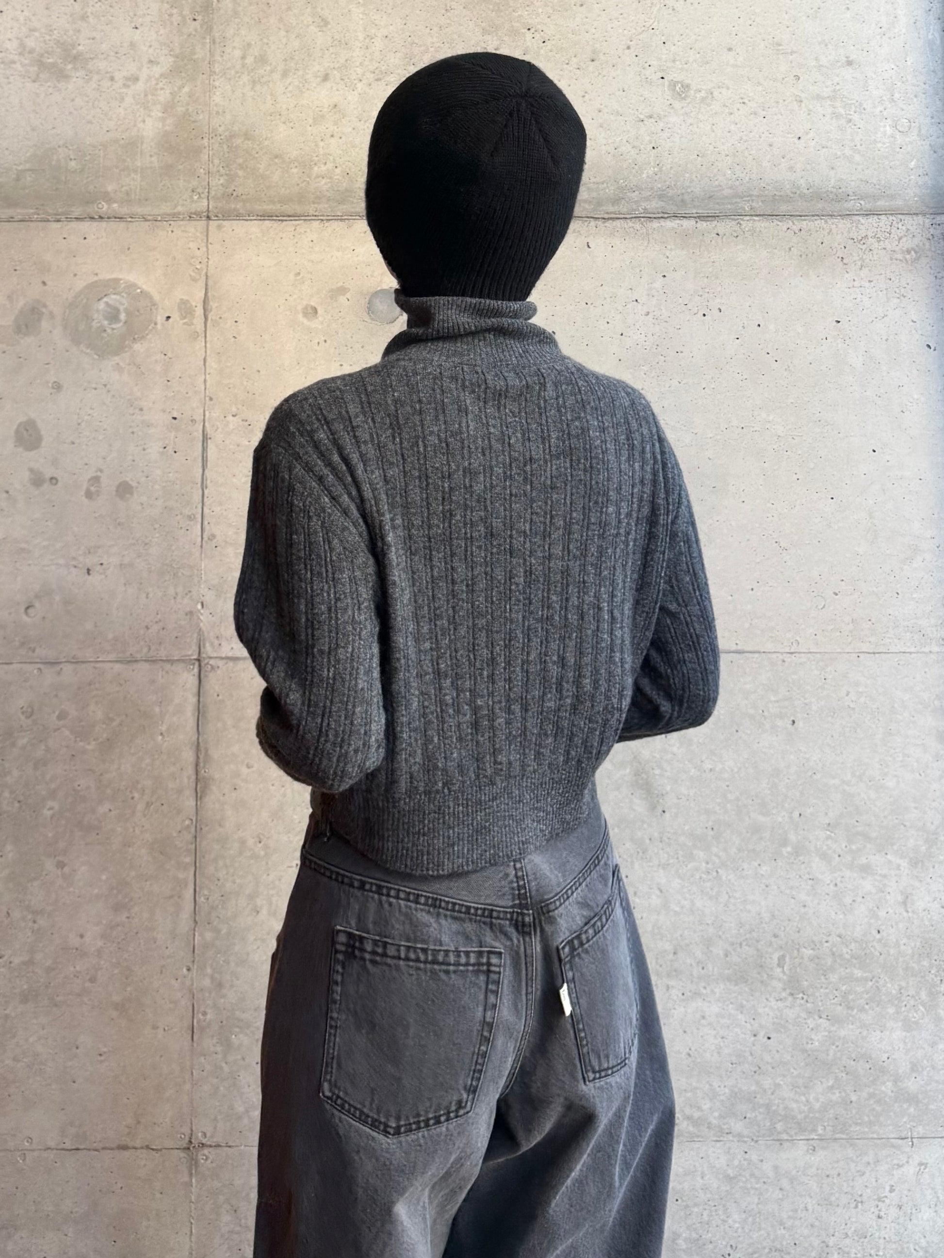 リブ編みの縦ラインが自然と身体に沿い、コンパクトながらも窮屈さのないシルエットに。