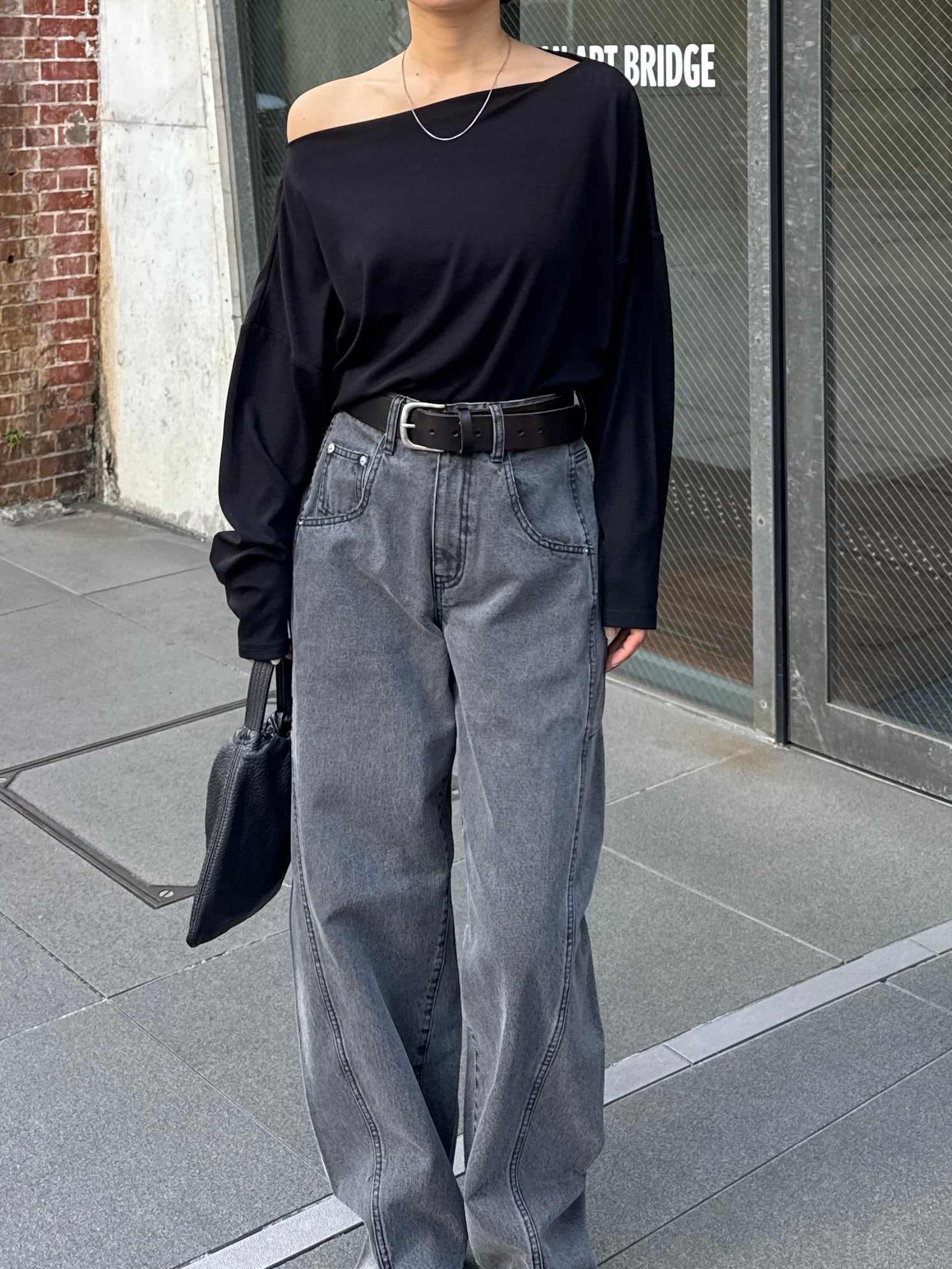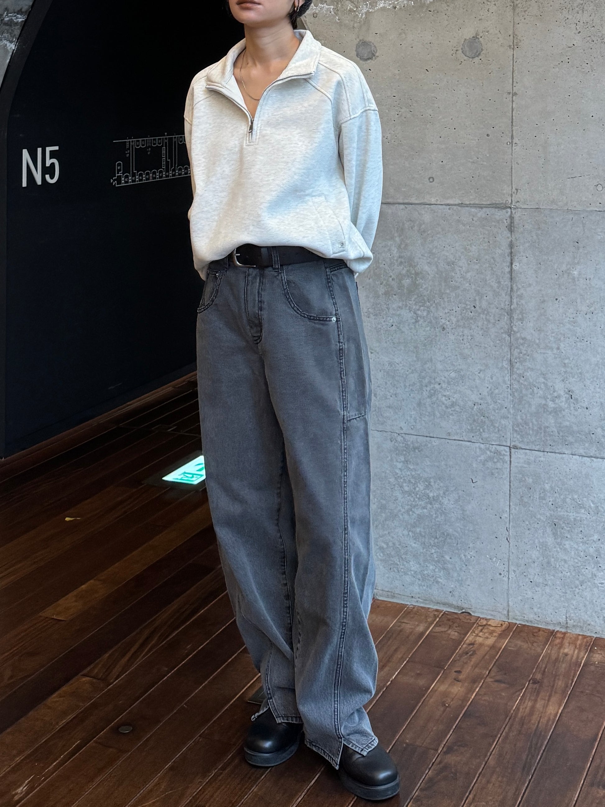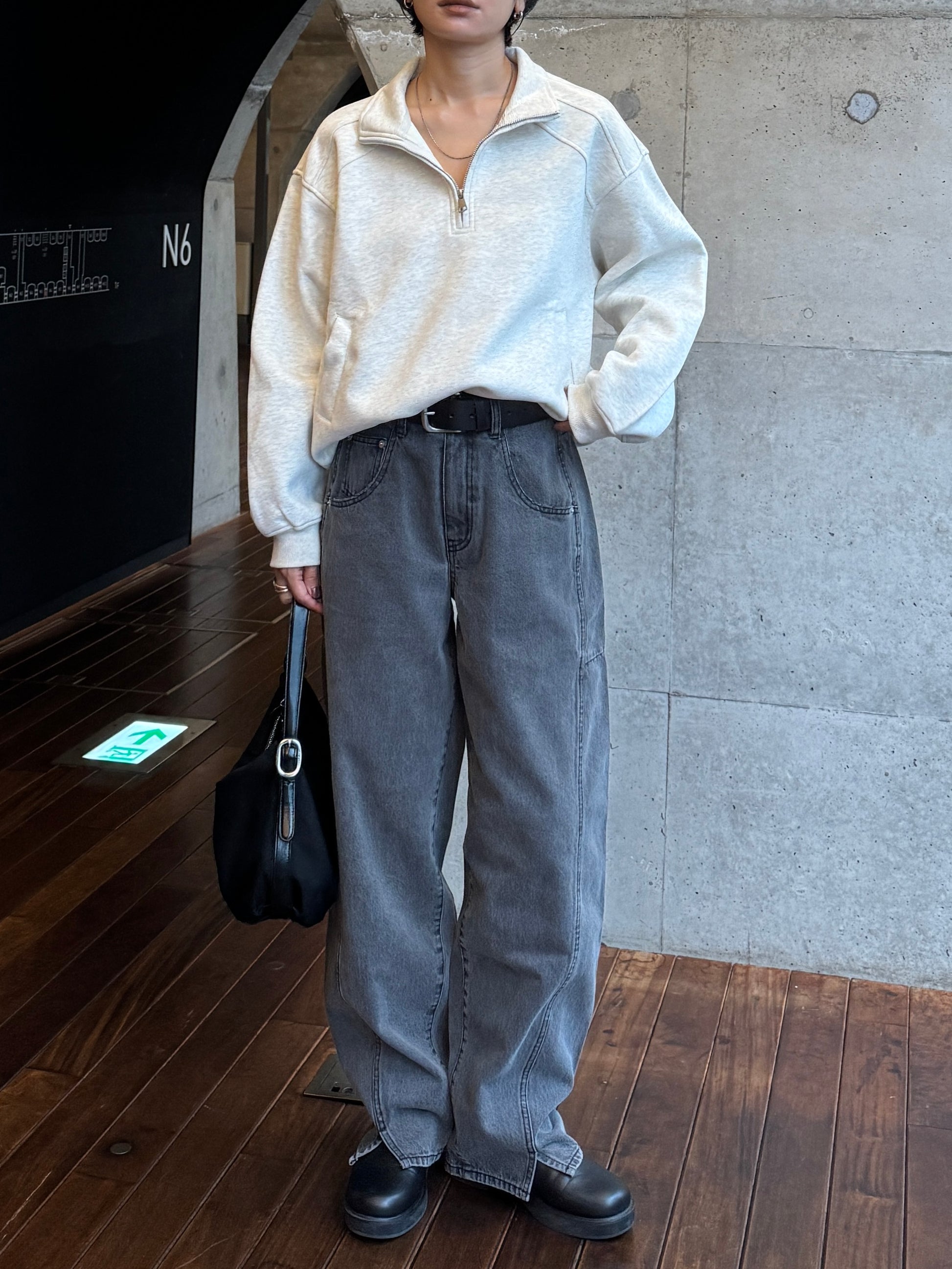 立体的なカーブデザインが慣れ感たっぷりなデニムパンツ。 腰周りを適度にすっきり見せてくれるウエスト位置と裾に向かってゆったりと描く上品なカーブラインにこだわった1着。 スタイリングとのバランスが取りやすいよう、裾にはスリットを考慮してワイド過ぎず絶妙なシルエットに仕上げました。また、加工感にヒゲを入れないことで大人な一本になったと思います。 また01と02で股下4cmの差を出すことで、より幅広いご身長に合わせたサイズ選びを可能としております。