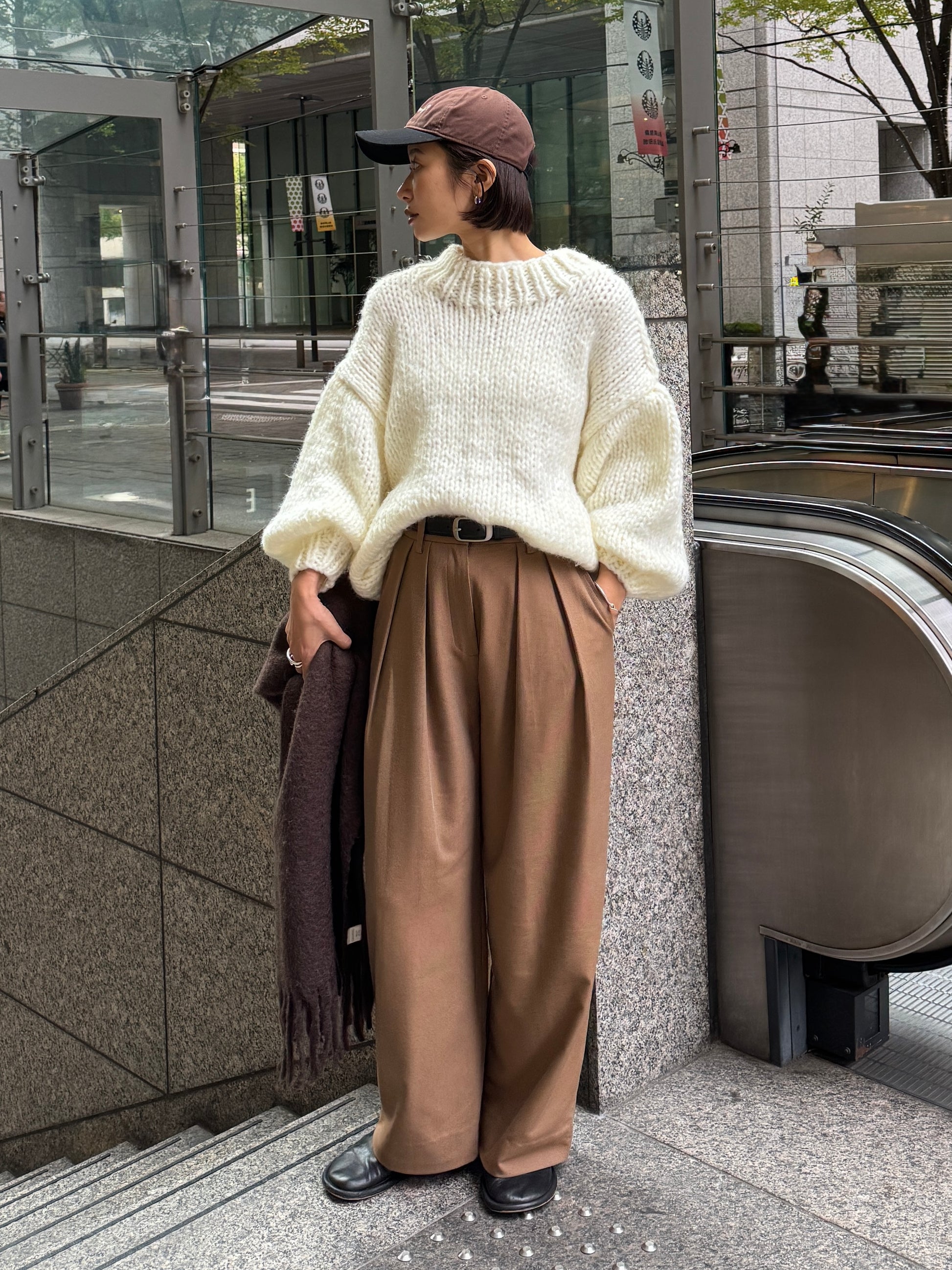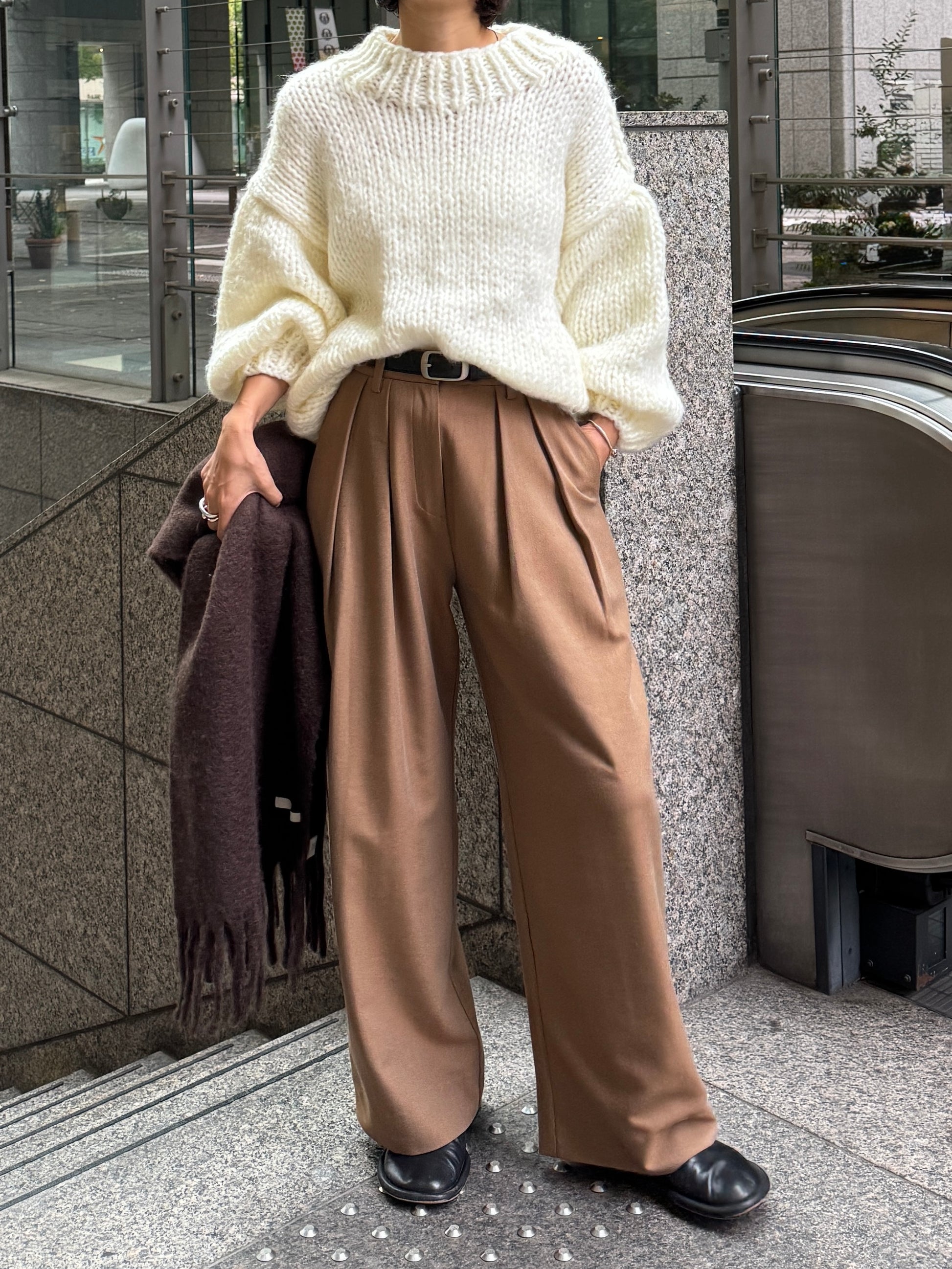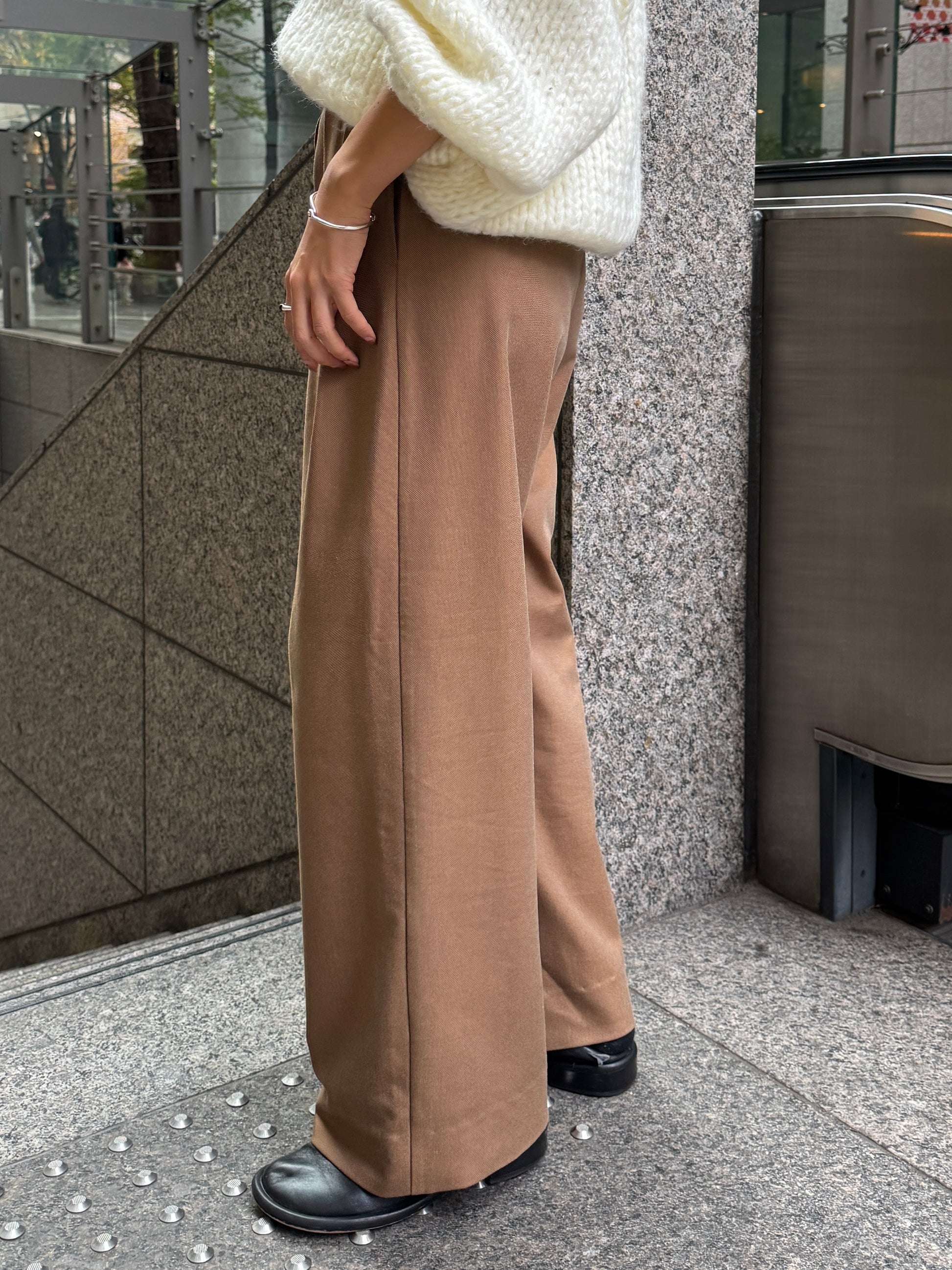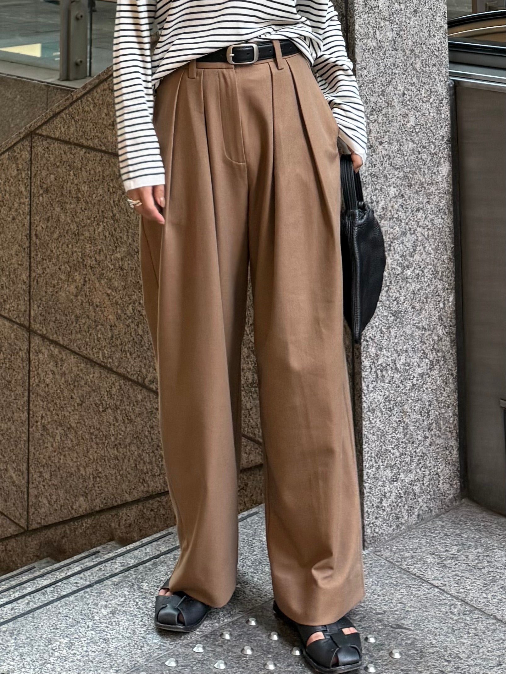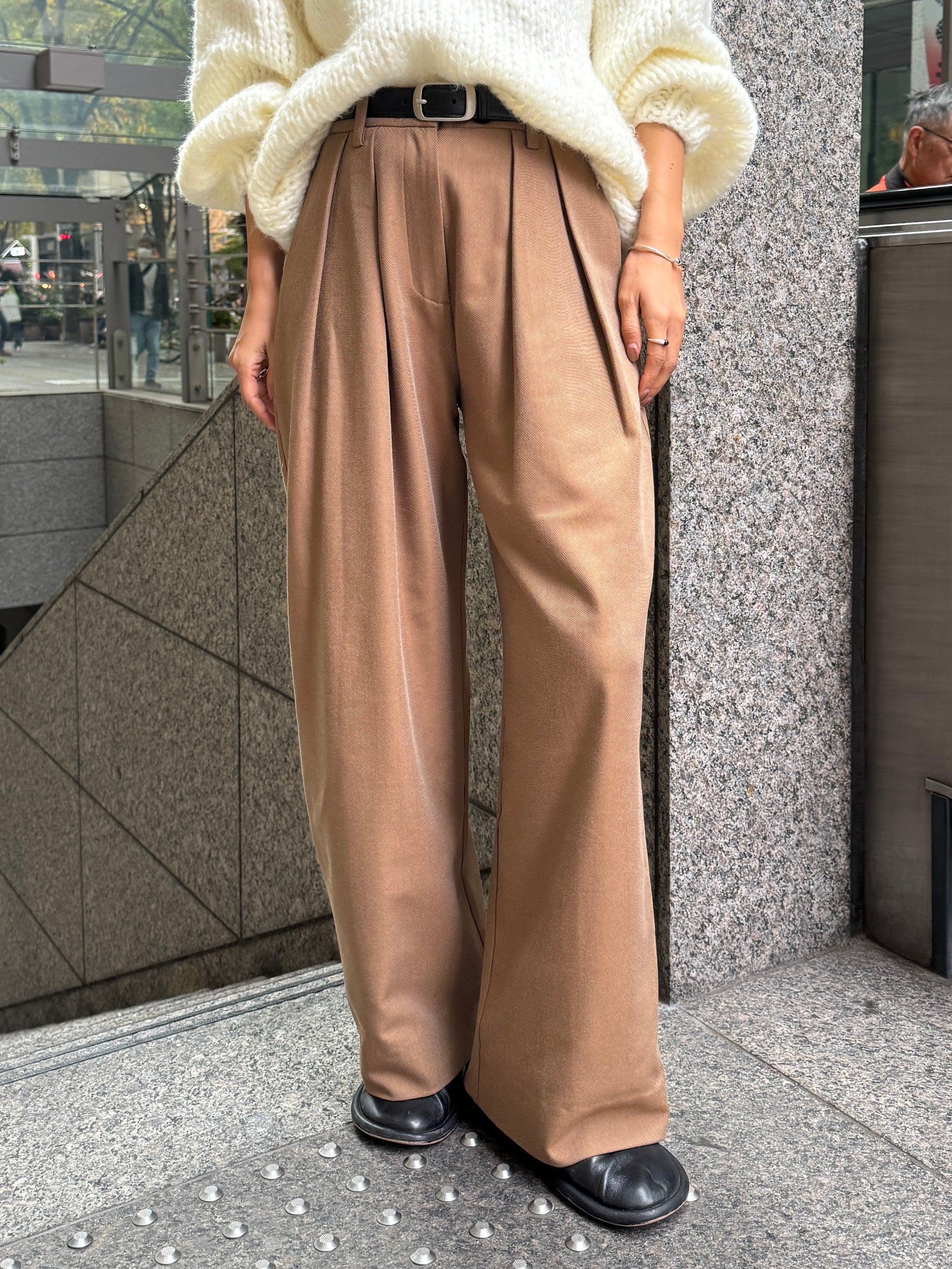 上質でマニッシュな印象のトラウザーズ。 フロントに施したタブルタックがポイントとなり、上品なシルエットが魅力。 丈は少し長めに設定する事で、どの角度からも綺麗に履けるマストバイアイテムに仕上がりました。 この1本があるだけで「着たくなる」を叶えた1本です。 パンツのシルエットを際立たせるシンプルなトップスをインして着て頂くのはもちろんゆるっとした表情あるニットやカジュアルなスウェット合わせなどもおすすめです。