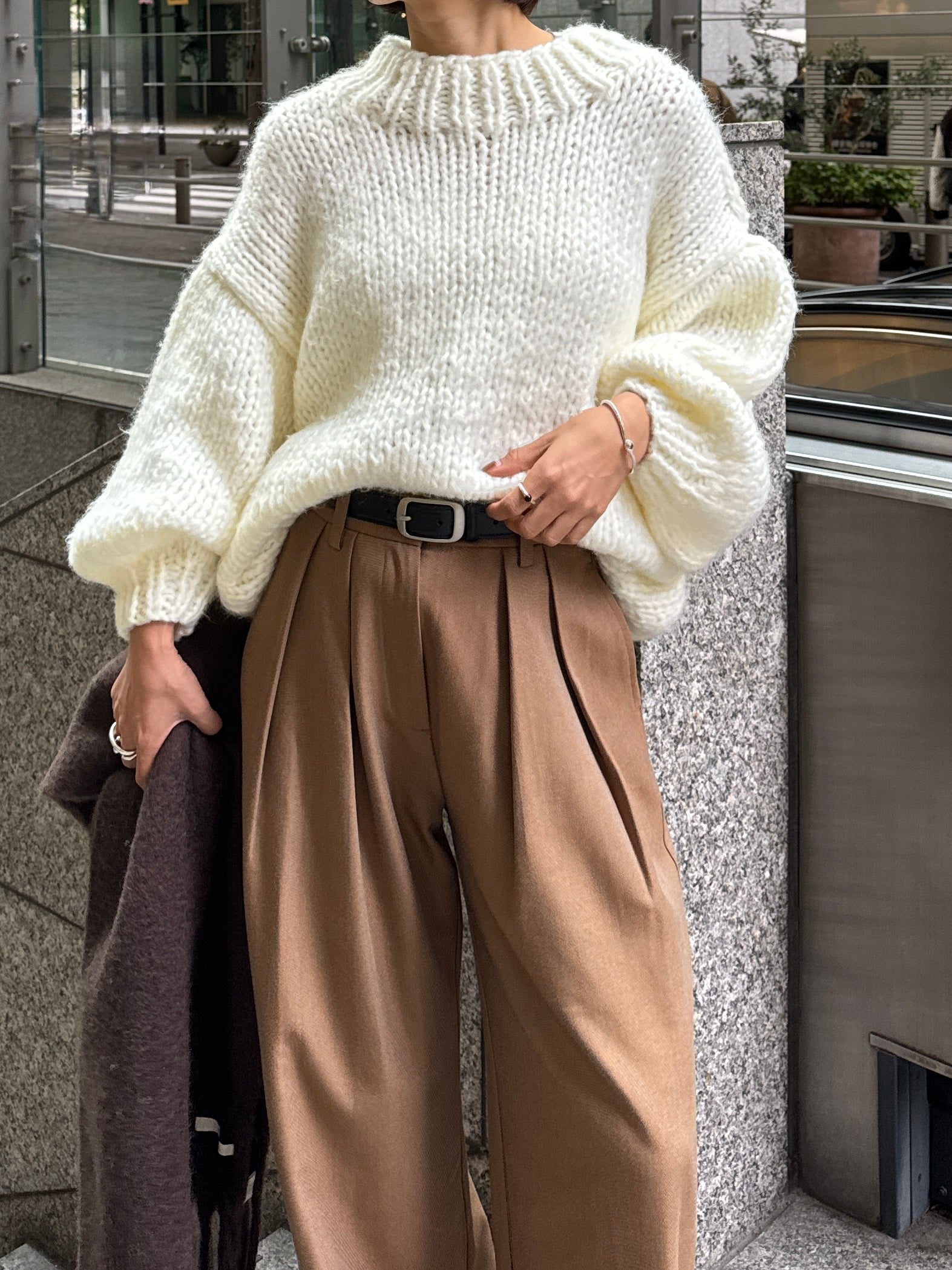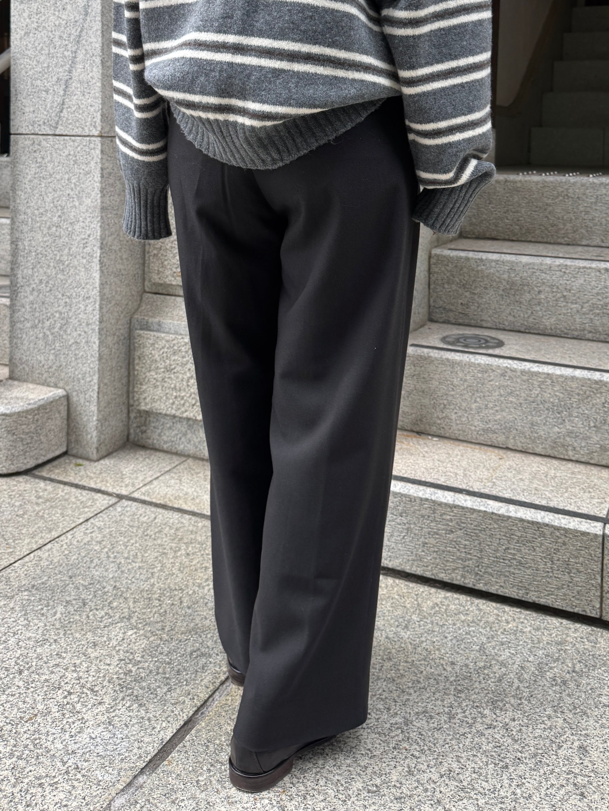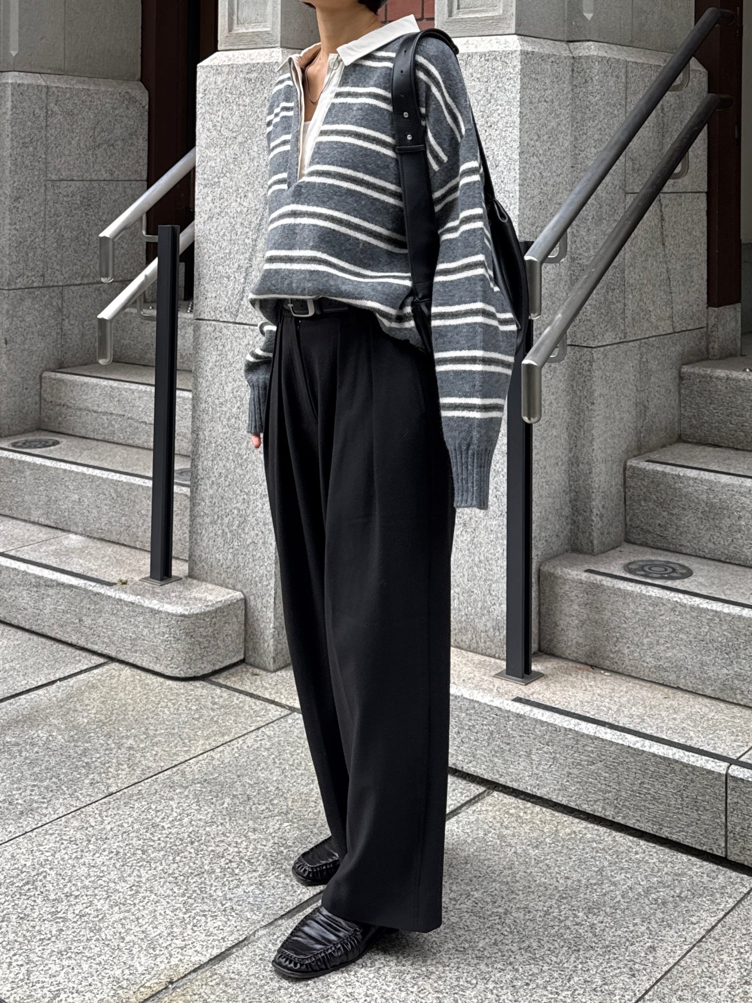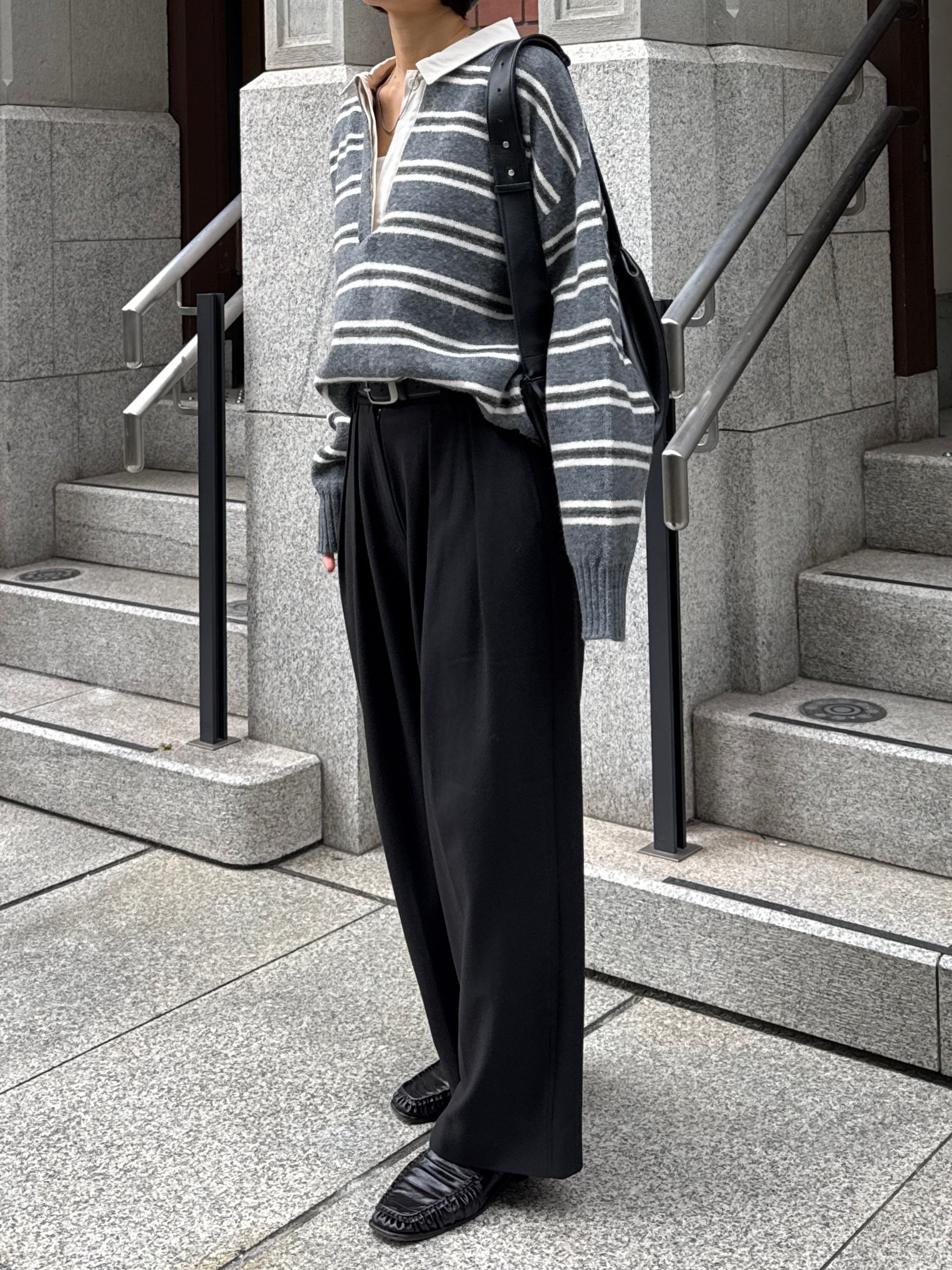 上質でマニッシュな印象のトラウザーズ。 フロントに施したタブルタックがポイントとなり、上品なシルエットが魅力。 丈は少し長めに設定する事で、どの角度からも綺麗に履けるマストバイアイテムに仕上がりました。 この1本があるだけで「着たくなる」を叶えた1本です。 パンツのシルエットを際立たせるシンプルなトップスをインして着て頂くのはもちろんゆるっとした表情あるニットやカジュアルなスウェット合わせなどもおすすめです。