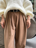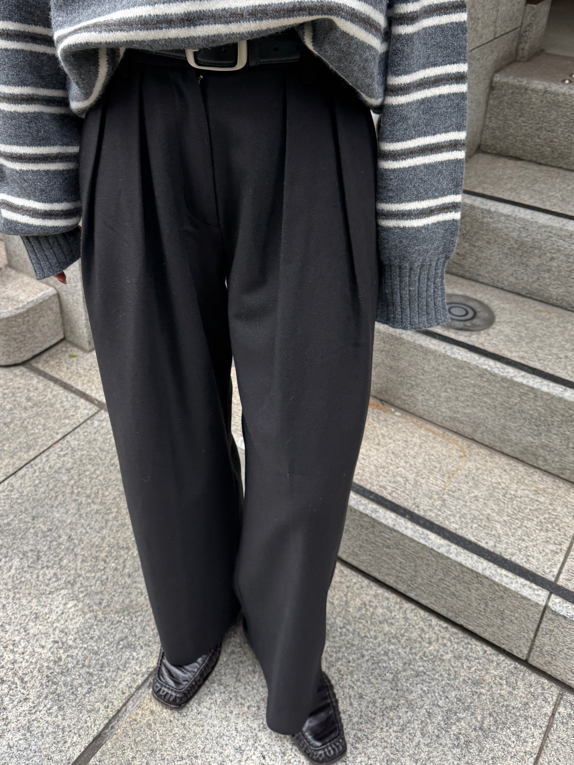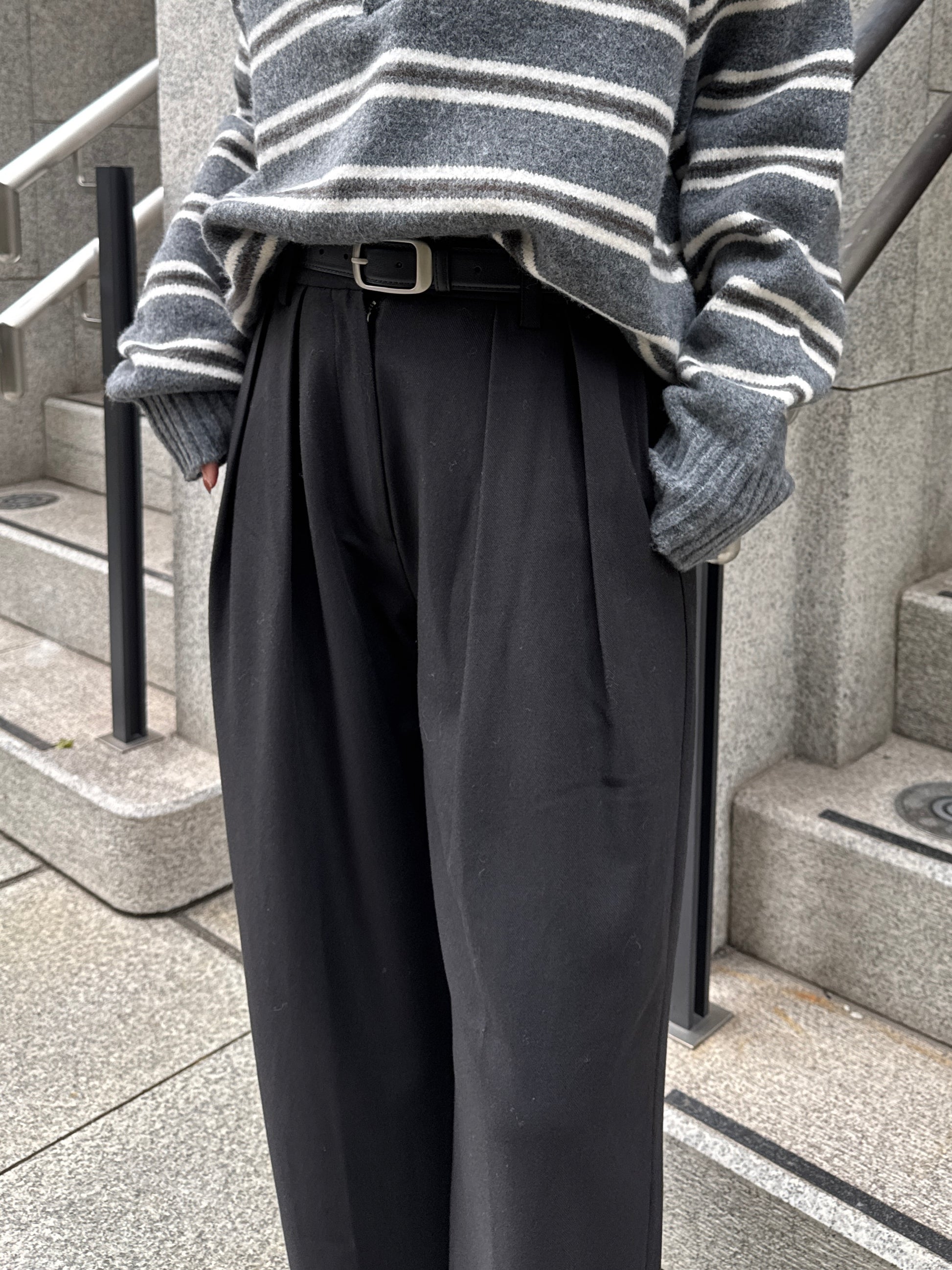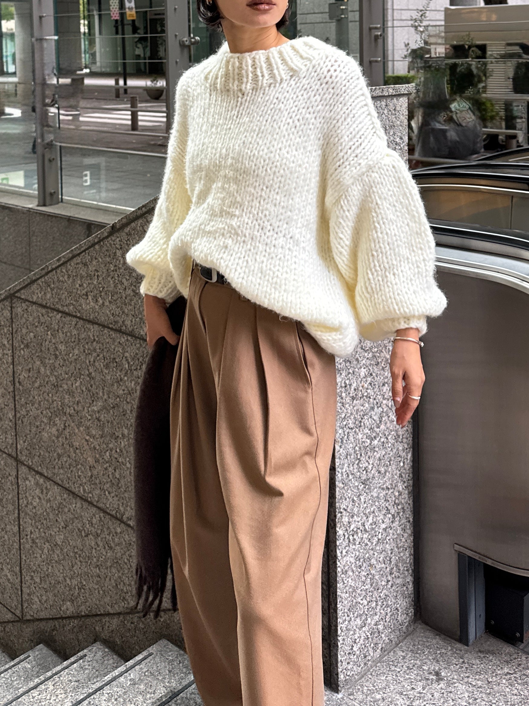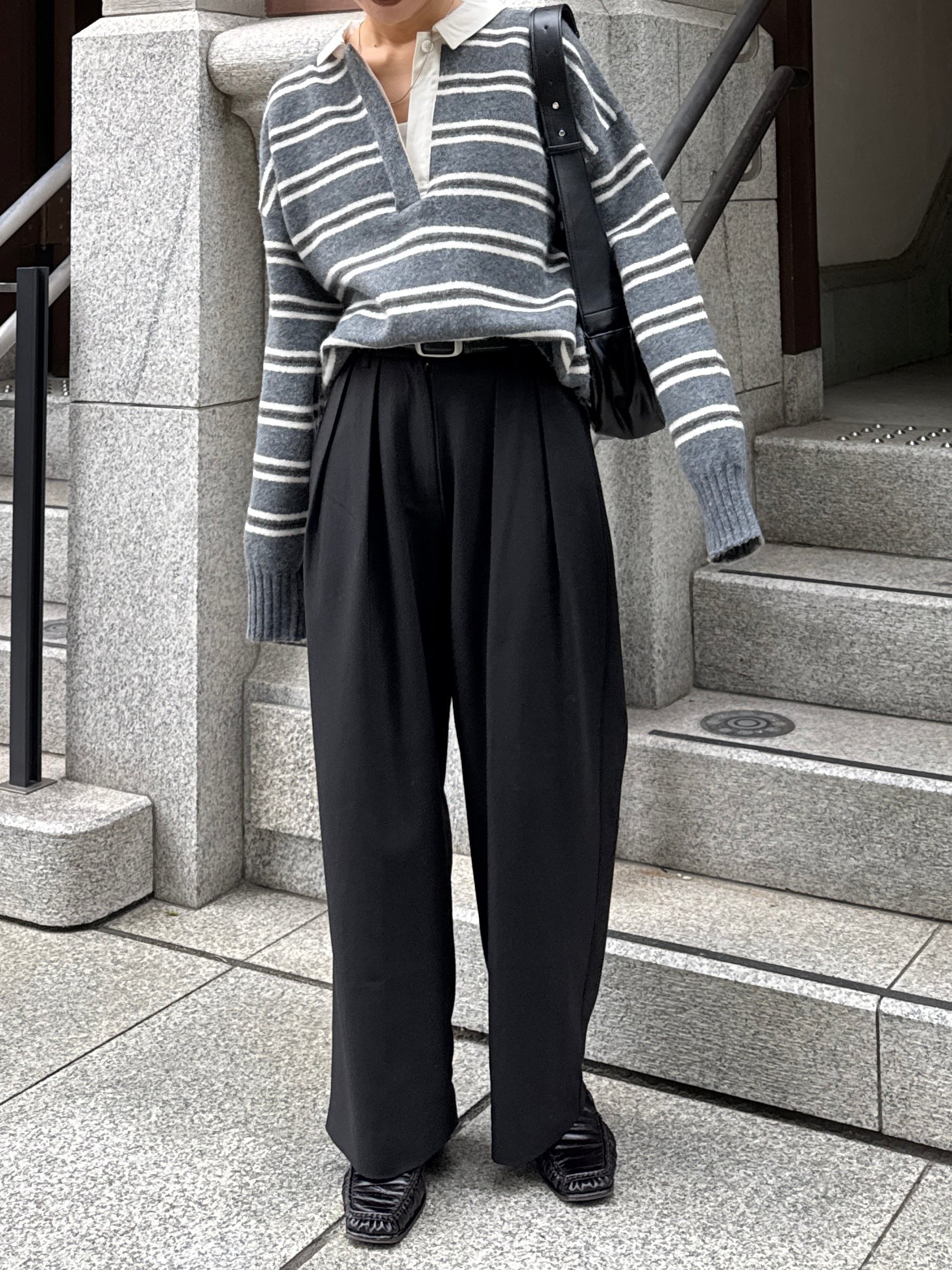 上質でマニッシュな印象のトラウザーズ。 フロントに施したタブルタックがポイントとなり、上品なシルエットが魅力。 丈は少し長めに設定する事で、どの角度からも綺麗に履けるマストバイアイテムに仕上がりました。 この1本があるだけで「着たくなる」を叶えた1本です。 パンツのシルエットを際立たせるシンプルなトップスをインして着て頂くのはもちろんゆるっとした表情あるニットやカジュアルなスウェット合わせなどもおすすめです。