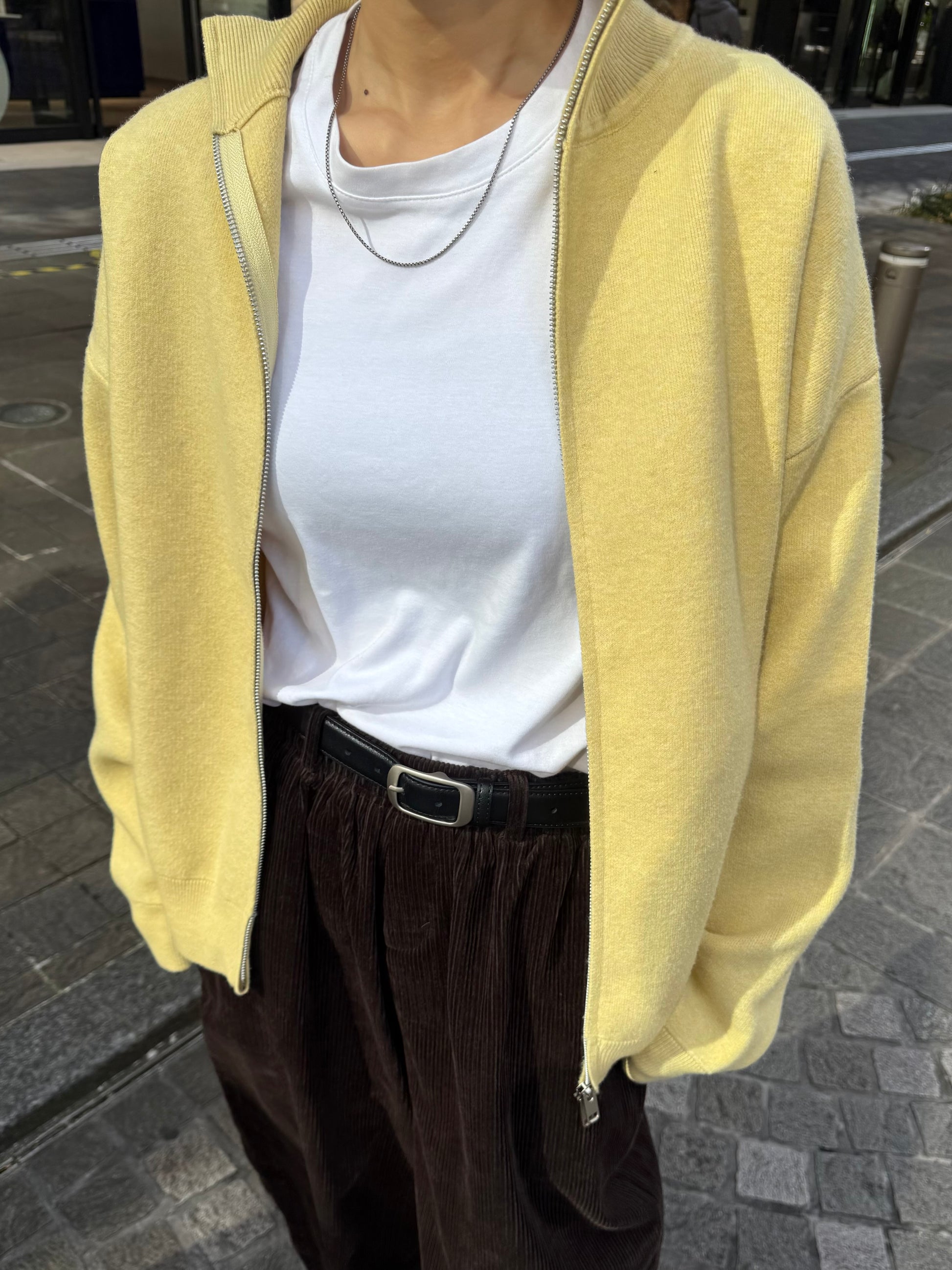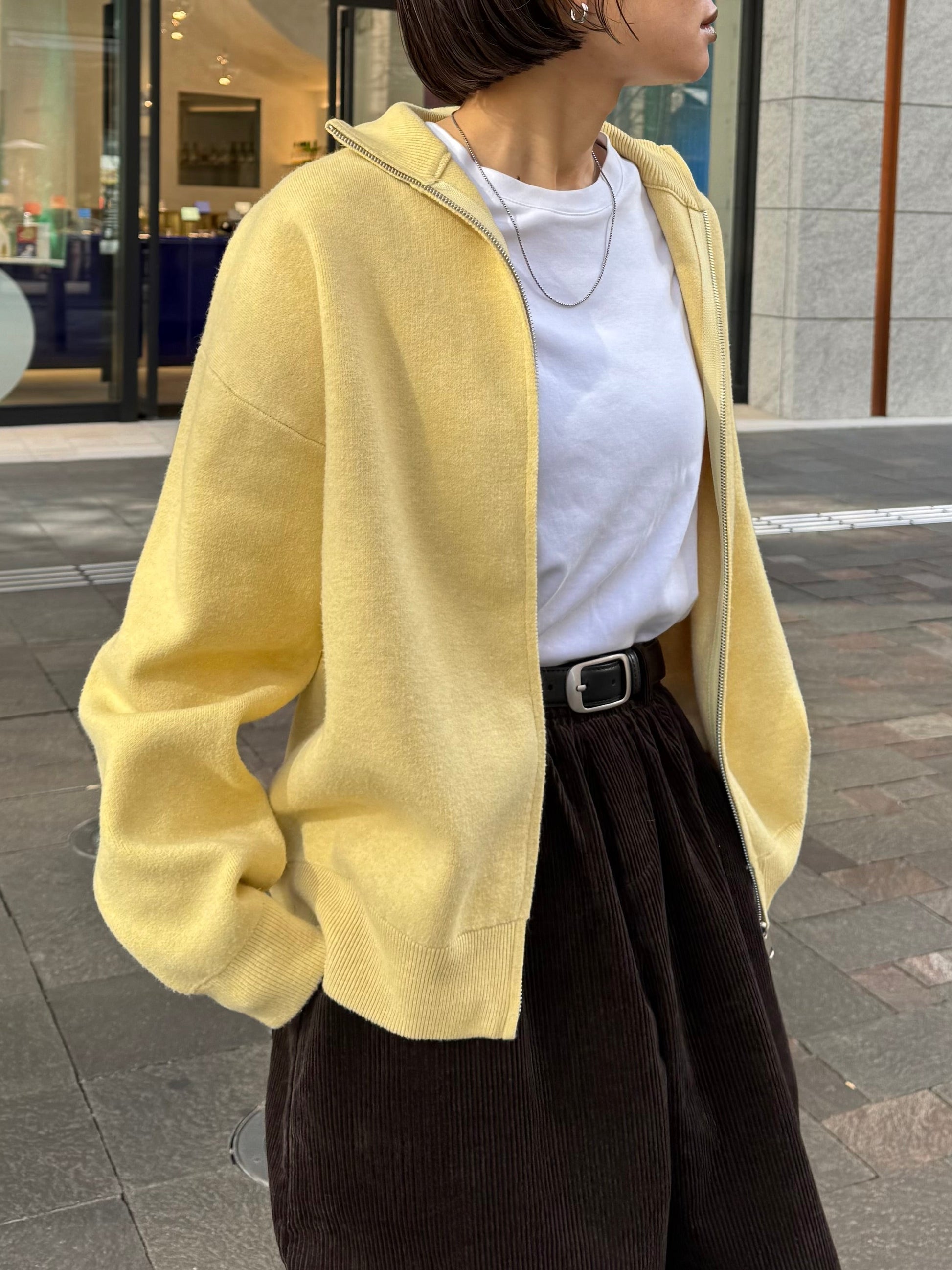 ふんわりとした風合いと上品な抜け感が魅力のニットカーディガン。 軽やかなポリエステルをベースに、アクリルとポリウレタンをブレンドした素材で柔らかさと伸縮性を両立。 軽く羽織るだけでシルエットがきれいに決まり、リラックス感のある着心地を叶えます。 ダブルジップ仕様で、上下から開閉できるのがポイント。 ファスナーを下から少し開ければ、ウエストまわりに抜け感が生まれボリュームボトムとのバランスも◎ 上を少し開けてインナーをのぞかせれば、立体感のあるレイヤードスタイルに仕上がります。 気温や気分に合わせてアレンジを楽しめる着回し力の高い1枚です。