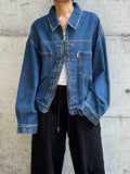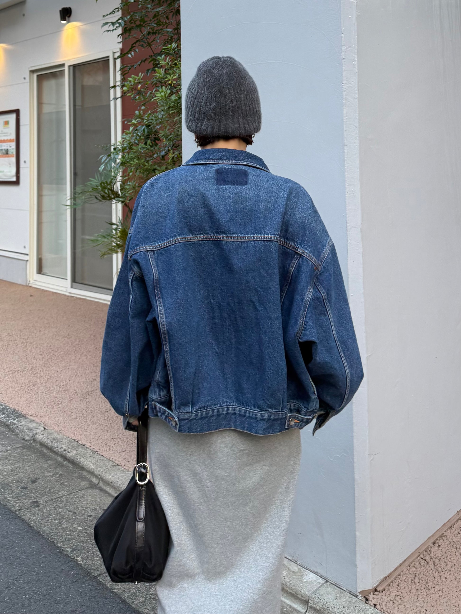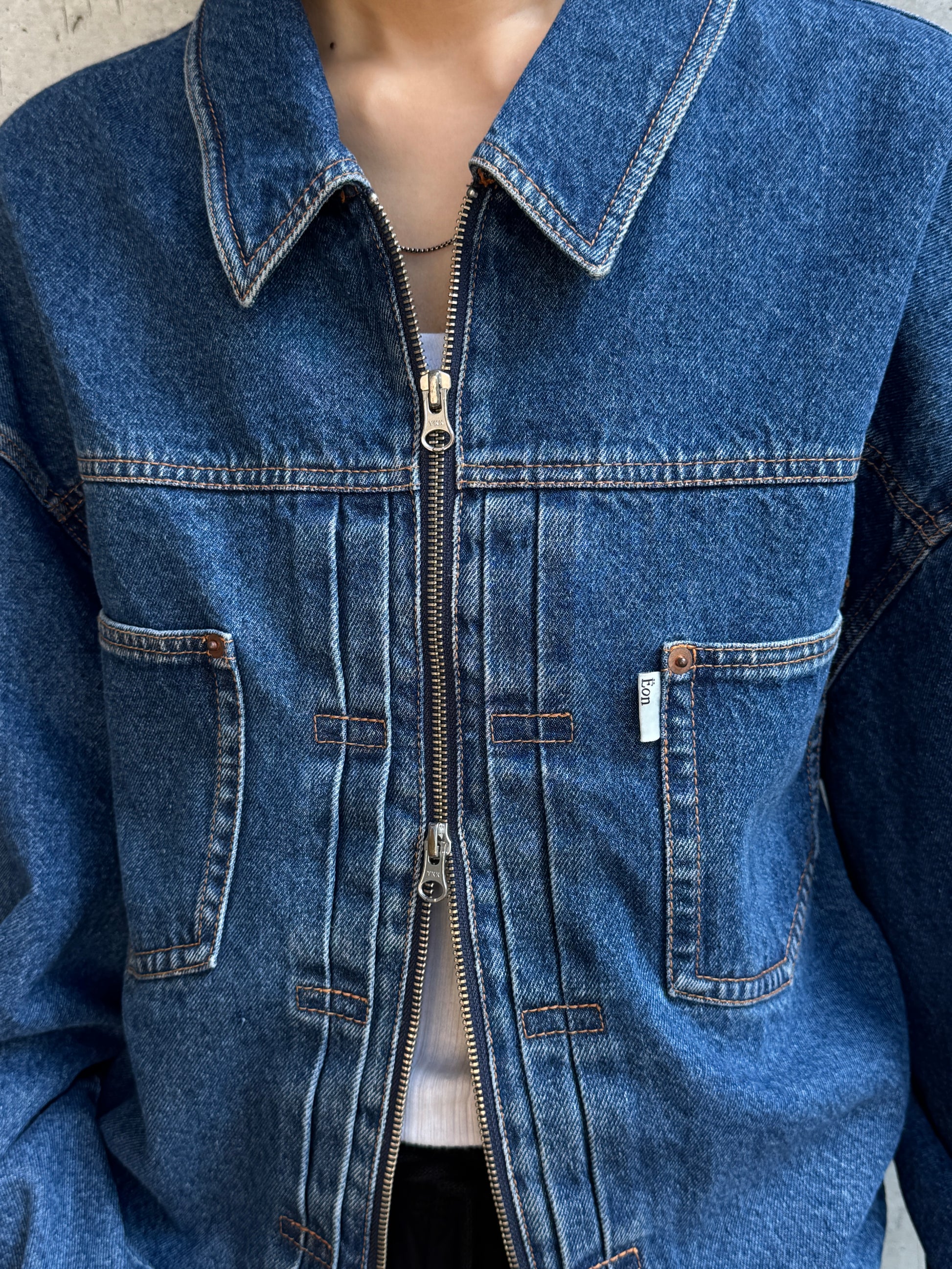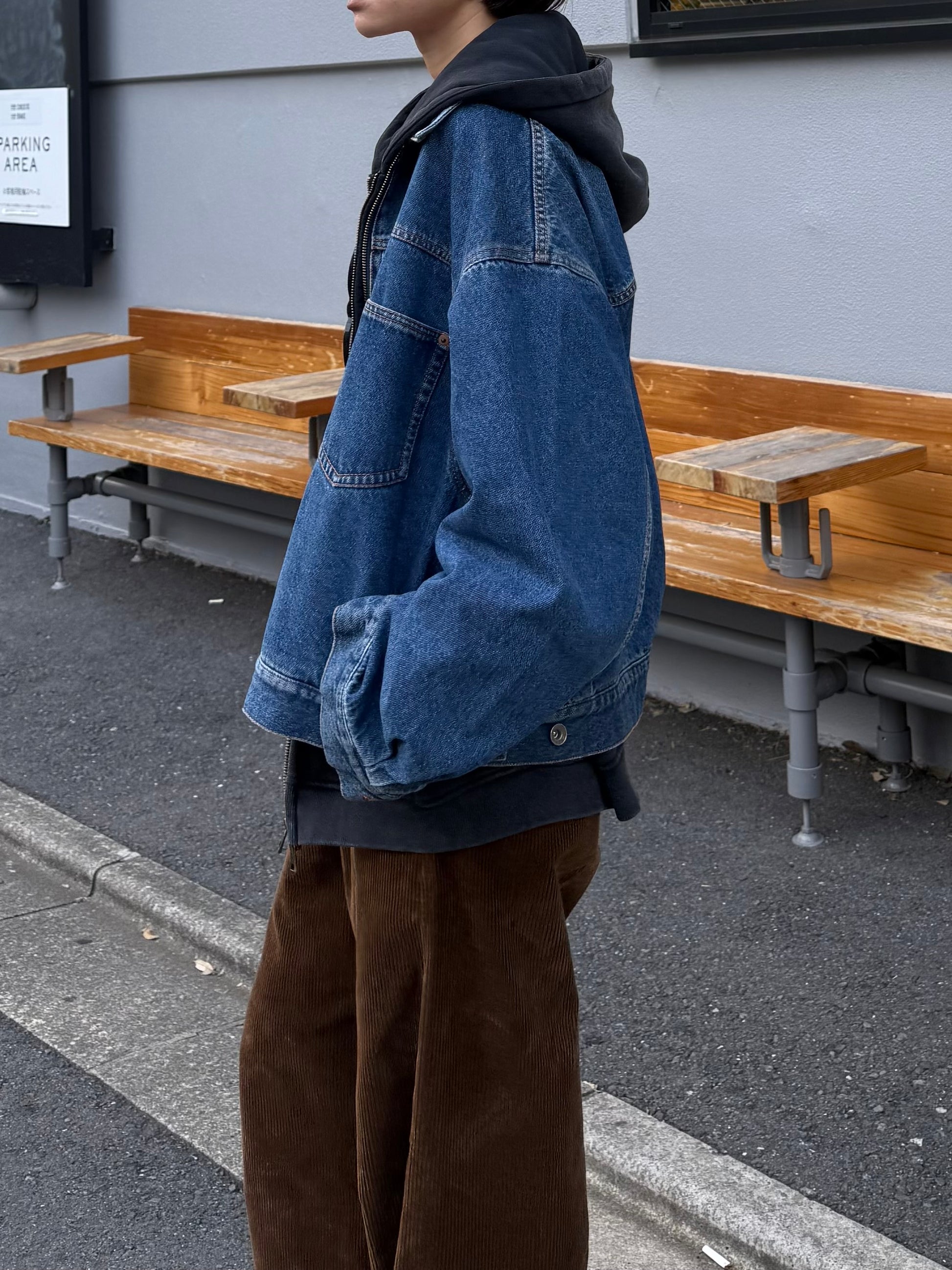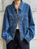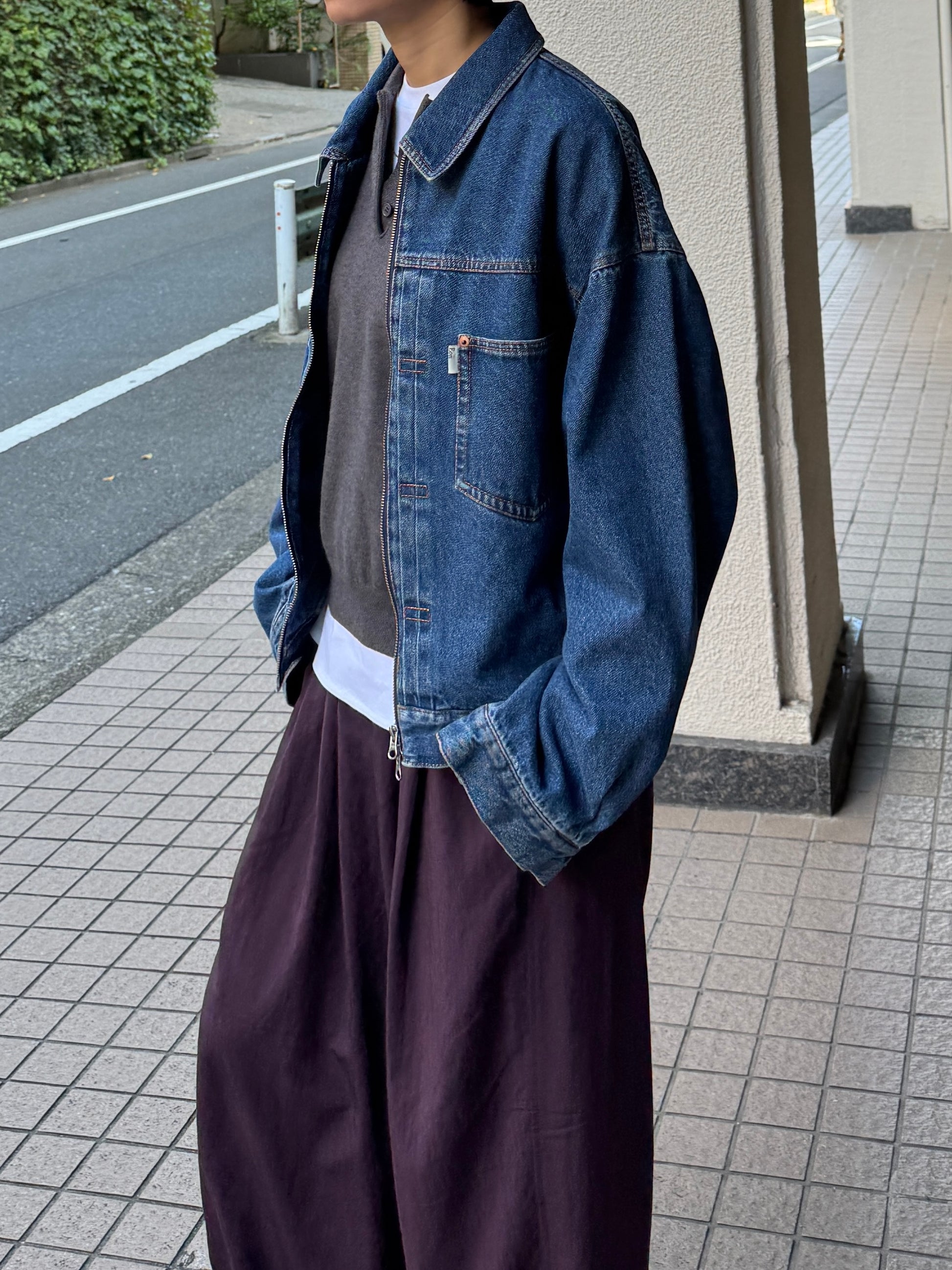 ディテールにこだわったデザインが魅力のオリジナルデニムジャケット。 デニム素材でラフさもありながらヴィンテージライクな加工を施し、シンプルながらも存在感のある1着に仕上げました。 程よくゆとりのあるシルエットが映えるハリ感と風合いが、洗練された大人のこなれ感を演出。 襟ぐりを広めにすることで顔まわりの印象をすっきりに、アームホールのたっぷり感も女性らしさを引き立たせてくれるポイントです。 フロントのダブルジップや裾タブの開閉次第で、バランスも取りやすく様々な着こなしのや変化がお楽しみいただけます。 幅広いスタイルに馴染む落ち着いた飽きのこないカラーで、ワードローブに加えたくなる秋のマストハブアイテムです。