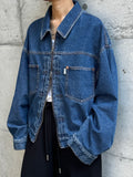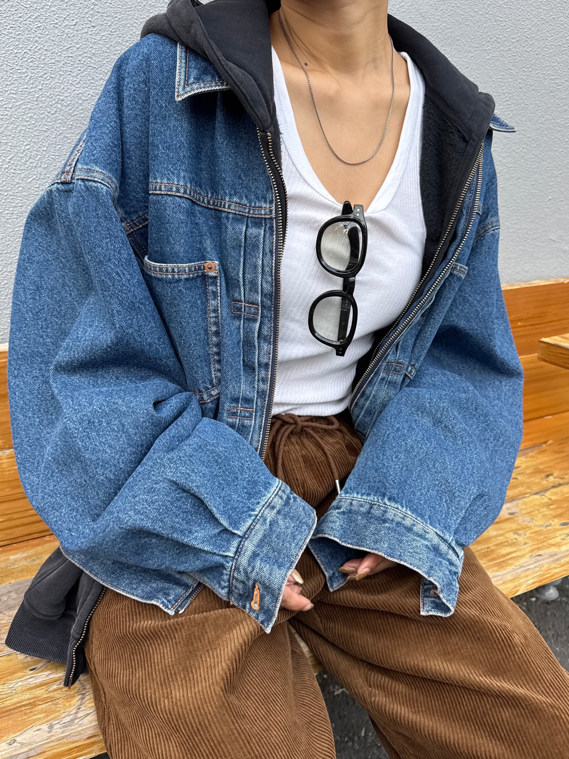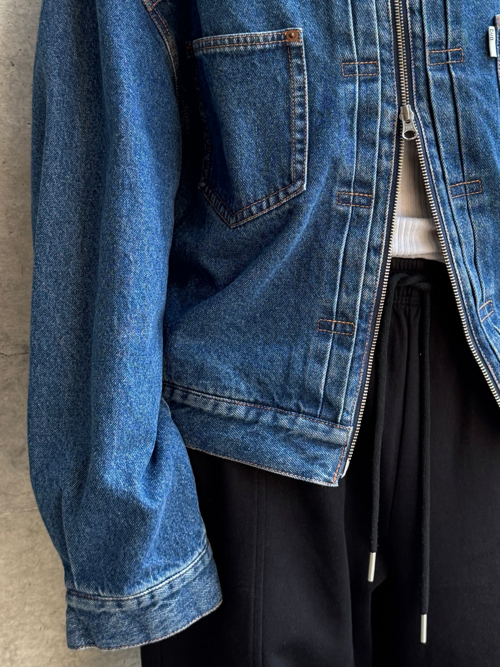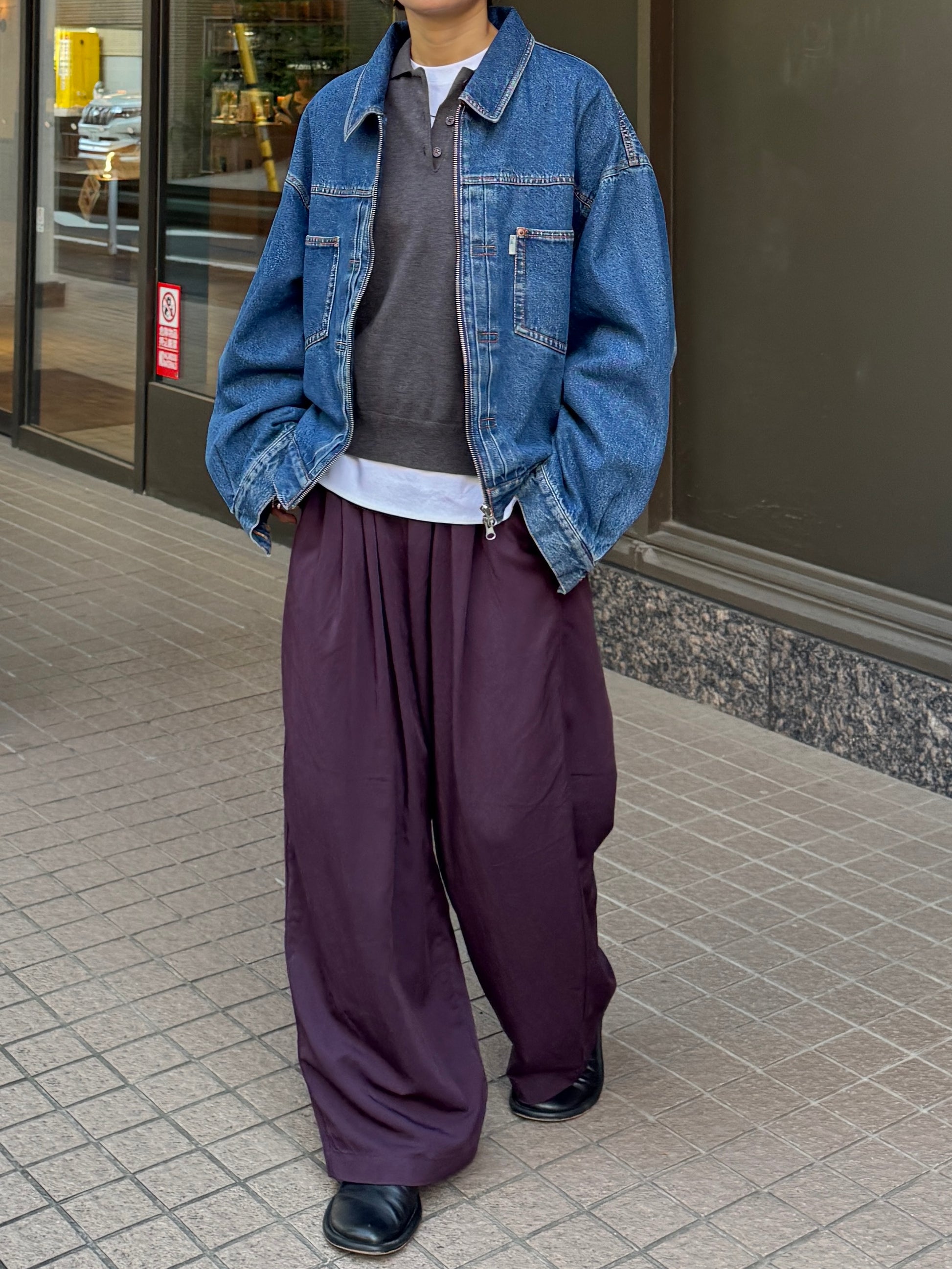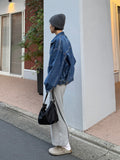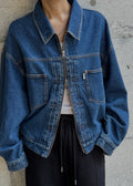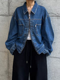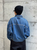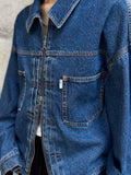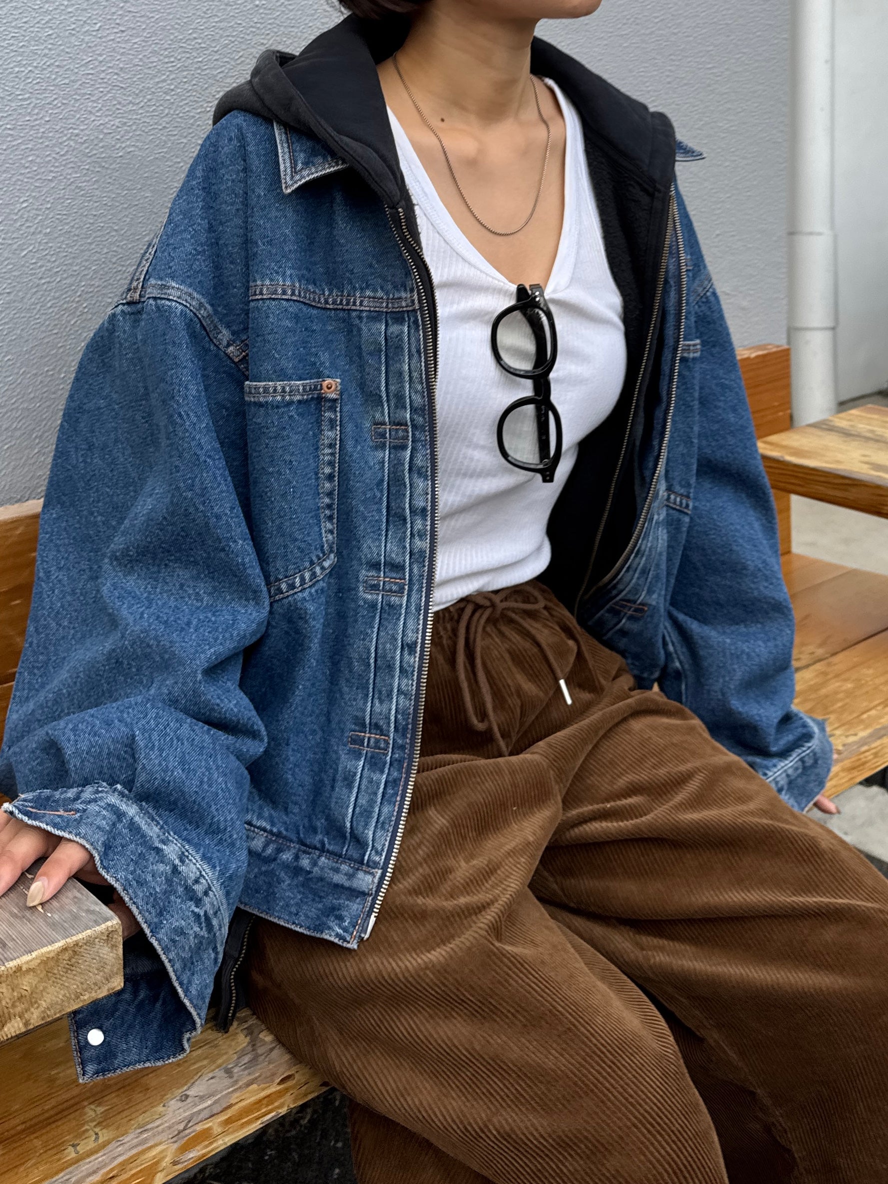 ディテールにこだわったデザインが魅力のオリジナルデニムジャケット。 デニム素材でラフさもありながらヴィンテージライクな加工を施し、シンプルながらも存在感のある1着に仕上げました。 程よくゆとりのあるシルエットが映えるハリ感と風合いが、洗練された大人のこなれ感を演出。 襟ぐりを広めにすることで顔まわりの印象をすっきりに、アームホールのたっぷり感も女性らしさを引き立たせてくれるポイントです。 フロントのダブルジップや裾タブの開閉次第で、バランスも取りやすく様々な着こなしのや変化がお楽しみいただけます。 幅広いスタイルに馴染む落ち着いた飽きのこないカラーで、ワードローブに加えたくなる秋のマストハブアイテムです。