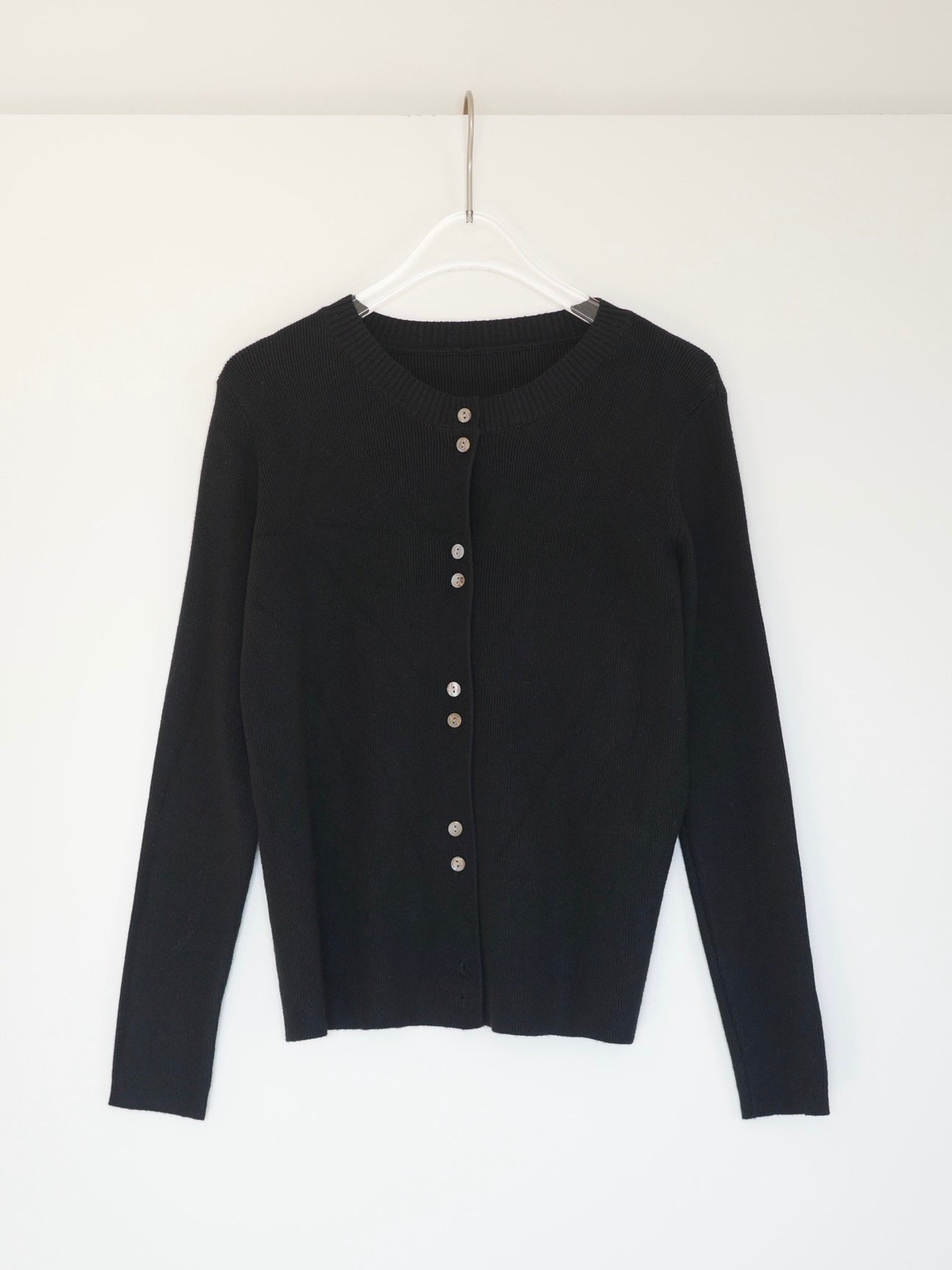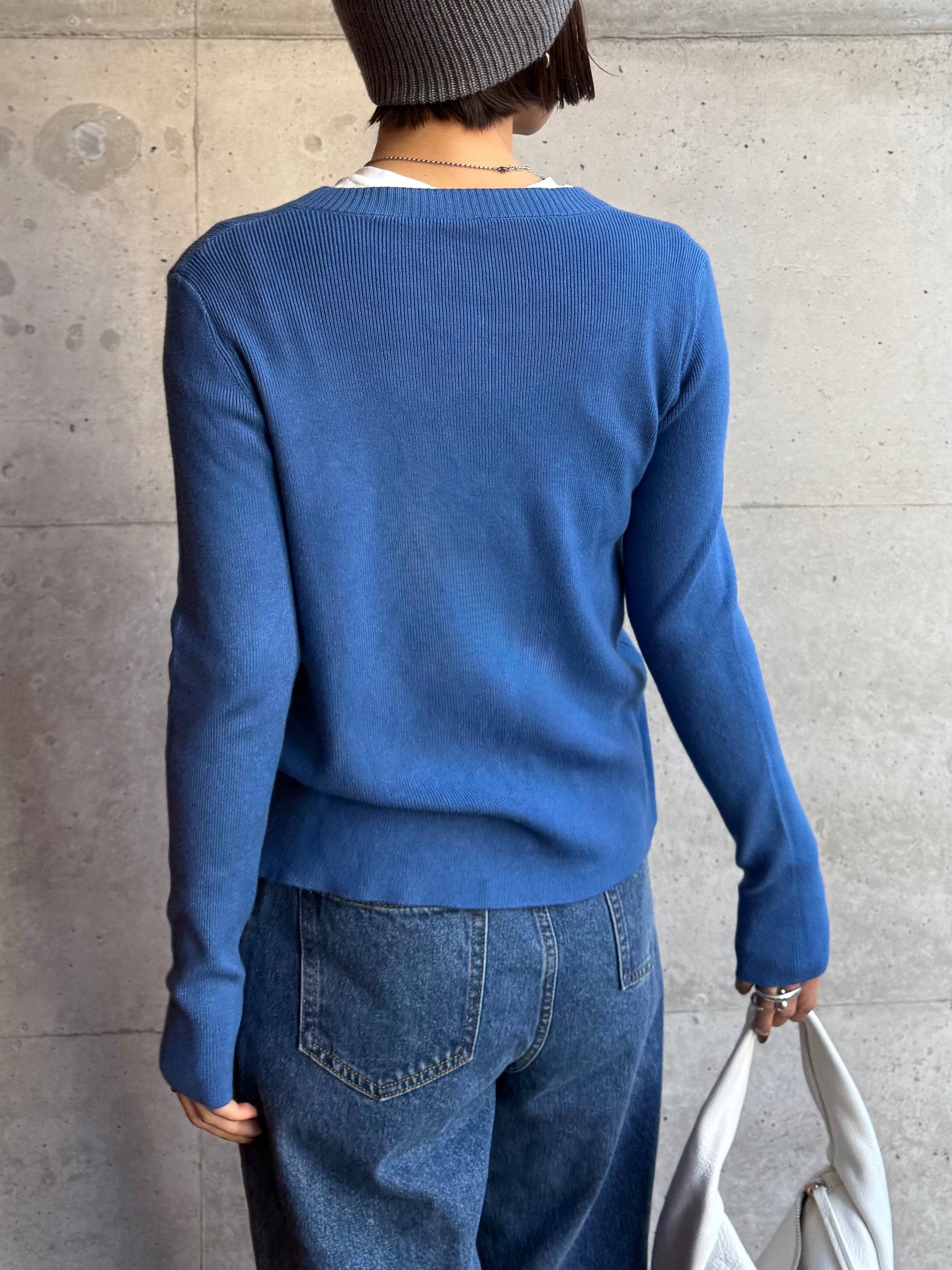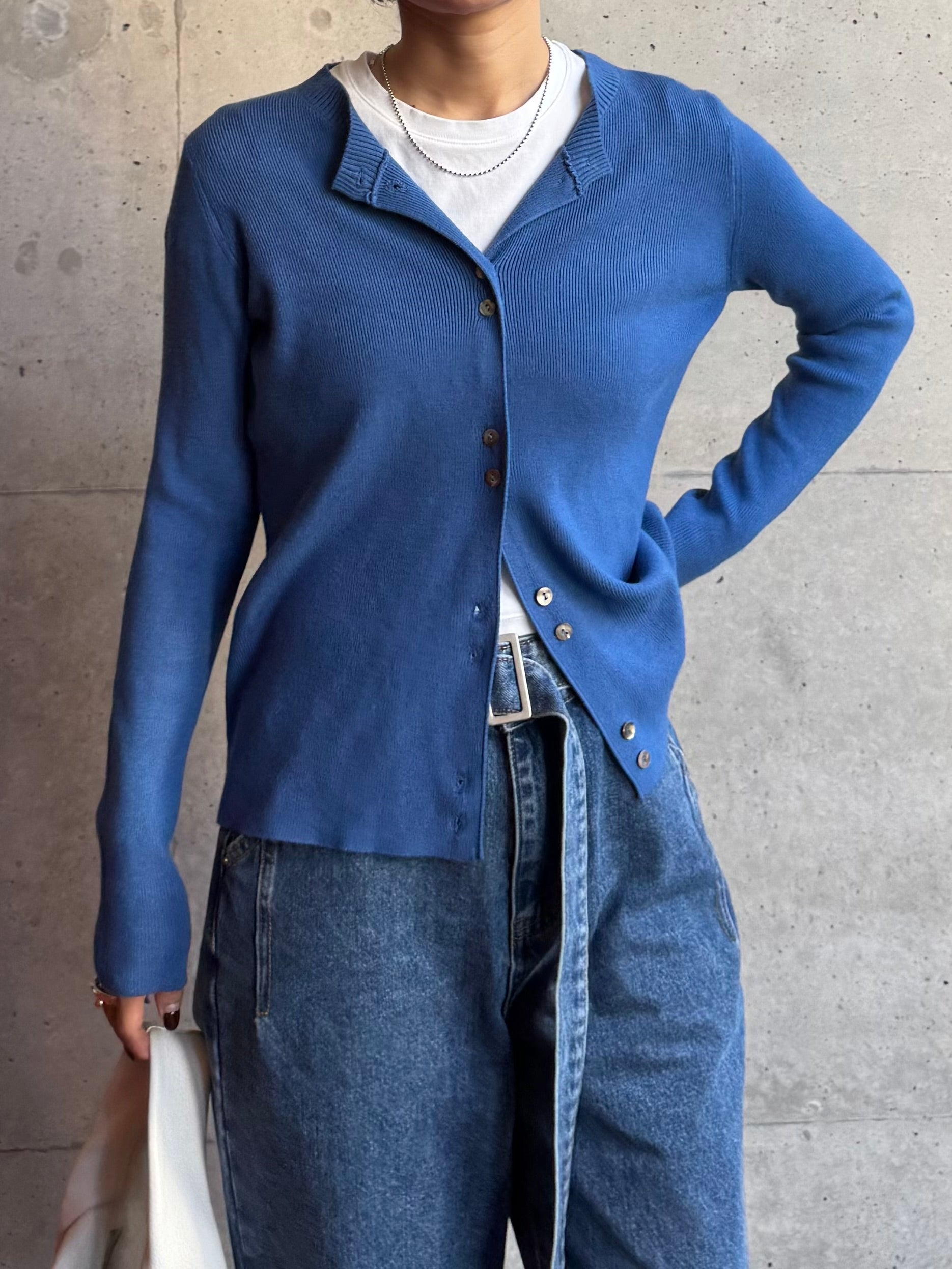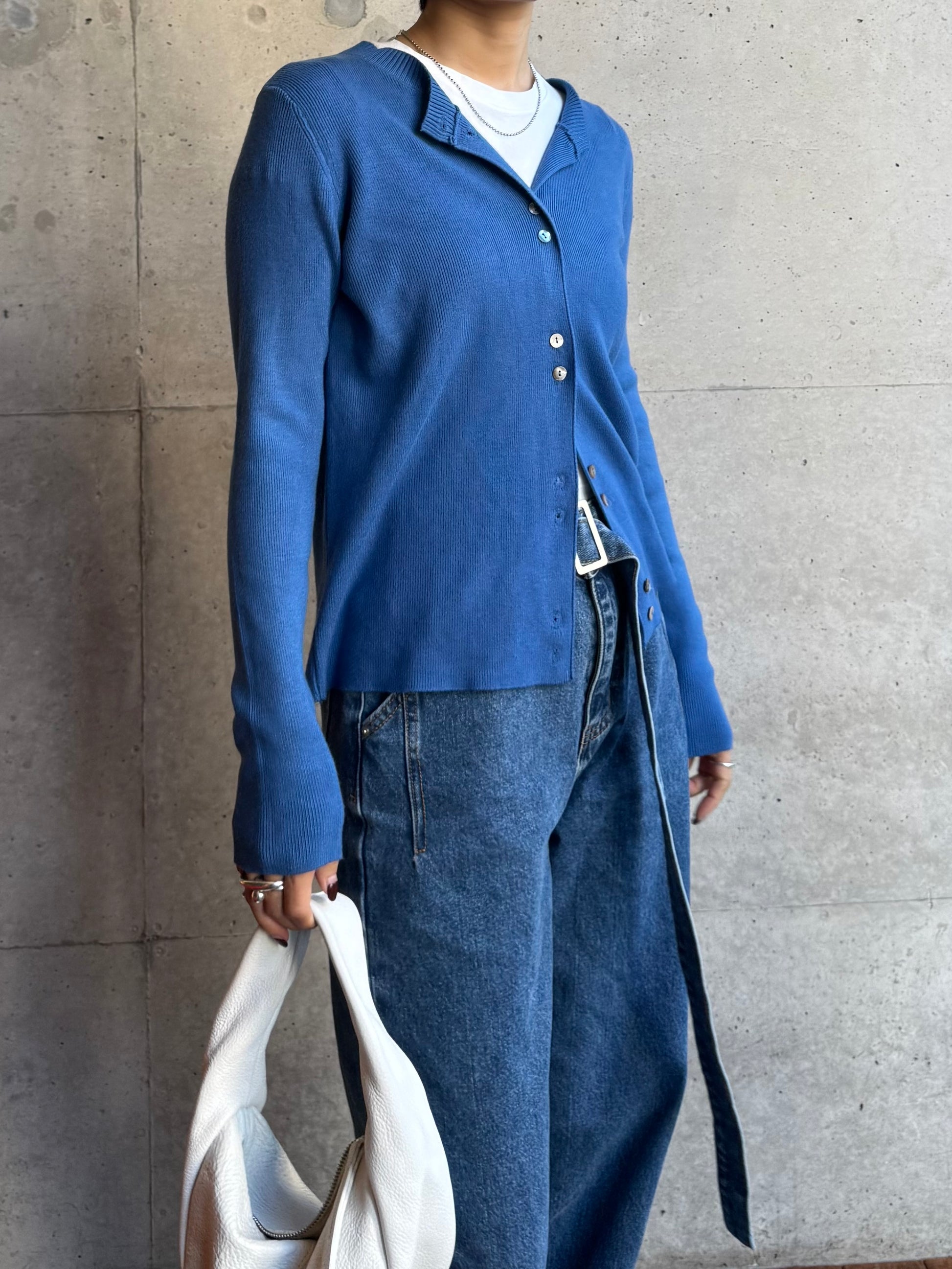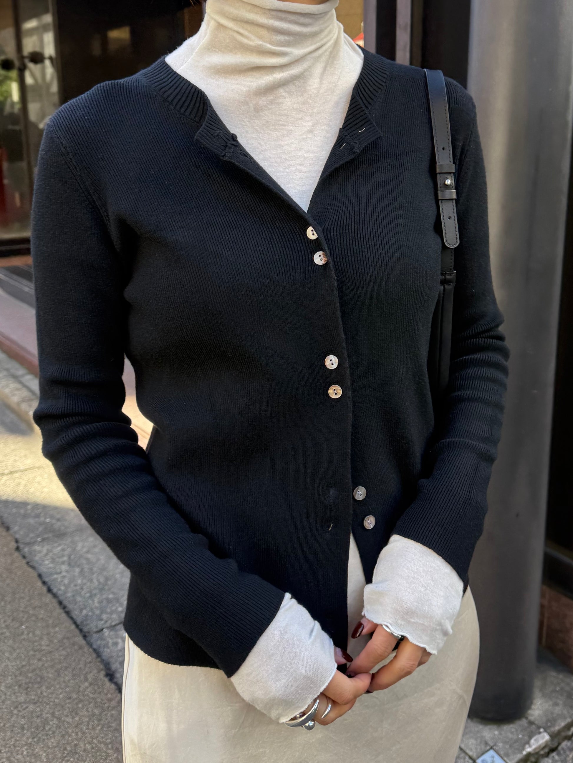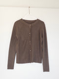 しなやかな伸縮性があり、身体にやさしく馴染む着心地の良いニットカーディガン。 軽やかな着用感で、春先の気温差にも対応しやすい一枚です。 全体に施された細めのリブ編みが、縦のラインを強調し、すっきりとした印象に◎ 柔らかさの中に程よいフィット感があり、長時間の着用でもストレスを感じにくいのも魅力です。 フロントには上品な光沢感のあるシェル素材のボタンを使用し、春らしい軽さとさりげない華やかさをプラス。 カットソーやタートルとのレイヤードもしやすく、ボタンを留めてトップス感覚でも、羽織りとしても活躍します。 装いが軽くなるこれからの季節に、デイリーに取り入れやすいアイテムです。