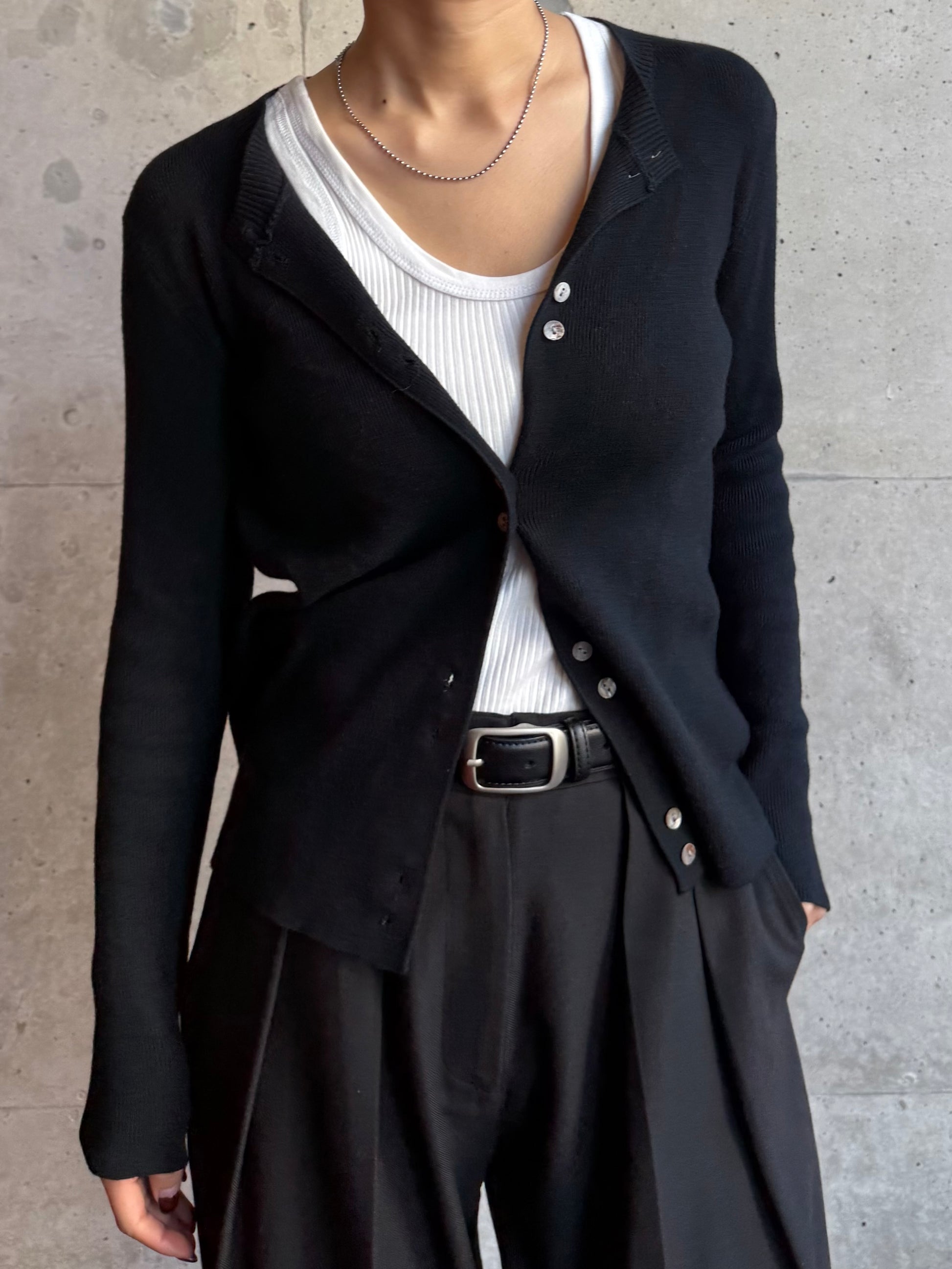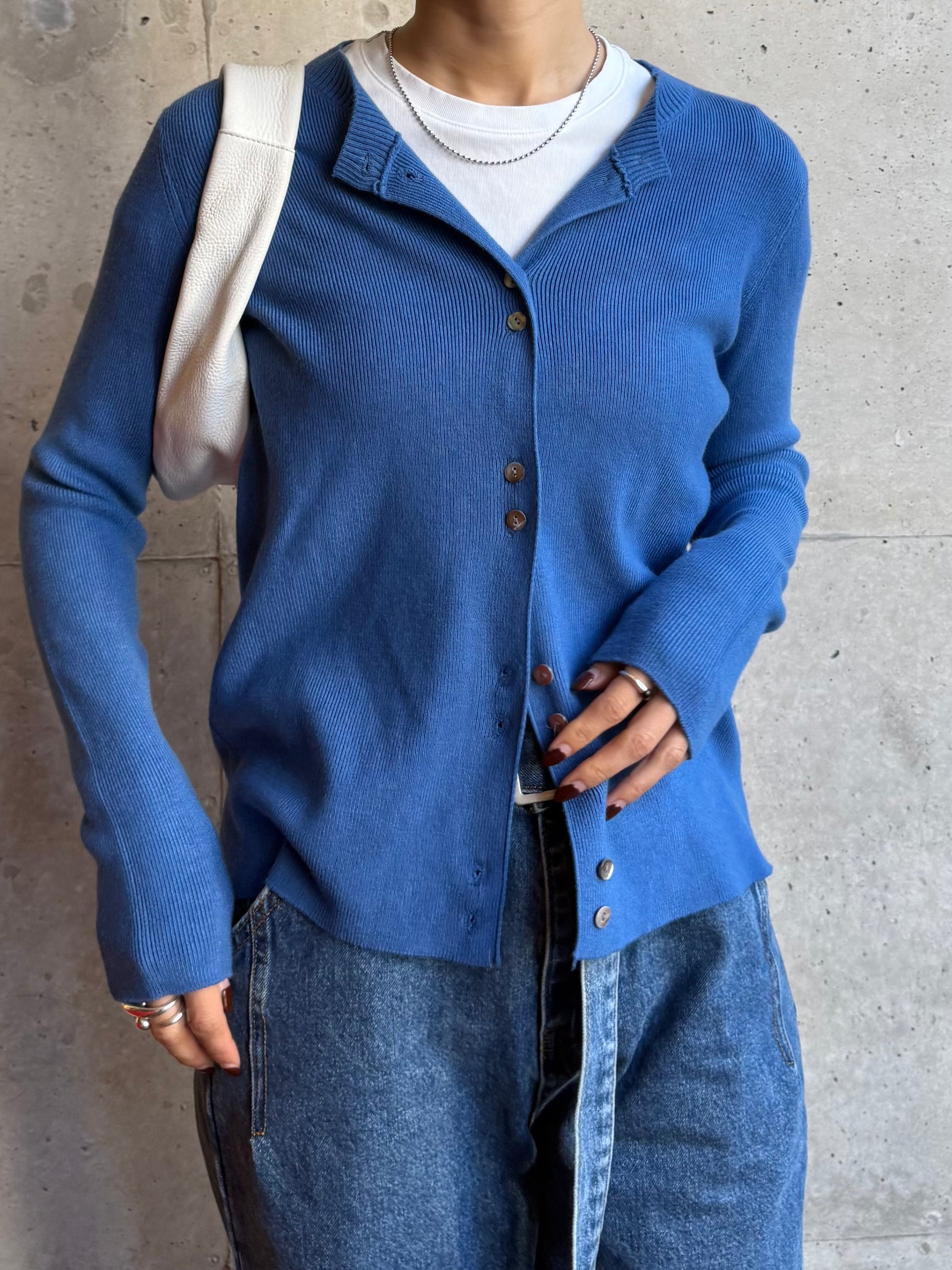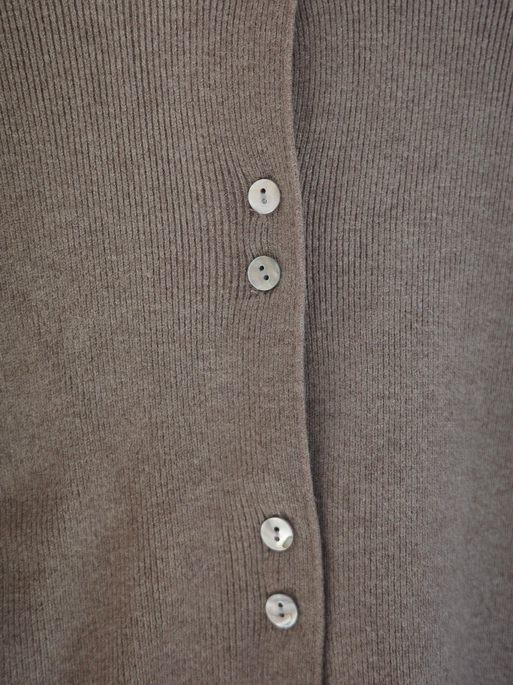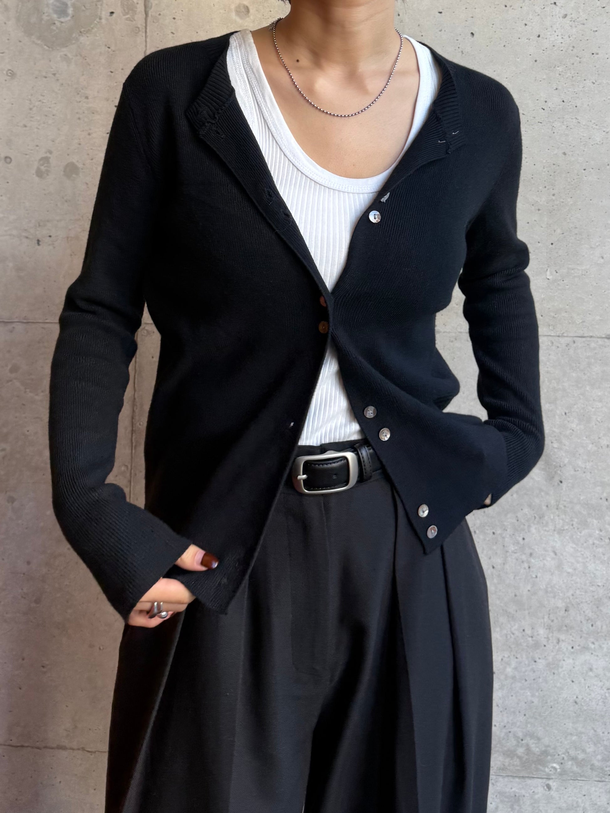 しなやかな伸縮性があり、身体にやさしく馴染む着心地の良いニットカーディガン。 軽やかな着用感で、春先の気温差にも対応しやすい一枚です。 全体に施された細めのリブ編みが、縦のラインを強調し、すっきりとした印象に◎ 柔らかさの中に程よいフィット感があり、長時間の着用でもストレスを感じにくいのも魅力です。 フロントには上品な光沢感のあるシェル素材のボタンを使用し、春らしい軽さとさりげない華やかさをプラス。 カットソーやタートルとのレイヤードもしやすく、ボタンを留めてトップス感覚でも、羽織りとしても活躍します。 装いが軽くなるこれからの季節に、デイリーに取り入れやすいアイテムです。