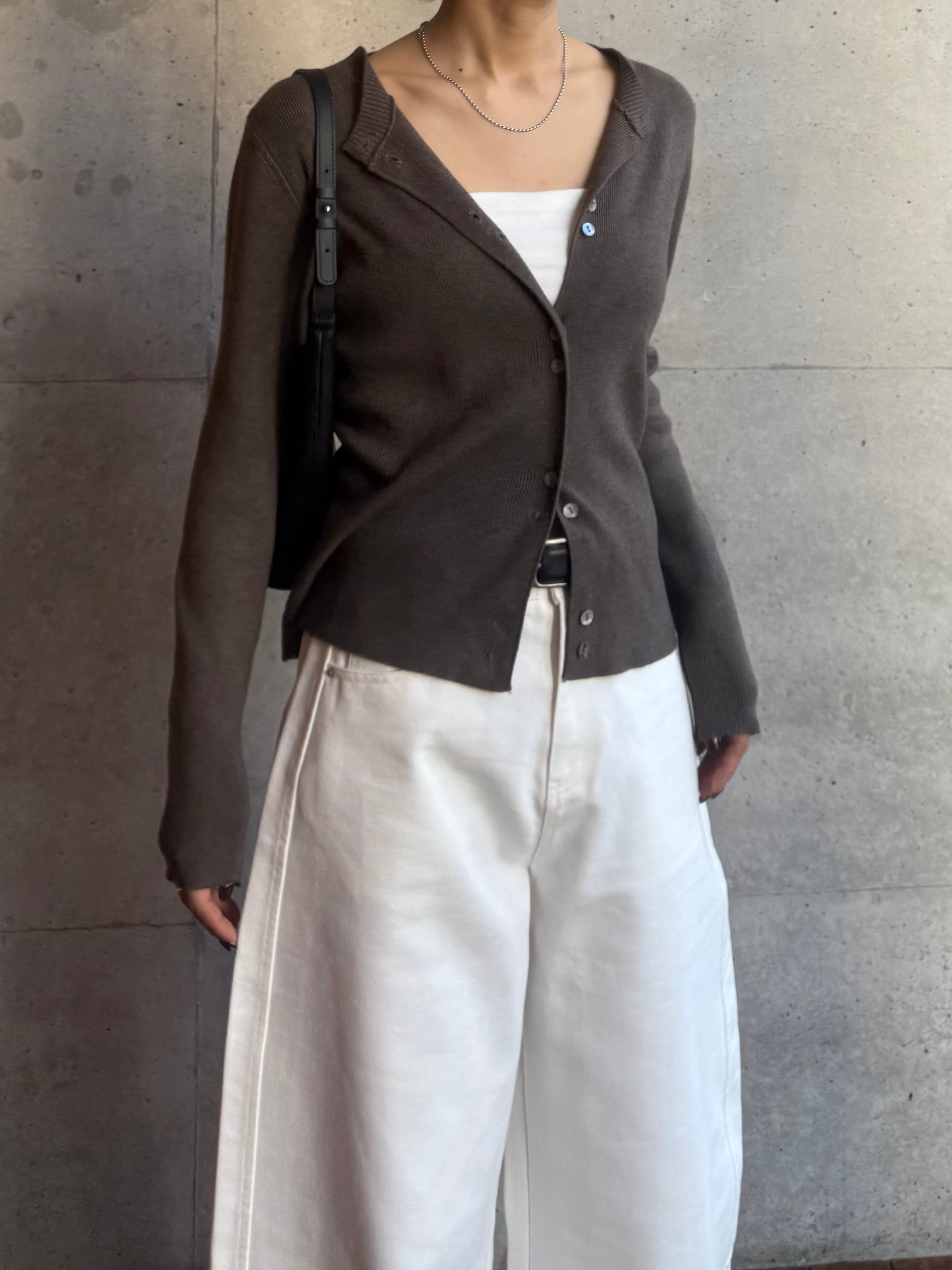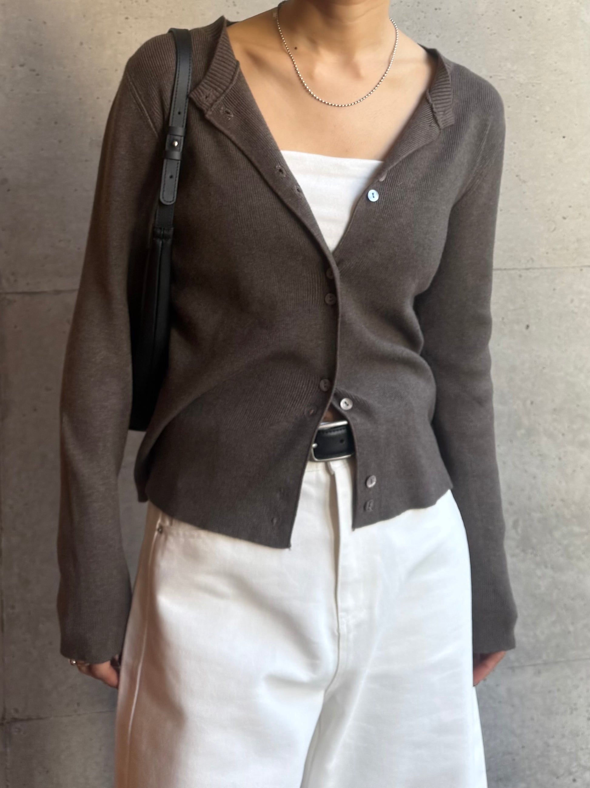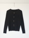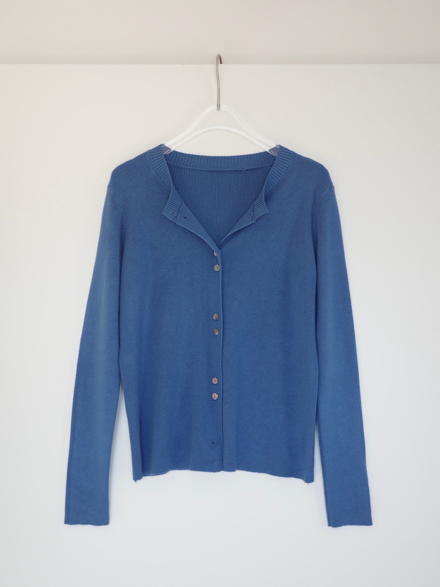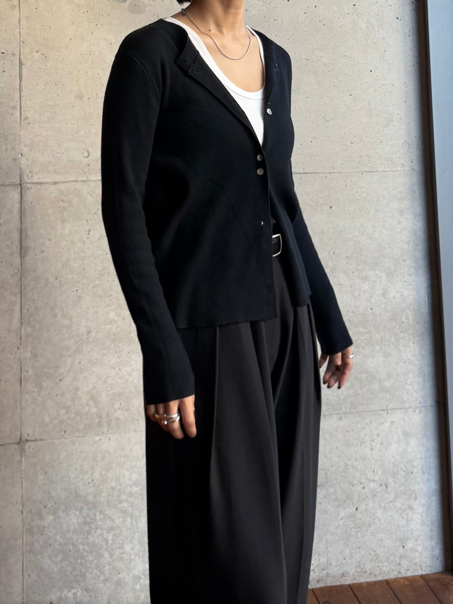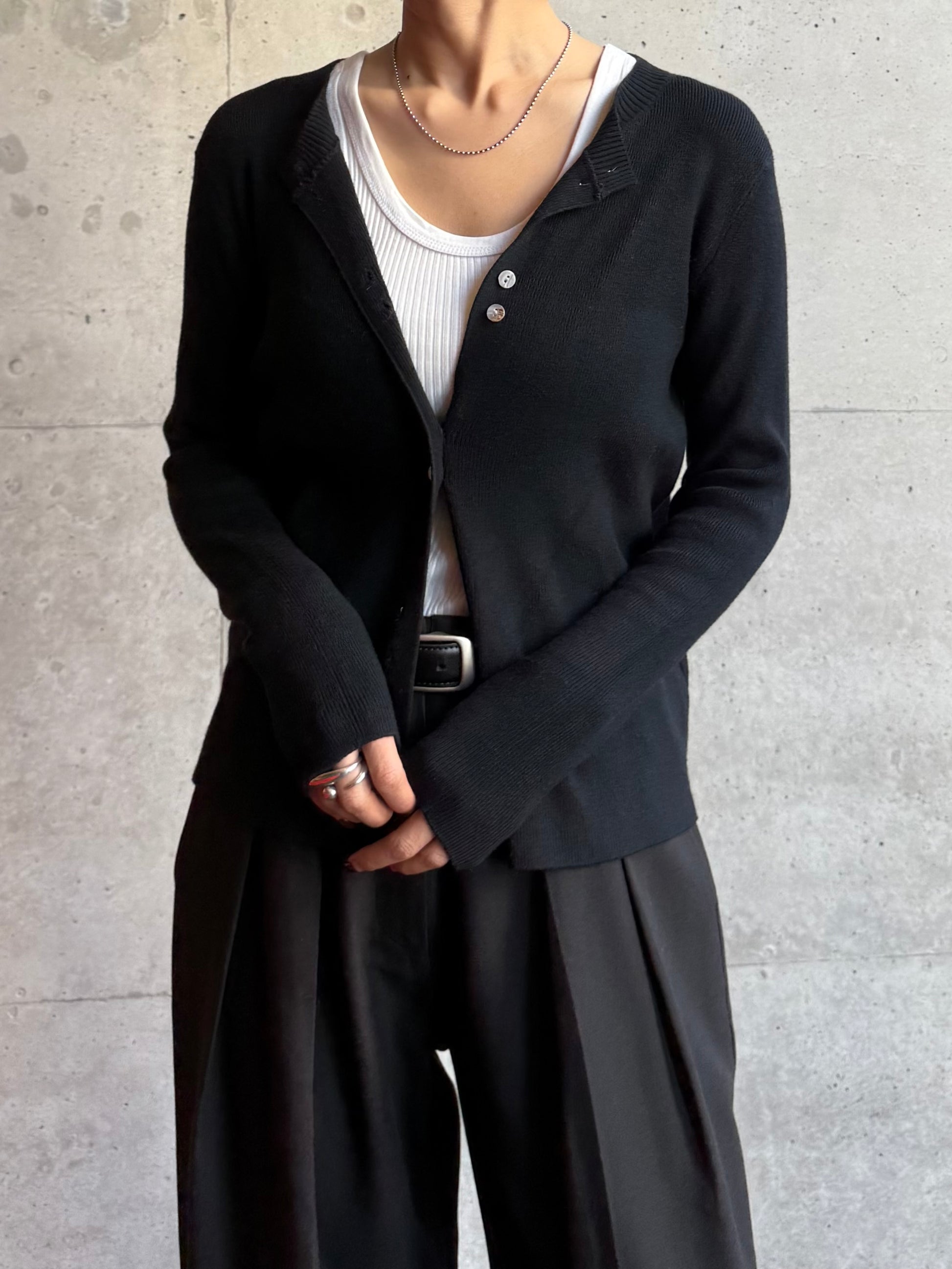 しなやかな伸縮性があり、身体にやさしく馴染む着心地の良いニットカーディガン。 軽やかな着用感で、春先の気温差にも対応しやすい一枚です。 全体に施された細めのリブ編みが、縦のラインを強調し、すっきりとした印象に◎ 柔らかさの中に程よいフィット感があり、長時間の着用でもストレスを感じにくいのも魅力です。 フロントには上品な光沢感のあるシェル素材のボタンを使用し、春らしい軽さとさりげない華やかさをプラス。 カットソーやタートルとのレイヤードもしやすく、ボタンを留めてトップス感覚でも、羽織りとしても活躍します。 装いが軽くなるこれからの季節に、デイリーに取り入れやすいアイテムです。