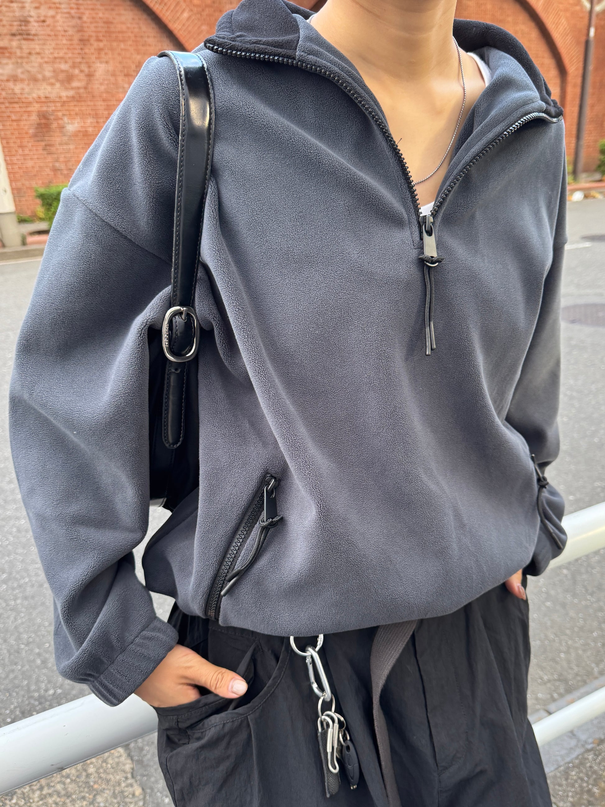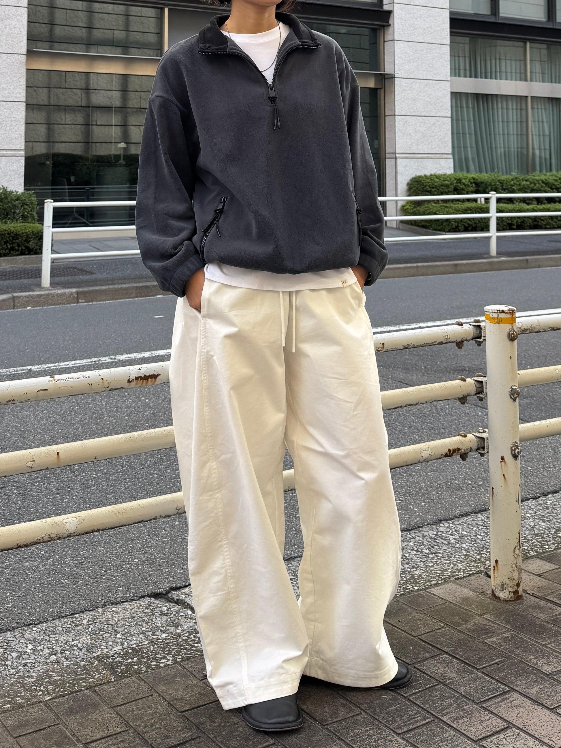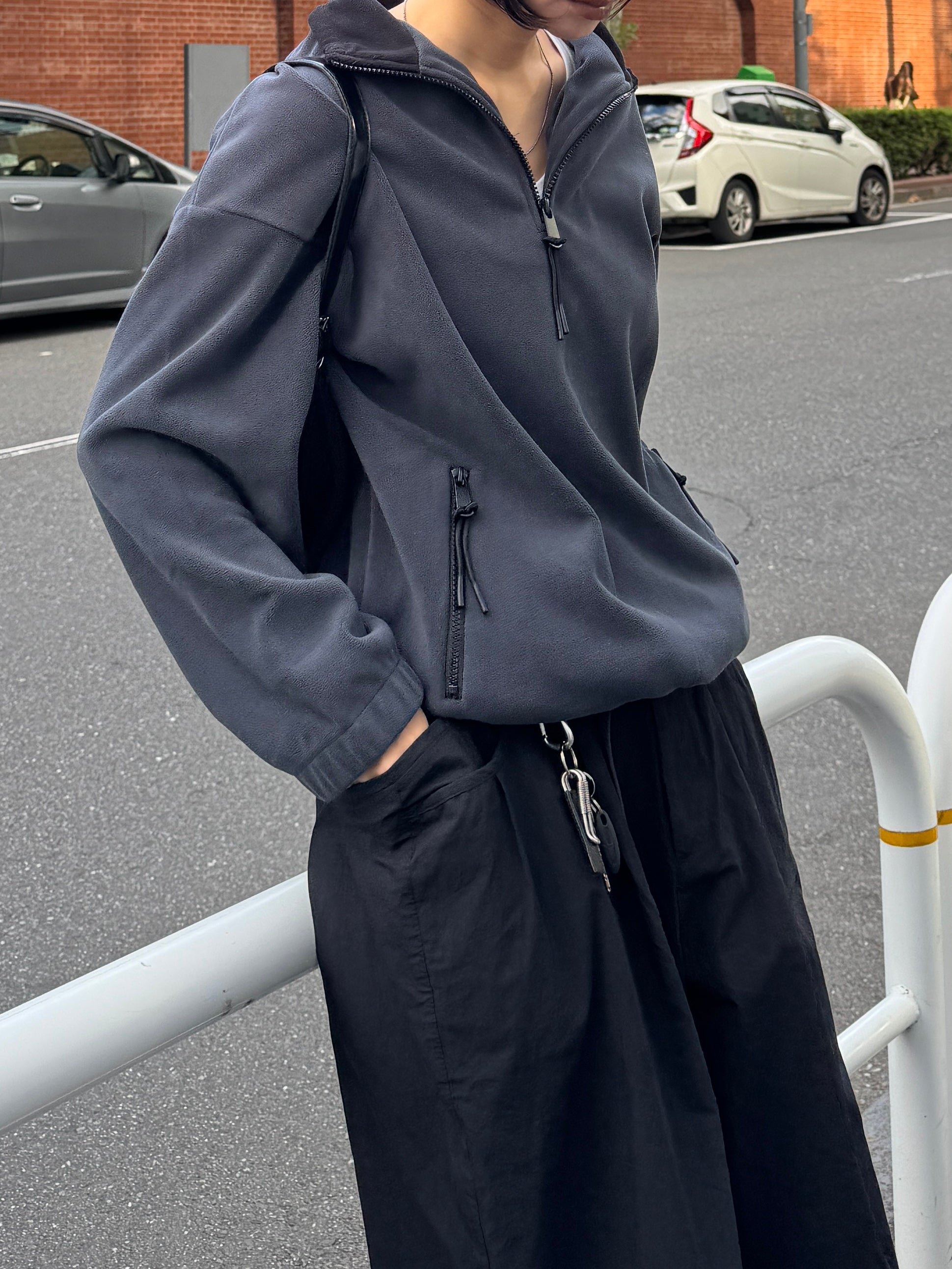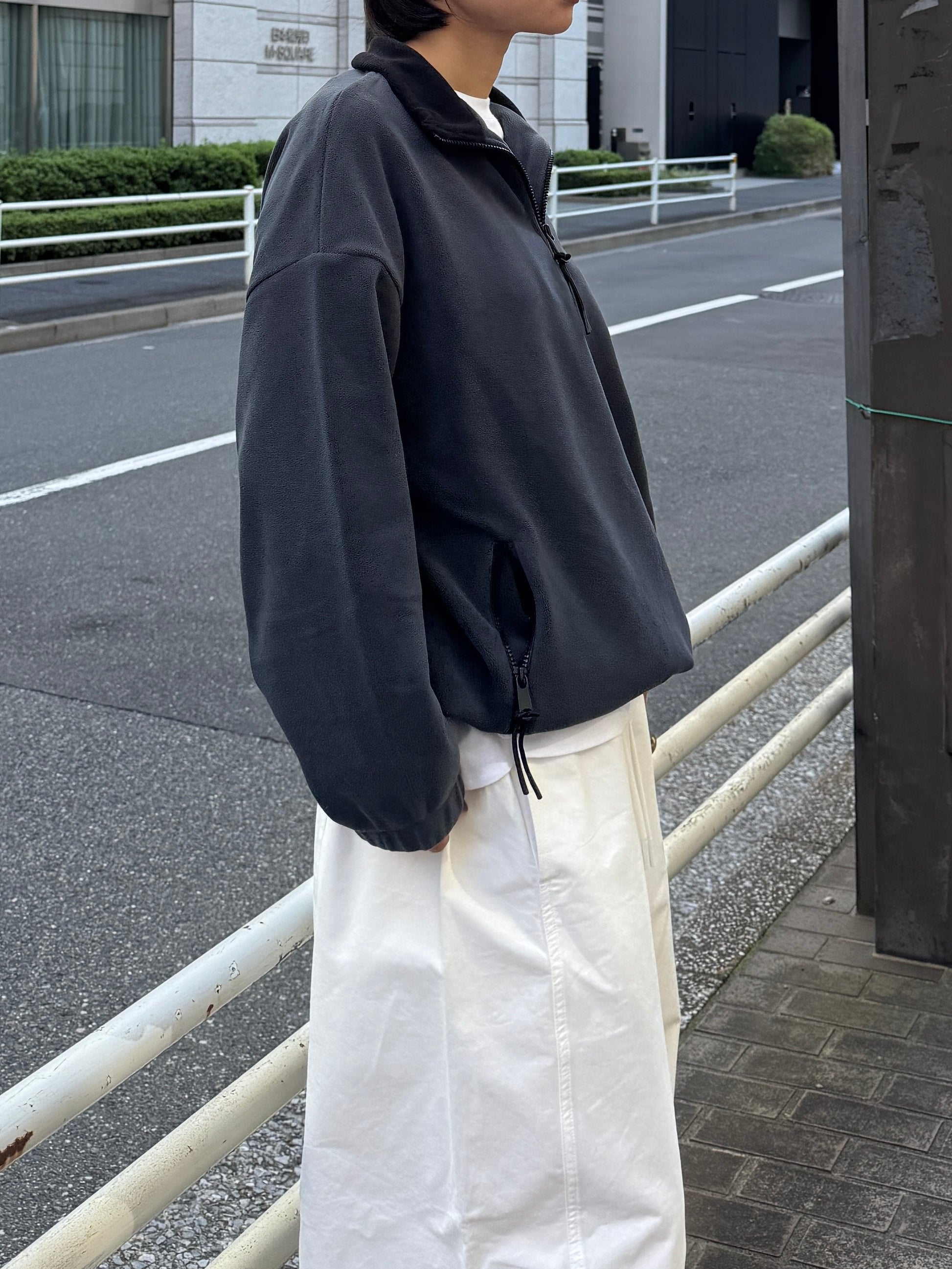 やわらかな温もりと軽やかな着心地が魅力の、ハーフジップフリースプルオーバー。 マットな質感と滑らかな肌触りが特徴のフリース素材は、程よい厚みでデイリーに着やすく 秋冬シーズンの羽織りにもインナー使いにも活躍してくれます。 襟元のハーフジップは開け方次第で表情を変えられ、インナーを覗かせることでスタイリングに奥行き感をプラス。 ジップの先端にはさりげないコード付きで、カジュアルながらも上品にまとまるデザインに仕上げました。 裾のドロストを絞ればバランスの良い丸みシルエットになり、幅広いボトムスと相性◎ 全体的に無駄のないシンプルなデザインながら、素材の表情とシルエットで大人のこなれ感を演出してくれる1枚です。