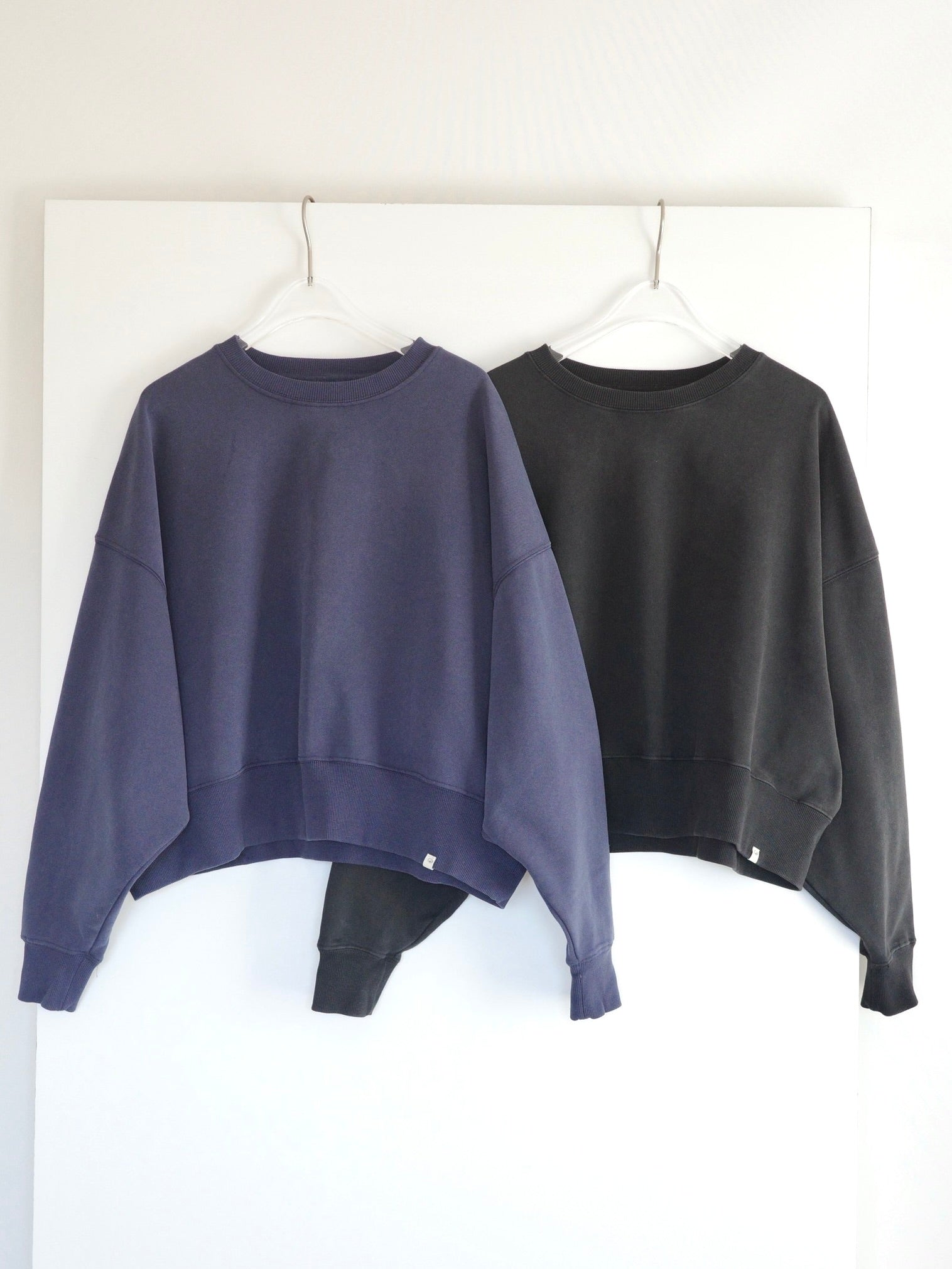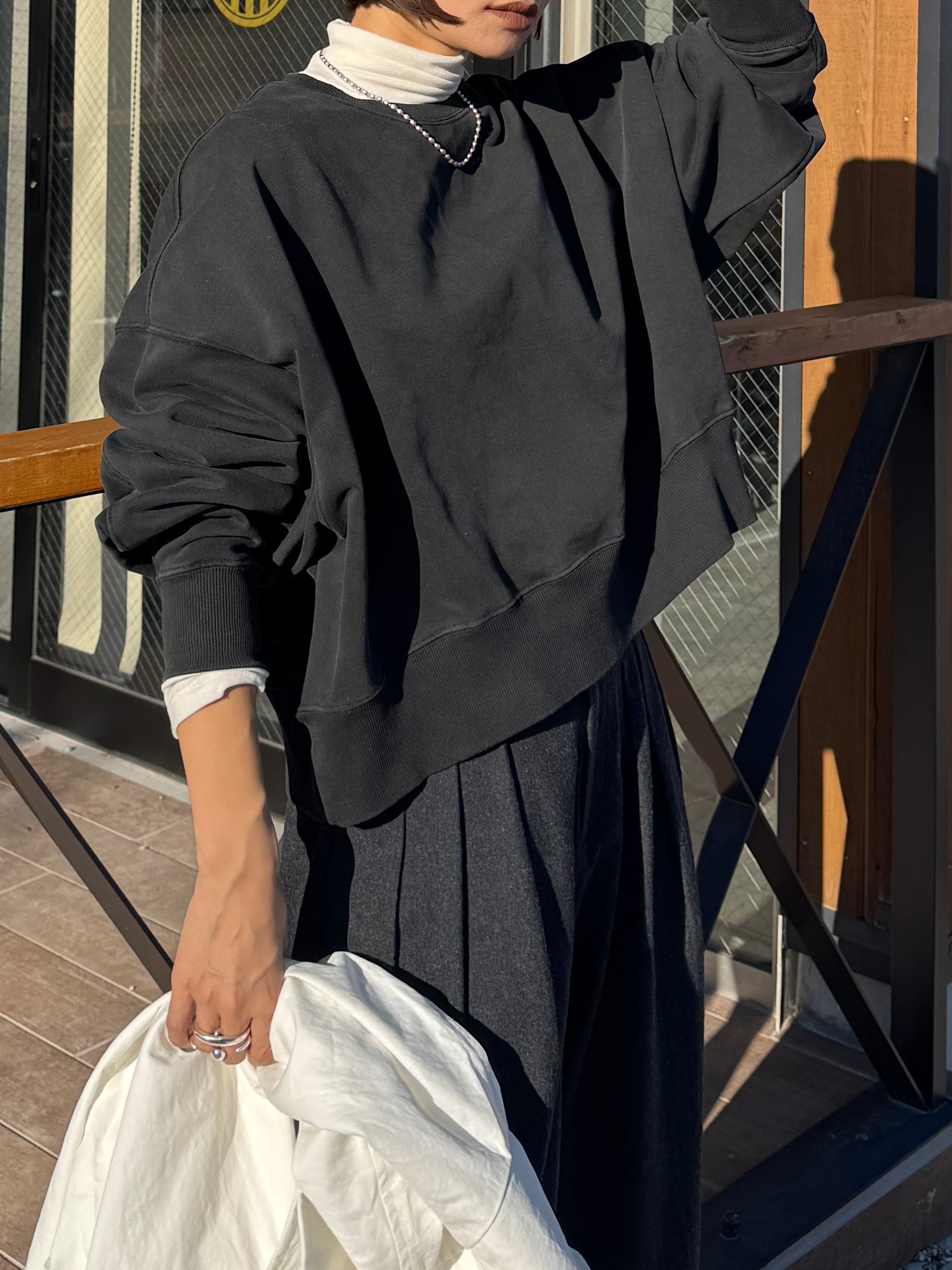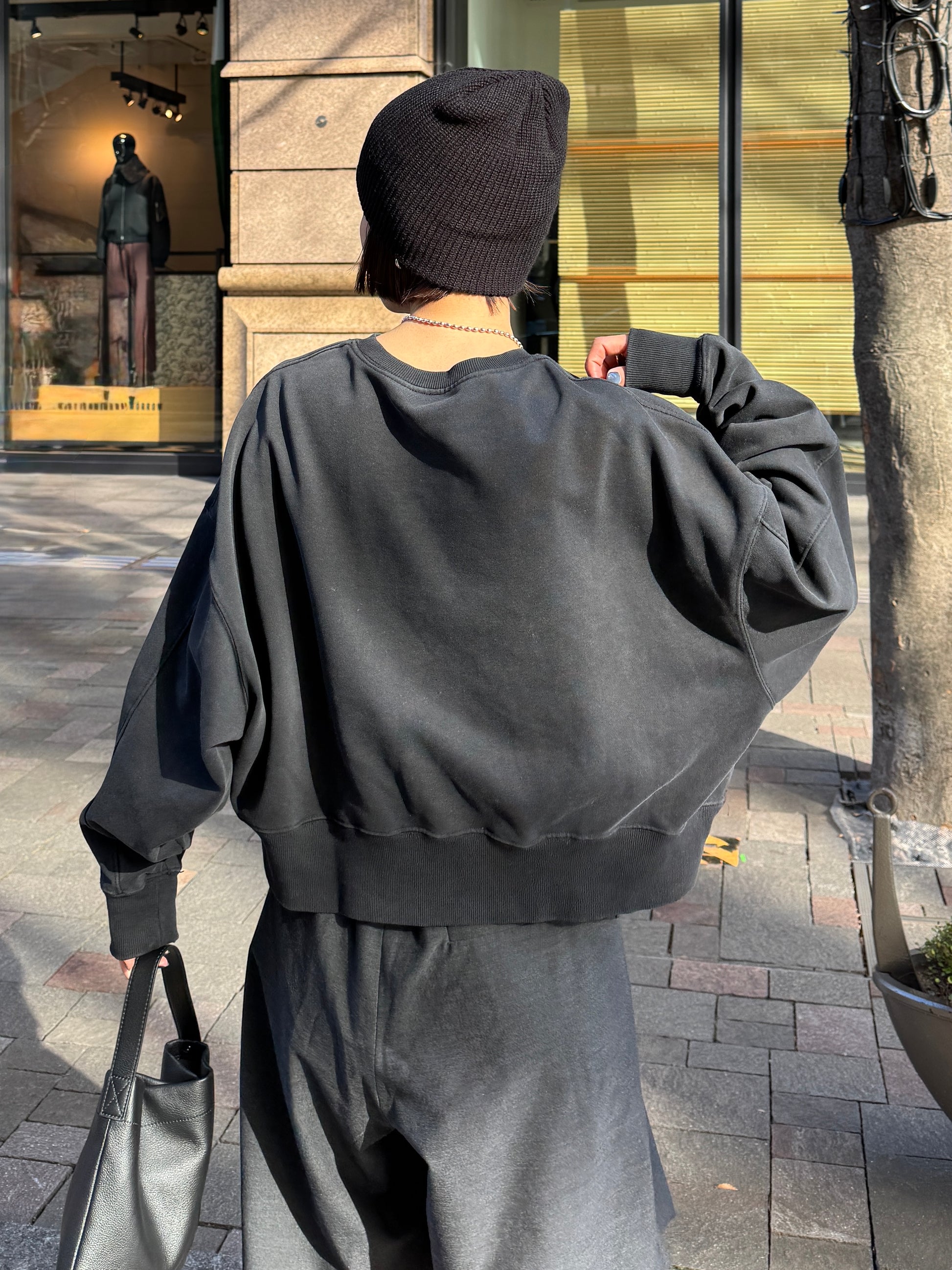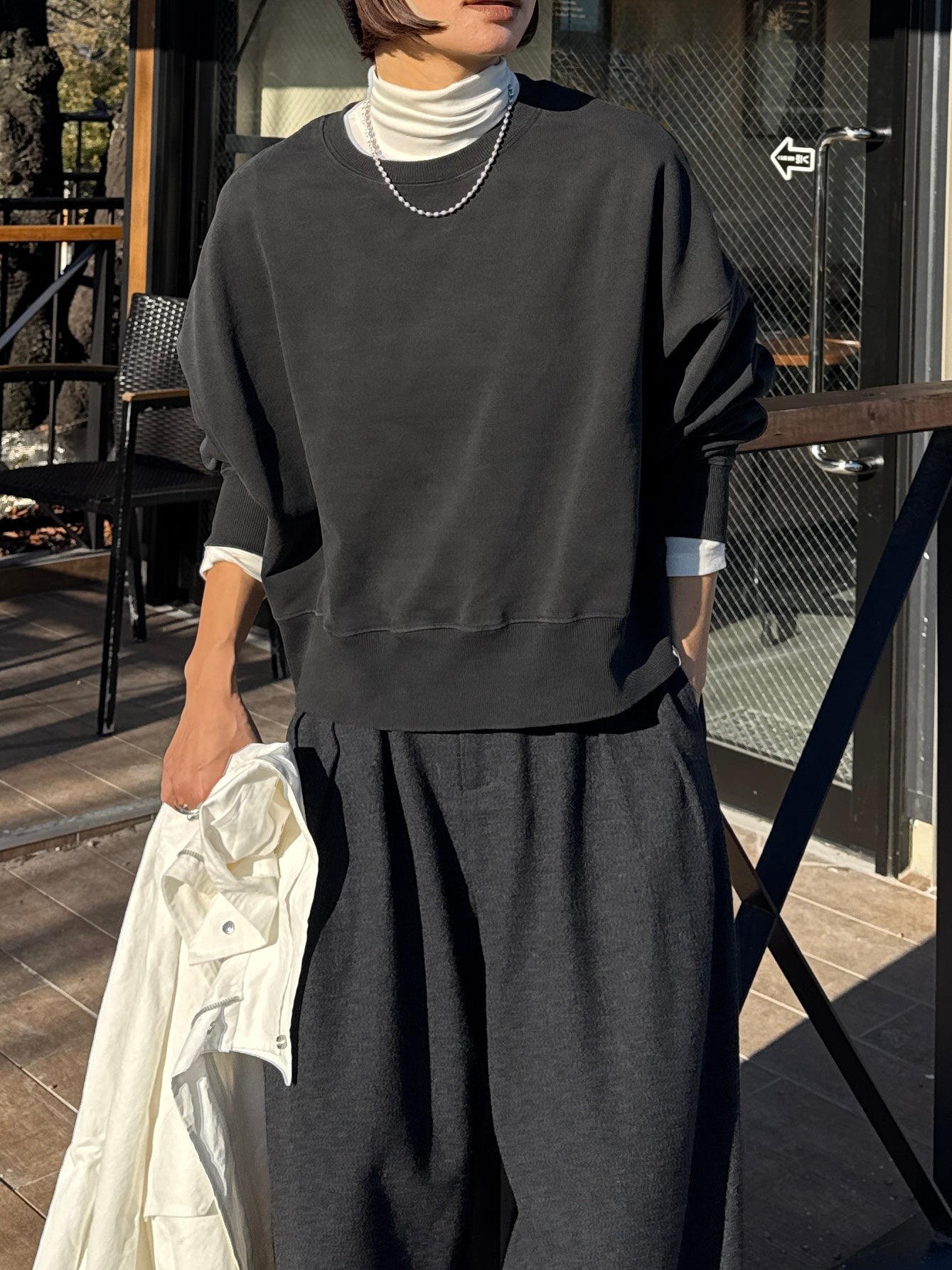 程よいショート丈と、立体感のあるシルエットが魅力のスウェットトップス。 肩まわりから袖にかけてゆとりを持たせたデザインで自然に丸みのあるフォルムが生まれ、ラフになりすぎず大人のカジュアルスタイルに馴染みます。 身頃と裾のリブ部分は切り替え位置にこだわり、シンプルながらもさりげないデザインアクセントに。 程よく色落ちさせたヴィンテージライクなウォッシュ加工を施し、こなれ感のある表情に仕上げているのもポイント。 インナーとのレイヤードで季節の変わり目にも幅広く活躍する1枚。