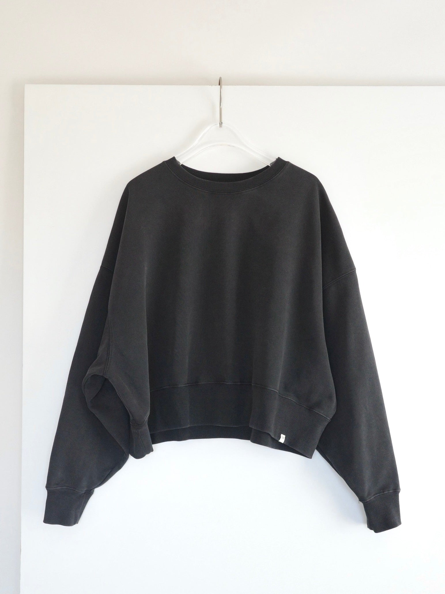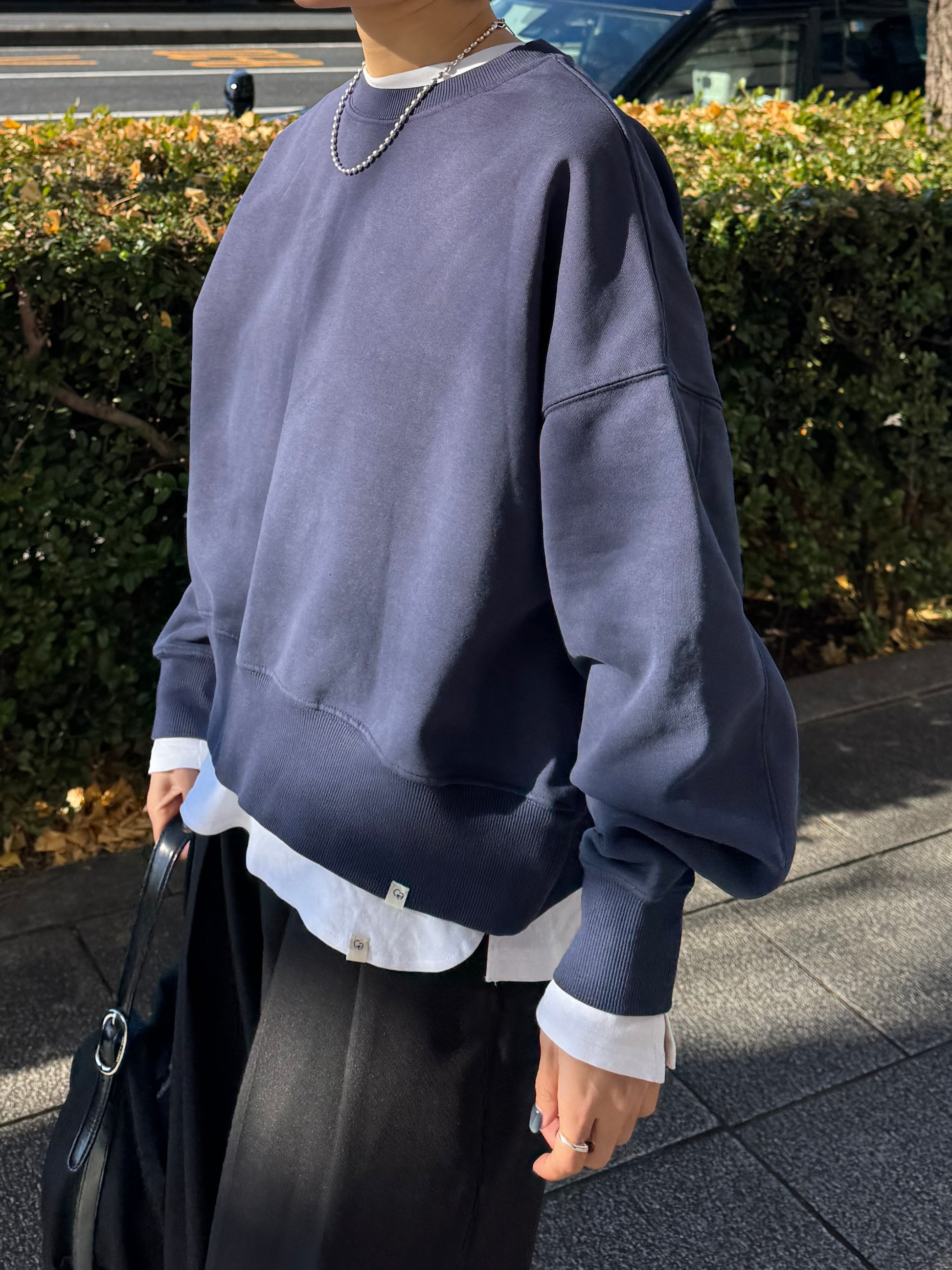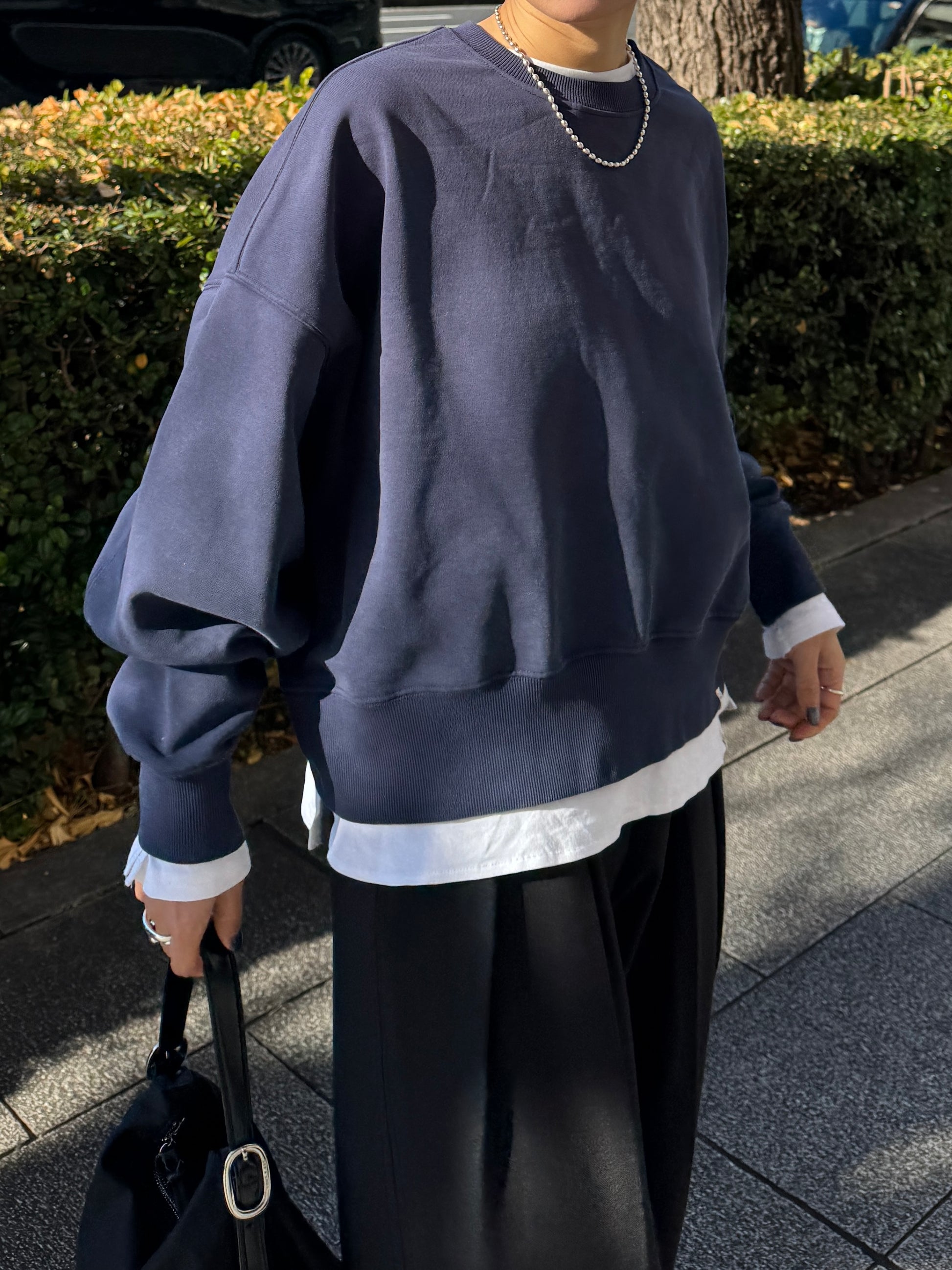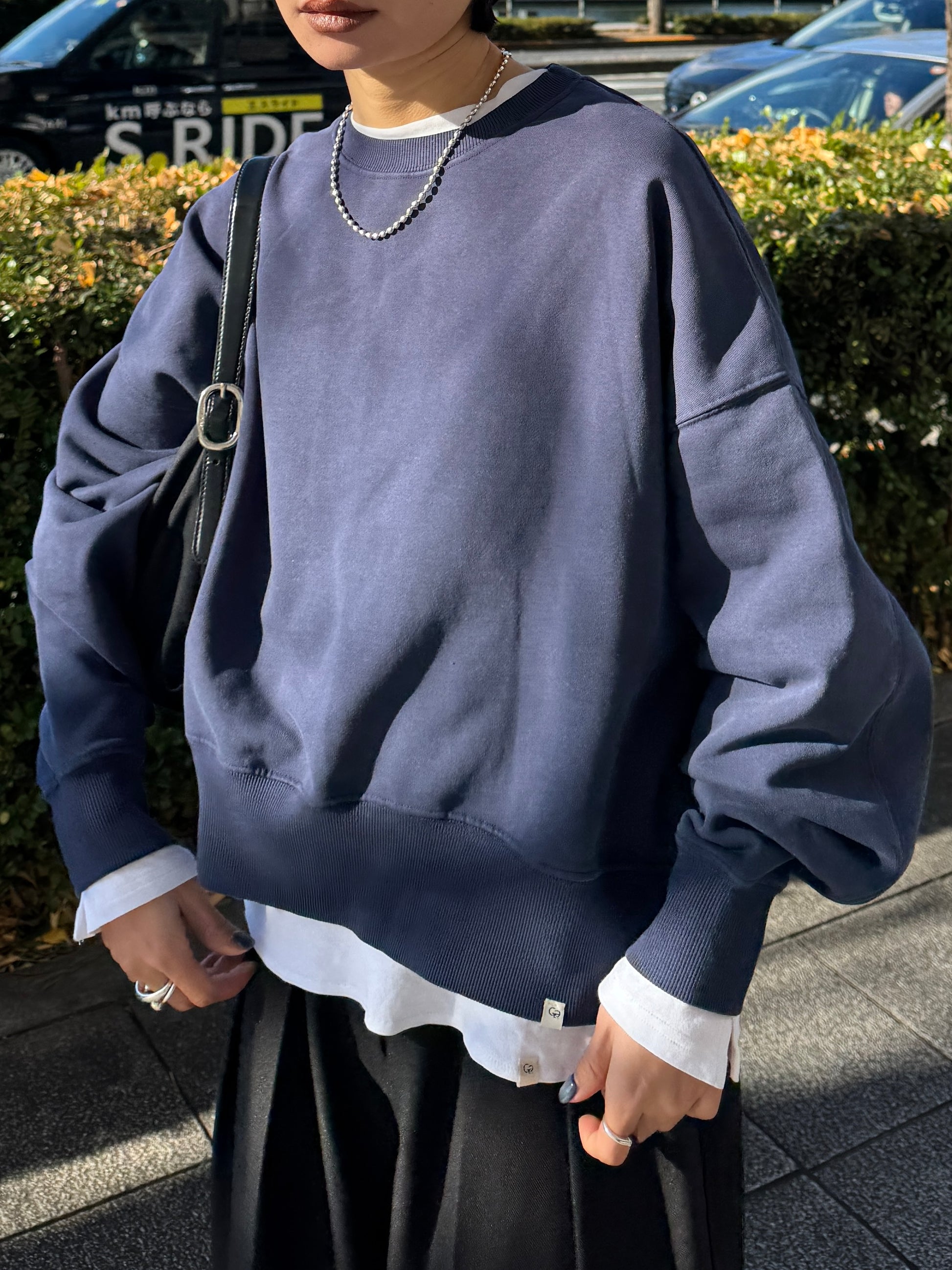 程よいショート丈と、立体感のあるシルエットが魅力のスウェットトップス。 肩まわりから袖にかけてゆとりを持たせたデザインで自然に丸みのあるフォルムが生まれ、ラフになりすぎず大人のカジュアルスタイルに馴染みます。 身頃と裾のリブ部分は切り替え位置にこだわり、シンプルながらもさりげないデザインアクセントに。 程よく色落ちさせたヴィンテージライクなウォッシュ加工を施し、こなれ感のある表情に仕上げているのもポイント。 インナーとのレイヤードで季節の変わり目にも幅広く活躍する1枚。