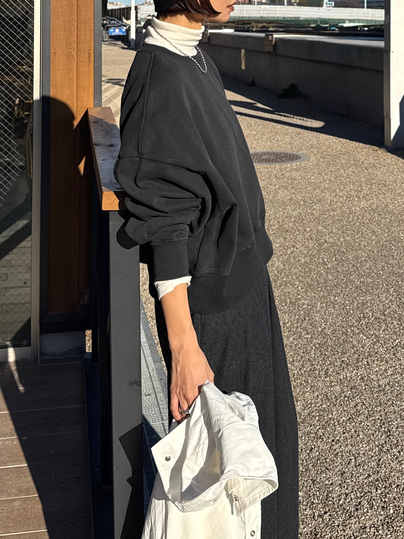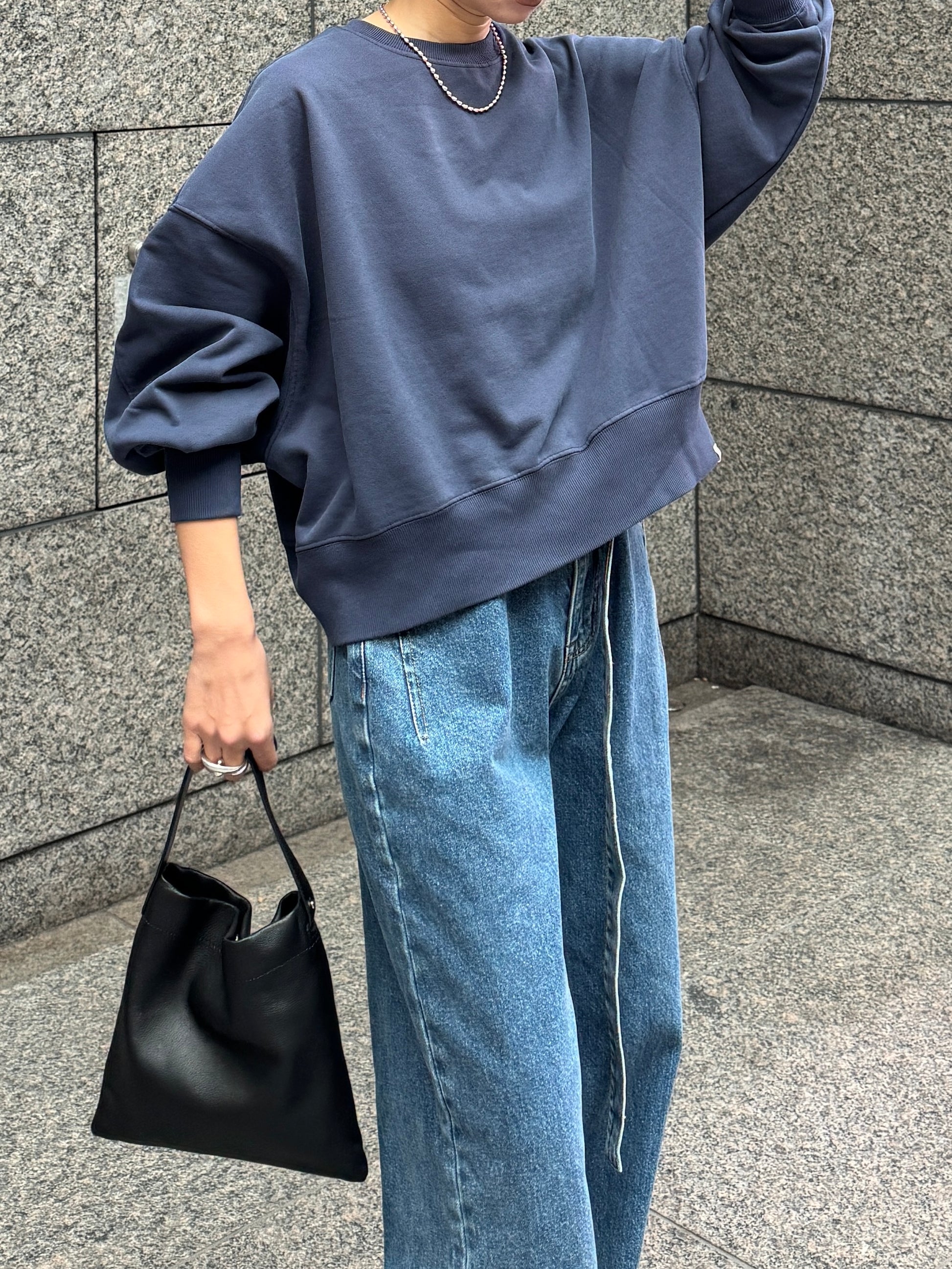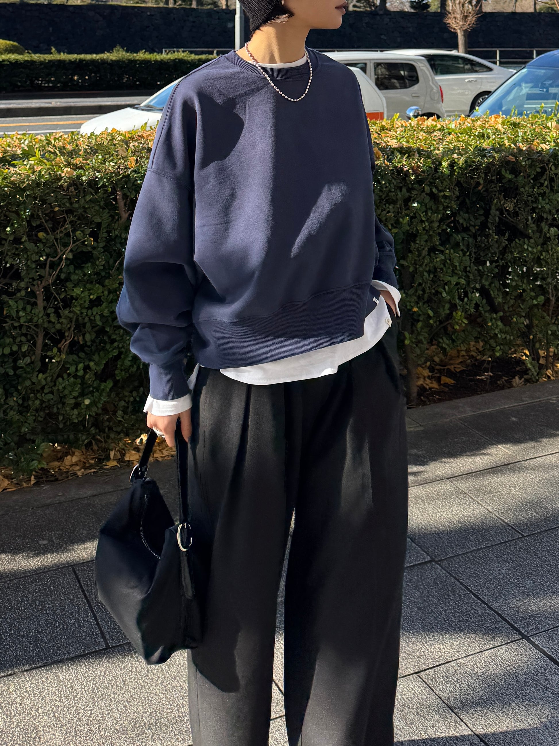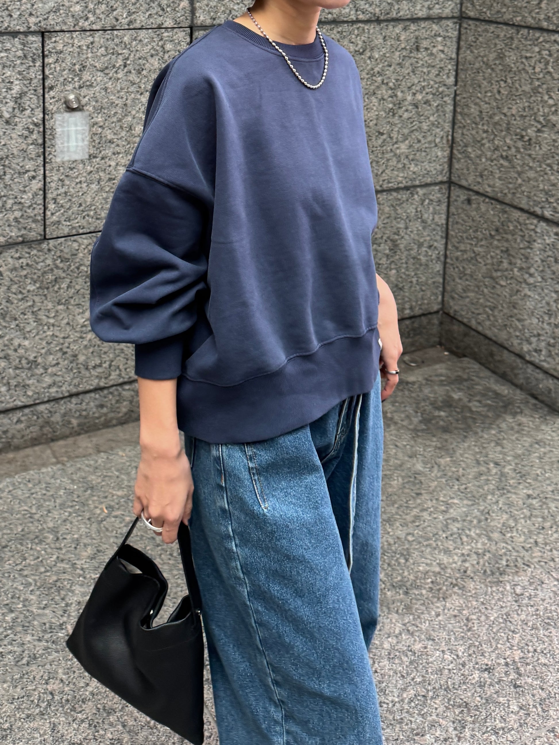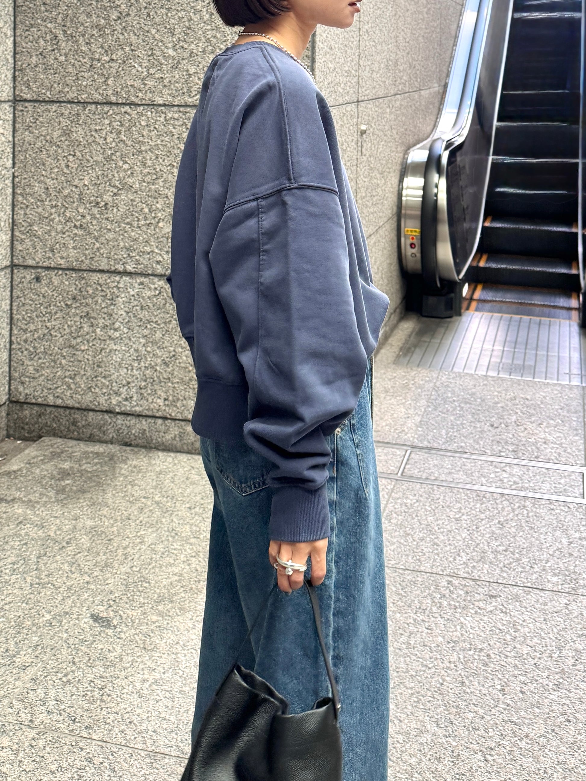 程よいショート丈と、立体感のあるシルエットが魅力のスウェットトップス。 肩まわりから袖にかけてゆとりを持たせたデザインで自然に丸みのあるフォルムが生まれ、ラフになりすぎず大人のカジュアルスタイルに馴染みます。 身頃と裾のリブ部分は切り替え位置にこだわり、シンプルながらもさりげないデザインアクセントに。 程よく色落ちさせたヴィンテージライクなウォッシュ加工を施し、こなれ感のある表情に仕上げているのもポイント。 インナーとのレイヤードで季節の変わり目にも幅広く活躍する1枚。