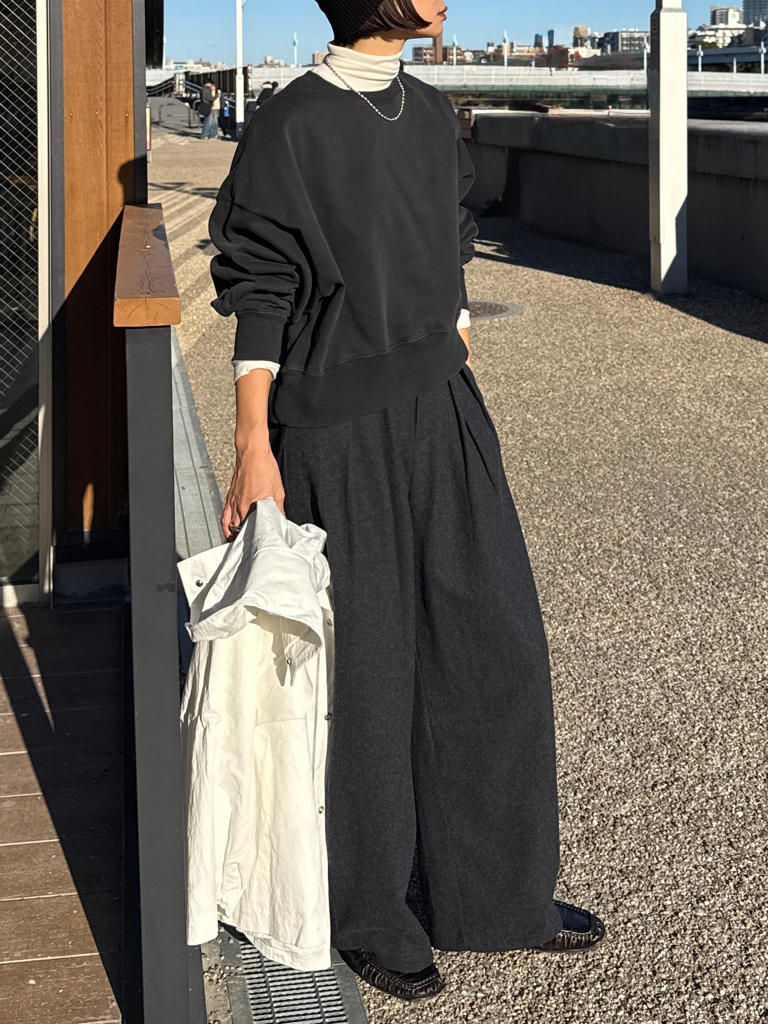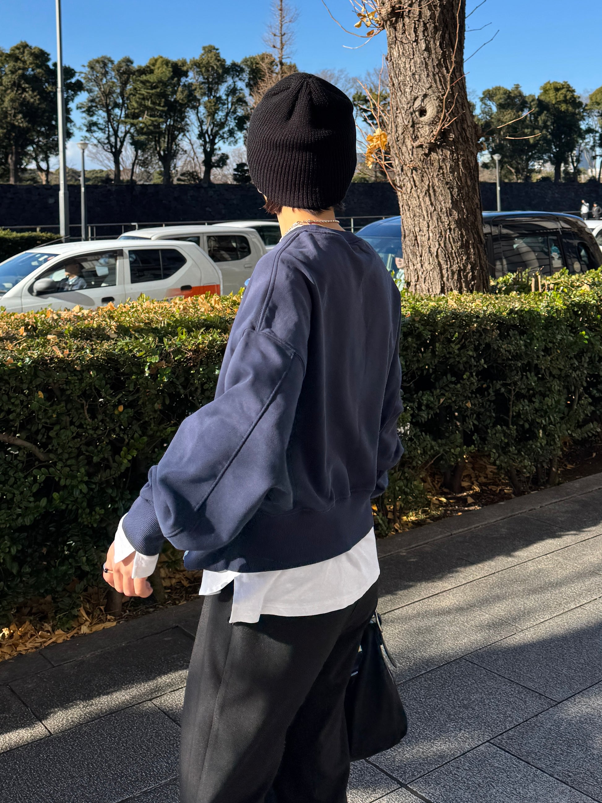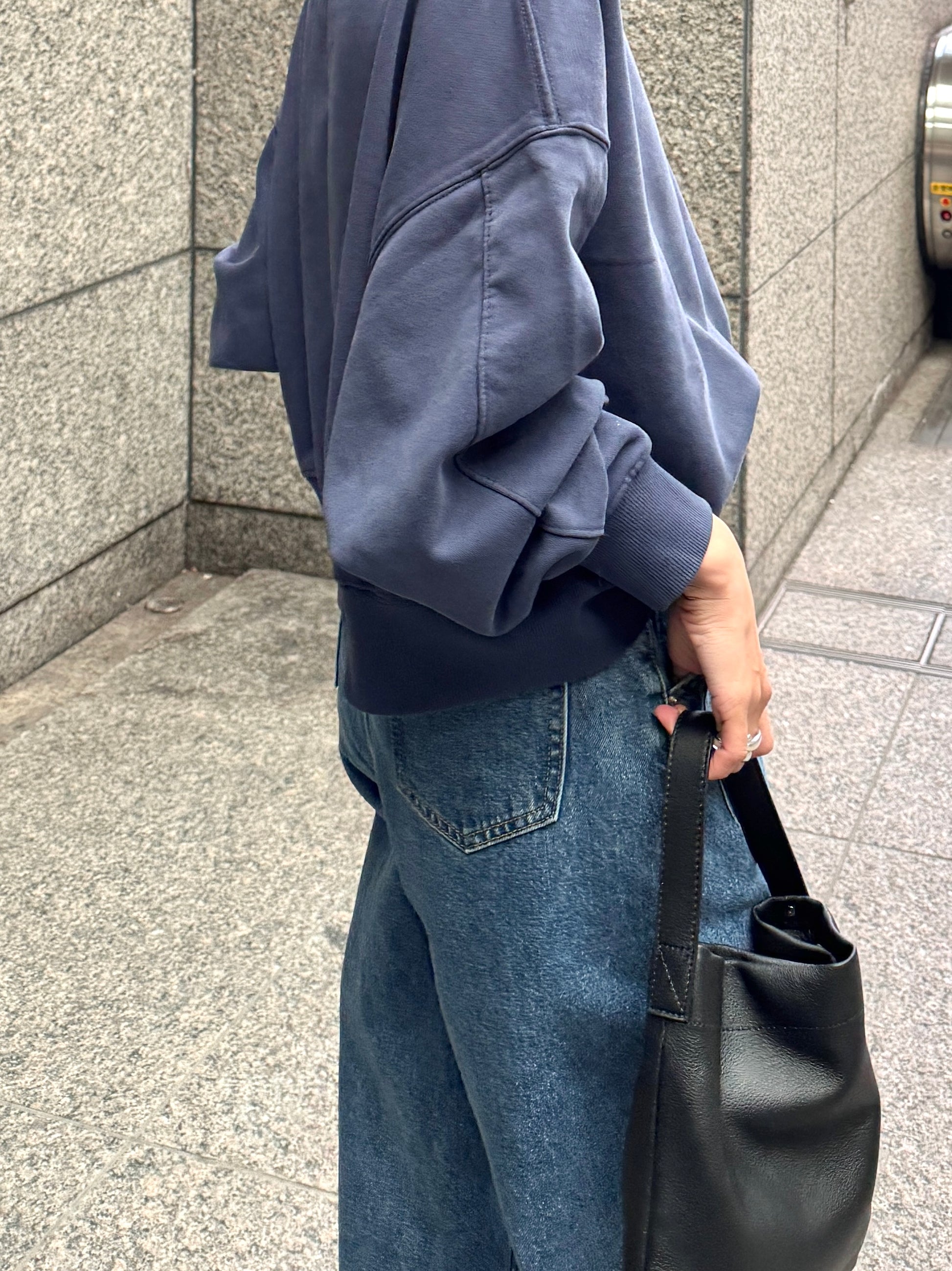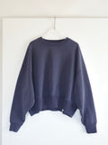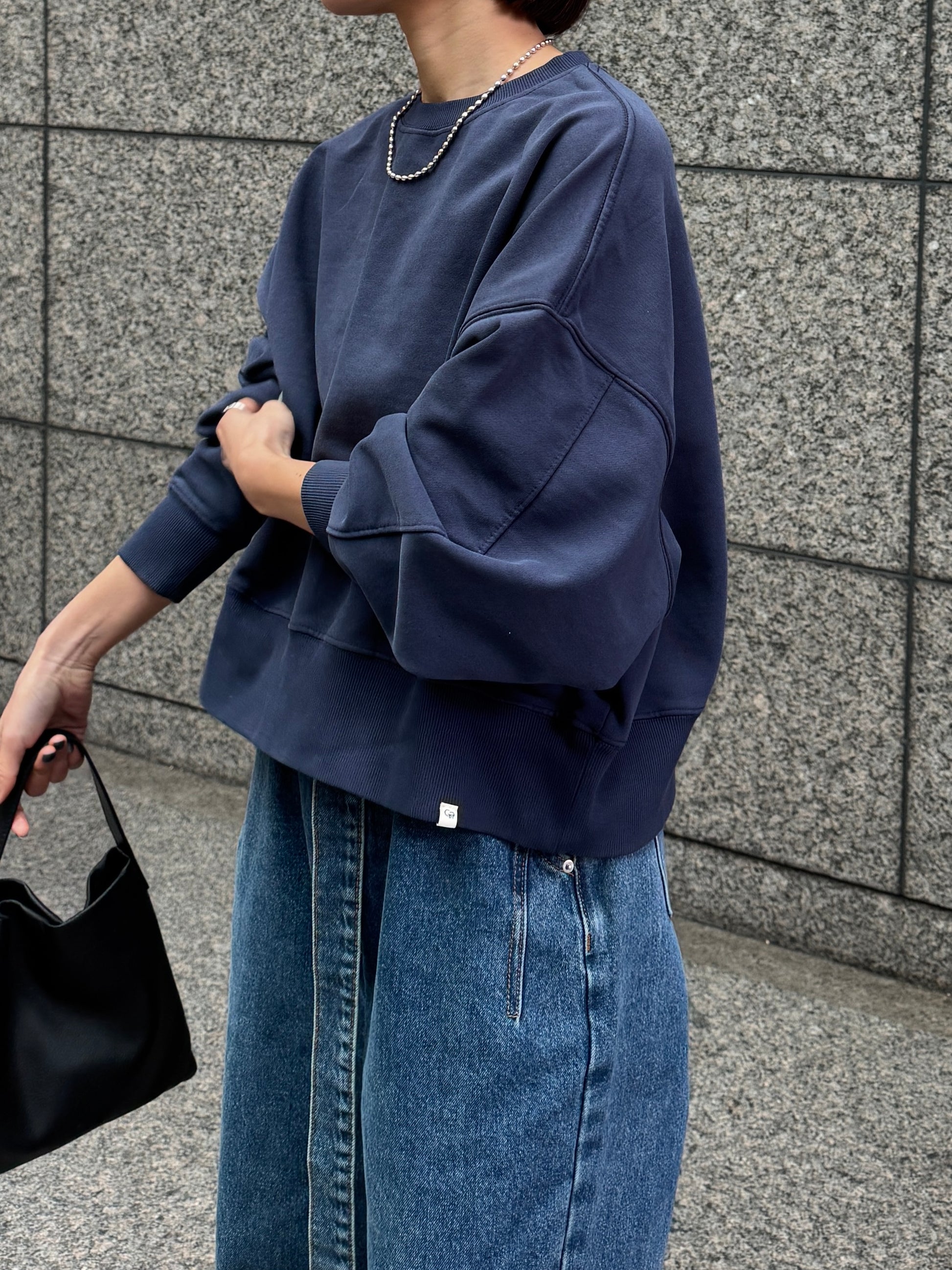 程よいショート丈と、立体感のあるシルエットが魅力のスウェットトップス。 肩まわりから袖にかけてゆとりを持たせたデザインで自然に丸みのあるフォルムが生まれ、ラフになりすぎず大人のカジュアルスタイルに馴染みます。 身頃と裾のリブ部分は切り替え位置にこだわり、シンプルながらもさりげないデザインアクセントに。 程よく色落ちさせたヴィンテージライクなウォッシュ加工を施し、こなれ感のある表情に仕上げているのもポイント。 インナーとのレイヤードで季節の変わり目にも幅広く活躍する1枚。