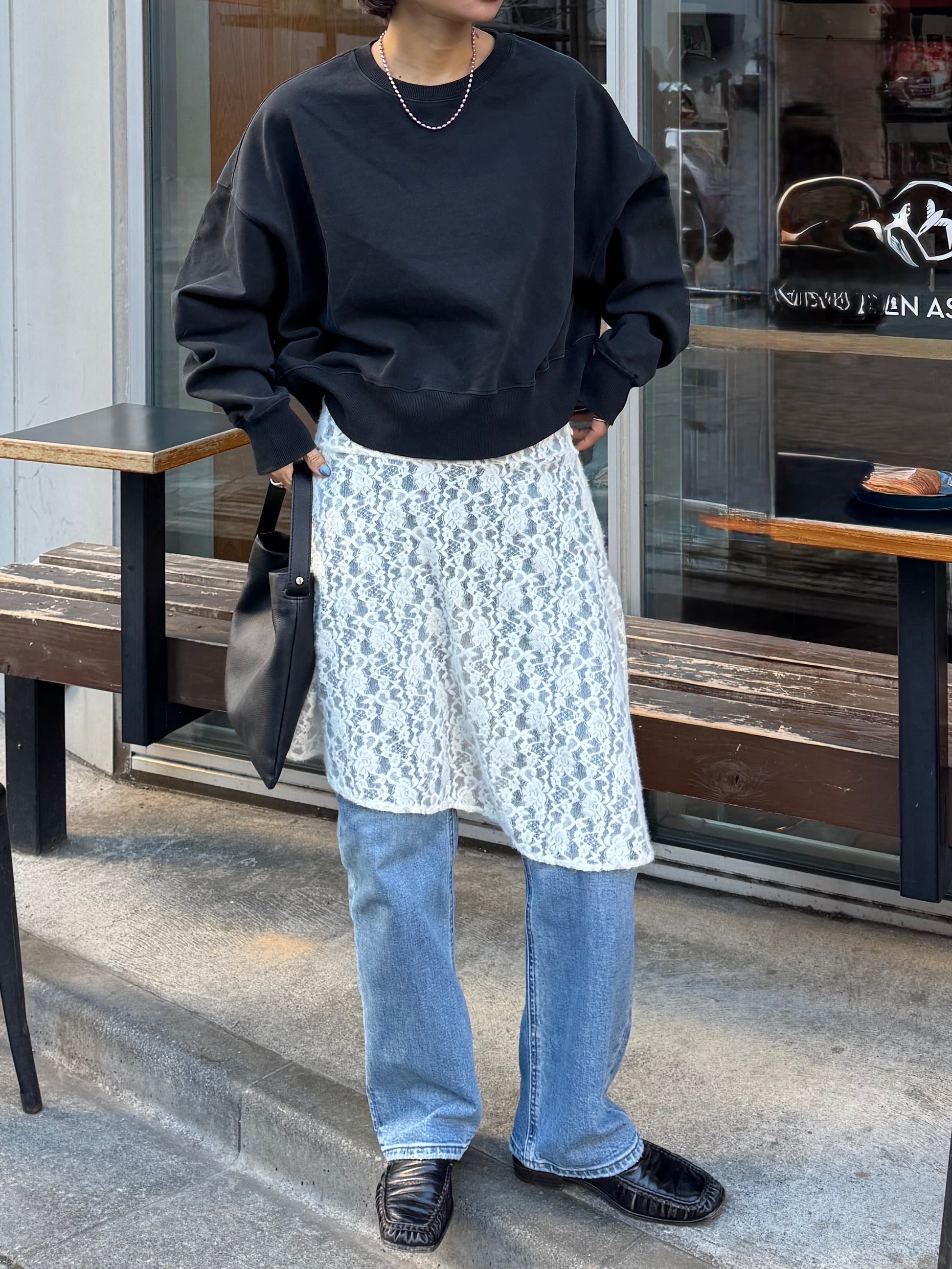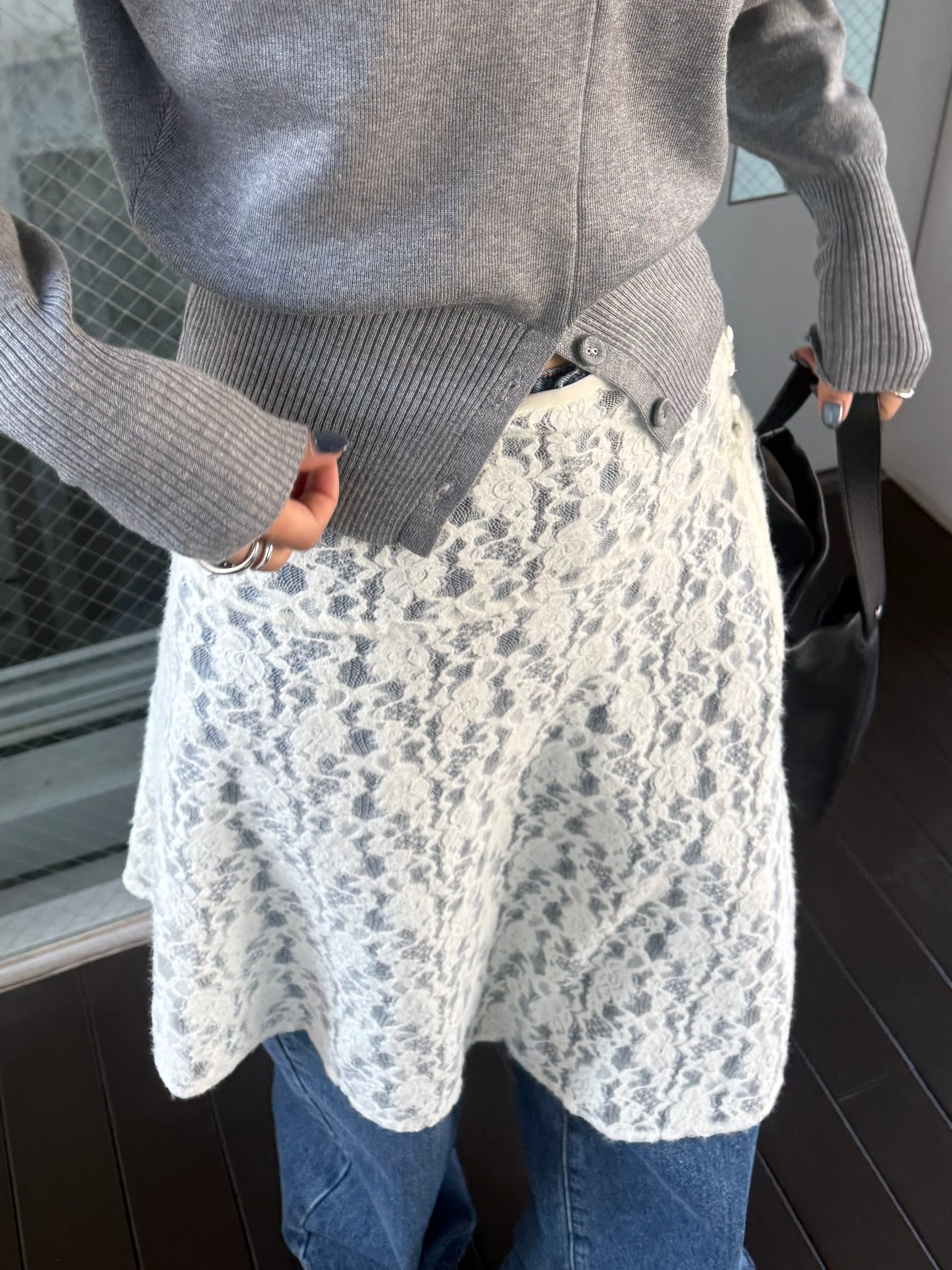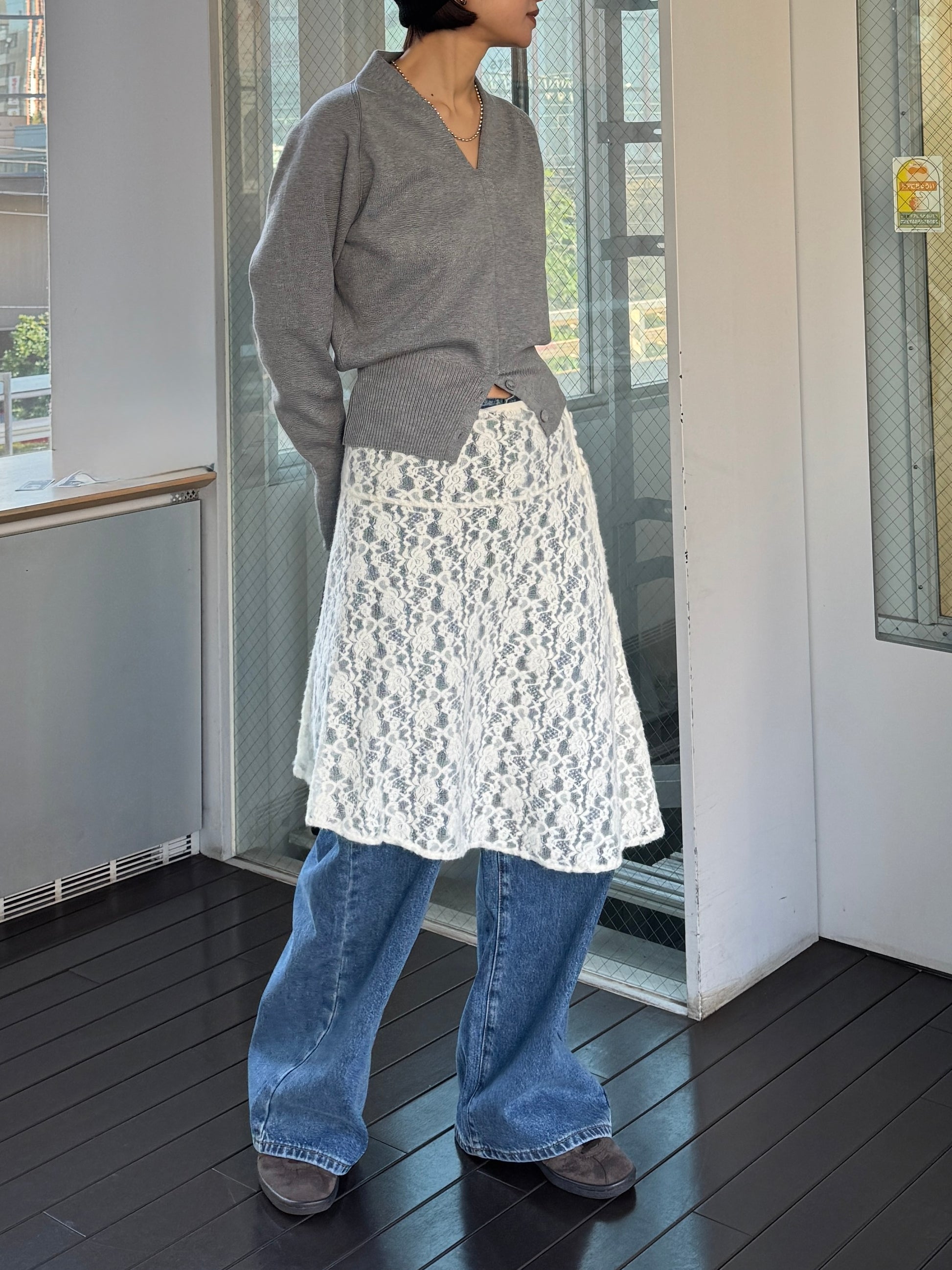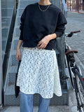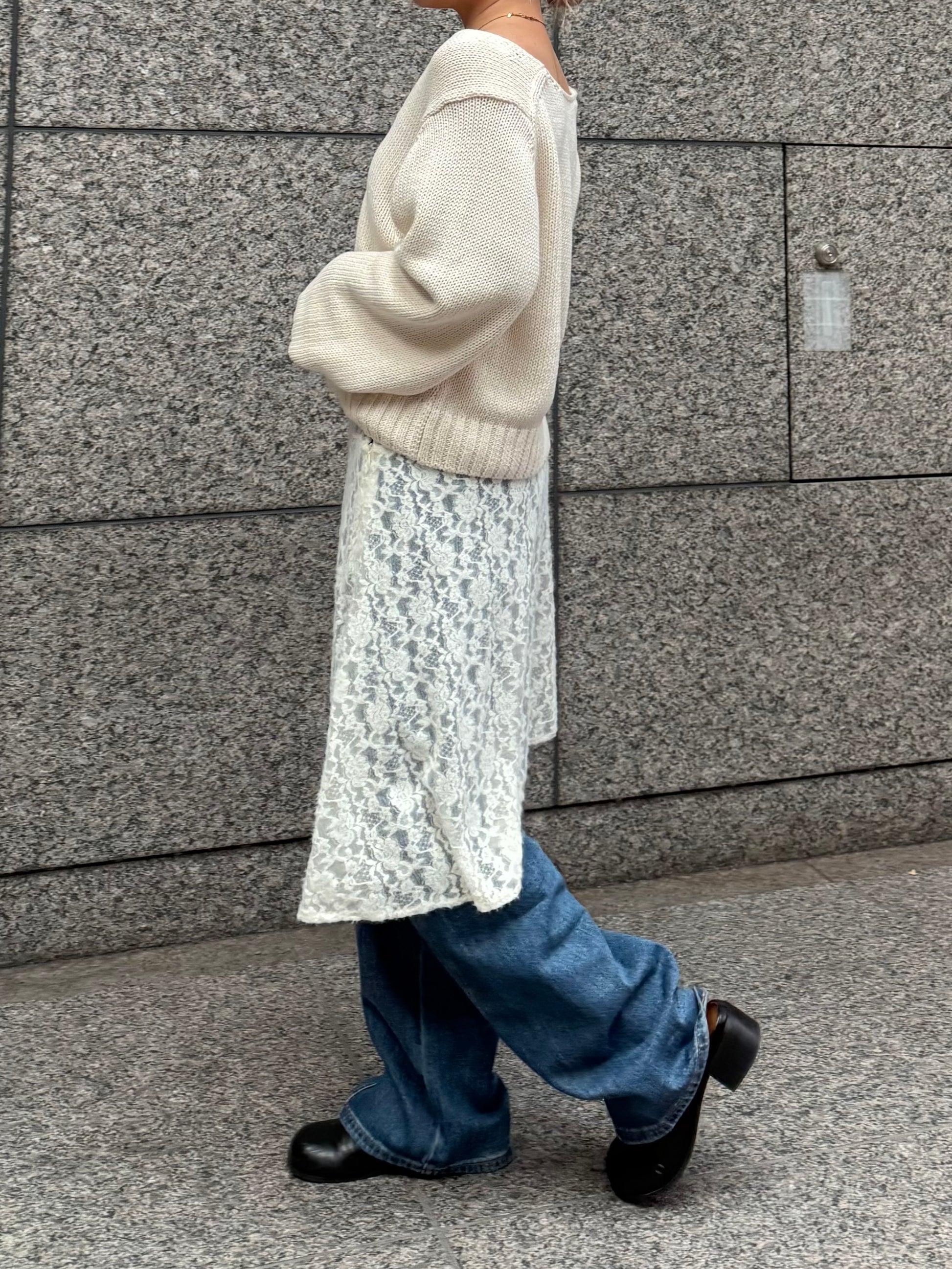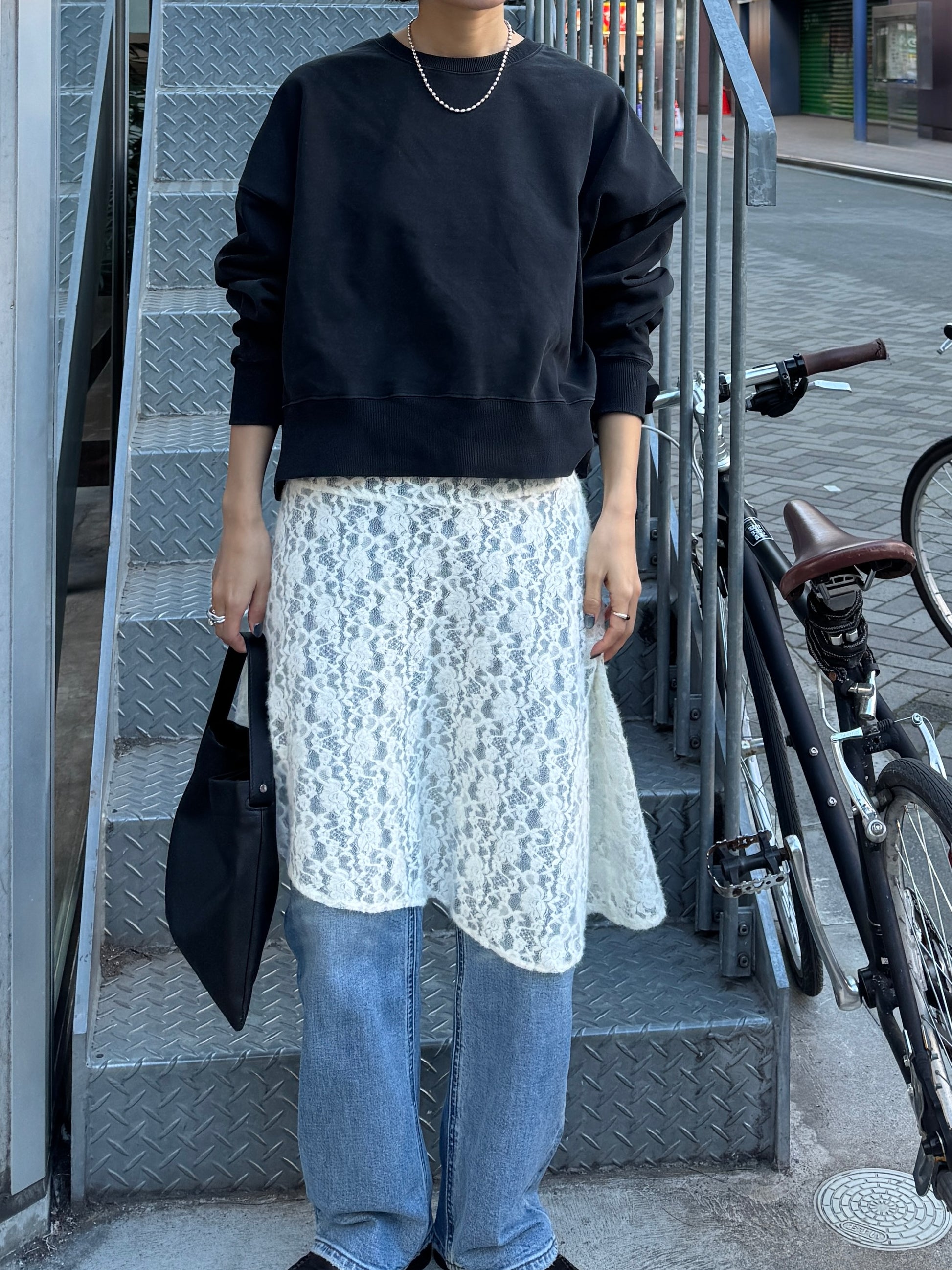 繊細なレース素材を使用しながらも、カジュアルなスタイリングに取り入れやすいレーススカート。 裾はアシンメトリーなデザインになっており、動くたびに表情が変わるのがポイント。 シンプルなコーディネートに合わせるだけで、さりげないアクセントをプラスしてくれます。 甘くなりすぎないレース感なので、スウェットやカットソー、デニムとのレイヤードスタイルとも相性◎ カジュアルなアイテムに合わせても程よく女性らしさを添えてくれる1枚。 春のデイリースタイルに取り入れやすく、スタイリングのの幅を広げてくれるアイテムです。