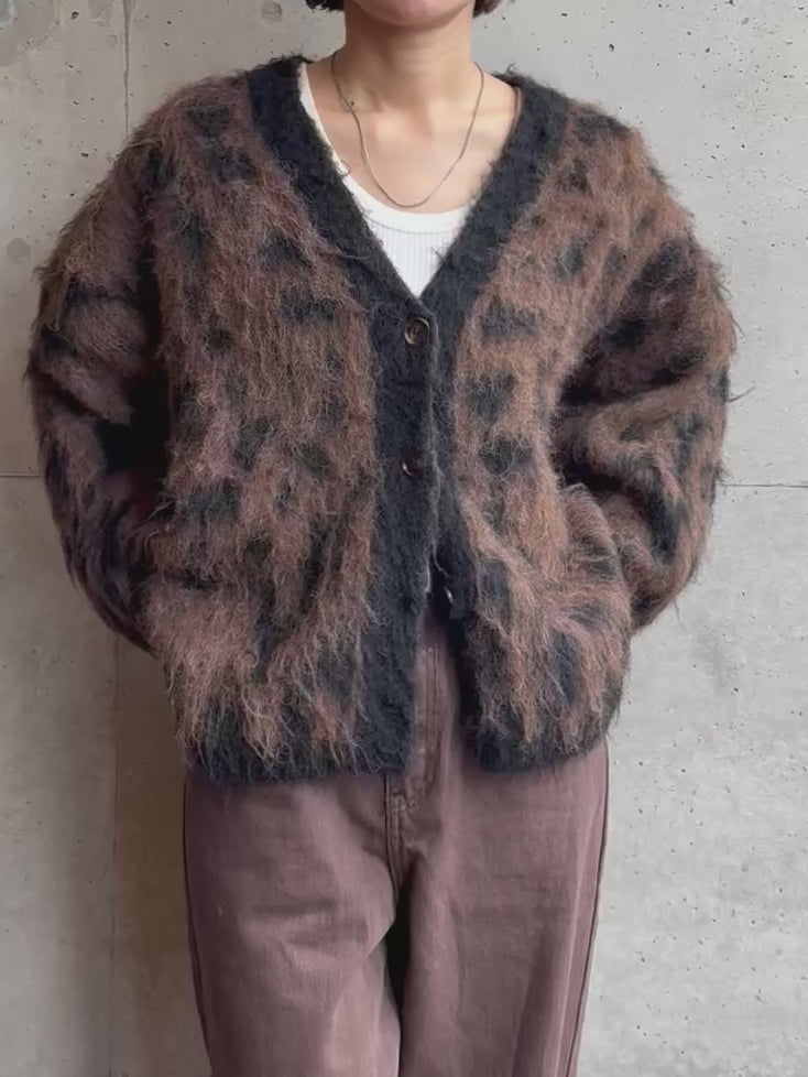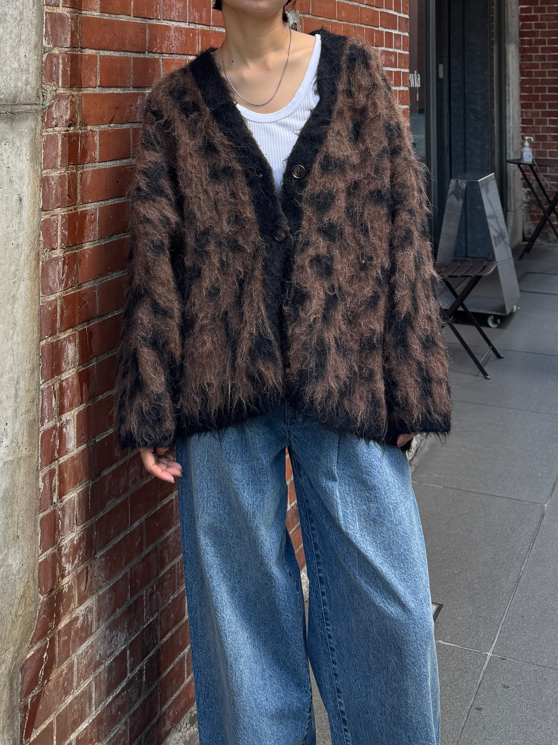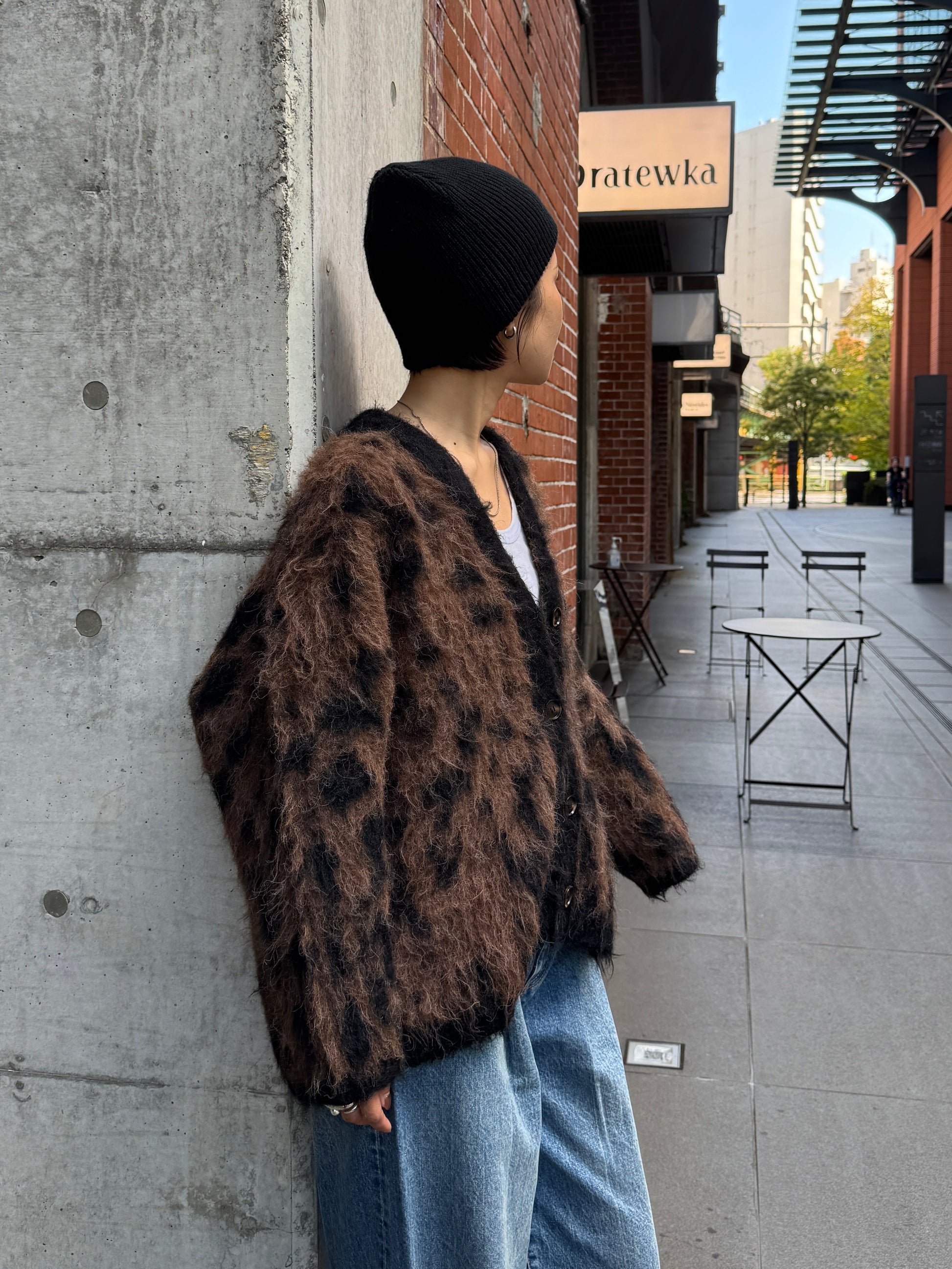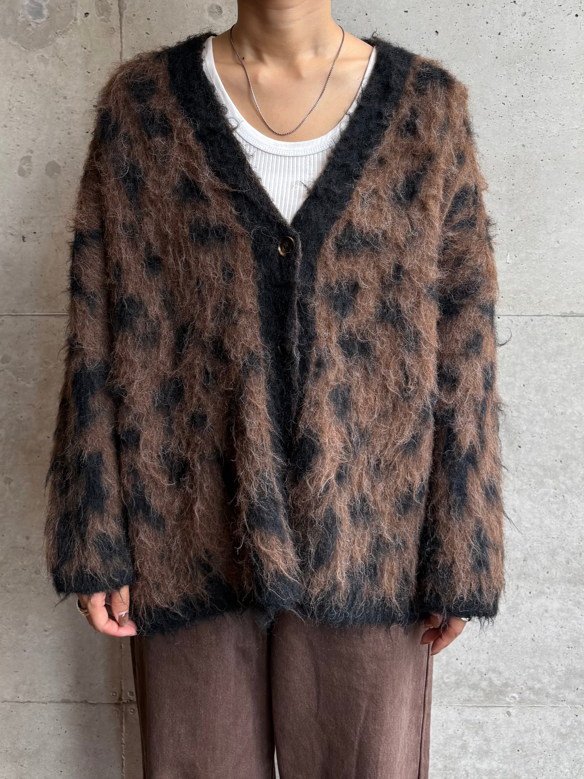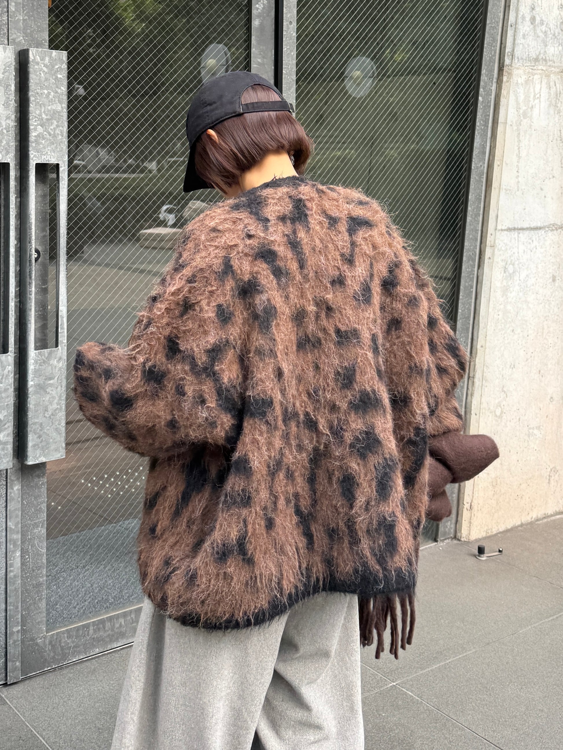 ふんわりとした毛足が印象的な、レオパード柄のシャギーカーディガン。