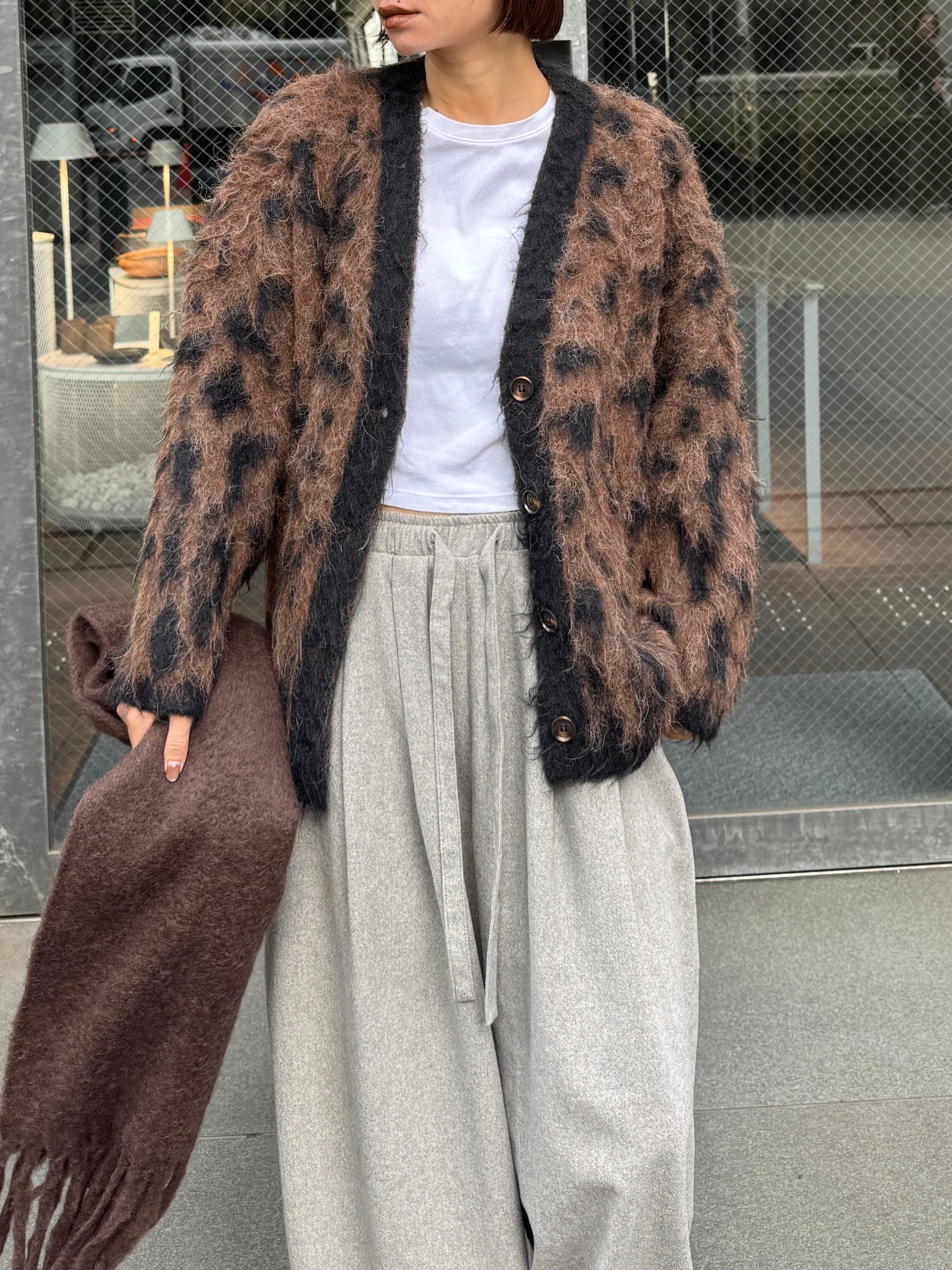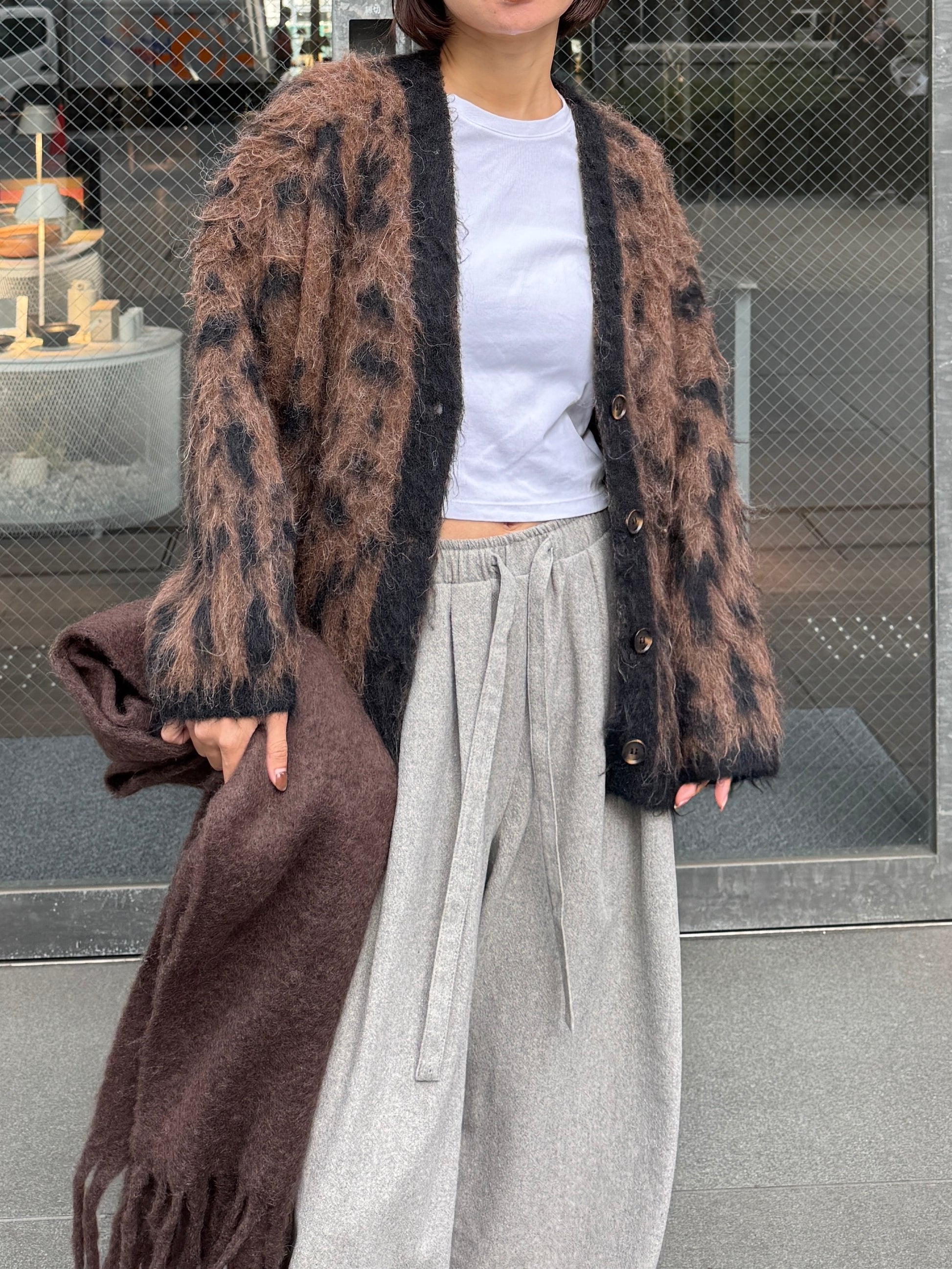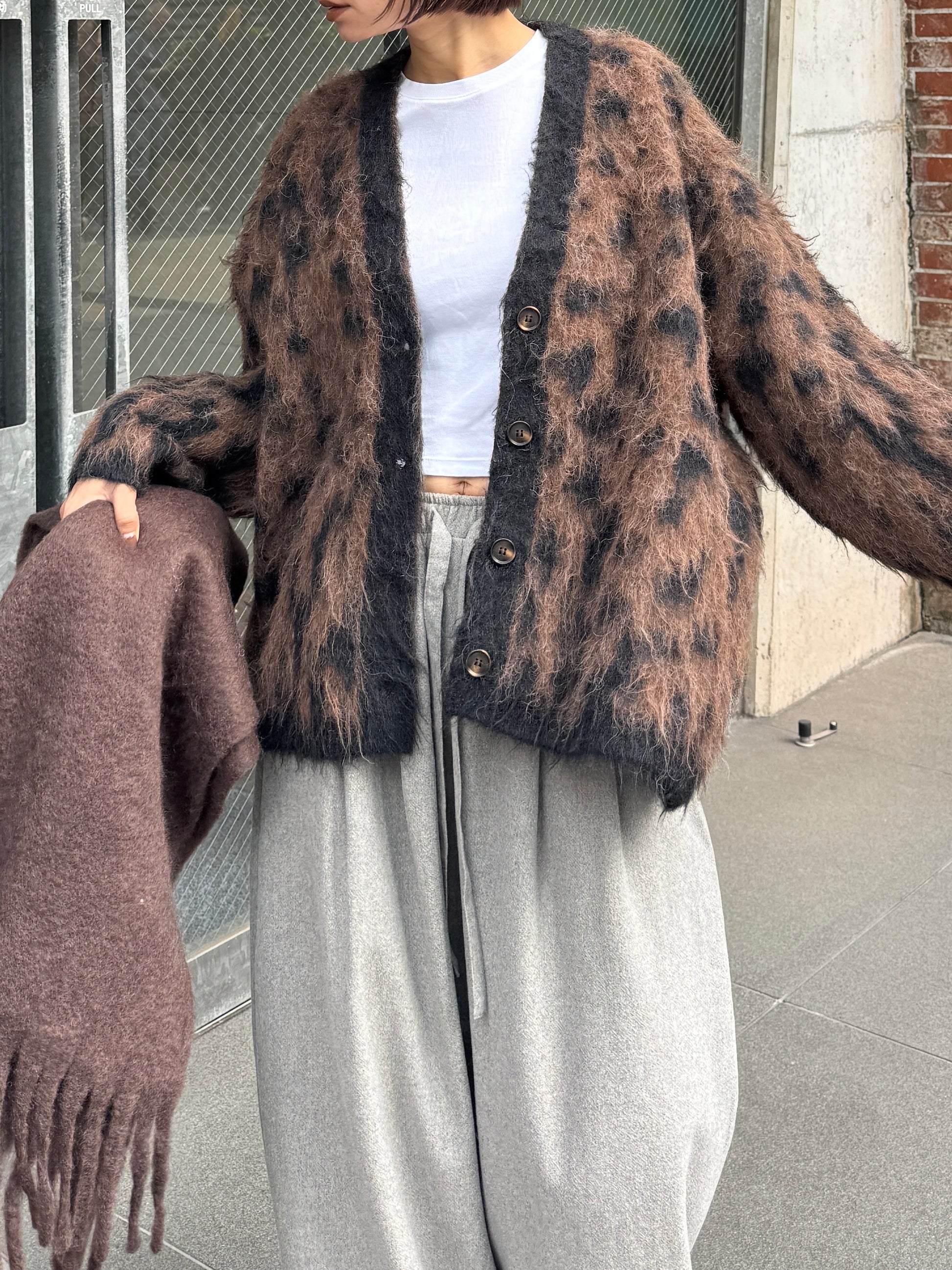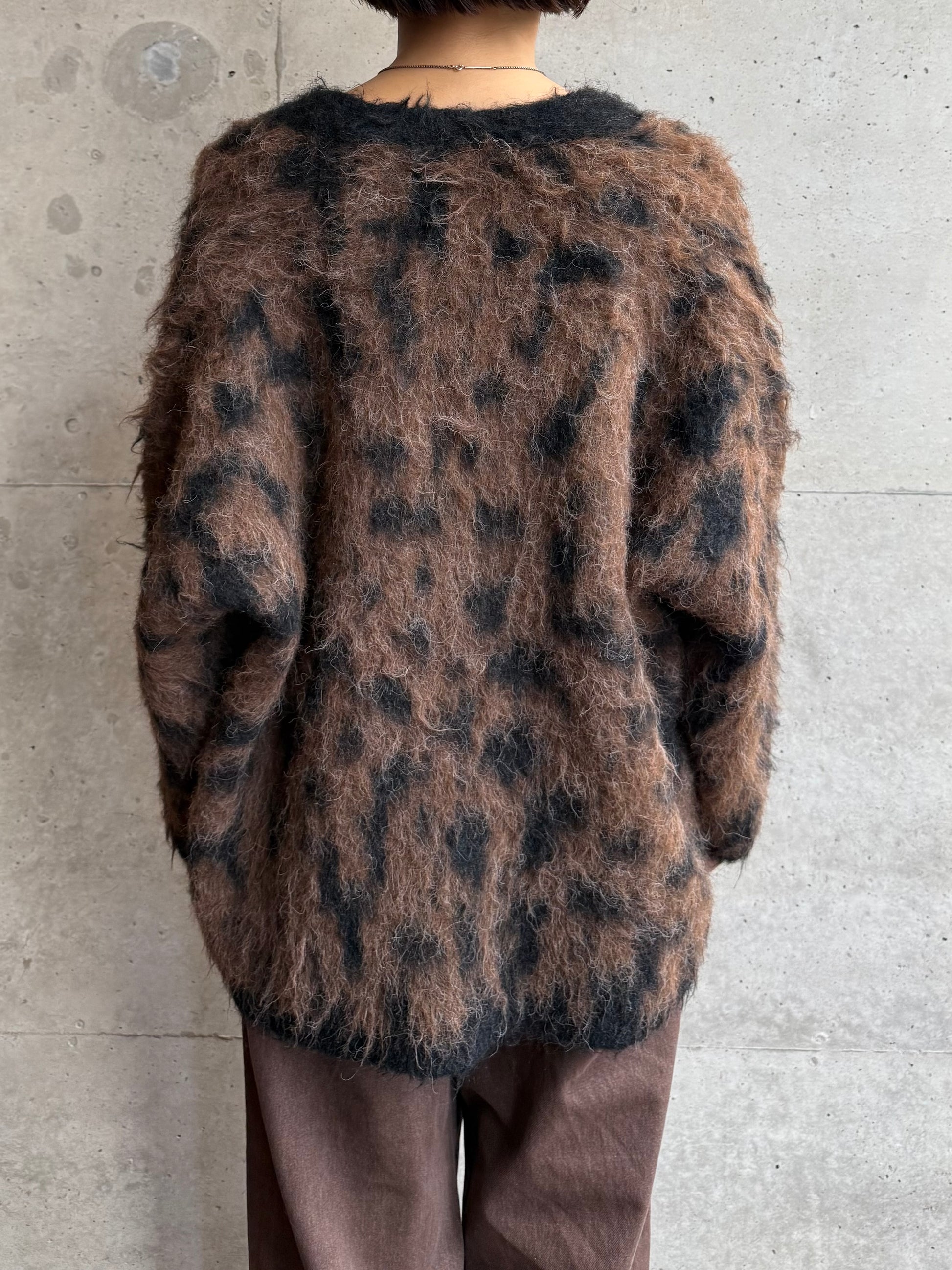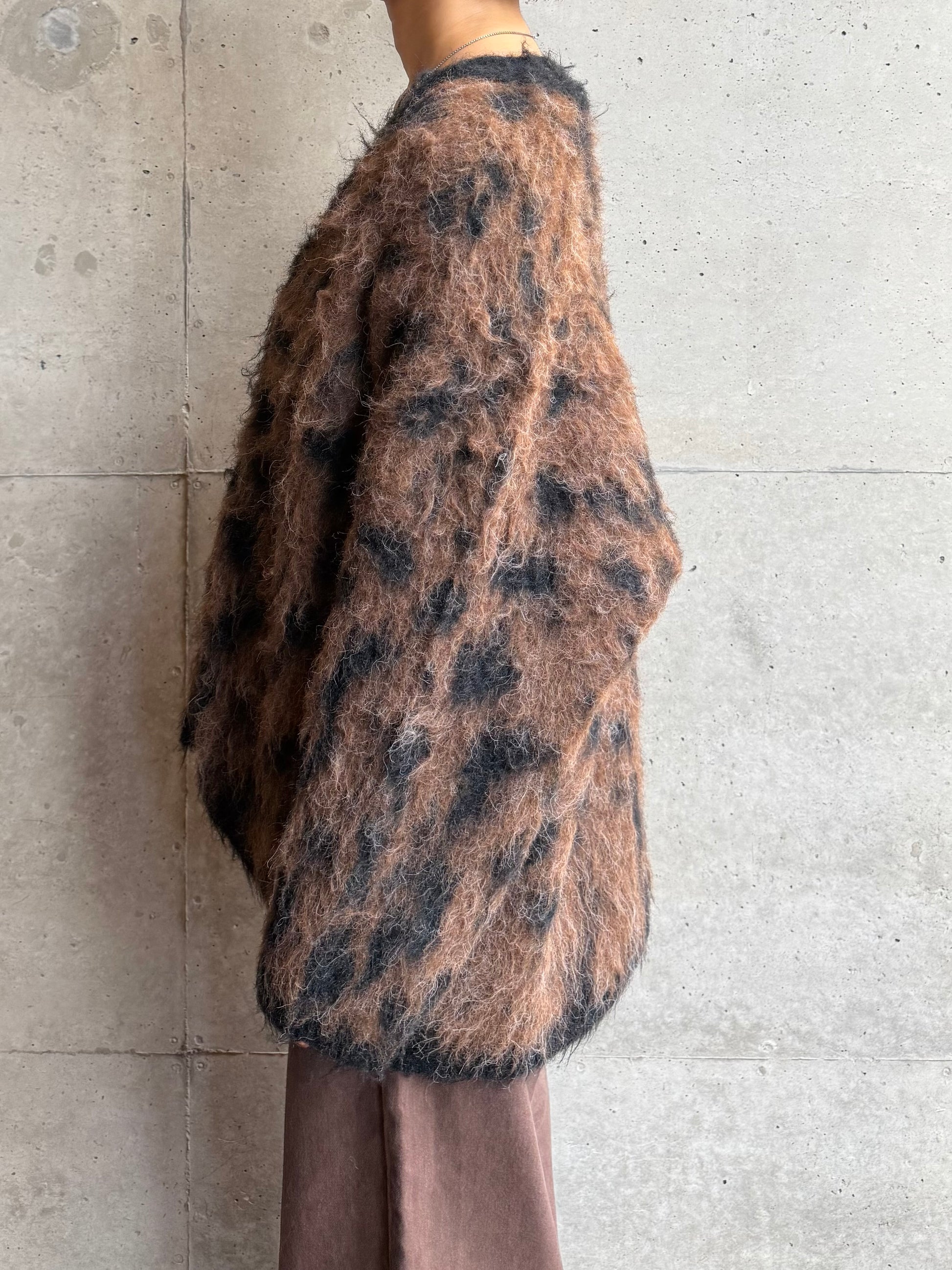 ふんわりとした毛足が印象的な、レオパード柄のシャギーカーディガン。
