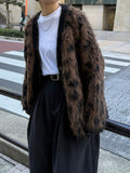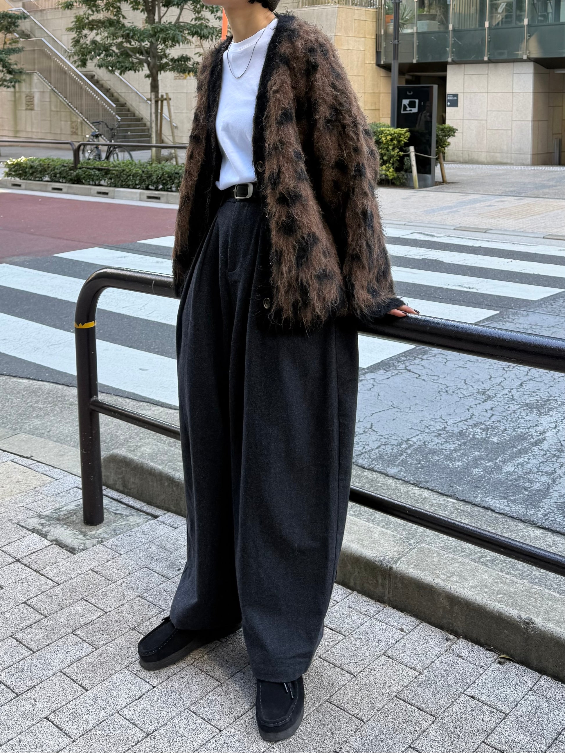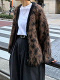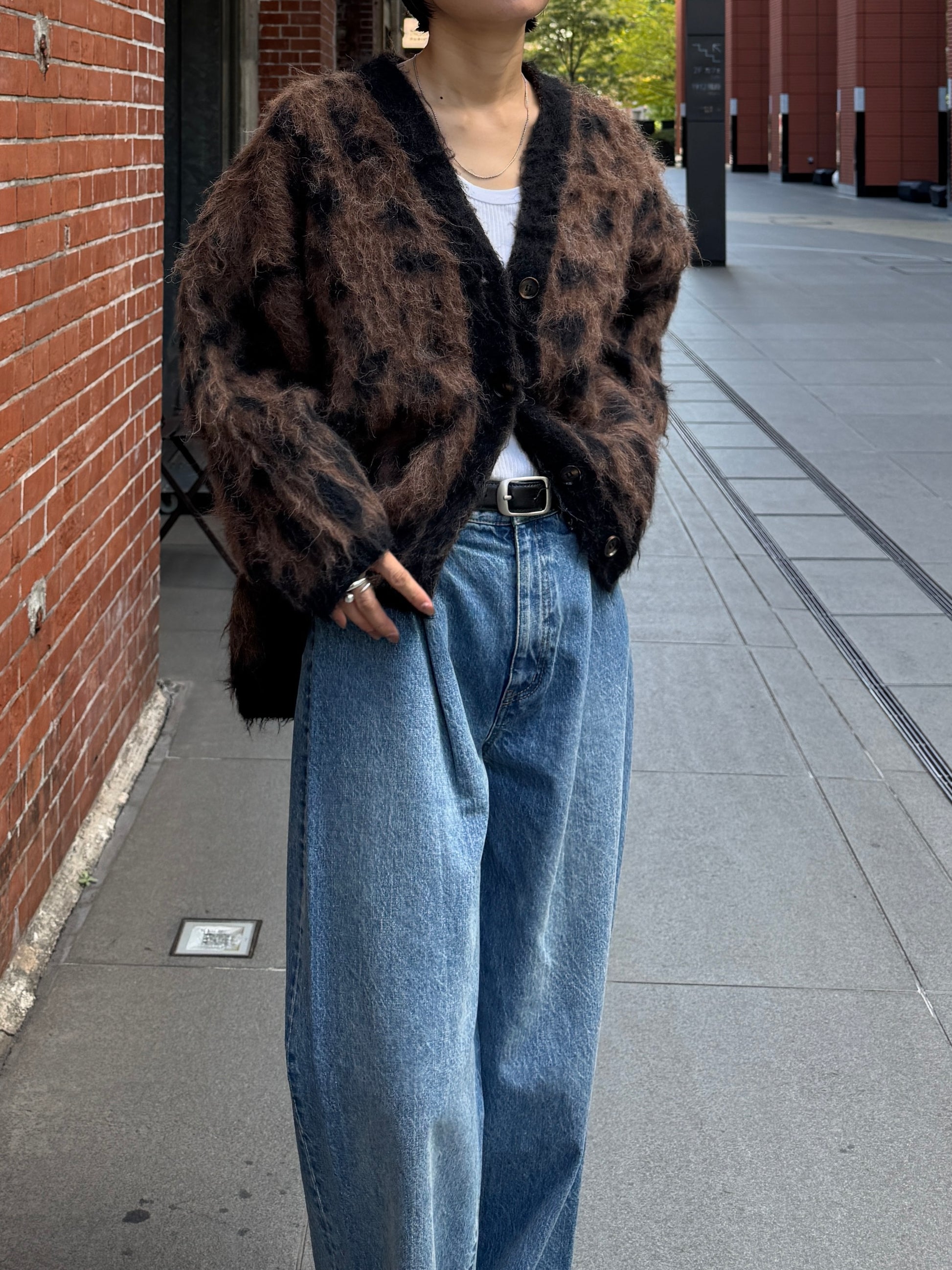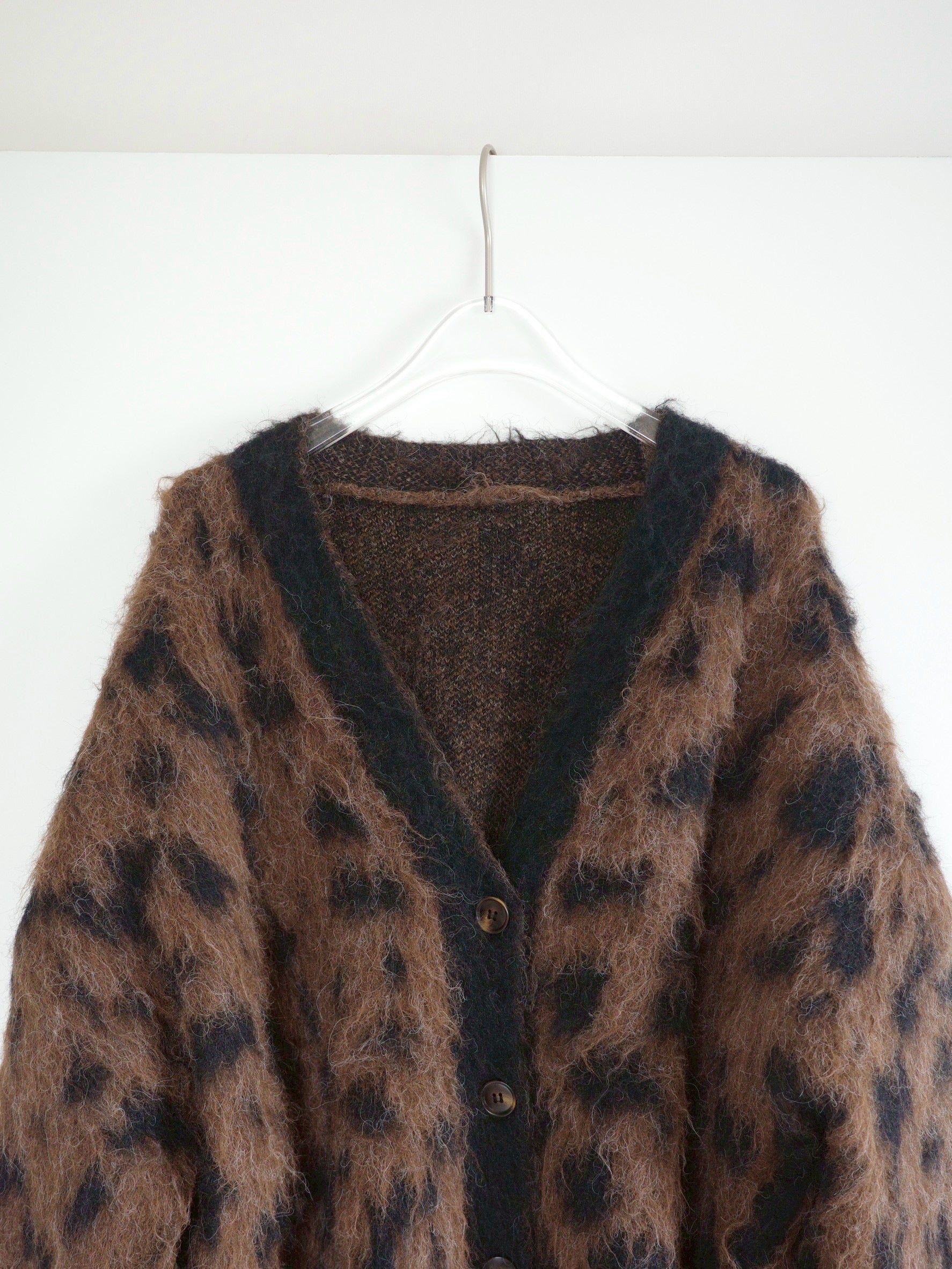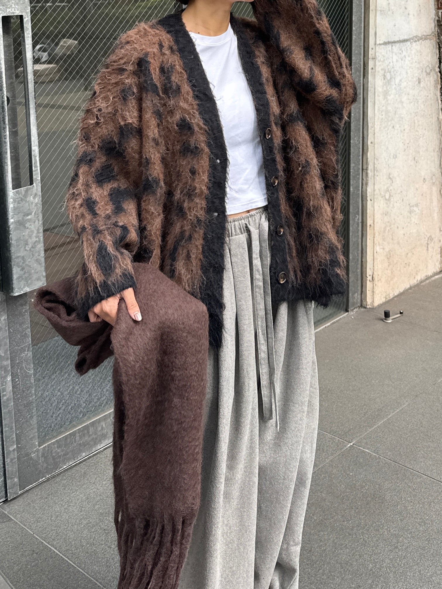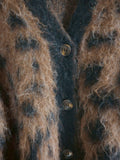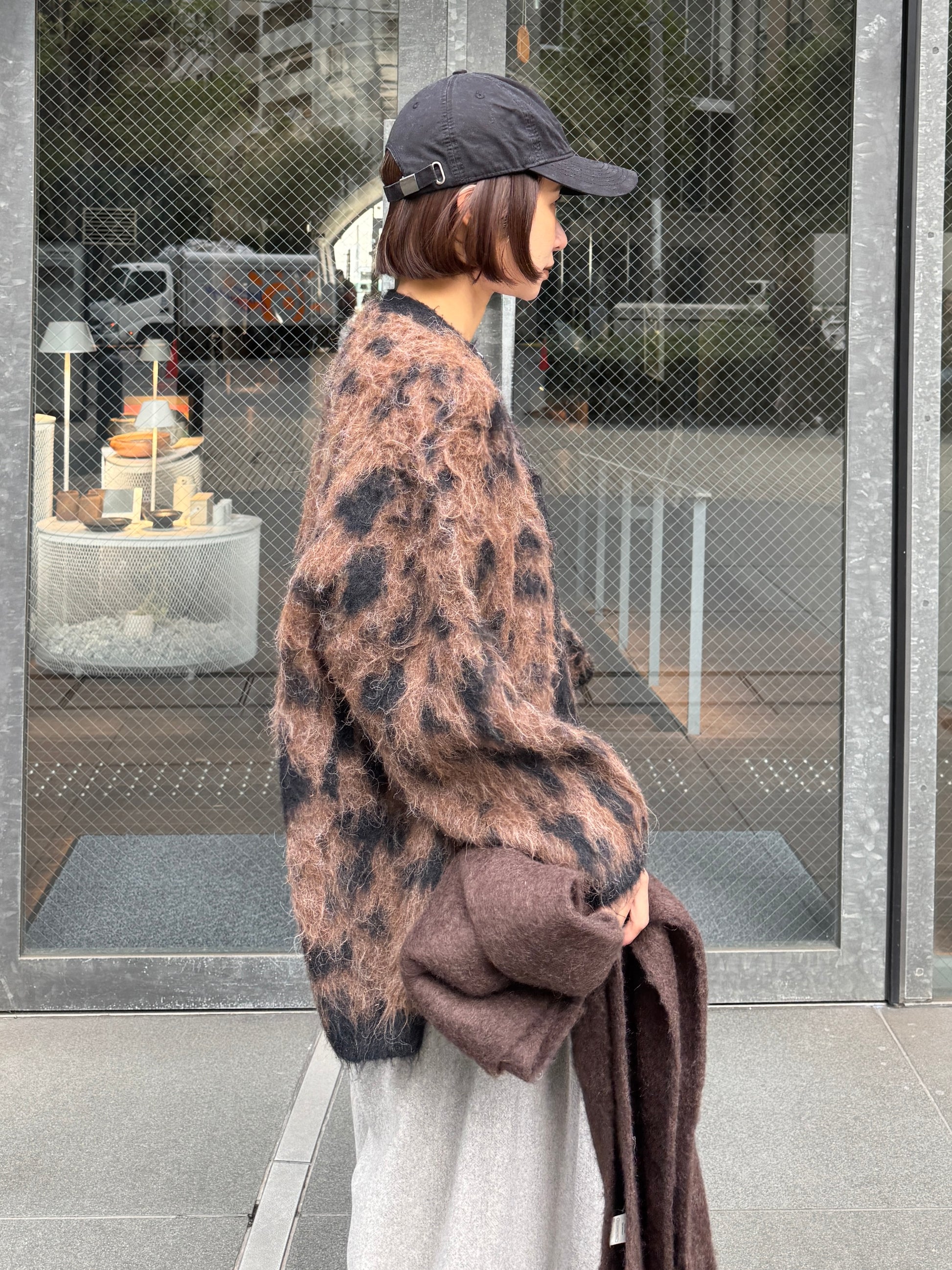 ふんわりとした毛足が印象的な、レオパード柄のシャギーカーディガン。