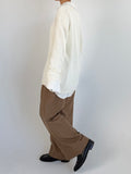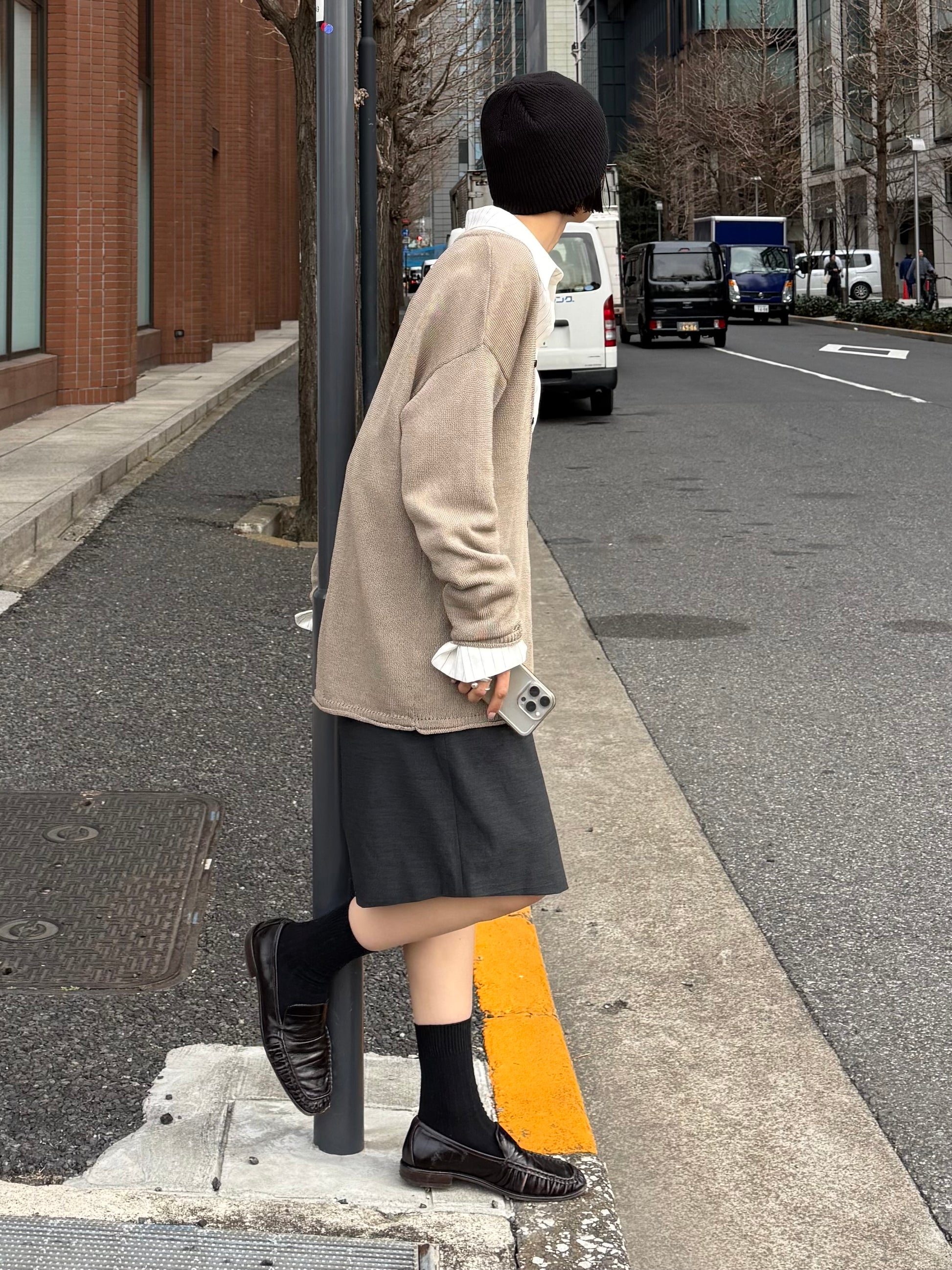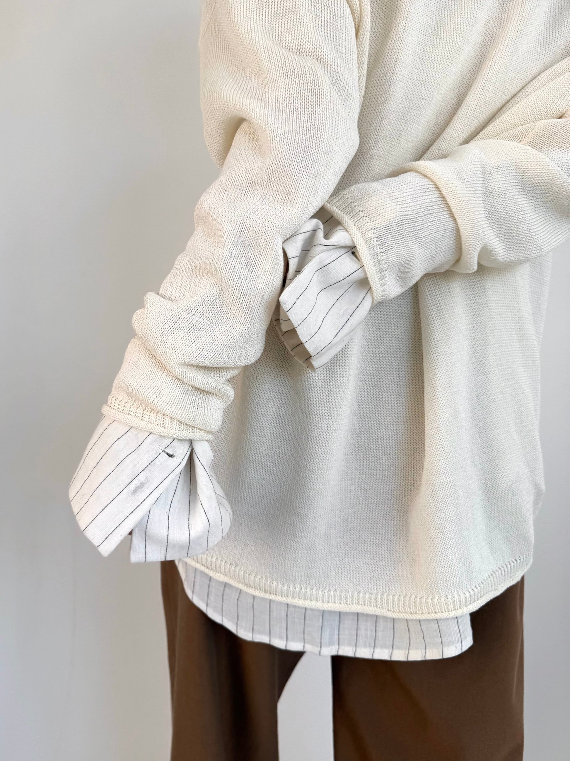 程よくたまりを持たせた袖やさりげなくニュアンスの出る裾の編み切り替えもデザインポイントとなり、シンプルながら表情のある仕上がりに。