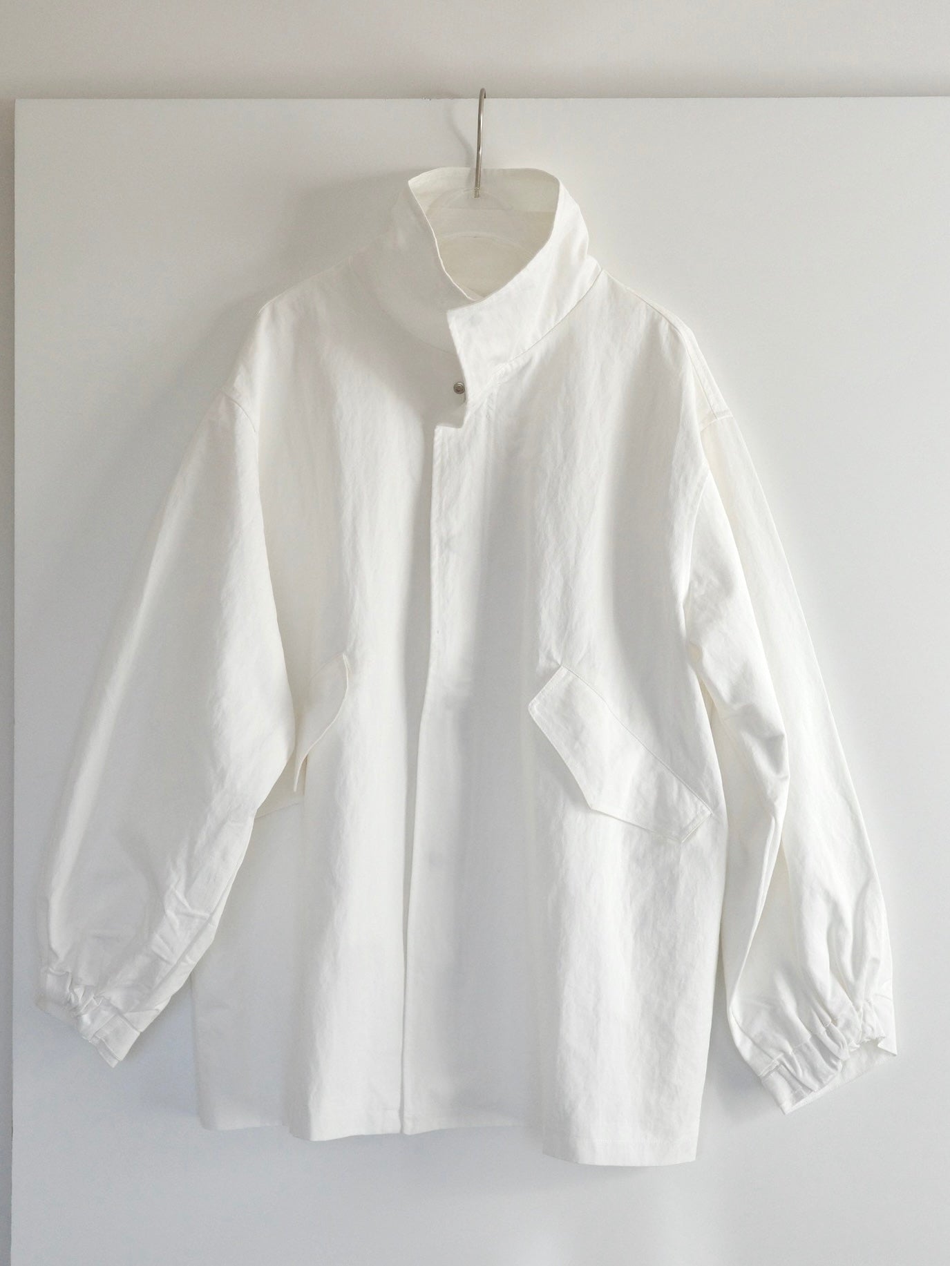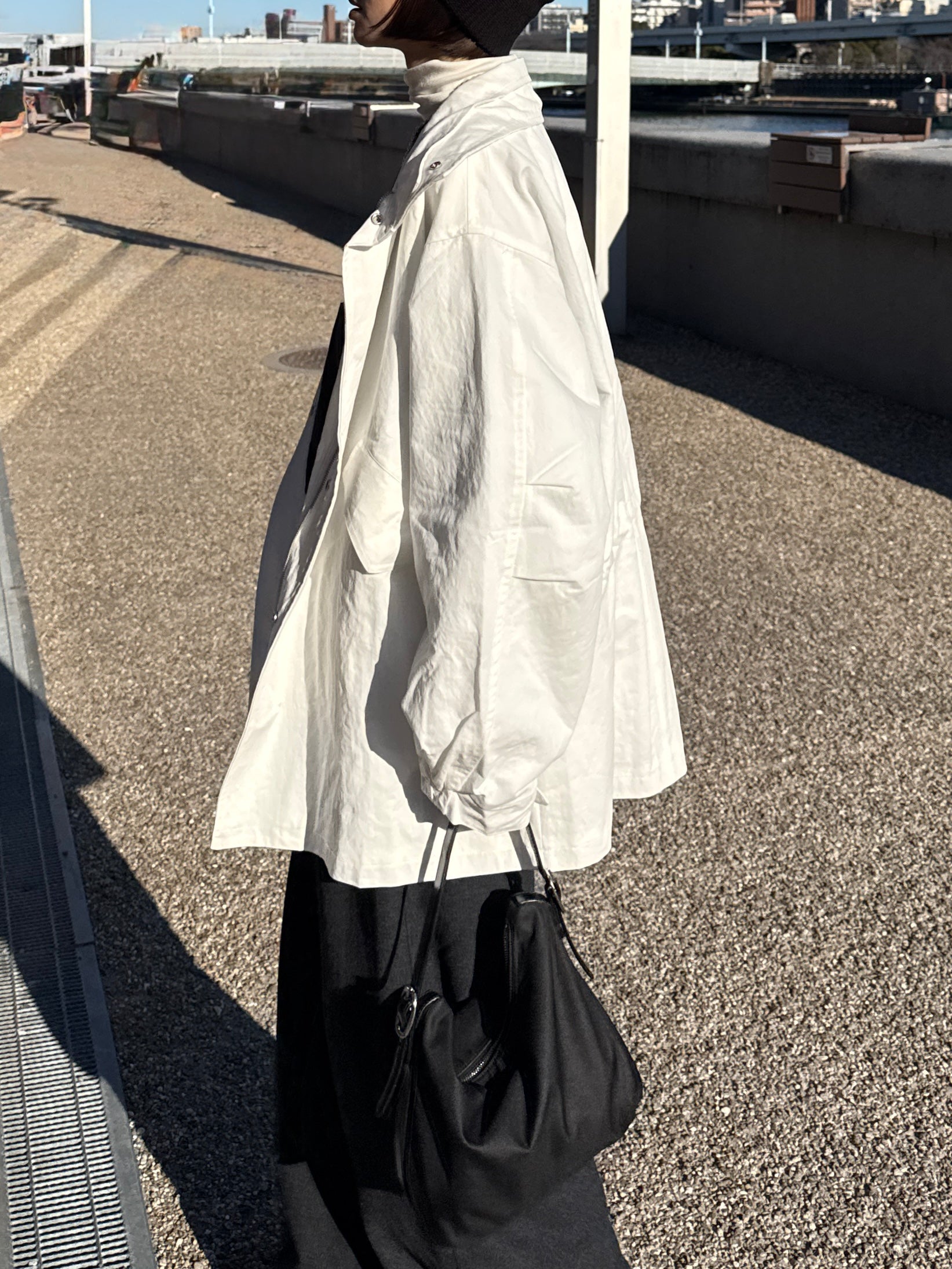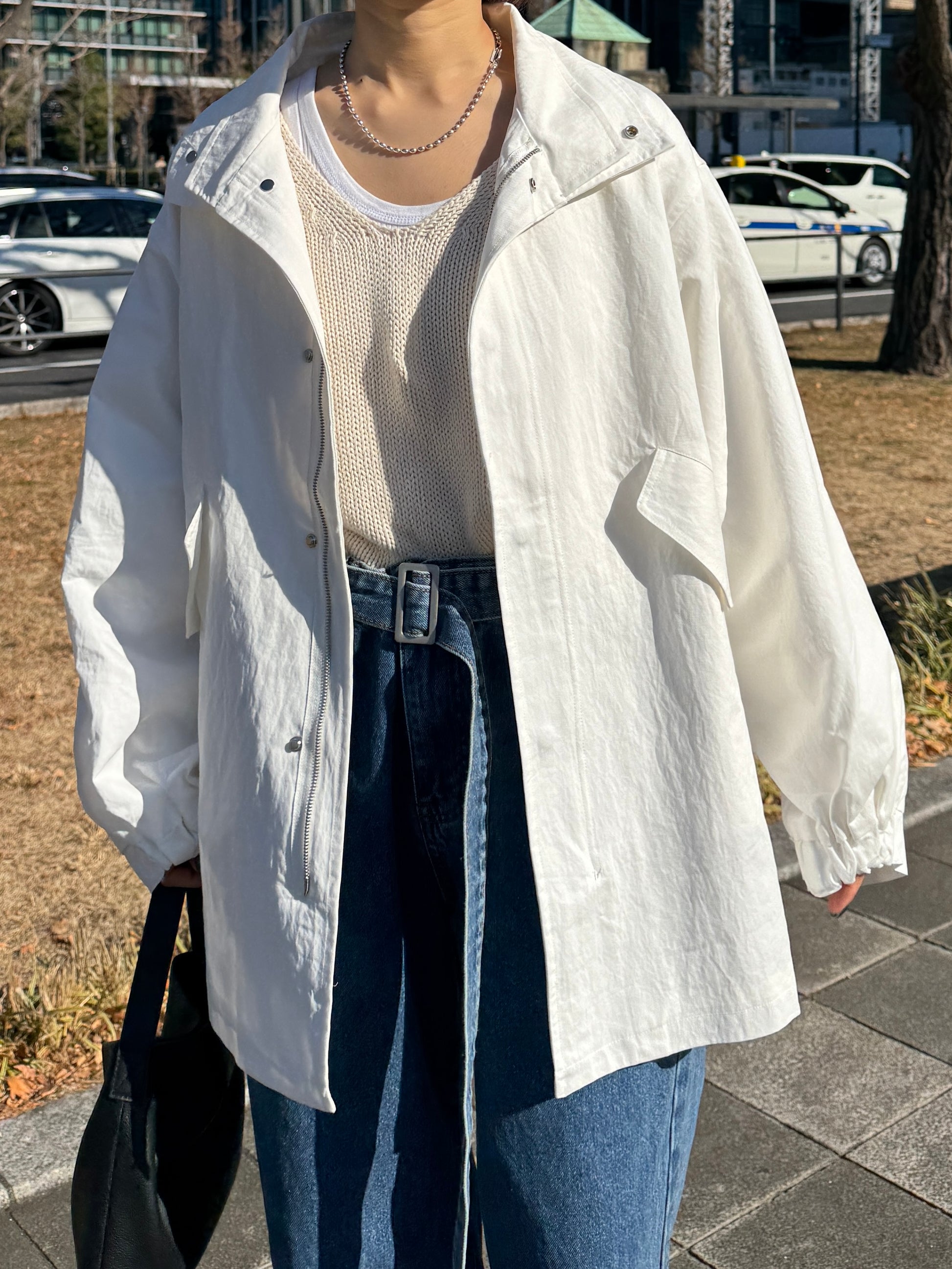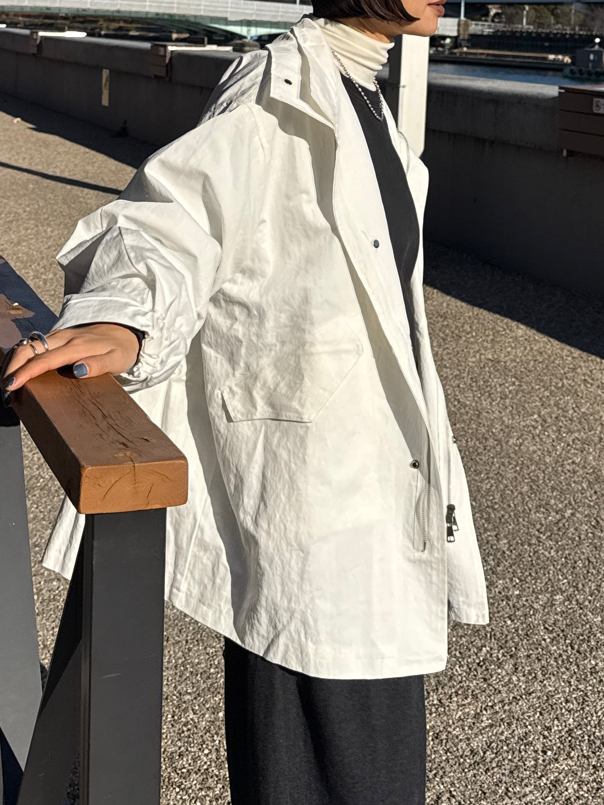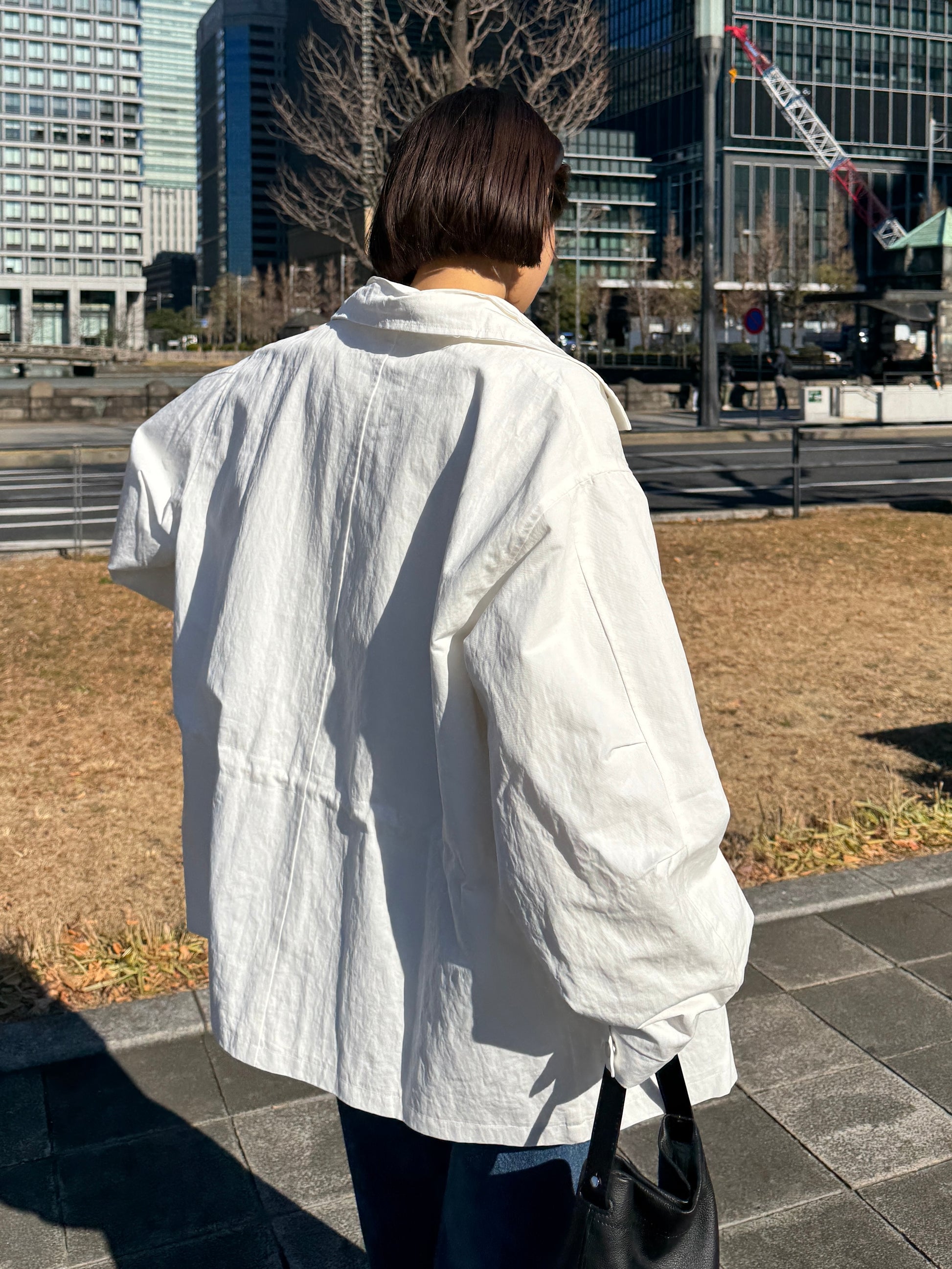 軽やかな表情のホワイトカラーが、春の装いにすっとなじむライトアウター。 コットンとナイロンを織り交ぜた素材で、程よいハリと軽さを感じる着心地に仕上げました。 首元は立ち上がりすぎないスタンドカラー仕様で、顔まわりをすっきりと見せつつ程よい存在感をプラス。 フロントはスナップボタンとファスナーのダブル仕様になっており、開け方次第で印象を変えられるのも魅力です。 ウエスト内側にはさりげなくドローストリングを施し、絞ることでシルエットにメリハリを。 後ろ姿にも自然な立体感が生まれ、カジュアルながら女性らしいバランスに仕上がります。 ふんわりと丸みのある袖デザインが、全体の印象をやわらかく演出し、シンプルながらも表情のある1着。