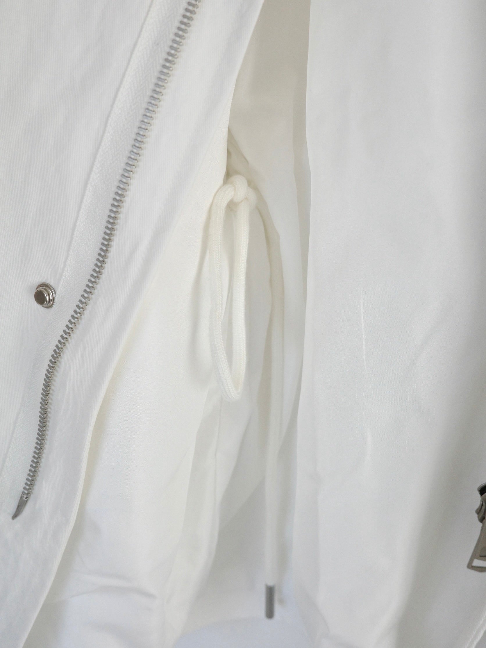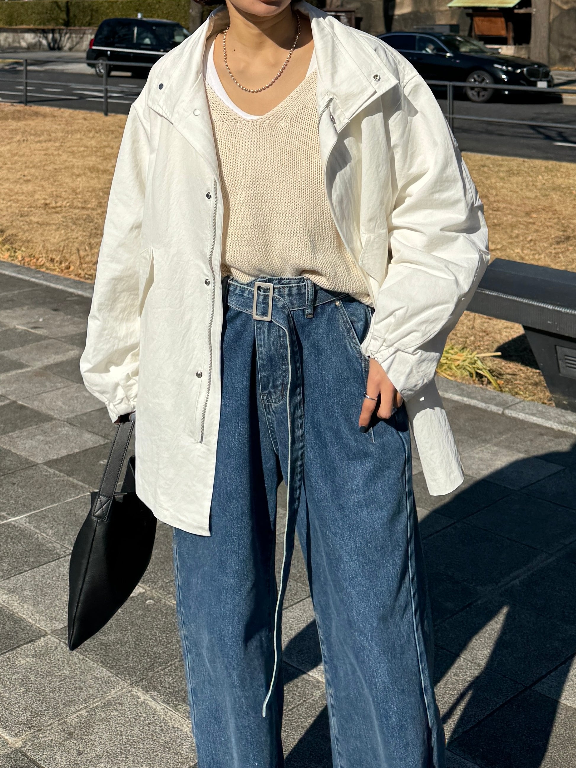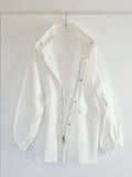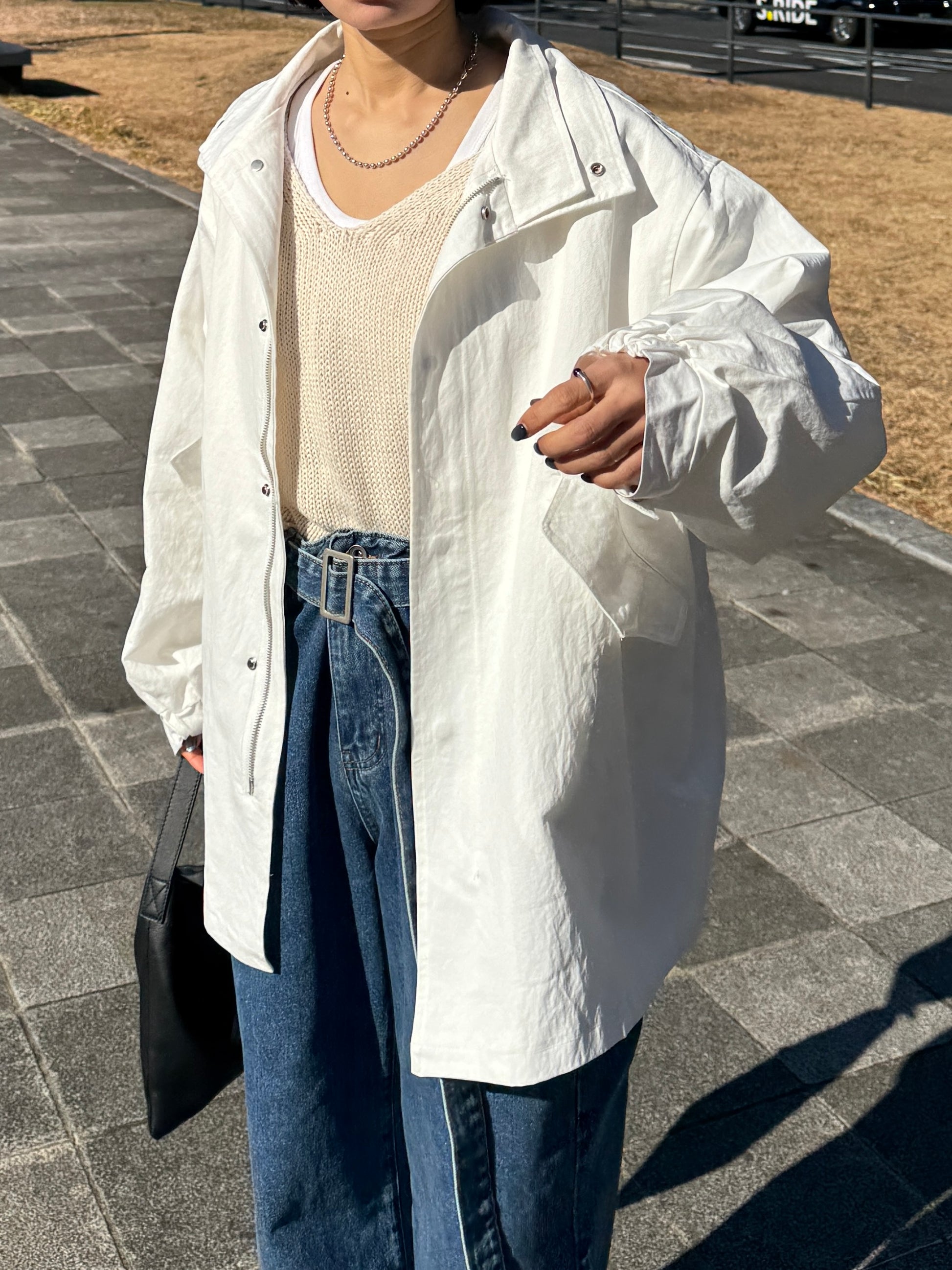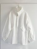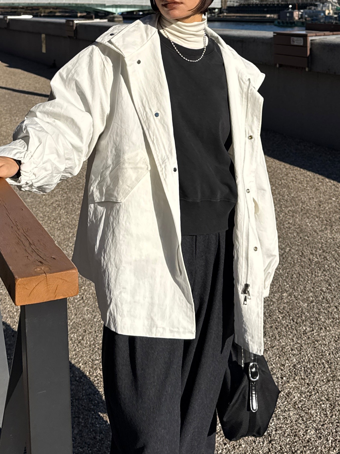 軽やかな表情のホワイトカラーが、春の装いにすっとなじむライトアウター。 コットンとナイロンを織り交ぜた素材で、程よいハリと軽さを感じる着心地に仕上げました。 首元は立ち上がりすぎないスタンドカラー仕様で、顔まわりをすっきりと見せつつ程よい存在感をプラス。 フロントはスナップボタンとファスナーのダブル仕様になっており、開け方次第で印象を変えられるのも魅力です。 ウエスト内側にはさりげなくドローストリングを施し、絞ることでシルエットにメリハリを。 後ろ姿にも自然な立体感が生まれ、カジュアルながら女性らしいバランスに仕上がります。 ふんわりと丸みのある袖デザインが、全体の印象をやわらかく演出し、シンプルながらも表情のある1着。