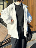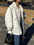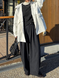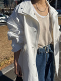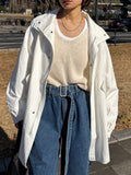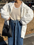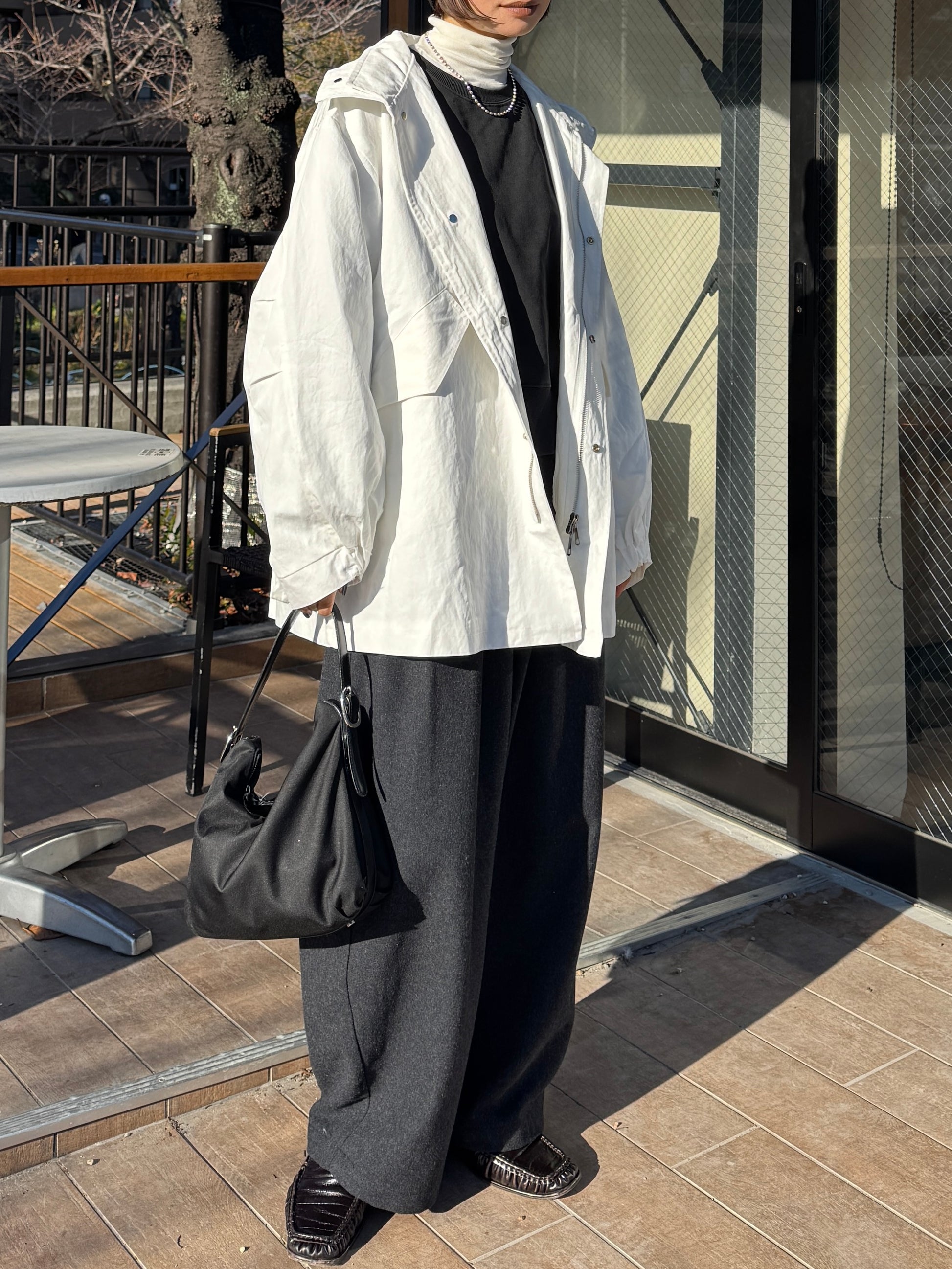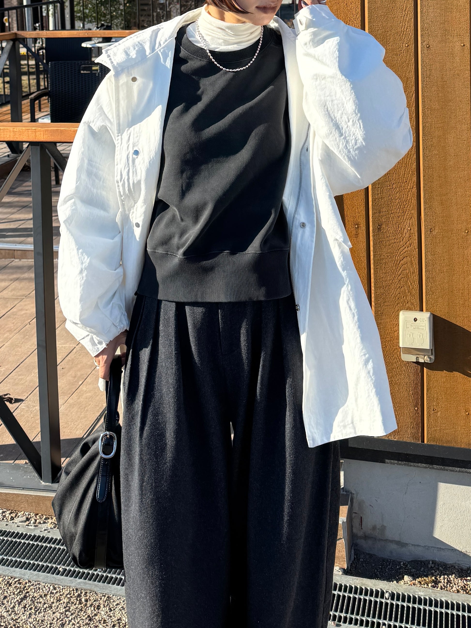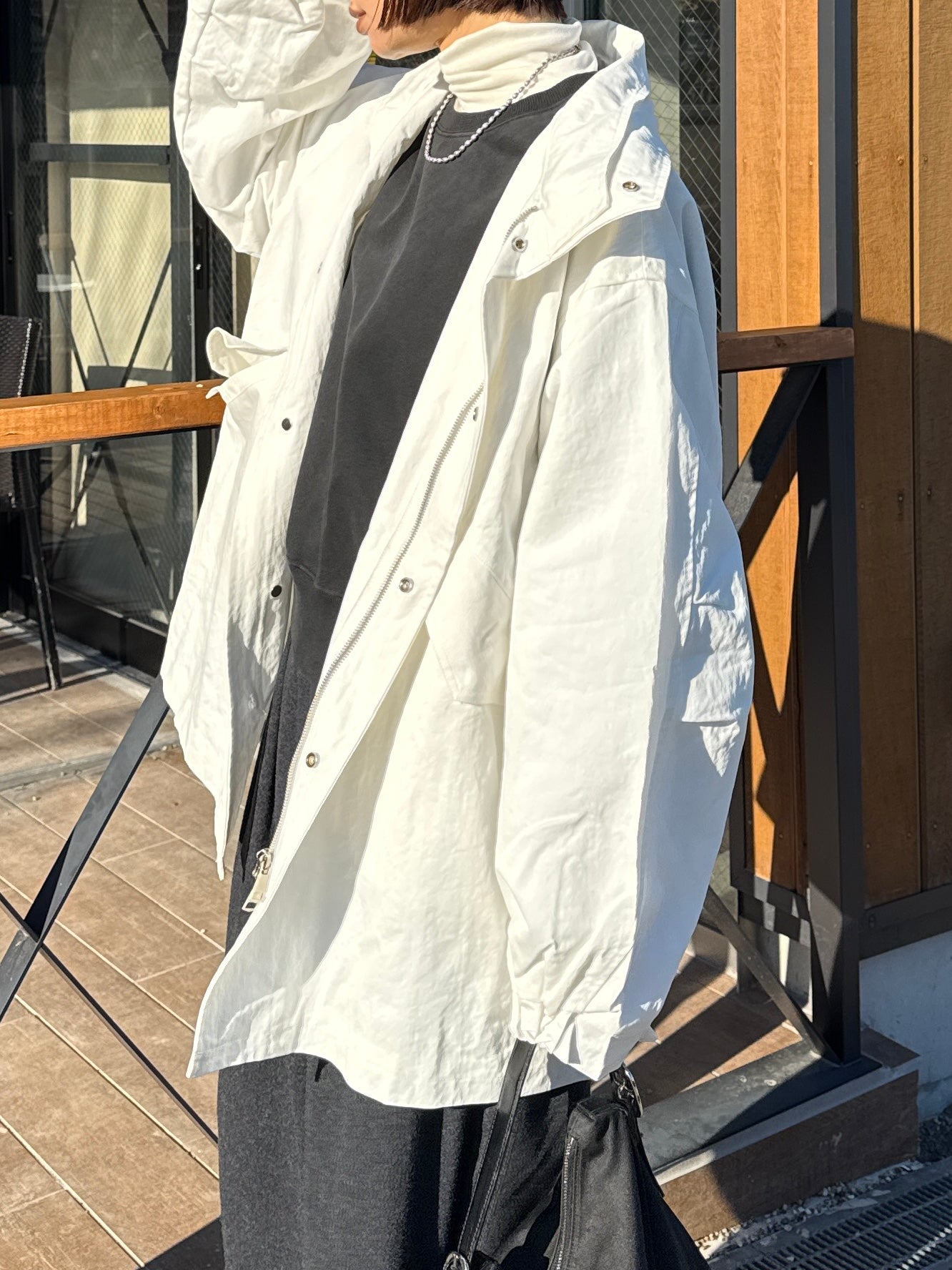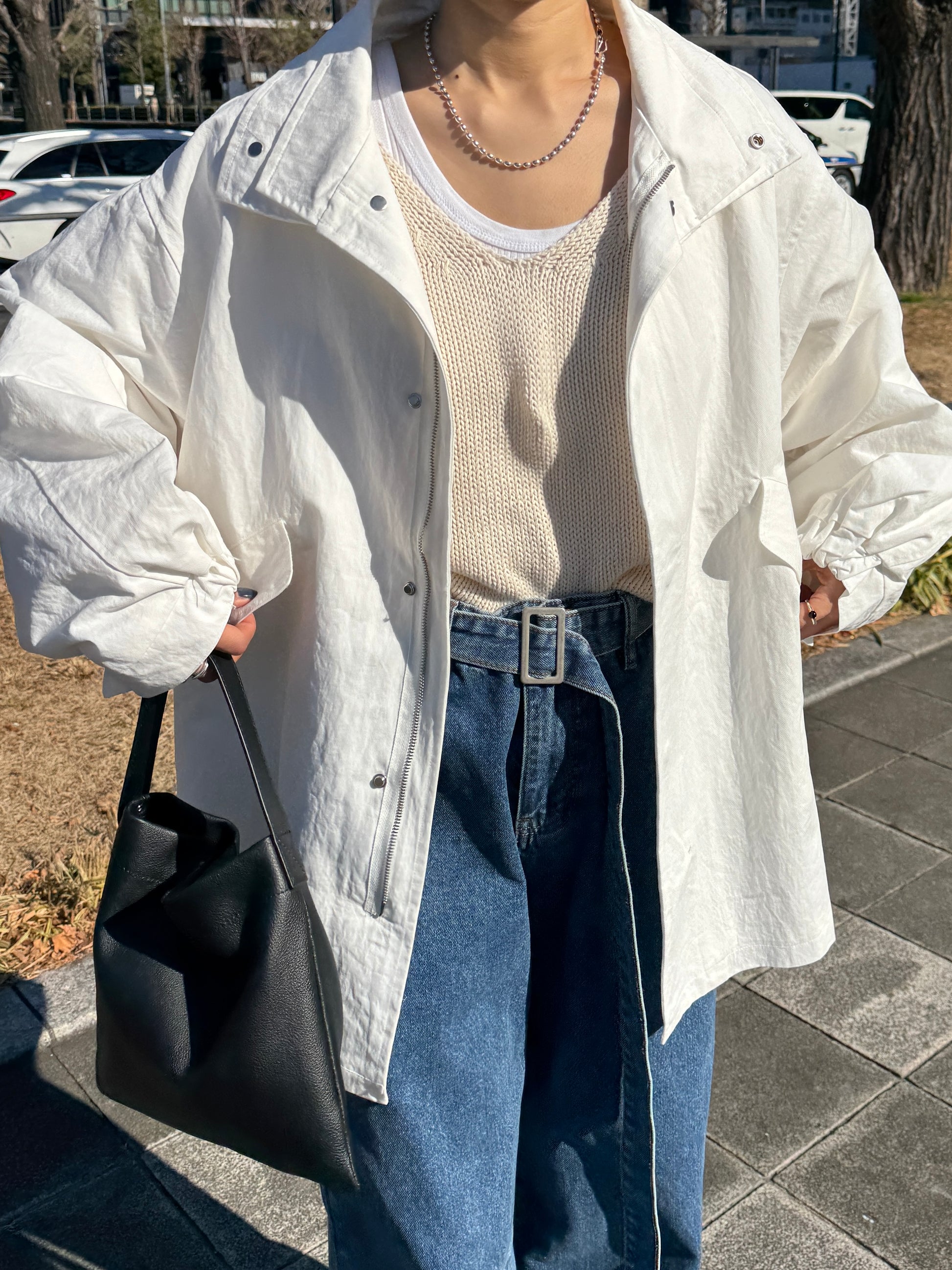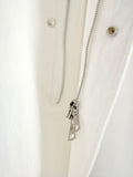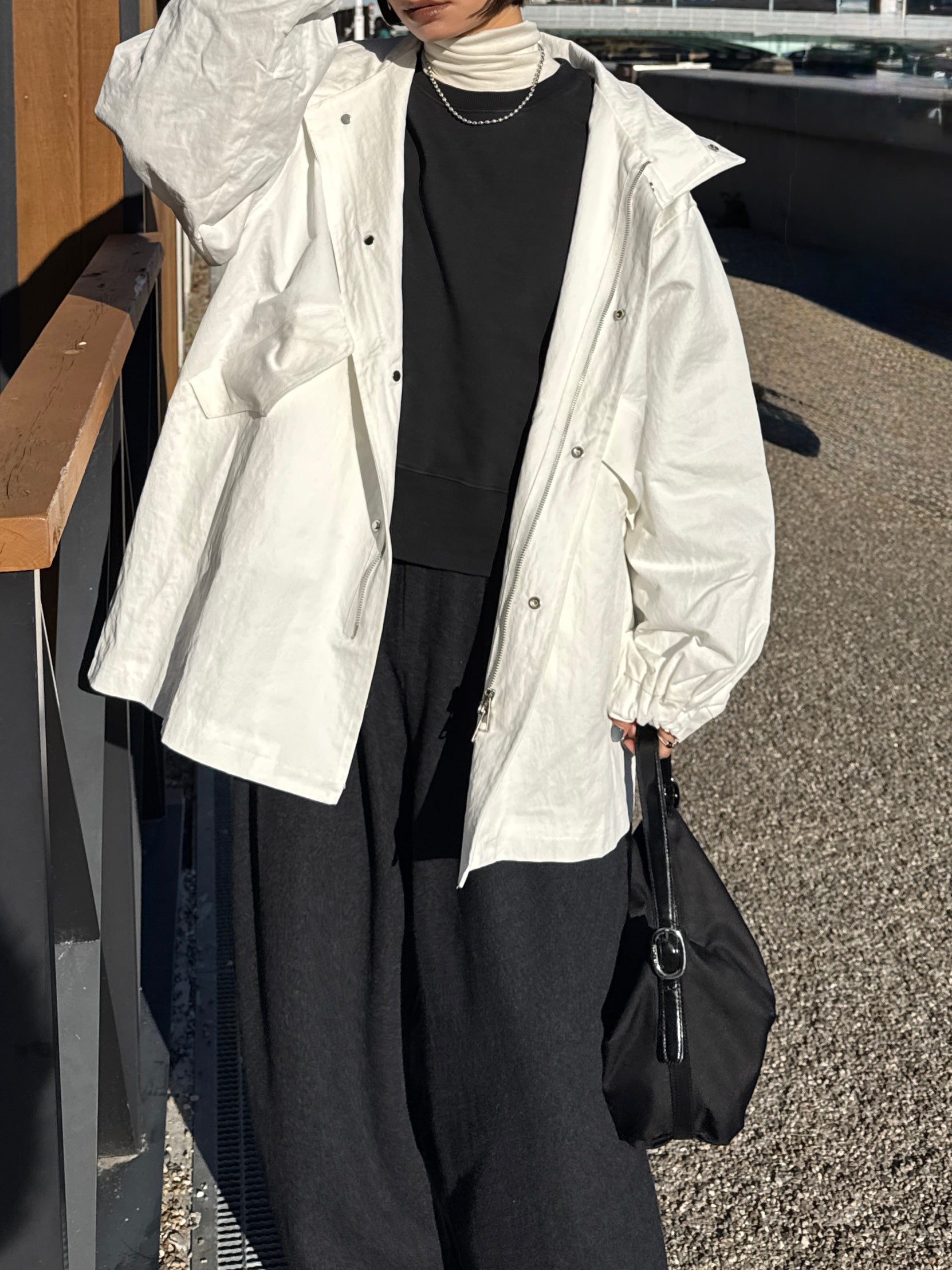 軽やかな表情のホワイトカラーが、春の装いにすっとなじむライトアウター。 コットンとナイロンを織り交ぜた素材で、程よいハリと軽さを感じる着心地に仕上げました。 首元は立ち上がりすぎないスタンドカラー仕様で、顔まわりをすっきりと見せつつ程よい存在感をプラス。 フロントはスナップボタンとファスナーのダブル仕様になっており、開け方次第で印象を変えられるのも魅力です。 ウエスト内側にはさりげなくドローストリングを施し、絞ることでシルエットにメリハリを。 後ろ姿にも自然な立体感が生まれ、カジュアルながら女性らしいバランスに仕上がります。 ふんわりと丸みのある袖デザインが、全体の印象をやわらかく演出し、シンプルながらも表情のある1着。