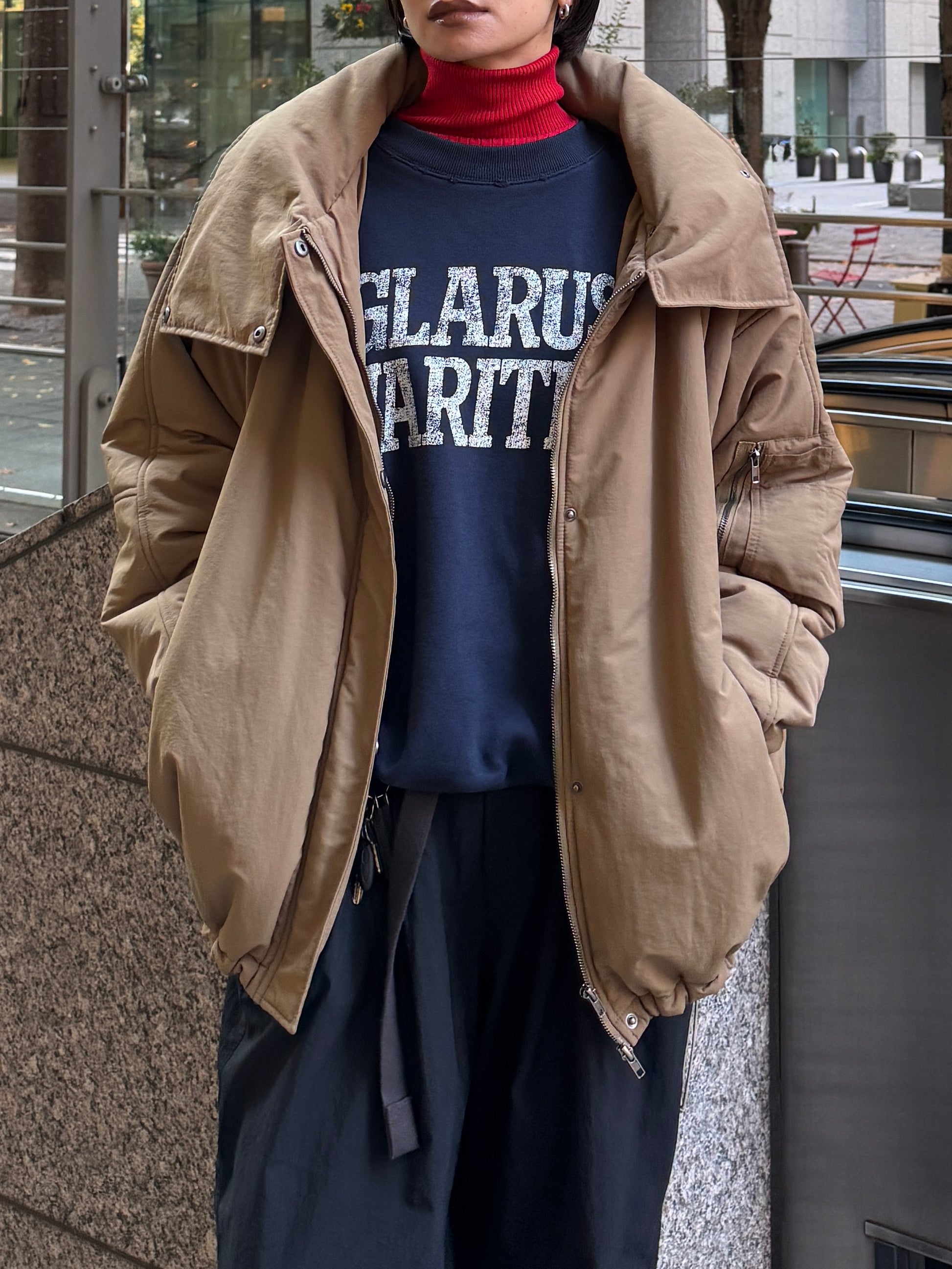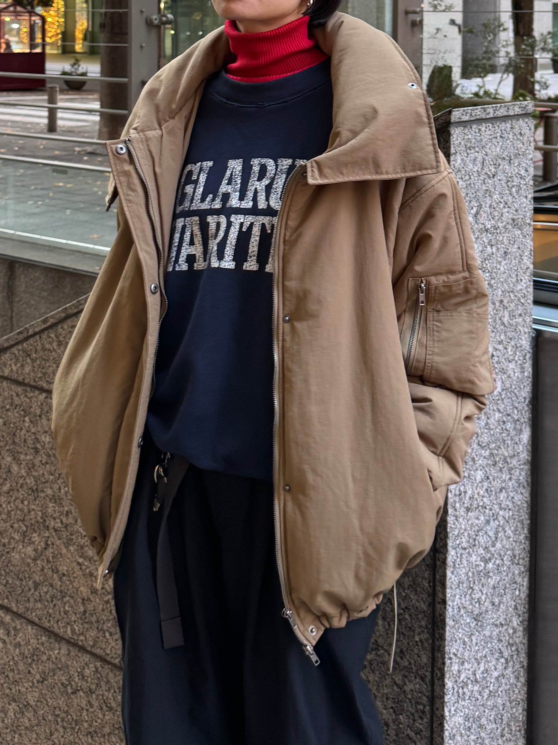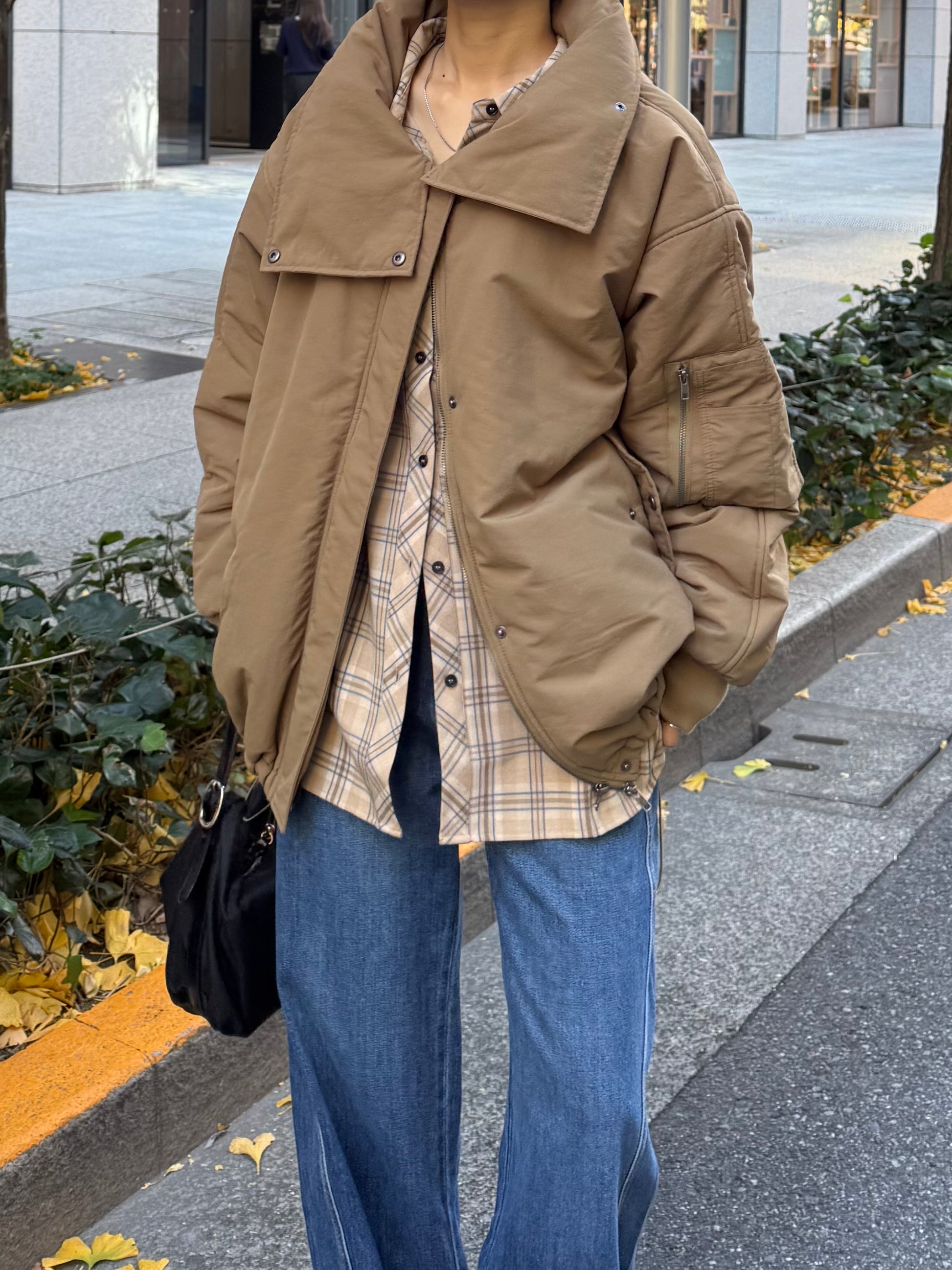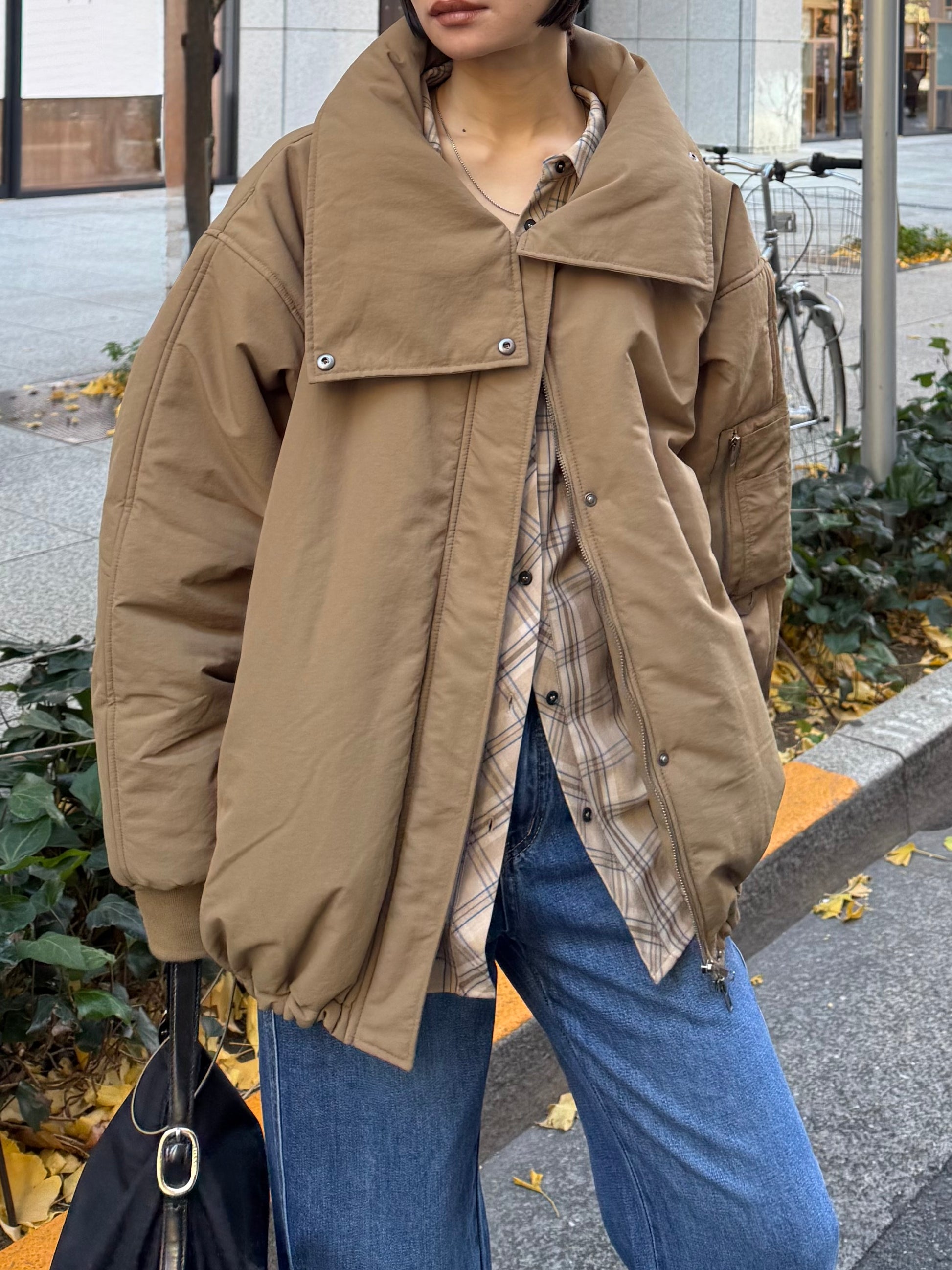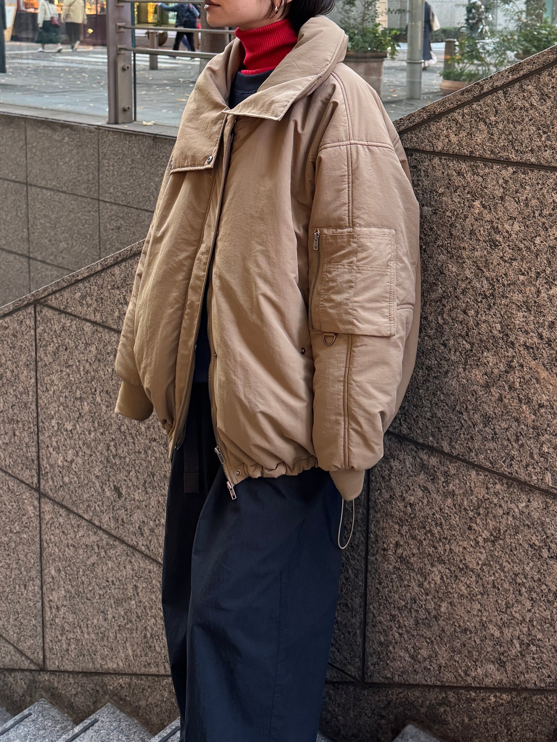 程よくボリュームのあるフォルムに、ナイロンの軽やかでマットな質感が映える中綿ブルゾン。 見た目以上に軽く、ふんわりとした中綿素材は保温性も高く真冬にも頼れる快適な着心地。 細かいディティールにこだわり、袖のシガレットポケットやカラビナなどミリタリーテイストをプラスしたのも魅力のポイント。 首元はハイネック仕様&フード付きになっており、立てて防寒性を高めても寝かせて柔らかい印象にも。 出し入れ可能のフード付きで、気分やシーンに合わせたスタイルをお楽しみいただけます。 お好みで丈感やシルエット調整可能の裾ドロスト仕様やフロントのダブルジップ+スナップボタンで 実用性、デザイン性を両立しながら着こなしの幅を広げました。 細部まで使いやすく、きちんと感も抜け感も欲しい日に1着で決まる今季のマストハブアイテム。
