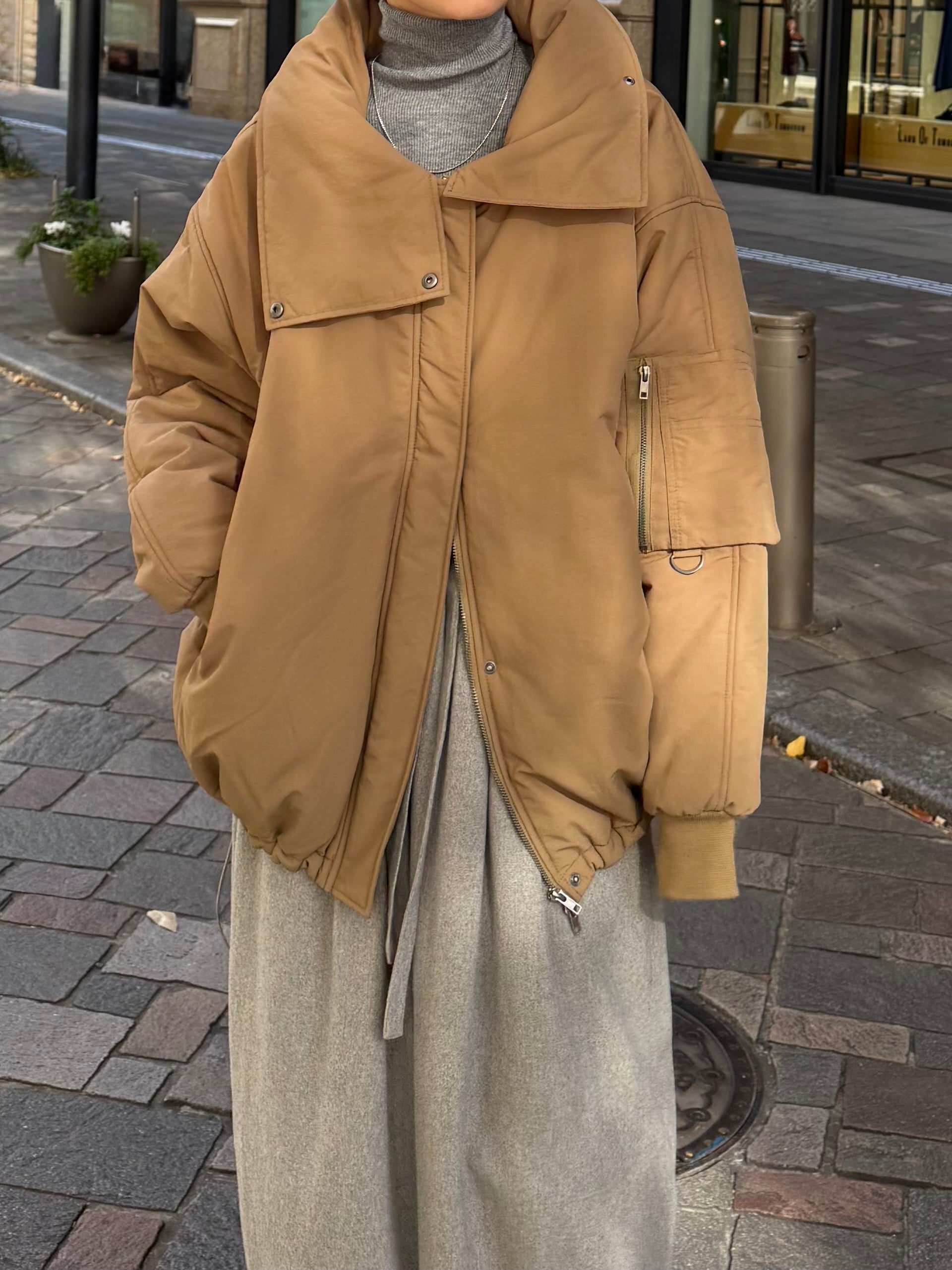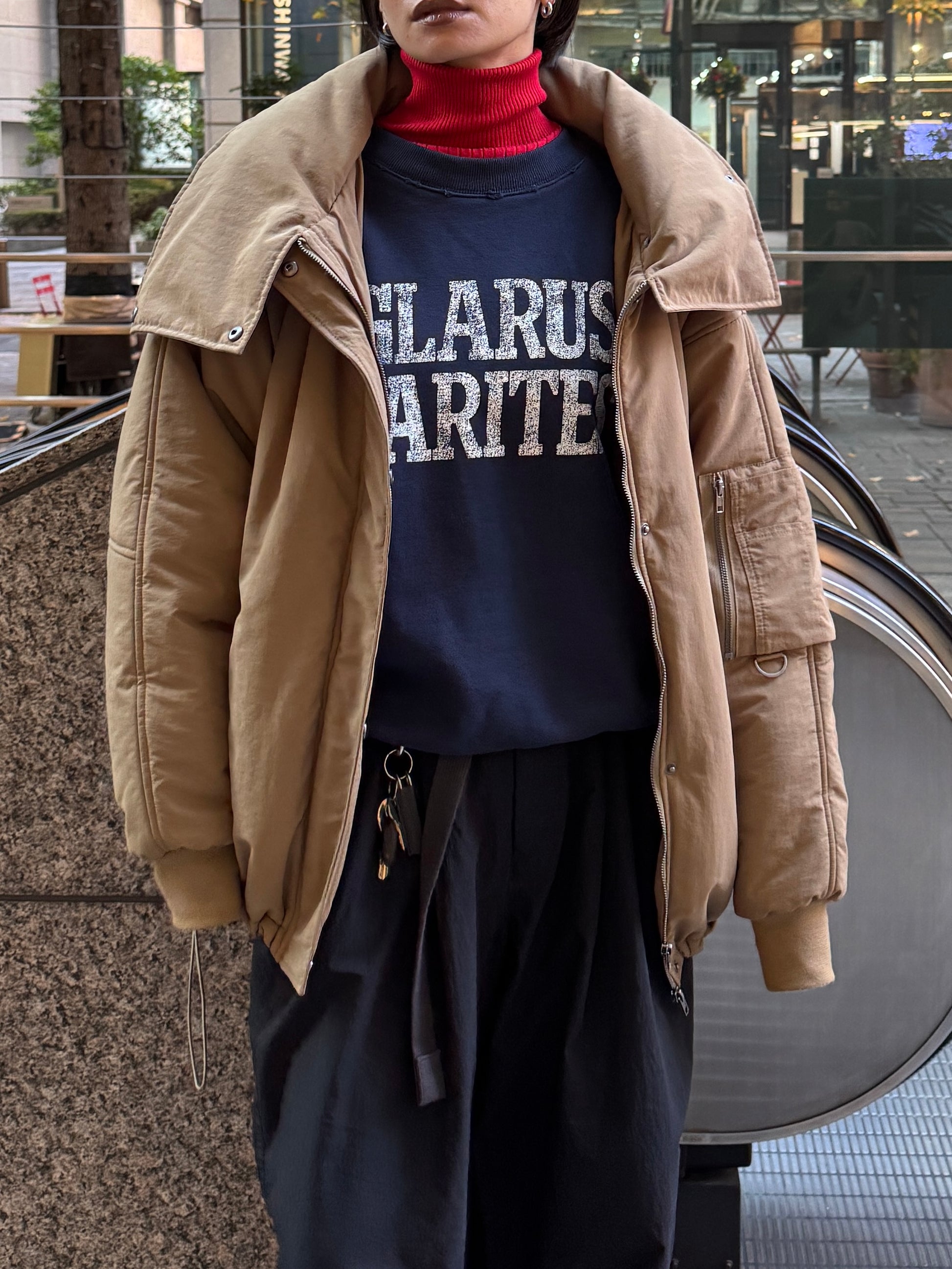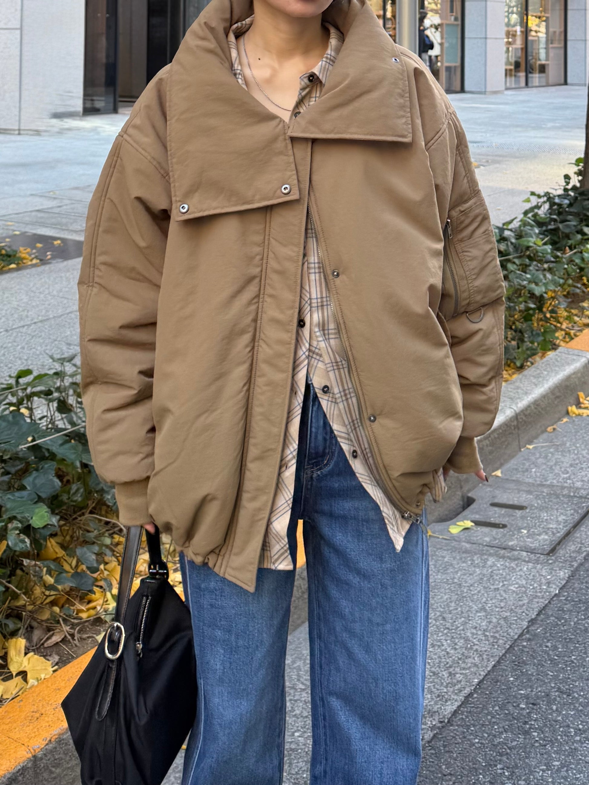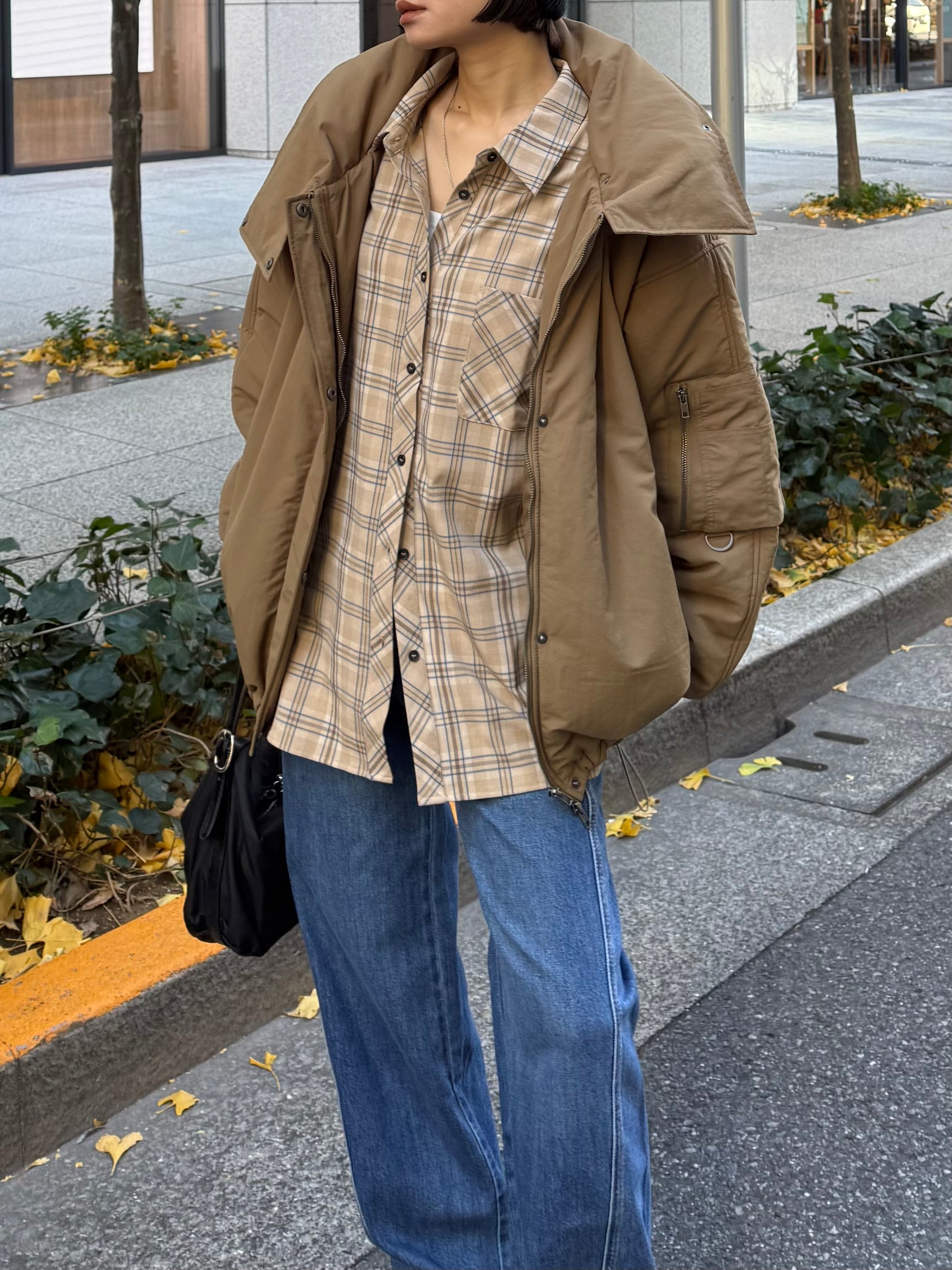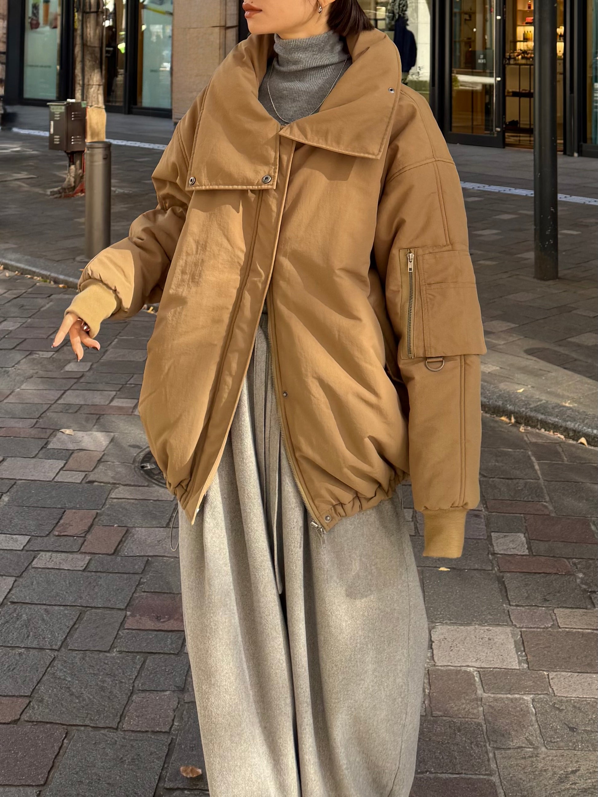程よくボリュームのあるフォルムに、ナイロンの軽やかでマットな質感が映える中綿ブルゾン。 見た目以上に軽く、ふんわりとした中綿素材は保温性も高く真冬にも頼れる快適な着心地。 細かいディティールにこだわり、袖のシガレットポケットやカラビナなどミリタリーテイストをプラスしたのも魅力のポイント。 首元はハイネック仕様&フード付きになっており、立てて防寒性を高めても寝かせて柔らかい印象にも。 出し入れ可能のフード付きで、気分やシーンに合わせたスタイルをお楽しみいただけます。 お好みで丈感やシルエット調整可能の裾ドロスト仕様やフロントのダブルジップ+スナップボタンで 実用性、デザイン性を両立しながら着こなしの幅を広げました。 細部まで使いやすく、きちんと感も抜け感も欲しい日に1着で決まる今季のマストハブアイテム。