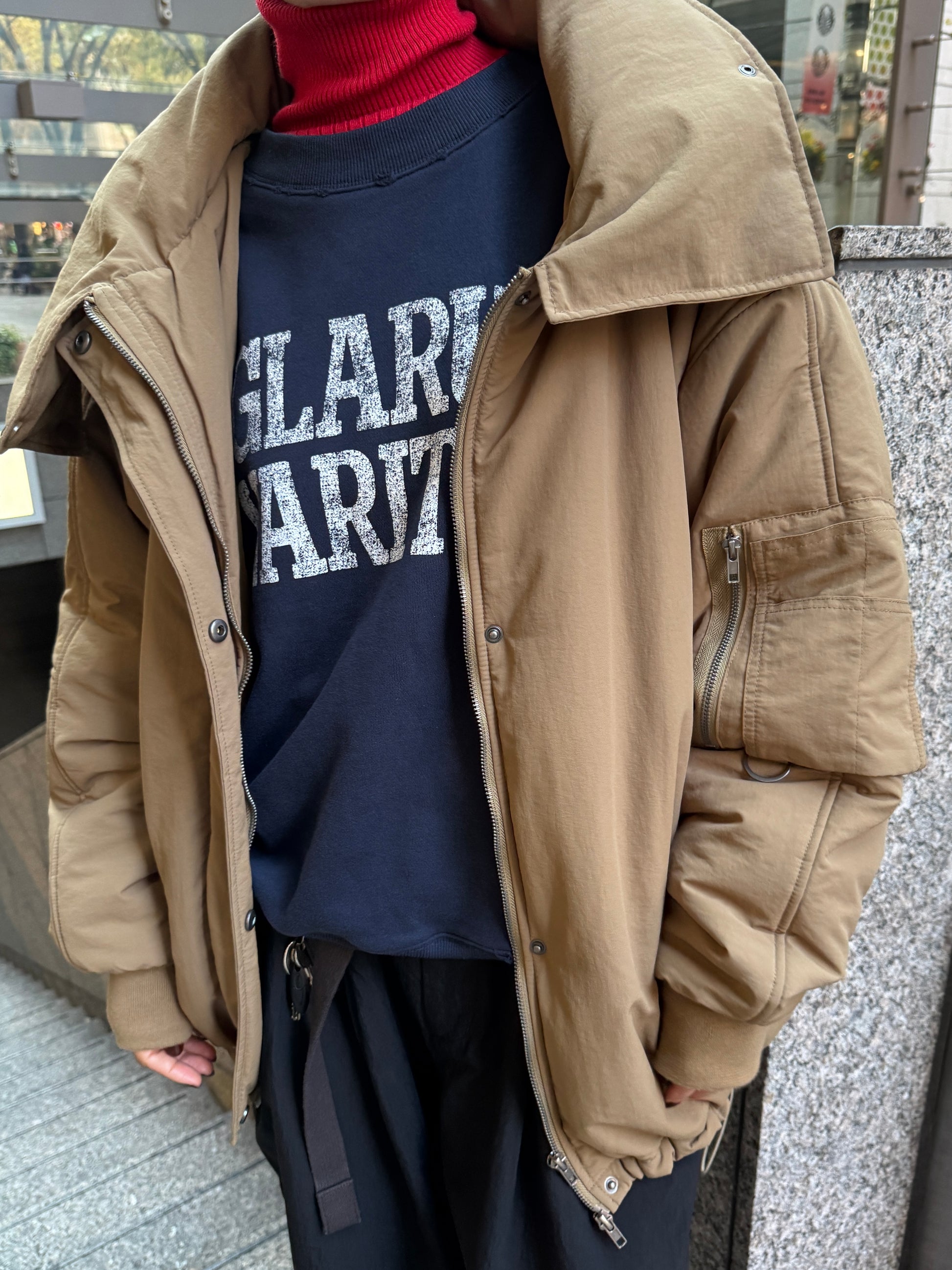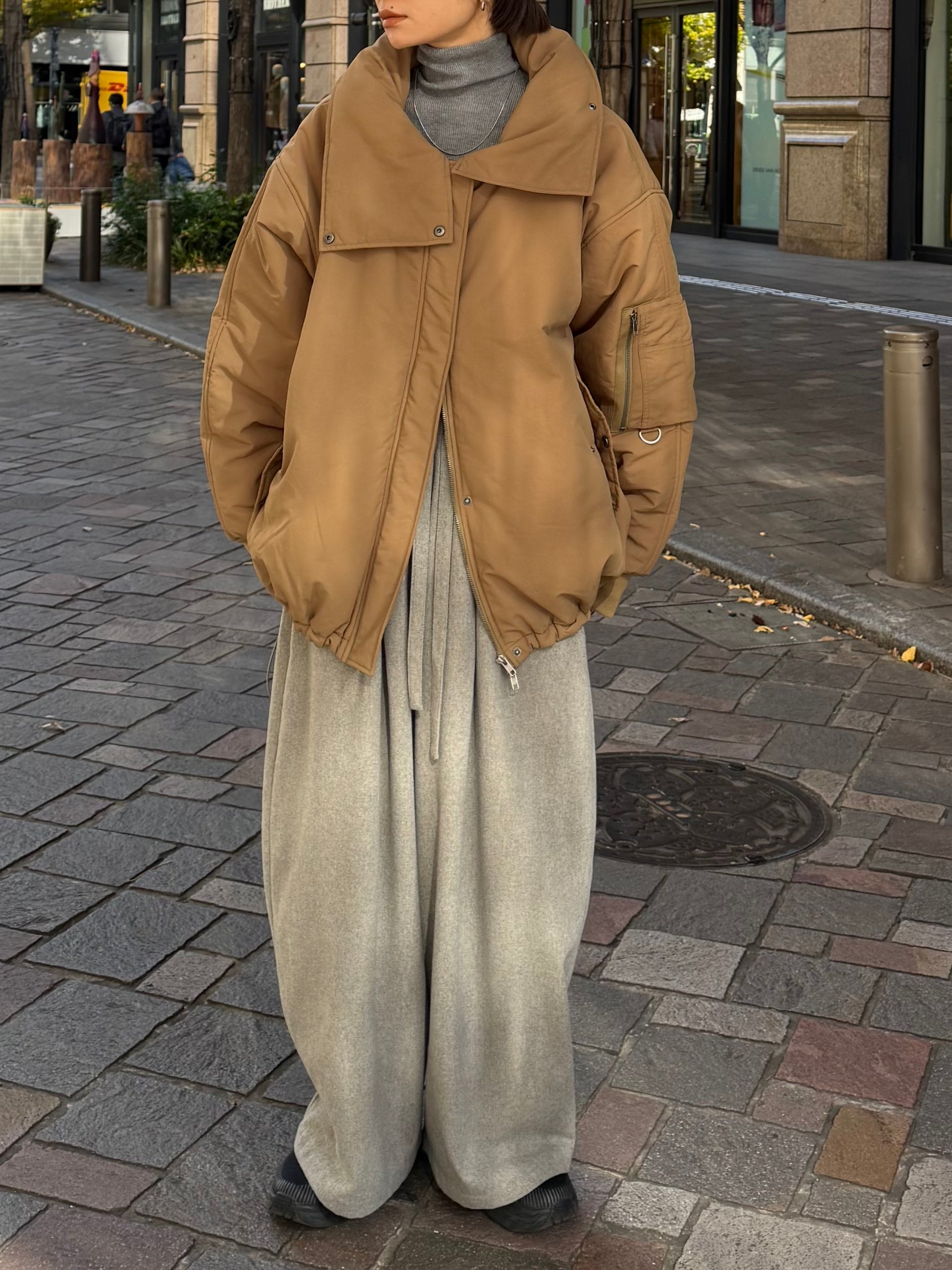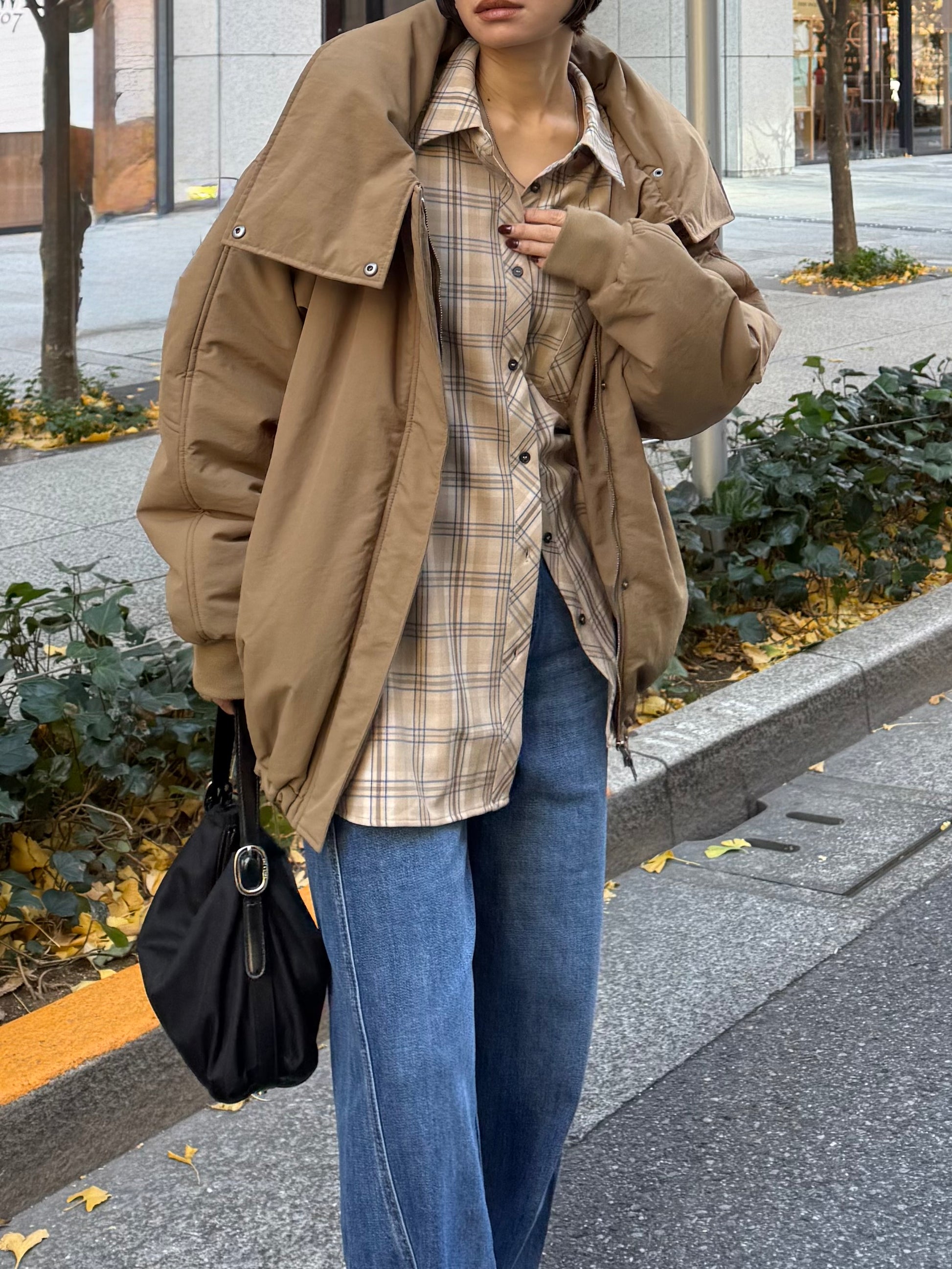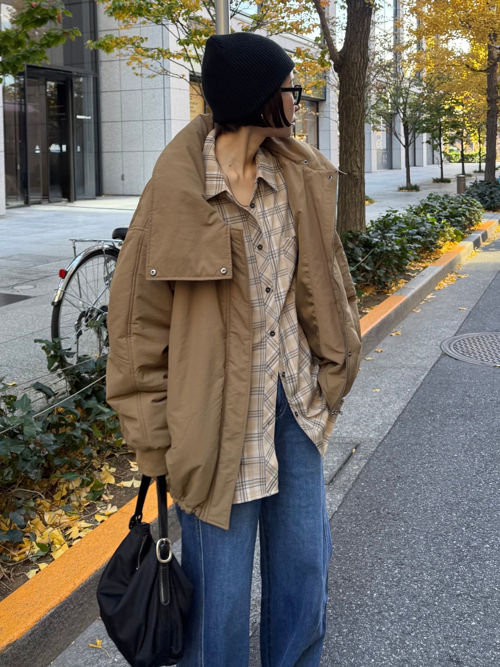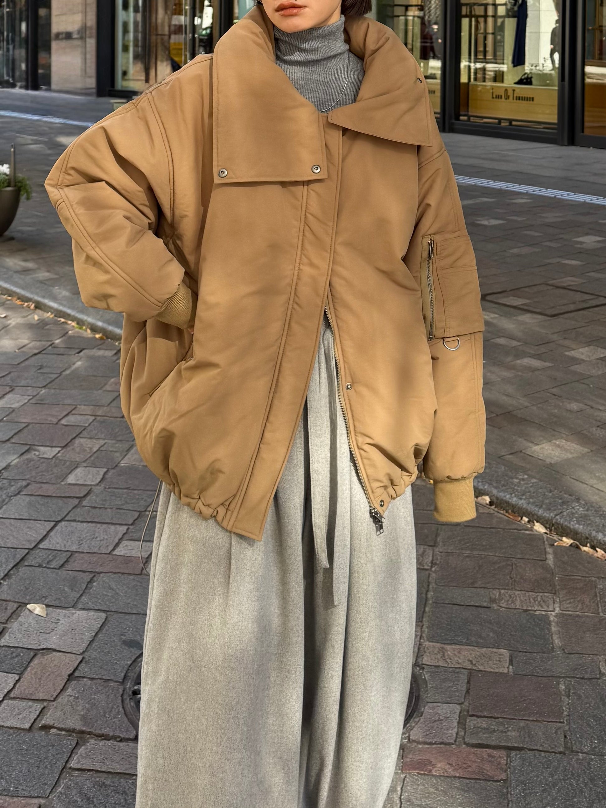 程よくボリュームのあるフォルムに、ナイロンの軽やかでマットな質感が映える中綿ブルゾン。 見た目以上に軽く、ふんわりとした中綿素材は保温性も高く真冬にも頼れる快適な着心地。 細かいディティールにこだわり、袖のシガレットポケットやカラビナなどミリタリーテイストをプラスしたのも魅力のポイント。 首元はハイネック仕様&フード付きになっており、立てて防寒性を高めても寝かせて柔らかい印象にも。 出し入れ可能のフード付きで、気分やシーンに合わせたスタイルをお楽しみいただけます。 お好みで丈感やシルエット調整可能の裾ドロスト仕様やフロントのダブルジップ+スナップボタンで 実用性、デザイン性を両立しながら着こなしの幅を広げました。 細部まで使いやすく、きちんと感も抜け感も欲しい日に1着で決まる今季のマストハブアイテム。