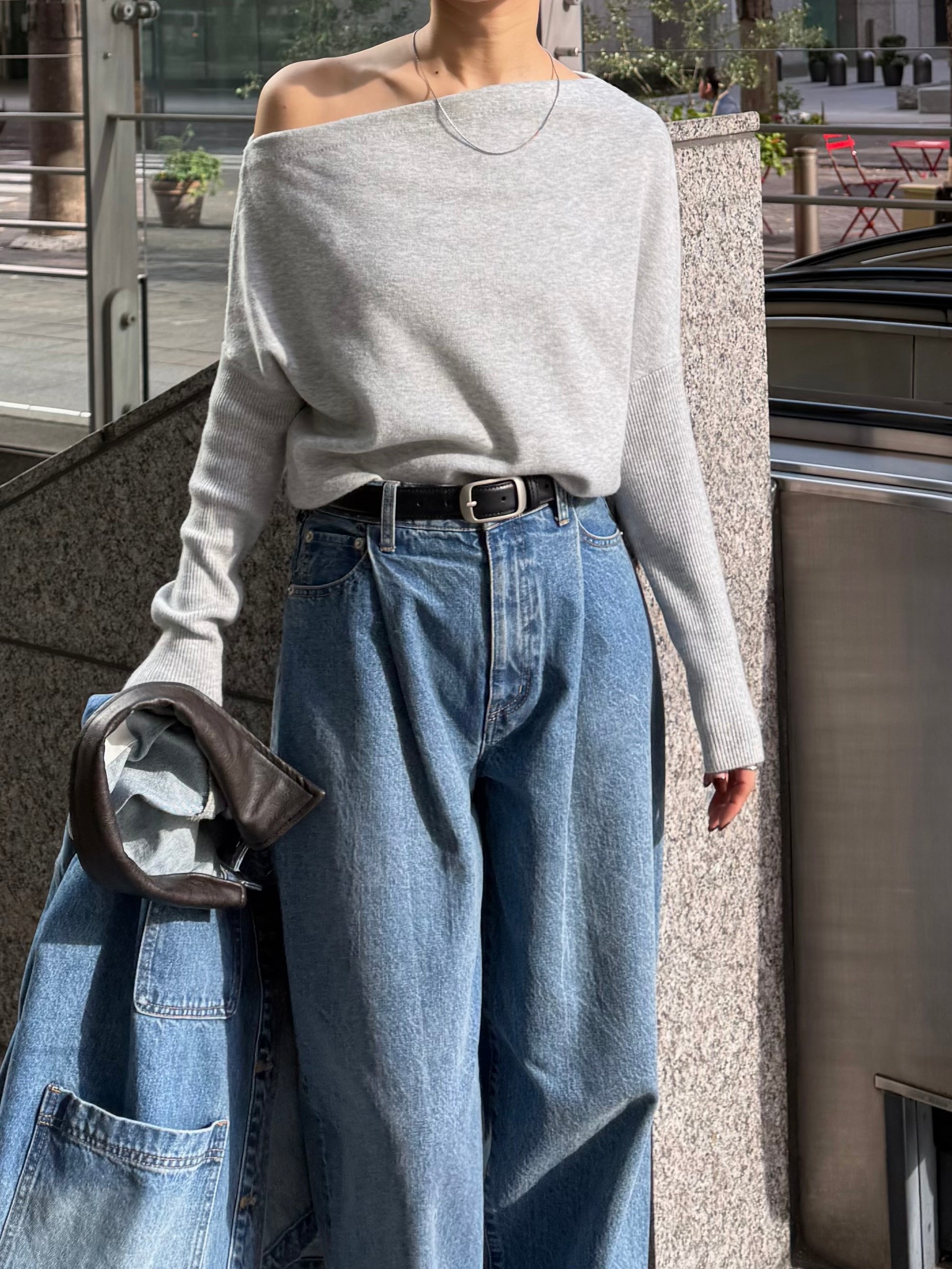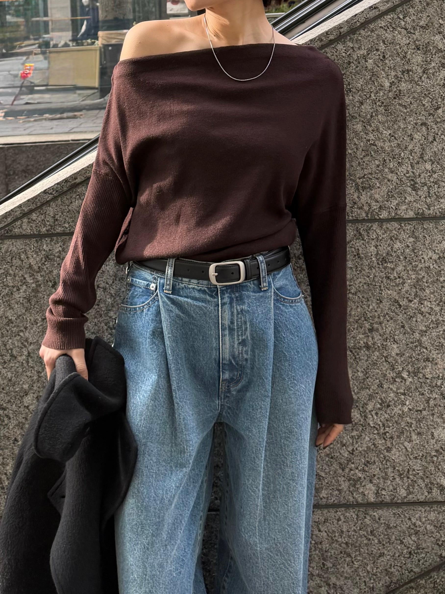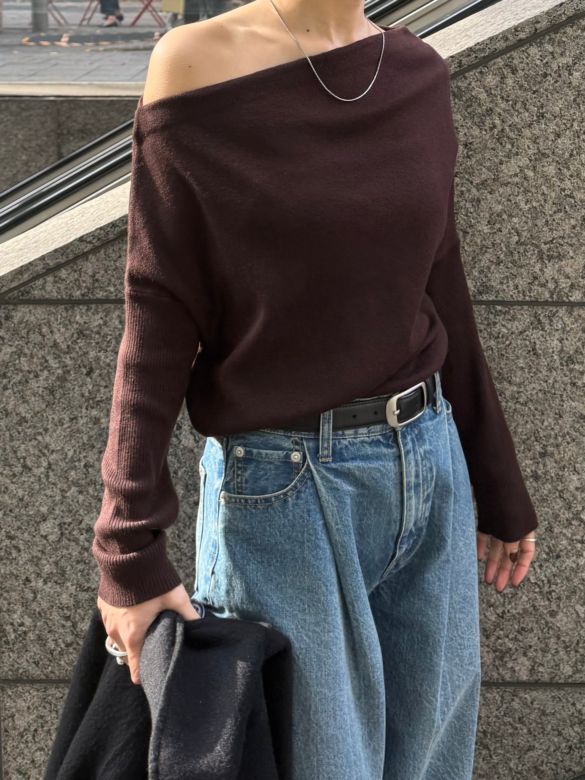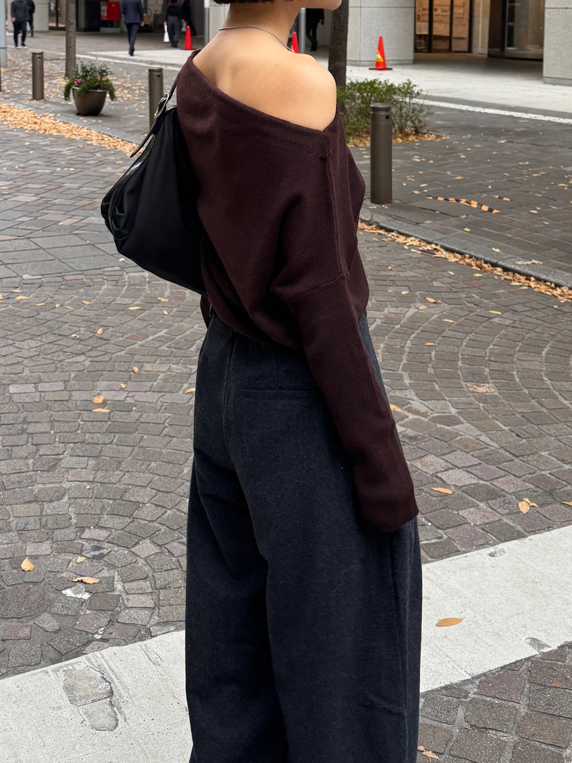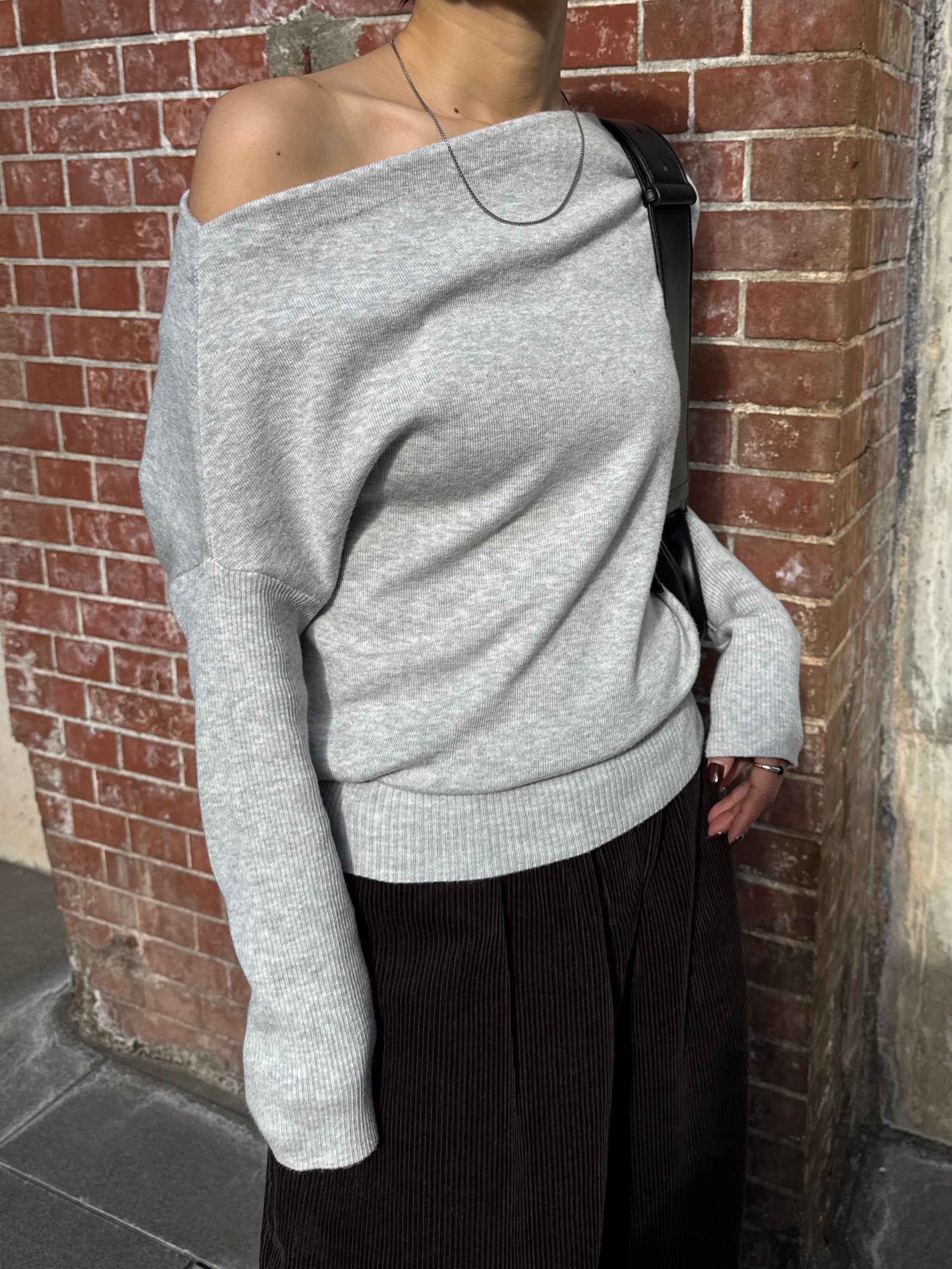 身体に沿って落ちるラインがきれいな、ワンショルダー仕様のニットトップス。 力を抜いたシルエットながら、着たときに自然と雰囲気の出る1枚です。 ネックラインは片側の肩がほどよく覗くカッティングにし抜け感がありつつ、肌見せが主張しすぎないバランスに仕上げています。 袖口と裾にはしっかり目のリブを効かせ、全体をすっきりと引き締めるディテールに。 薄すぎず厚すぎない素材感で、アウターの中にも収まりが良く冬場のレイヤードでも着膨れしにくいのも嬉しいポイントです。 カラーはアイボリーとネイビーの2色でワードローブに自然と馴染む落ち着いたラインナップです。
